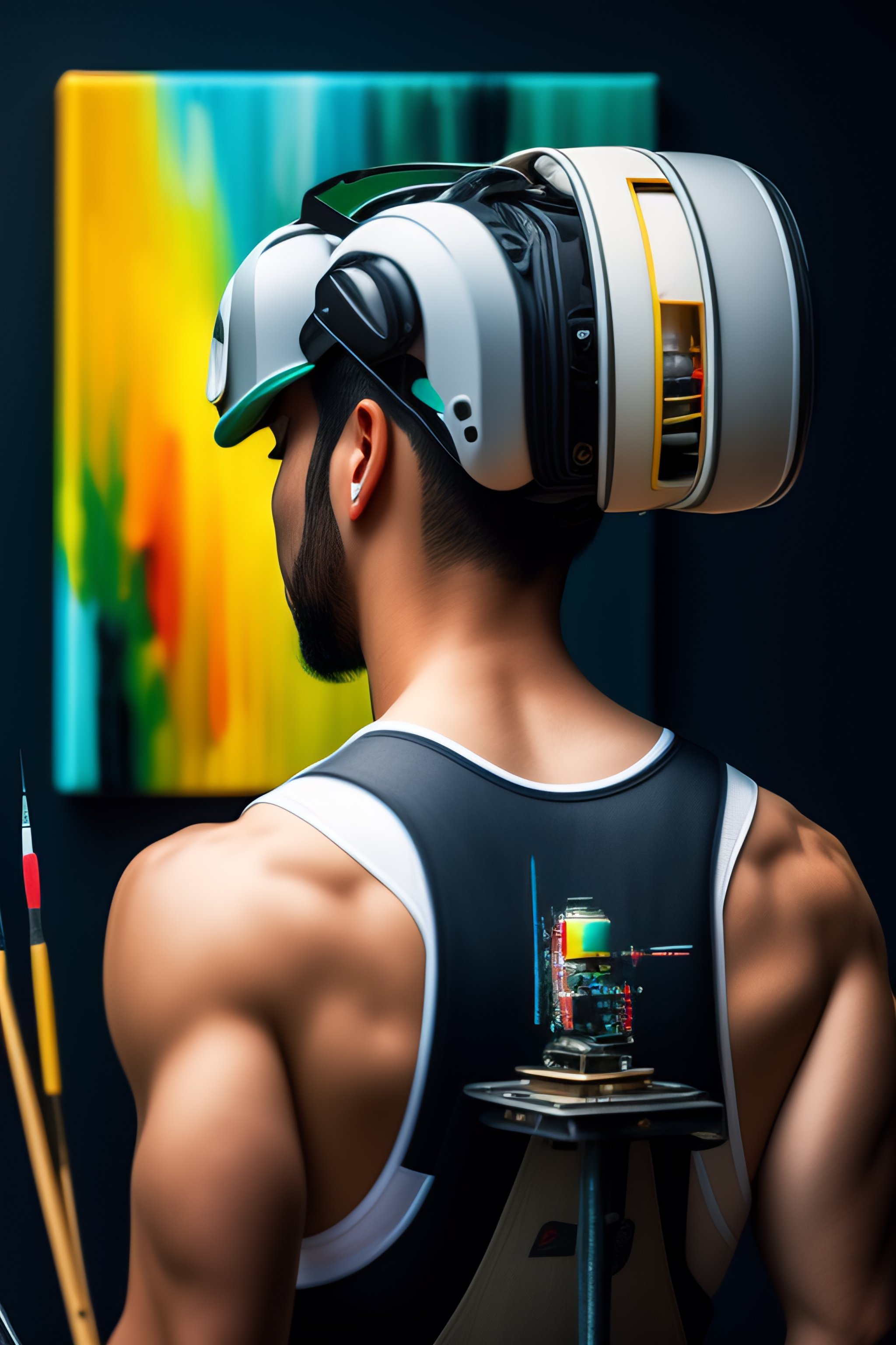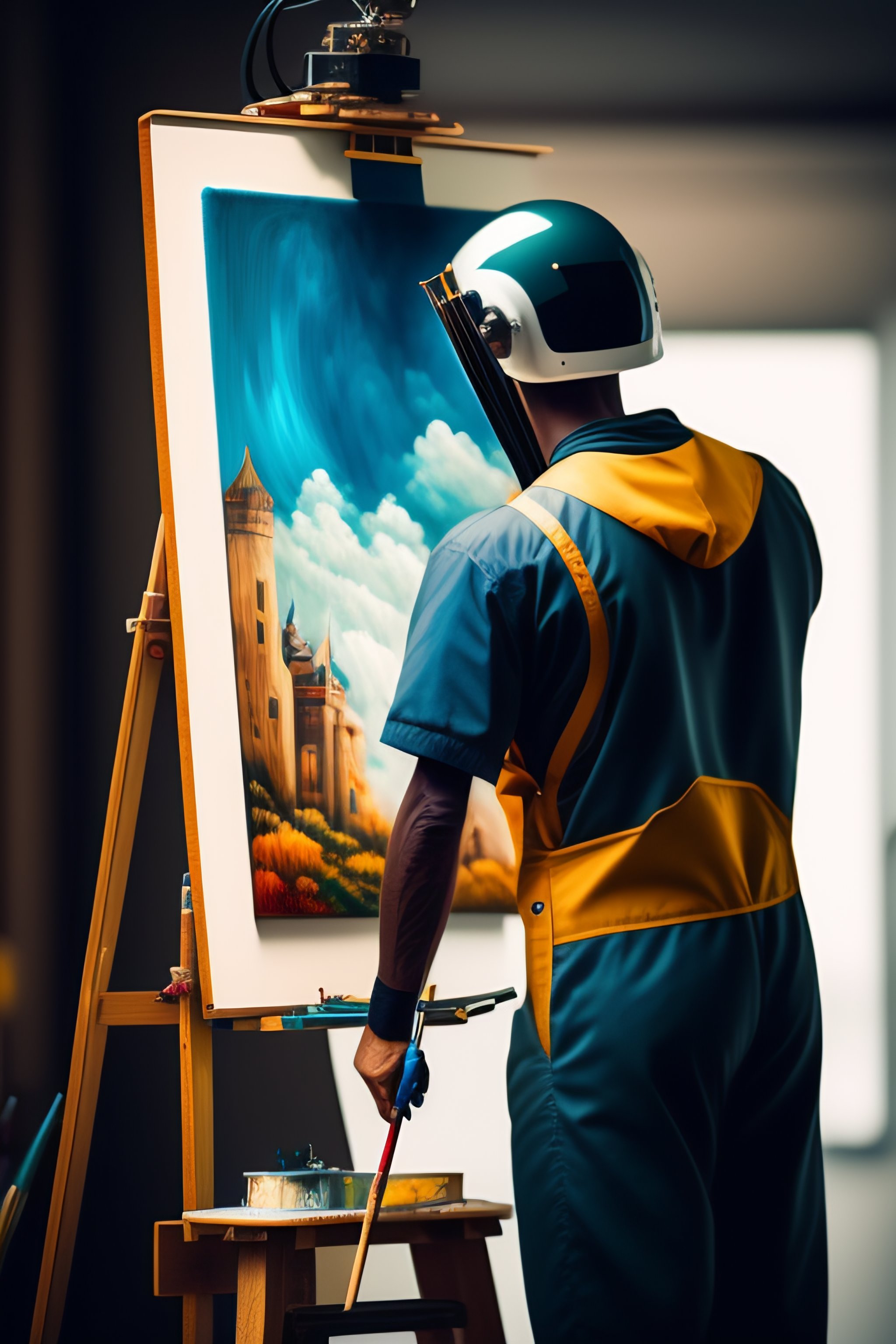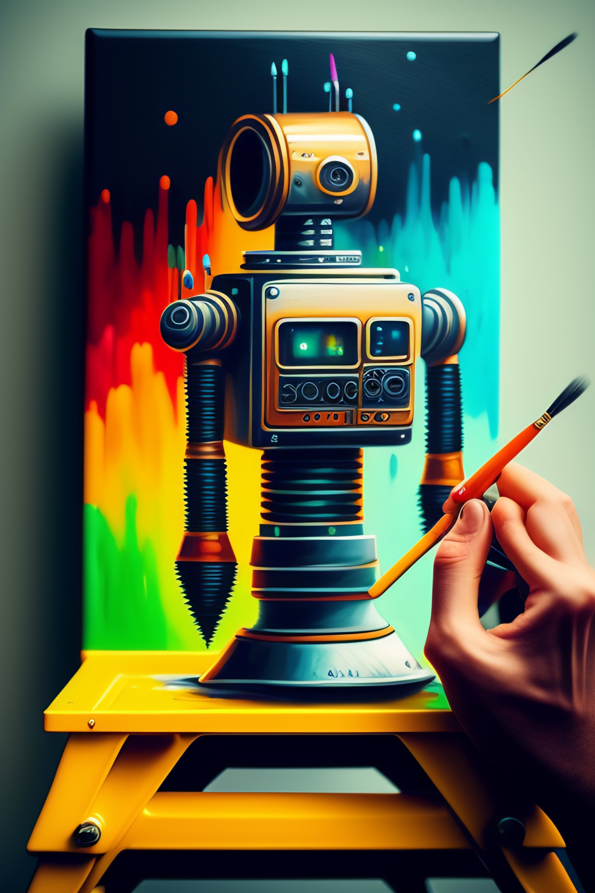 An artist robot holding a paintbrush is painting a masterpiece on a canvas