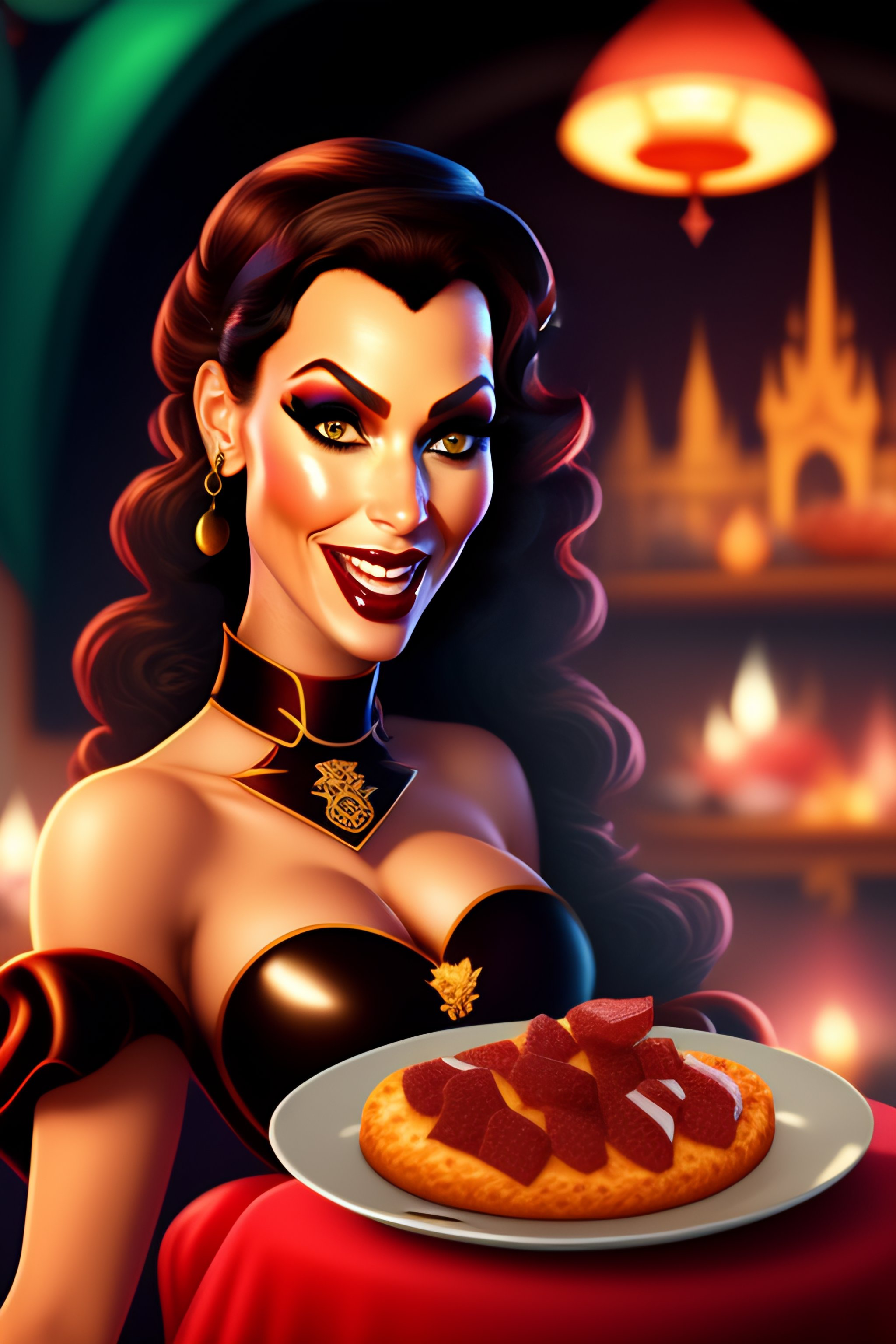 ((vampire woman trying to eat some vegan meat with vegatables)) art style of disney