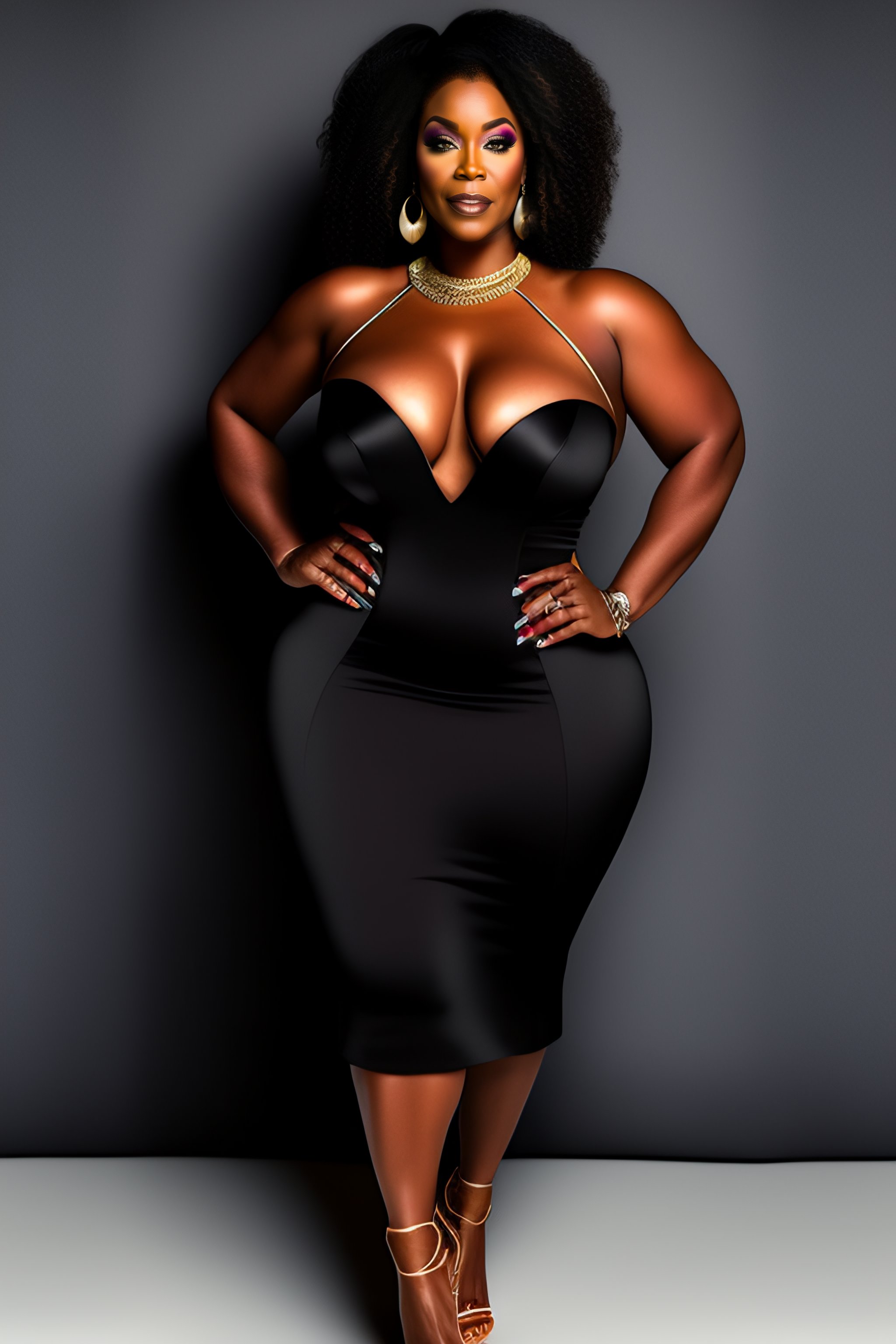 Full body studio picture of a 50 year old average size black woman in low cut dress