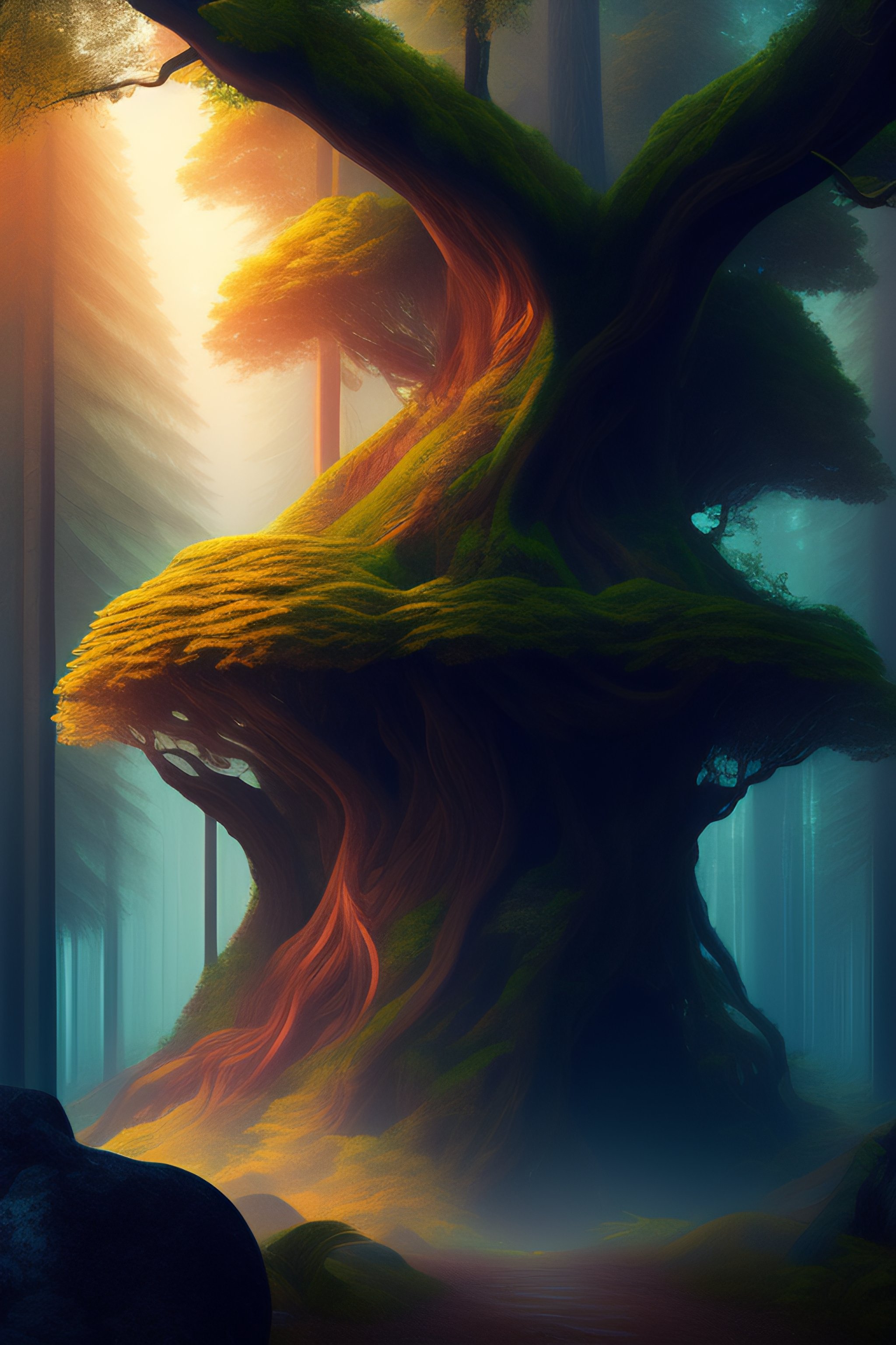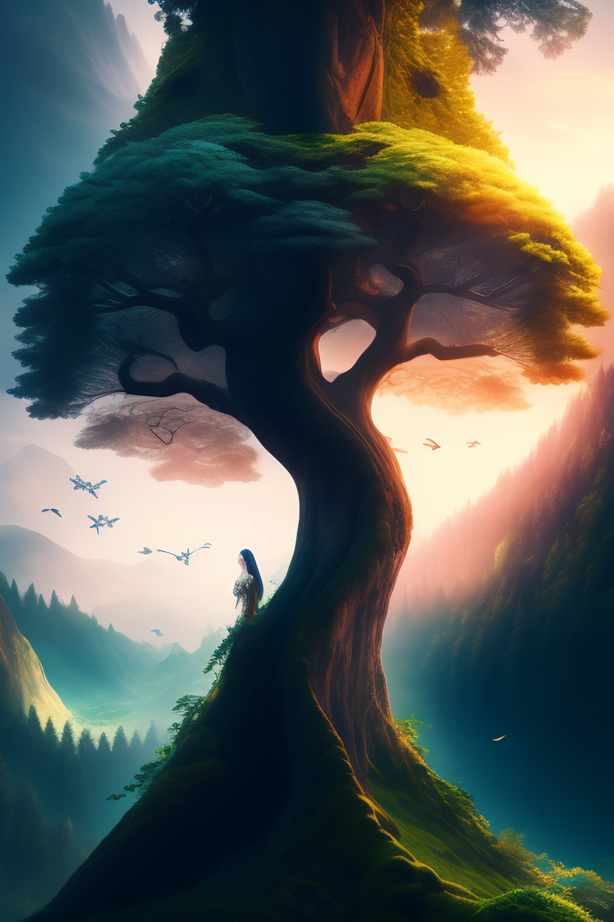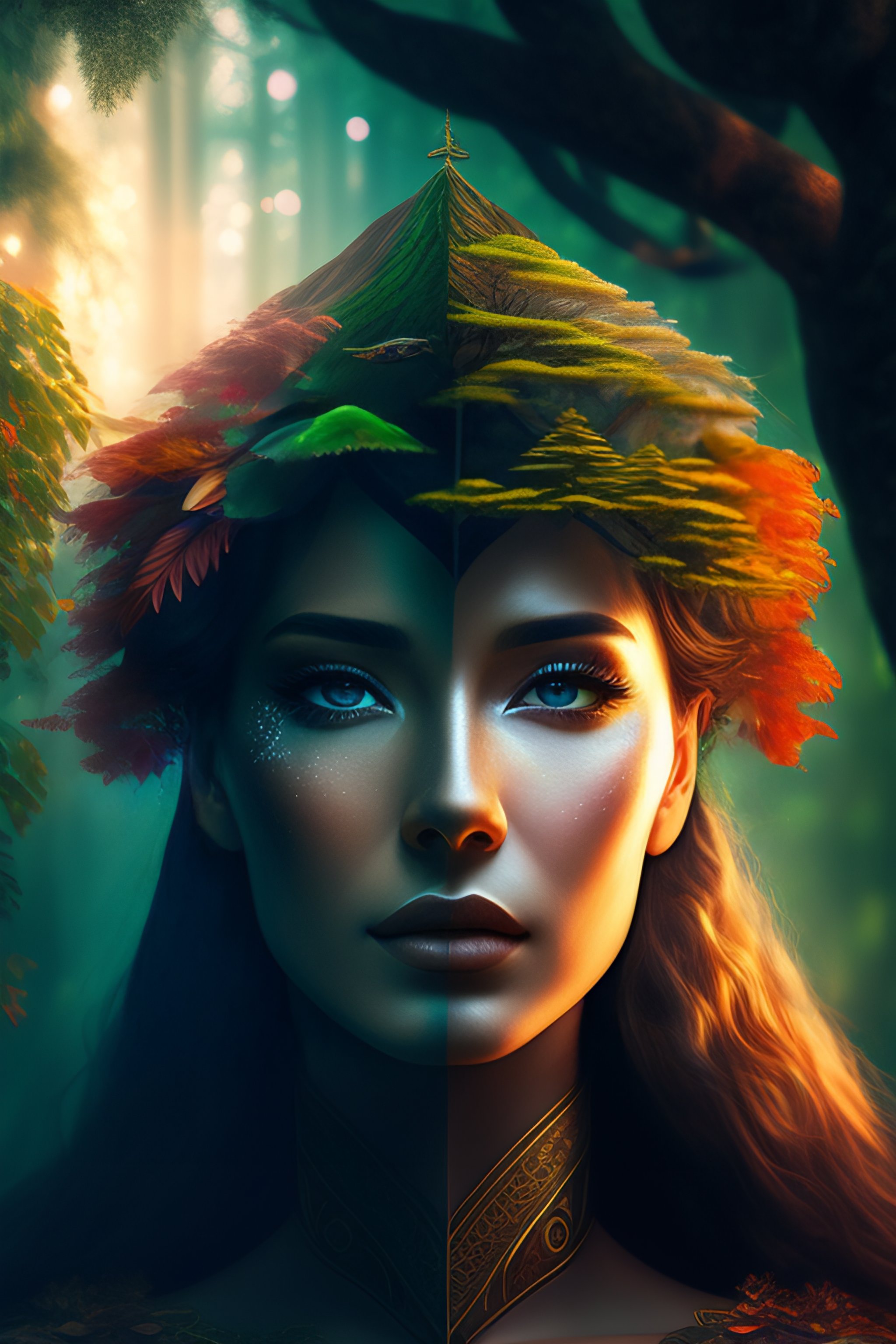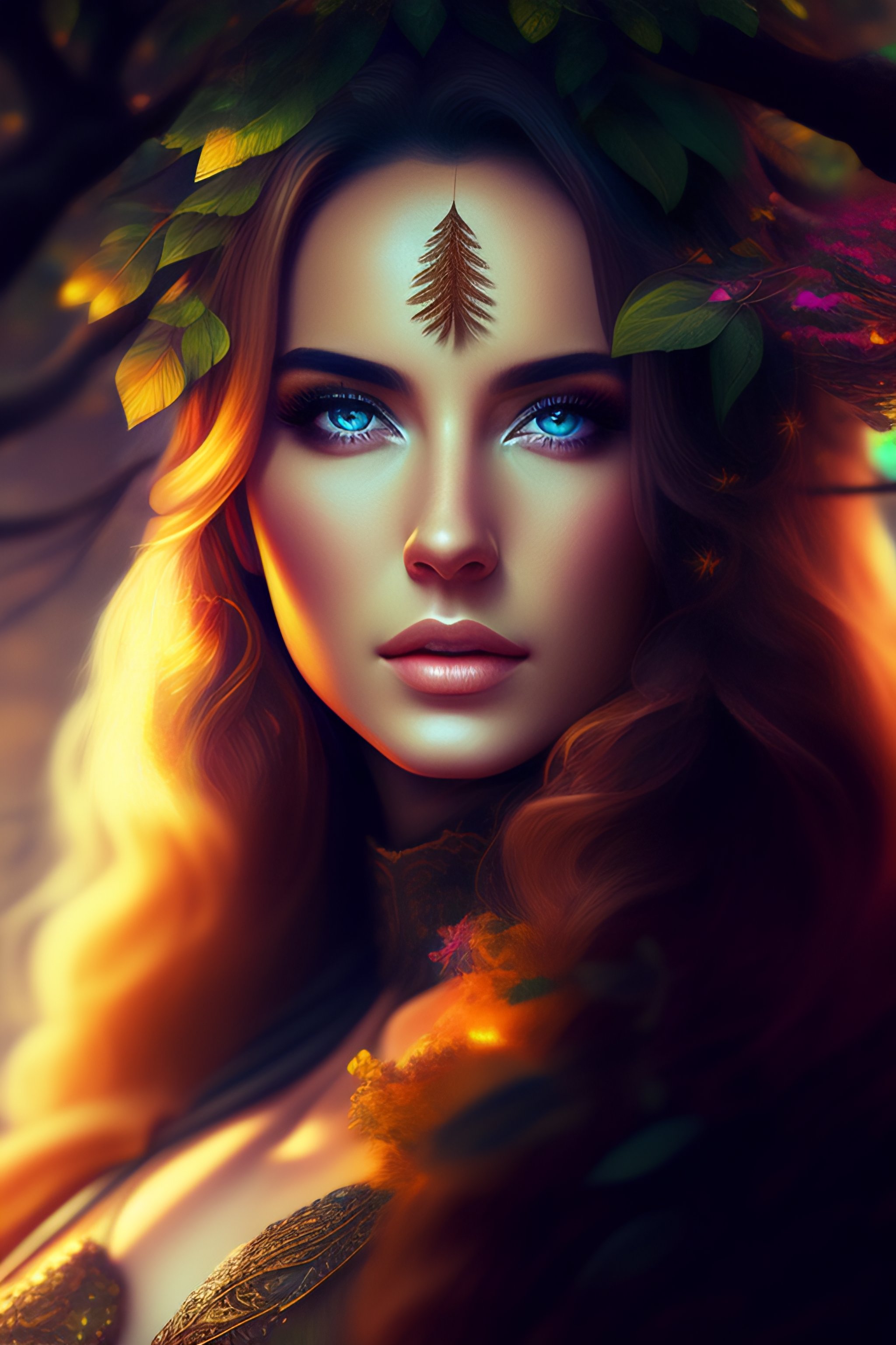A beautiful woman is a tree in the forest, beautiful face, hyperdetailed eyes, elegant, beautiful, epic cinematic brilliant stunning intricate meticulously detailed dramatic atmospheric maximalist digital matte painting, beautiful colors