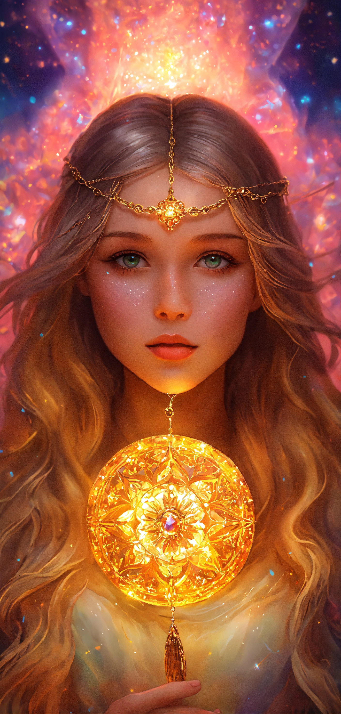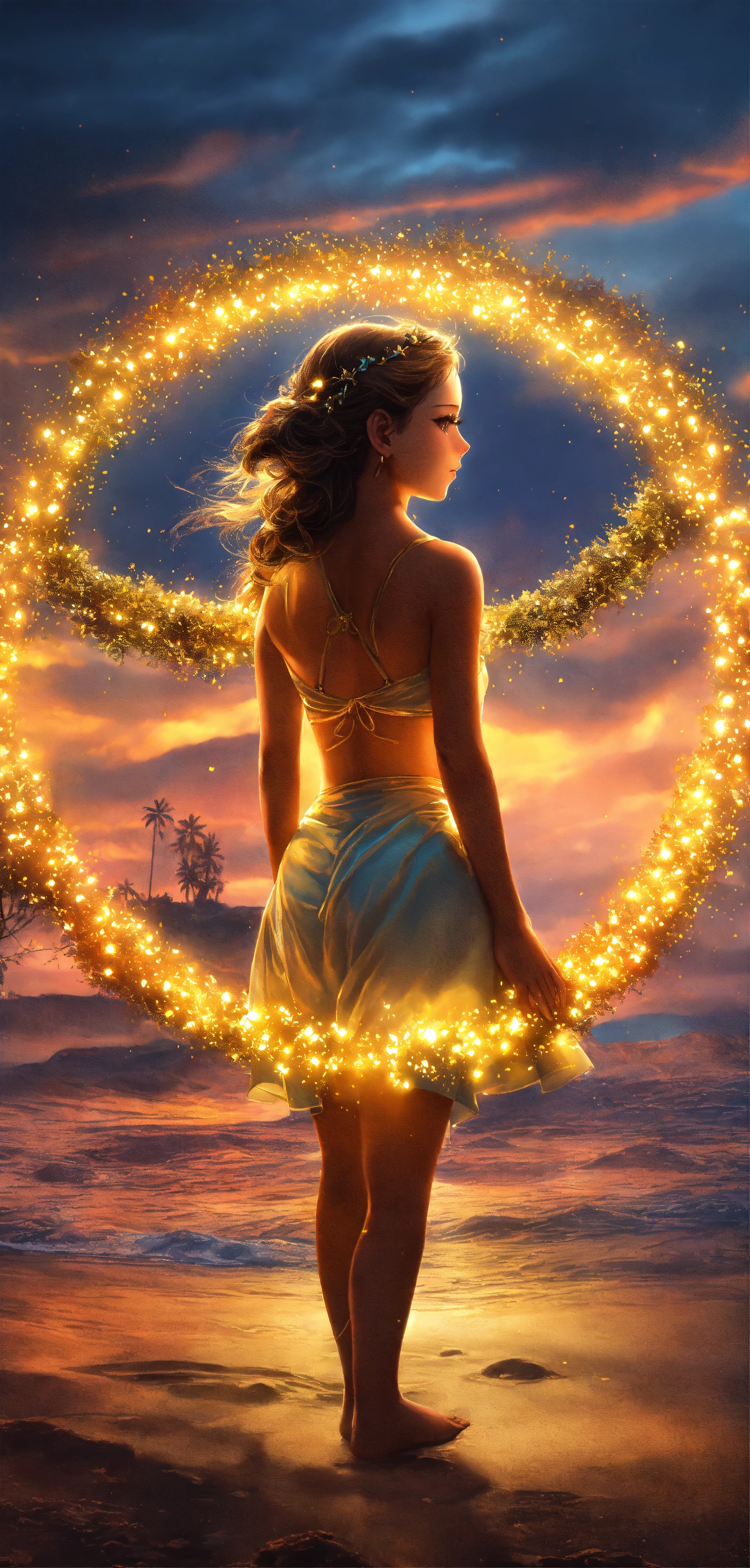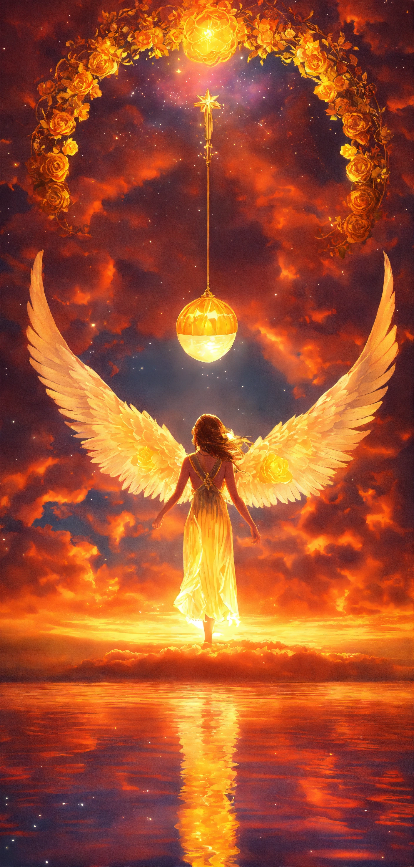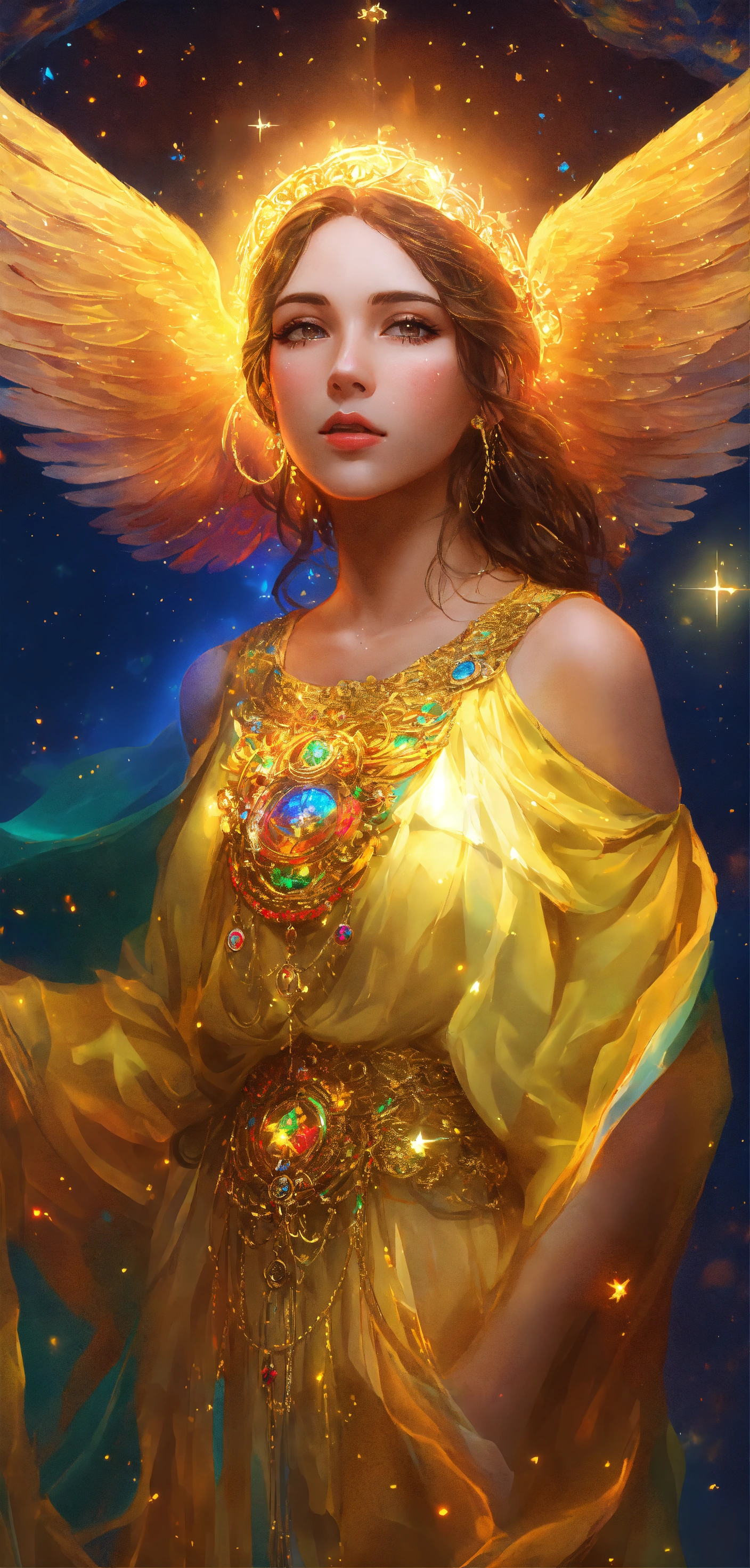 1 ilustracion hiperrealista y hiperdetallado. 7 aros con un borde luminoso en colores arcoíris vibrante sumergidas y flotando en un cielo despejado con nubes de colores. en cada aro hay un angelita niña hermosa y perfecta diferente en cada esfera. son siete aros y siete angelitos detallados y definidos. 7 angelitas niñas hermosas y perfectas con alas de angel muy luminosas de color amarillo y dorado detalladas, alas definidas y uniformes y completas. rostros perfectos y detallados. ojos claros con mirada profunda y penetrante. el firmamento es hermoso y hay tonalidades tornasoladas neon vibrante muy hermoso. alrededor de ellas hay mandalas hermosos en inmersion de color dorados con geometria sagrada . el cielo tiene pequellas estrellas doradas con destellos de luz. hay secuencias de angeles muy hermosas y muy detalladas. no hay animales. no hay personas. no hay más ángeles. hd. obra maestra. alta resolución. alta calidad. obra de arte. arte digital. realismo. 8k