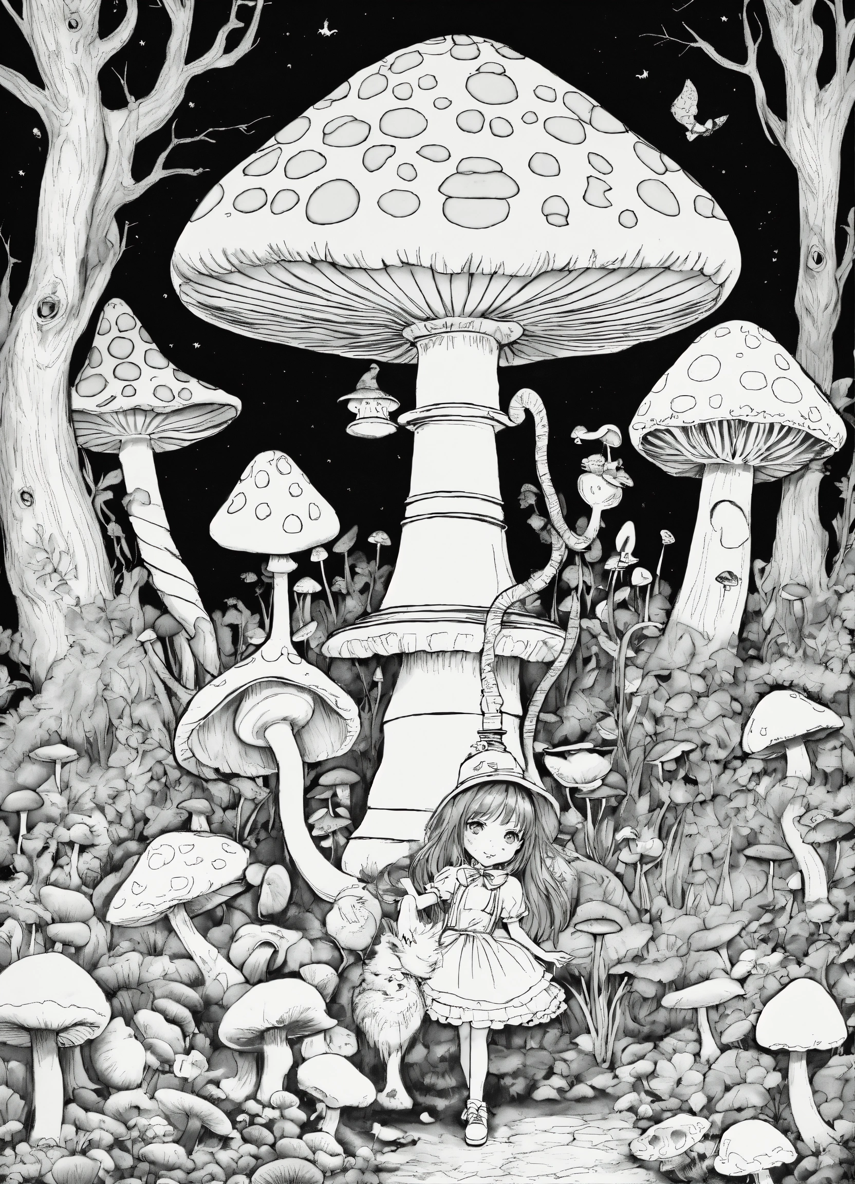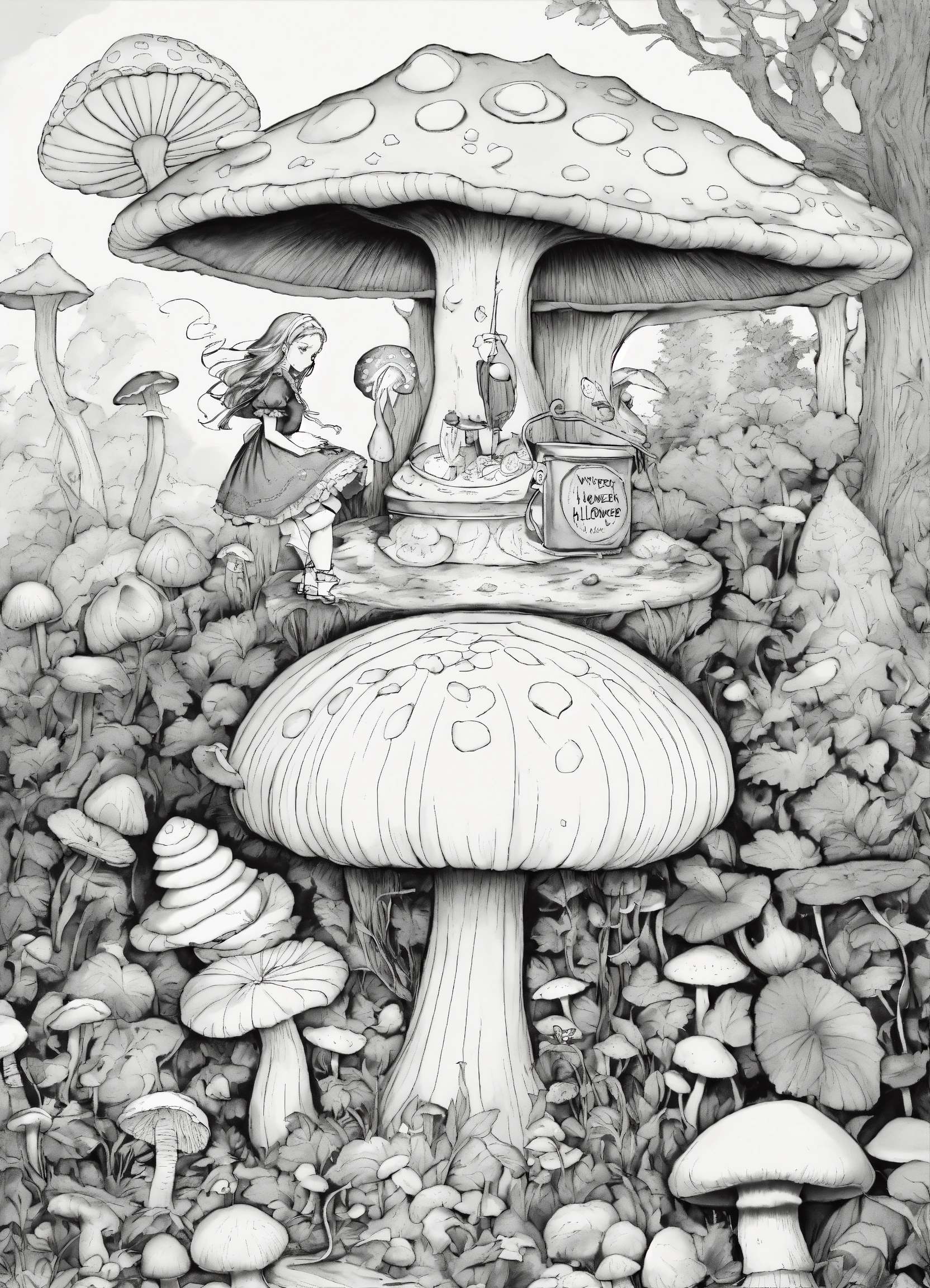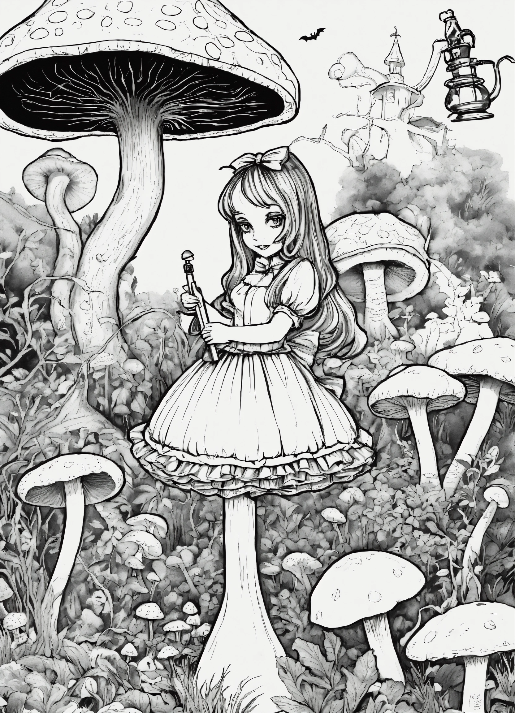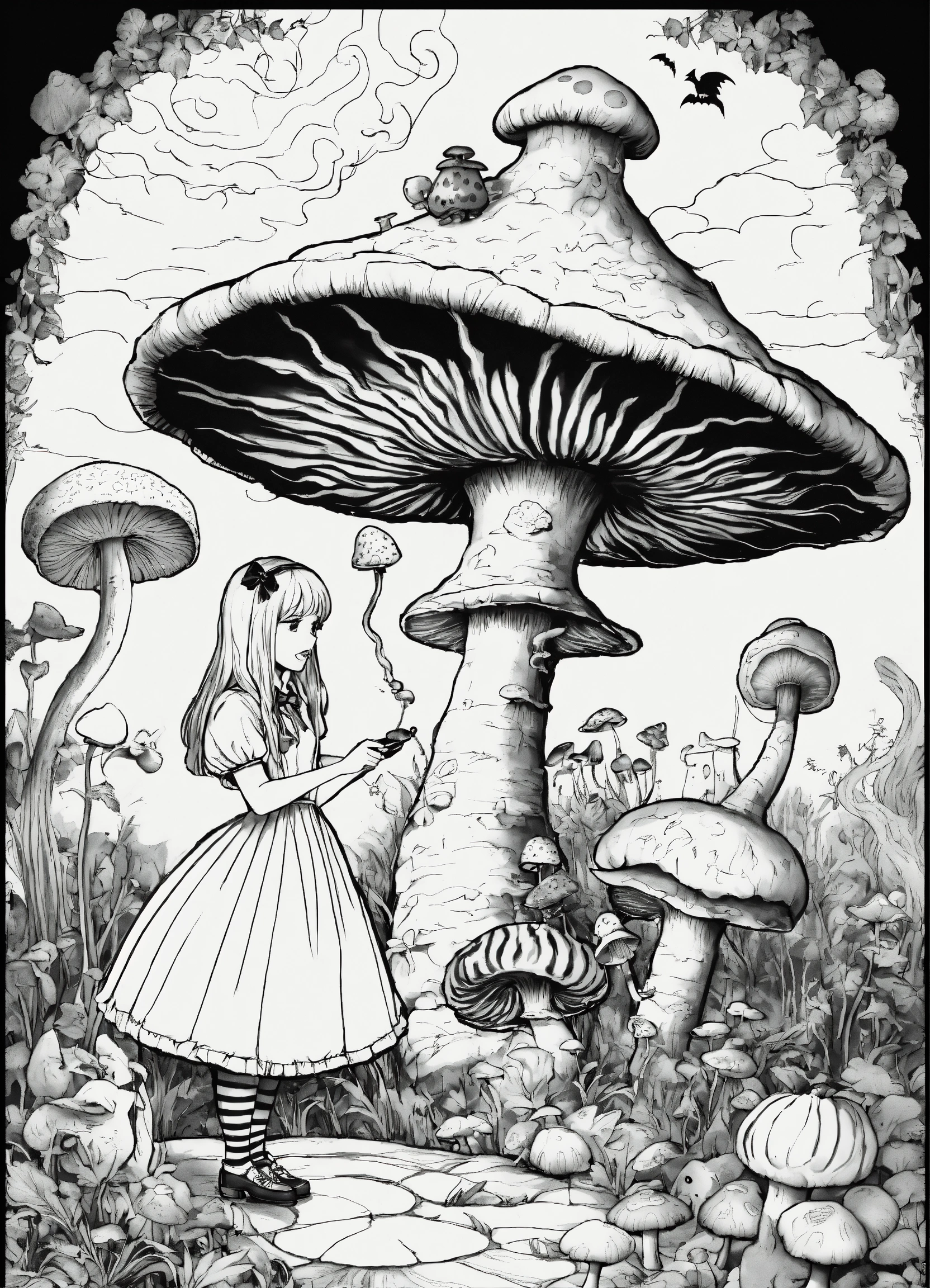 Halloween coloring book, black and white, alice's adventures in wonderland, creepy, twisted, alice standing next to the mushroom, caterpillar siting on top of the mushroom smoking hookah