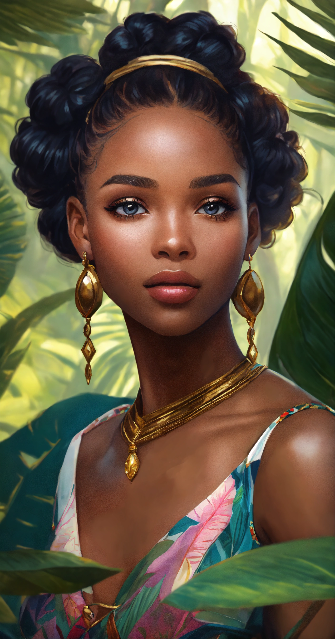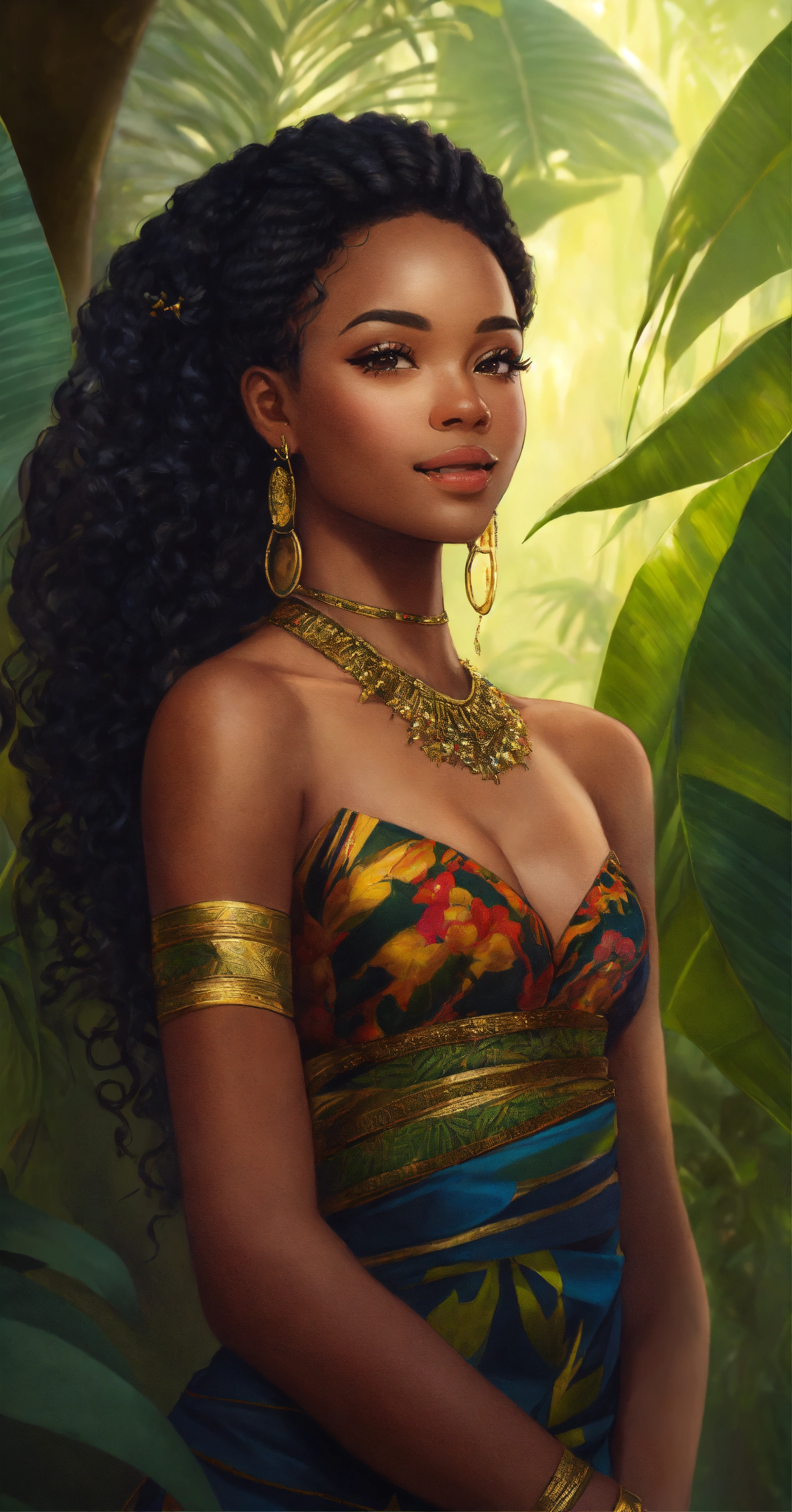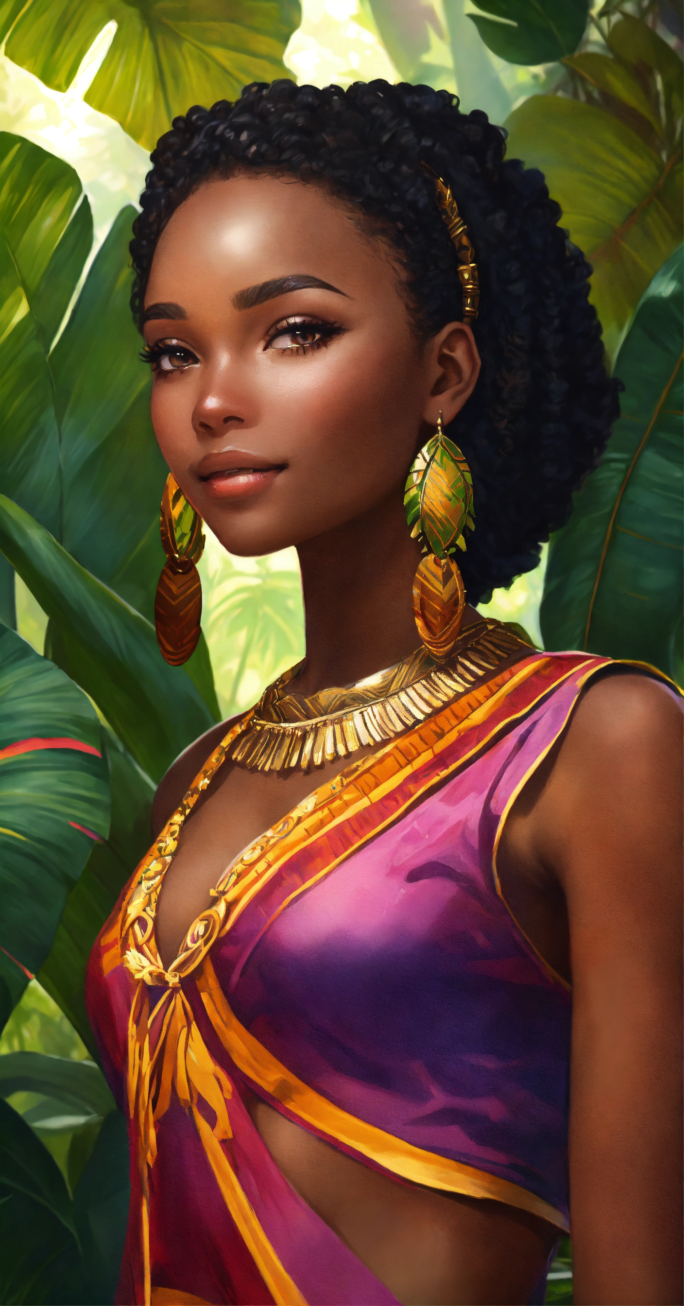 Realistic and detailed portrait, stanley artgerm, very coherent. beautiful young black african woman. traditional ceremony clothing. mysterious tropical jungle. large tropical leaves. long curly brown black hair. queen hairstyle. traditional ceremonial makeup. black panther in the background. cute. dove cameron. smiling.