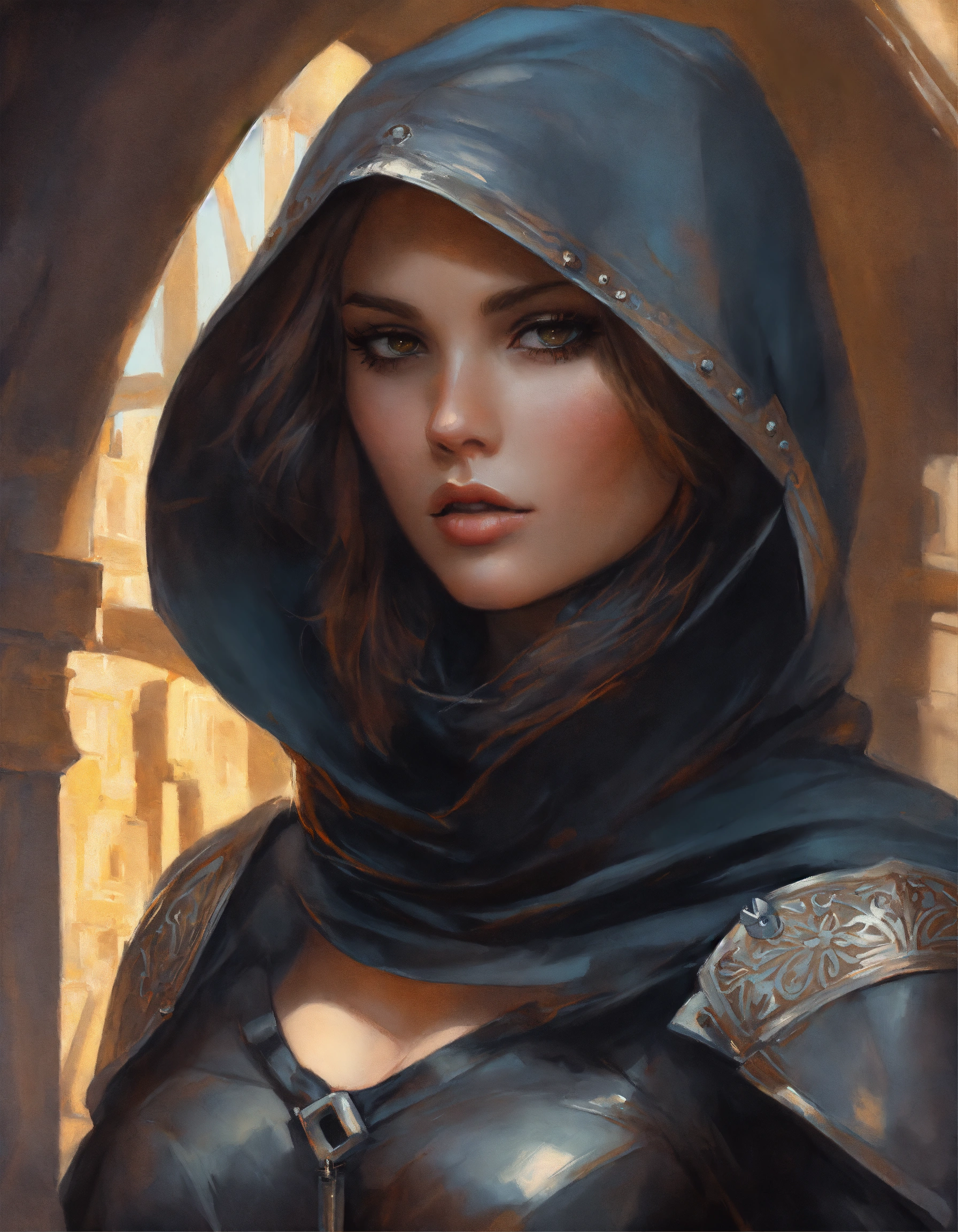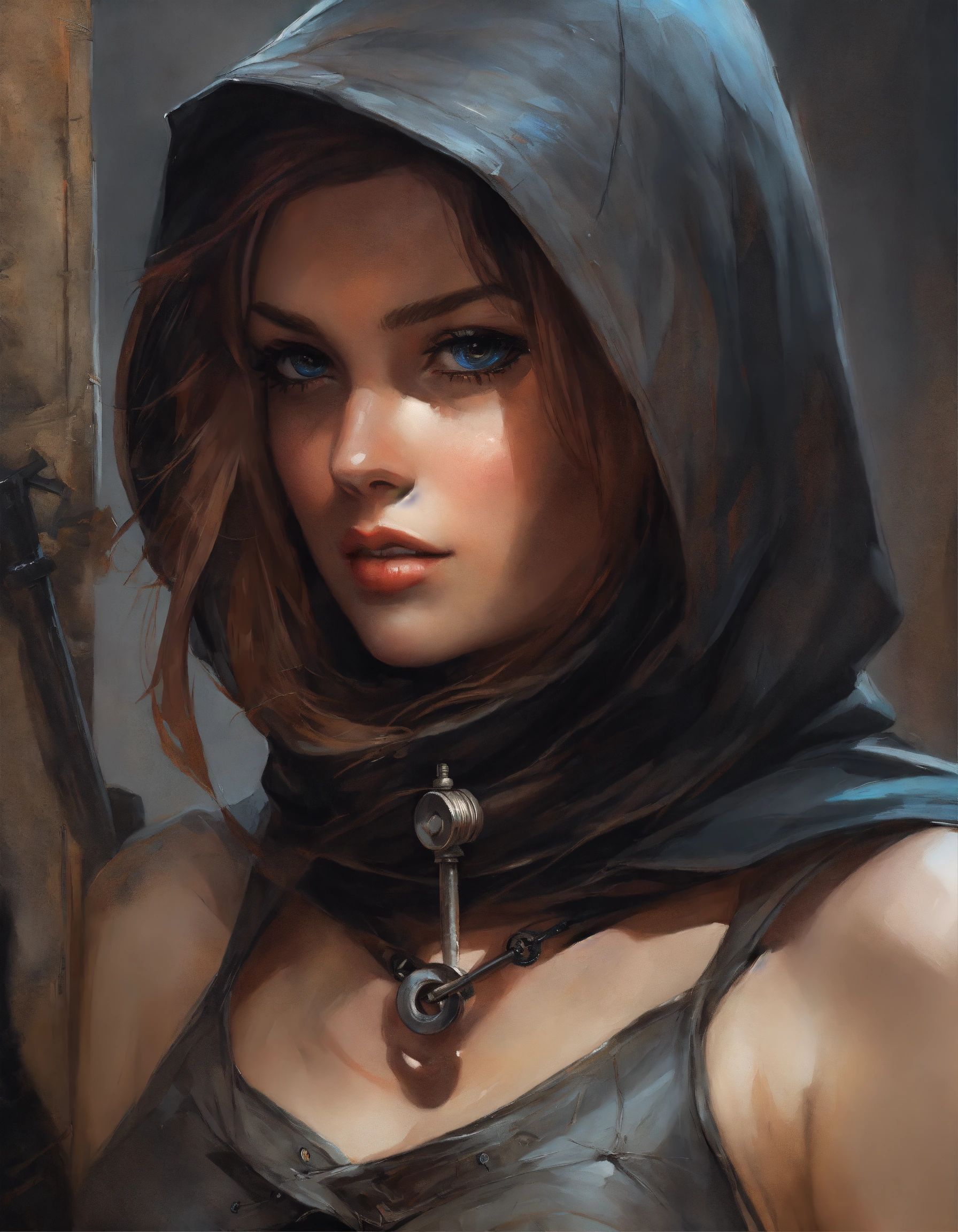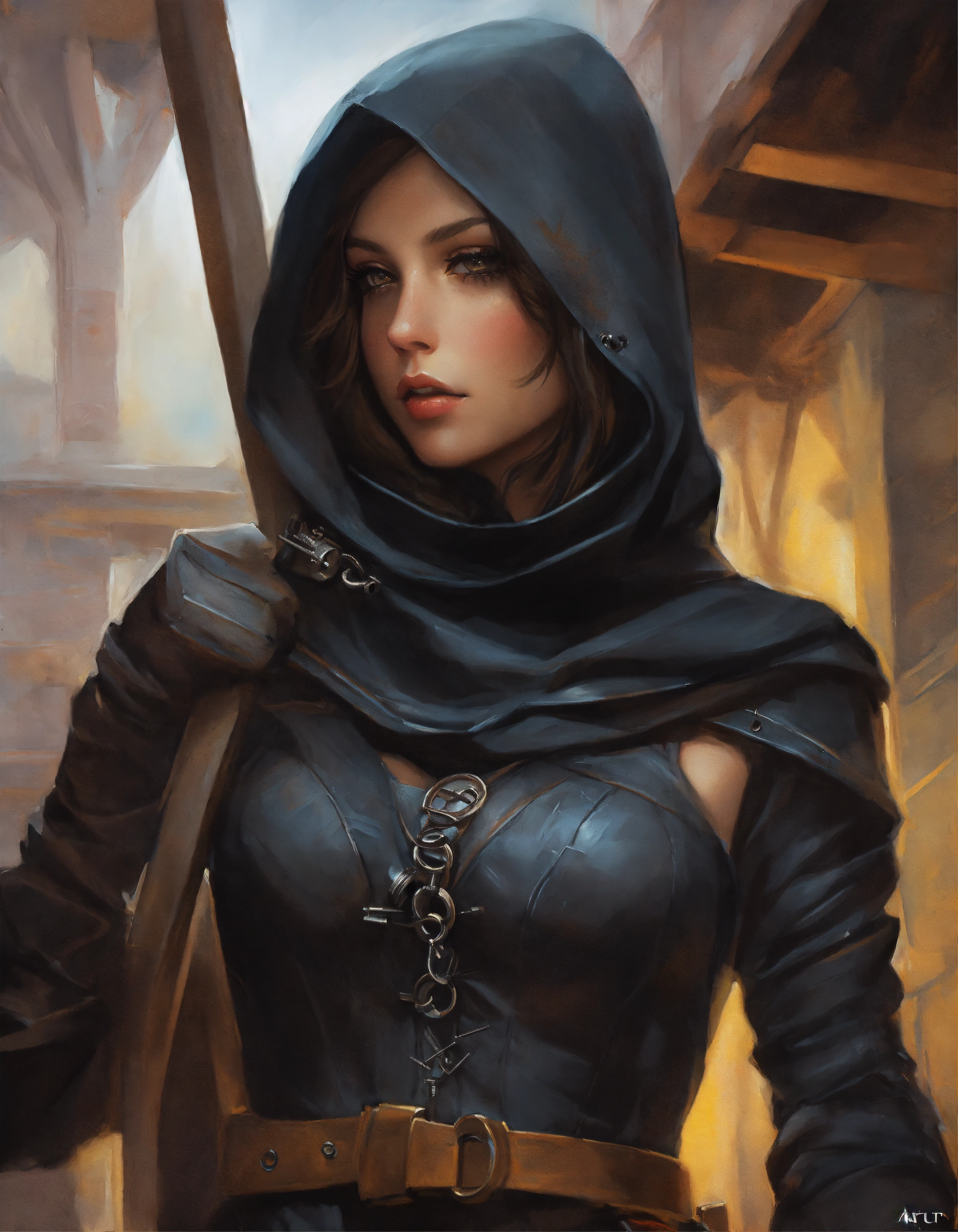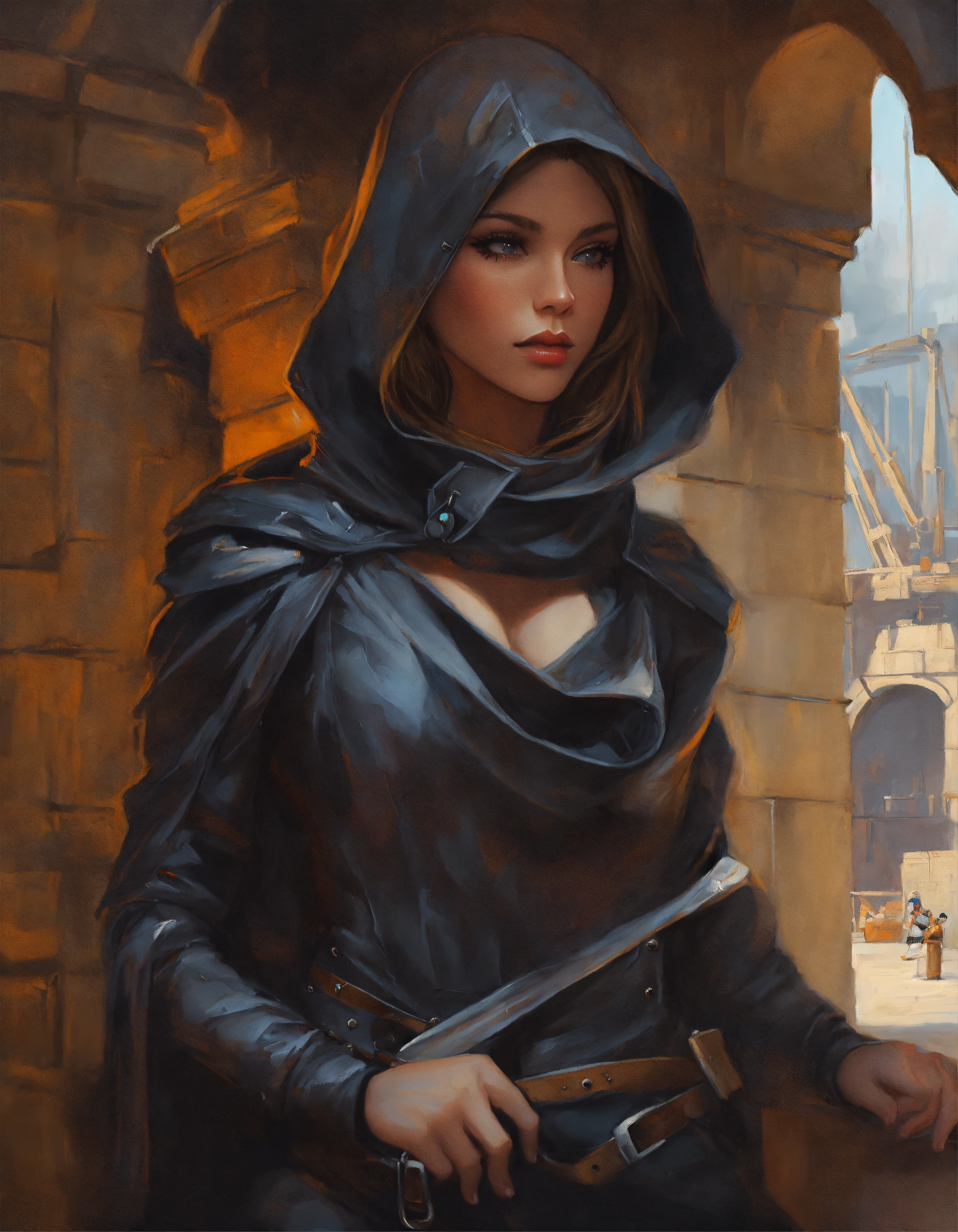 Fantasy painting, medieval female thief in black fitting cowl, screws a screw out of an constuction, trending on artsation, by artgerm