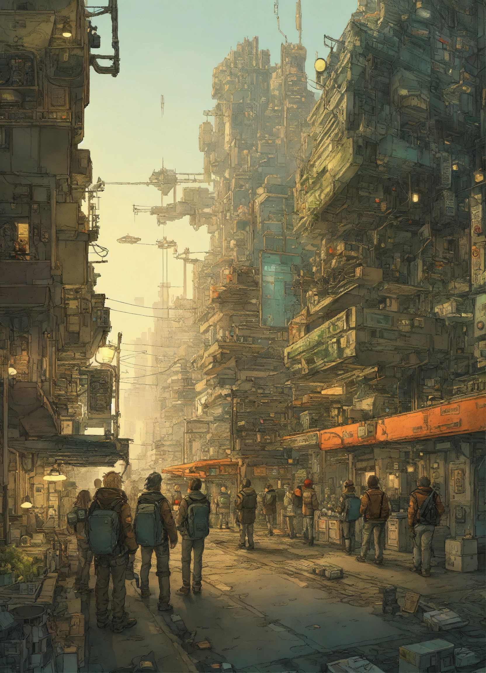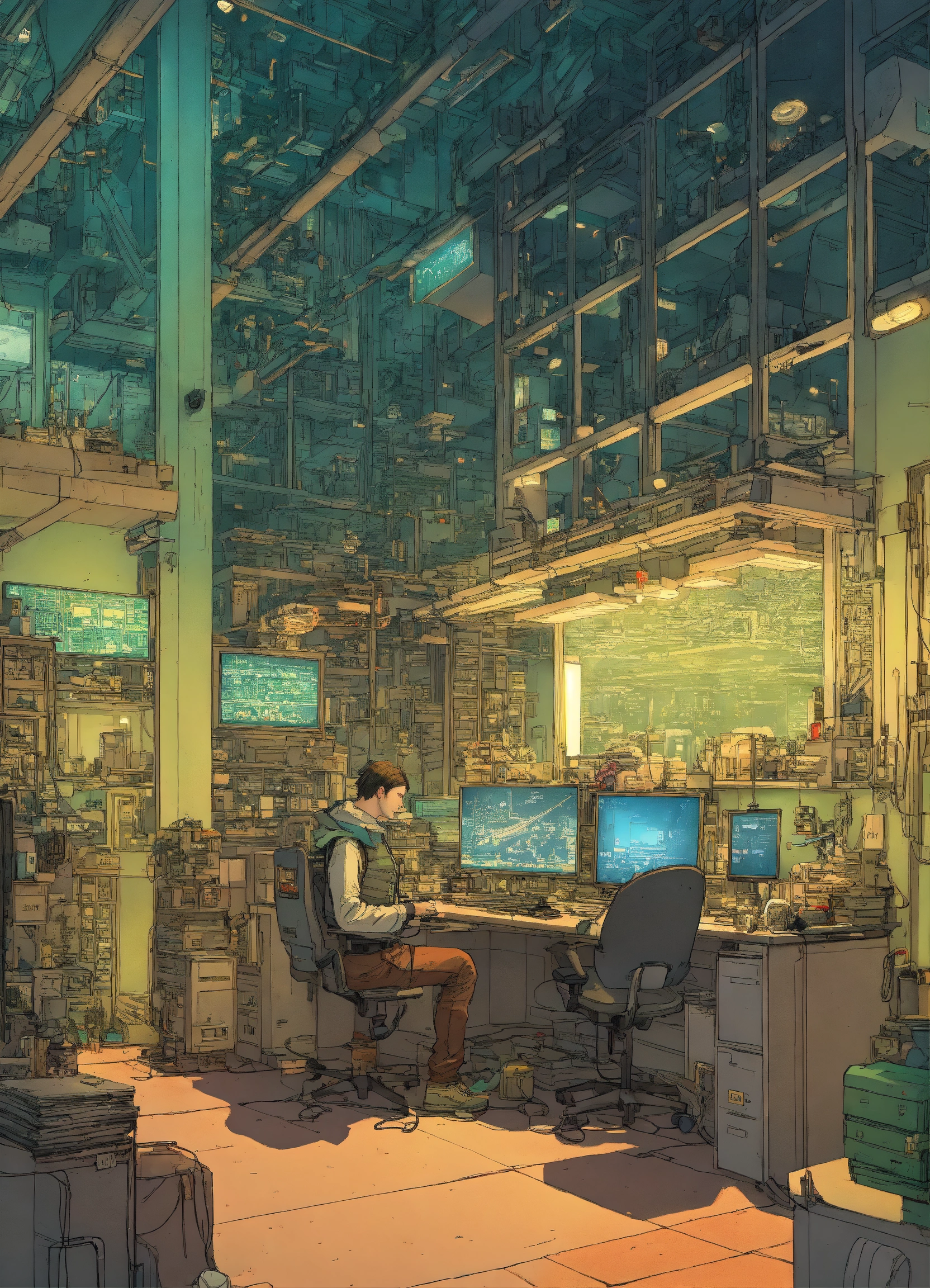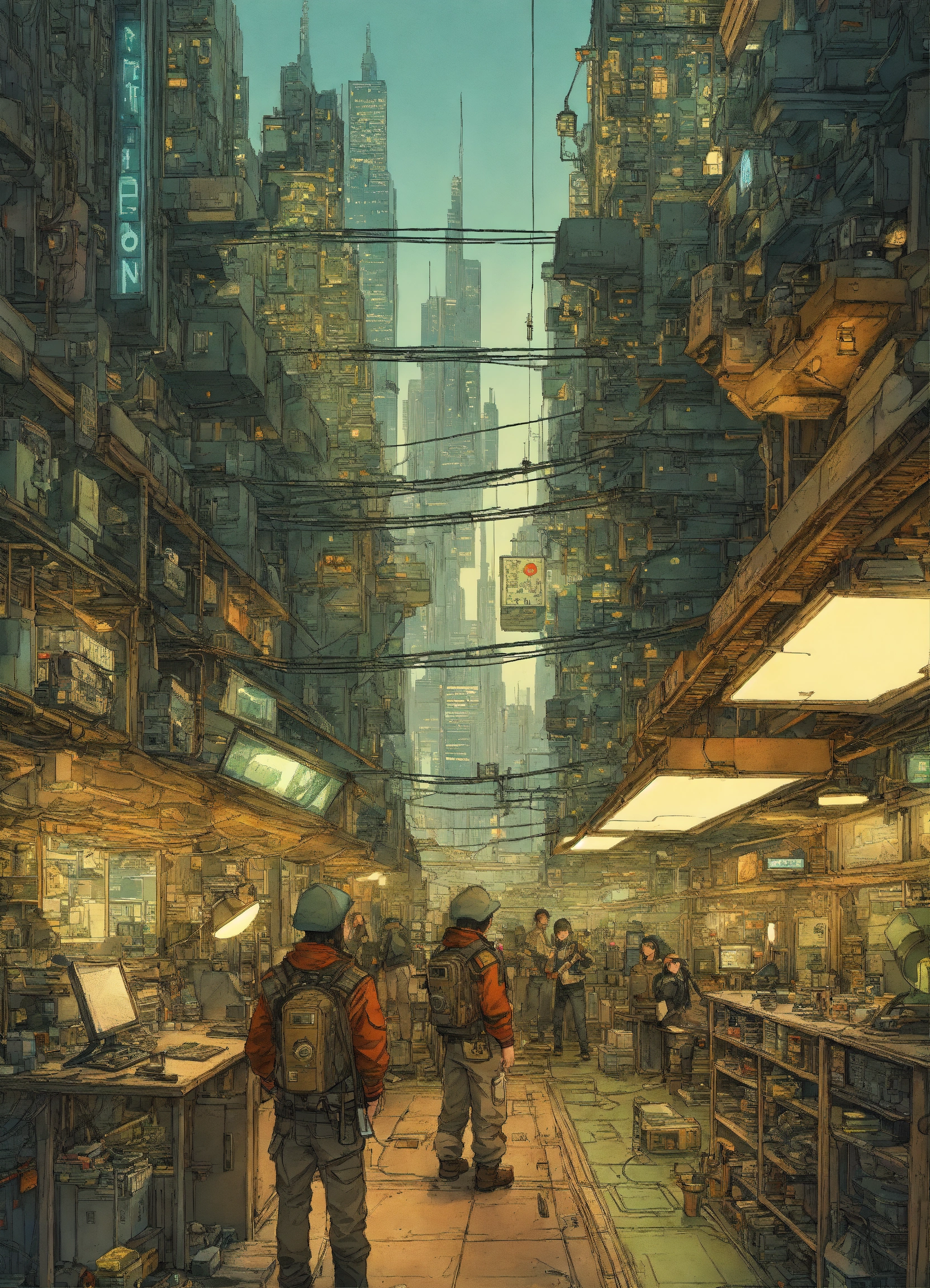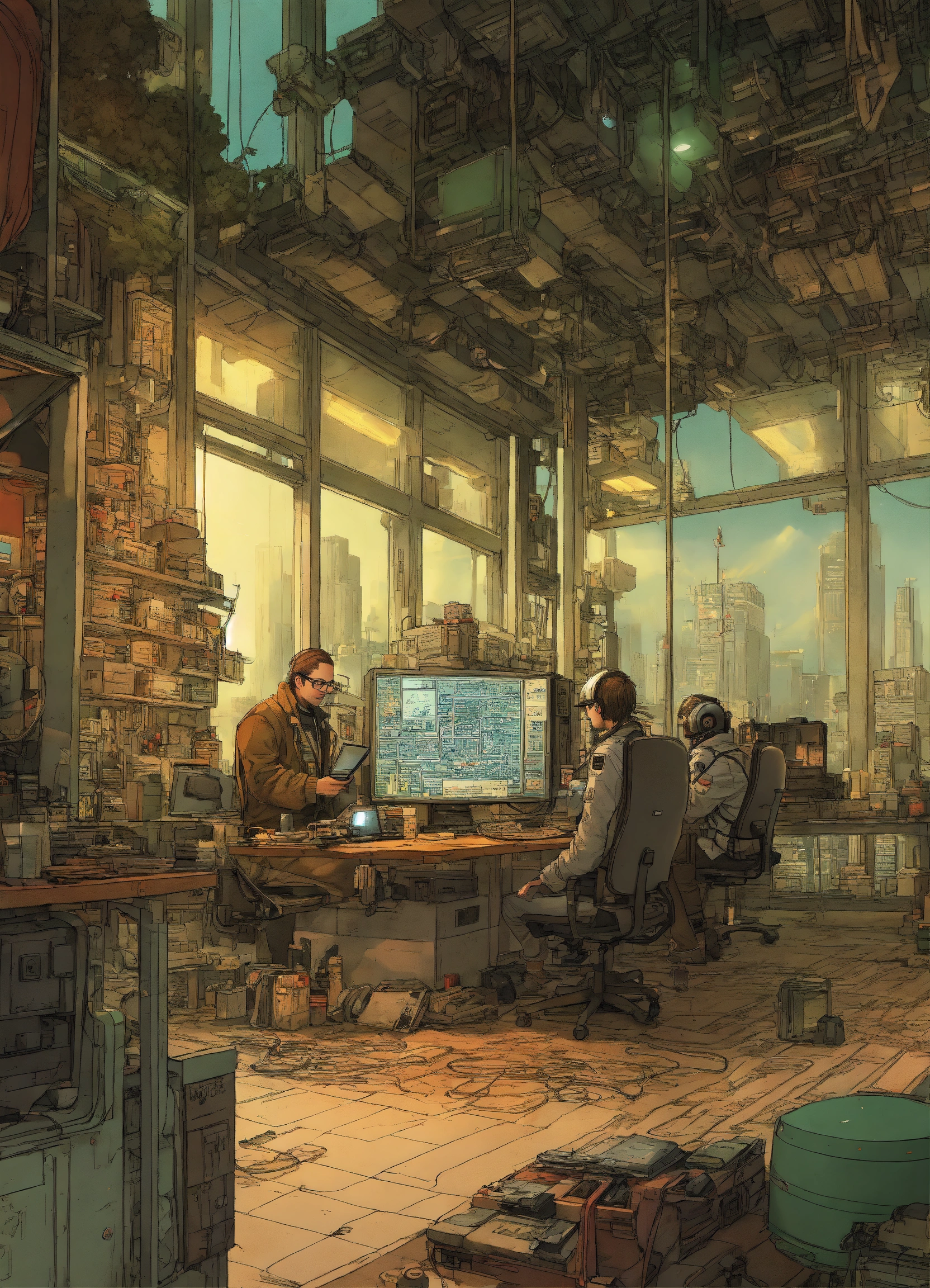 Futurepunk team of software engineers, office in cyberpunk megacity, assembled cast, atmospheric lighting, wide-angle perspective, ultra-high definition (uhd), very detailed, by mattias adolfsson