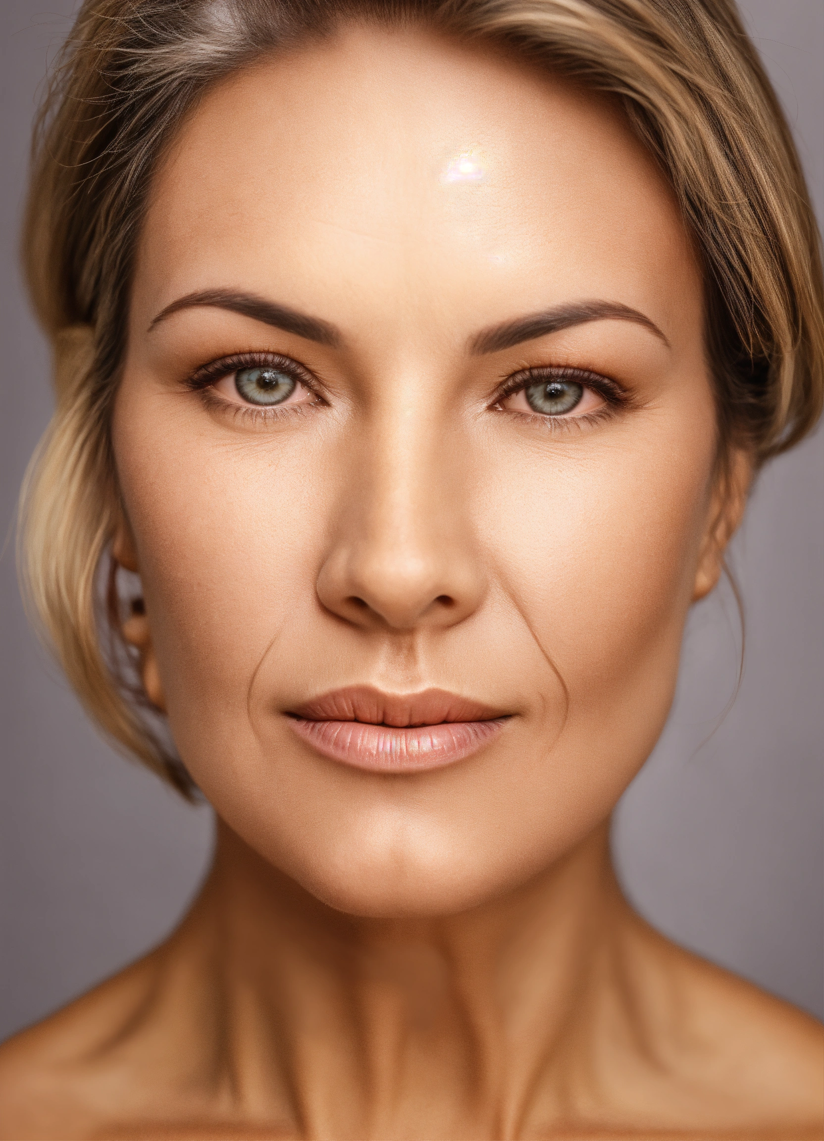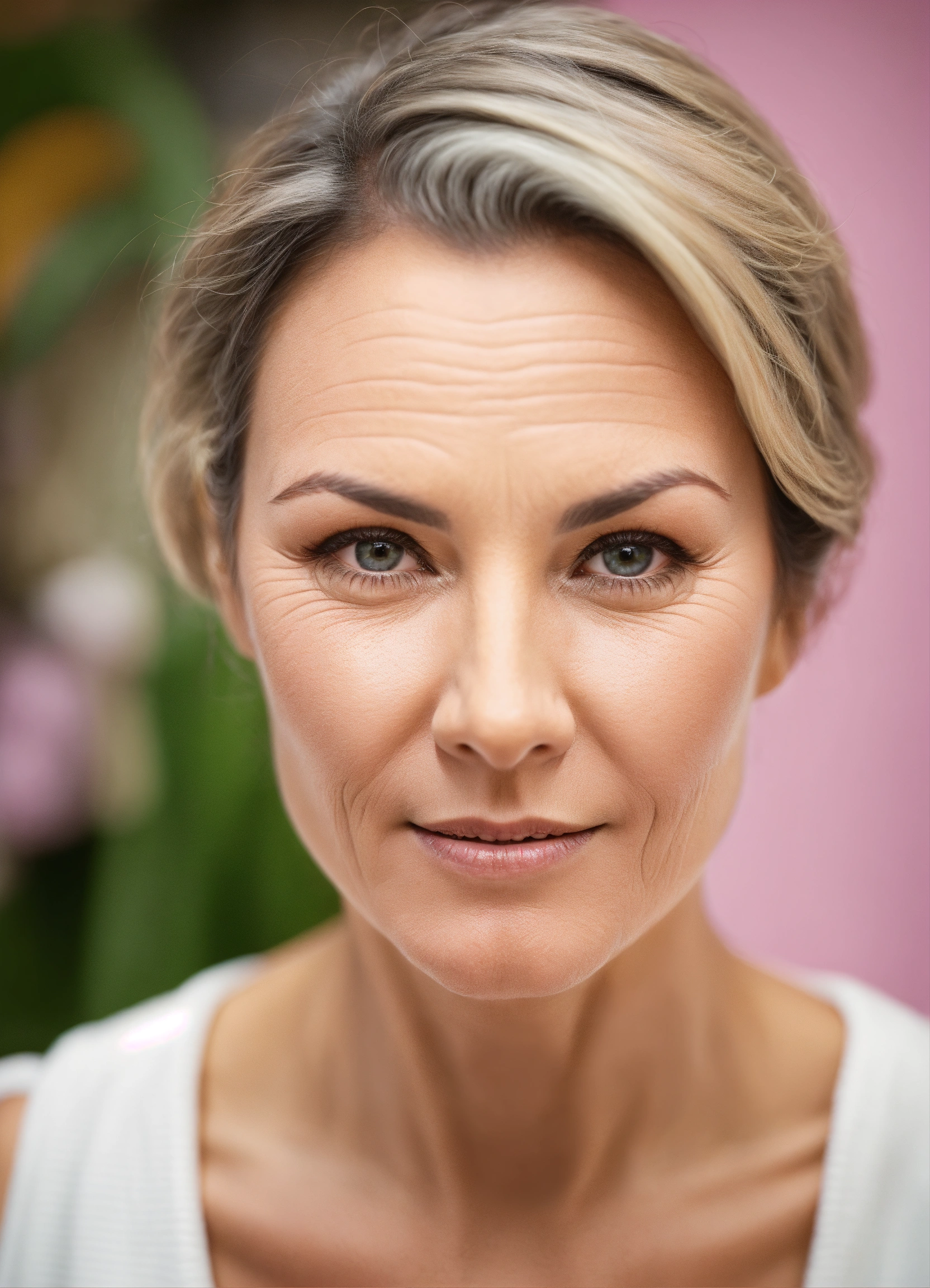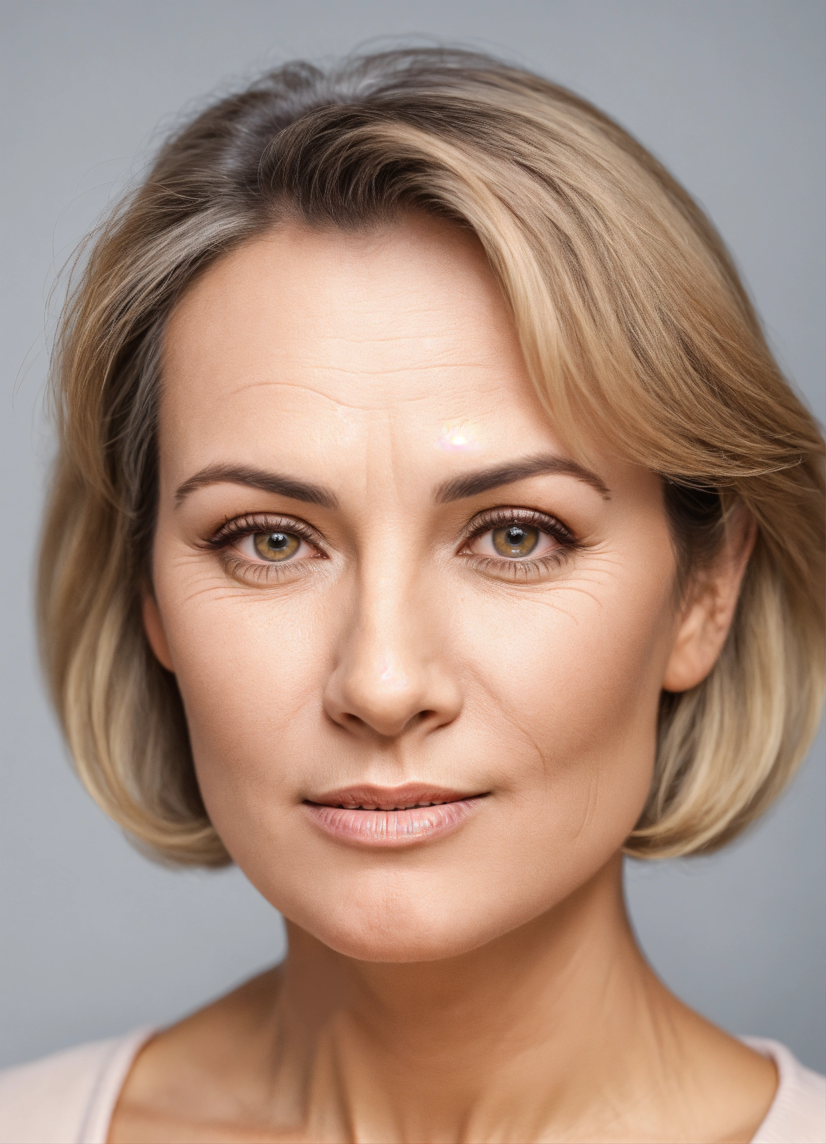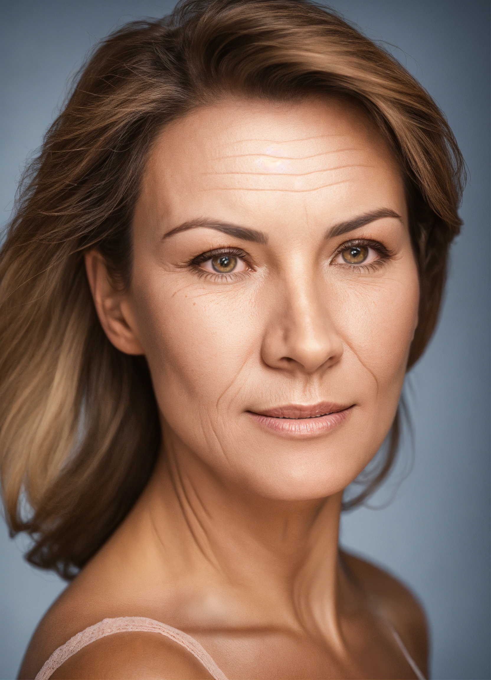 A confident middle-aged woman in her late 40's with a wrinkled forehead in need of botox treatment at a beauty clinic