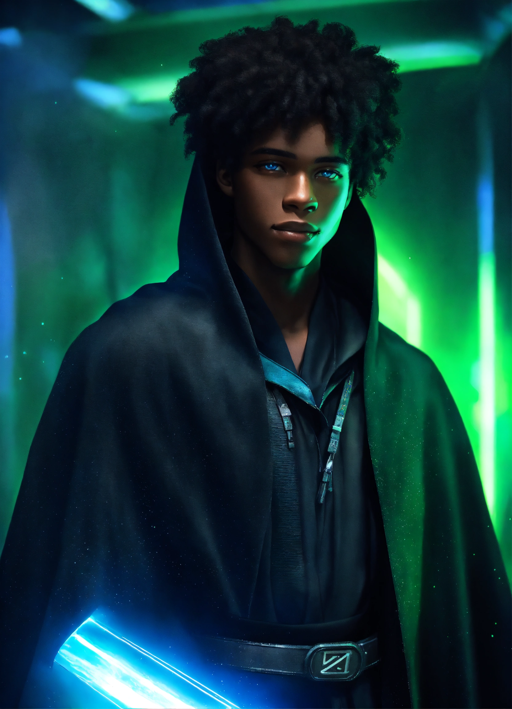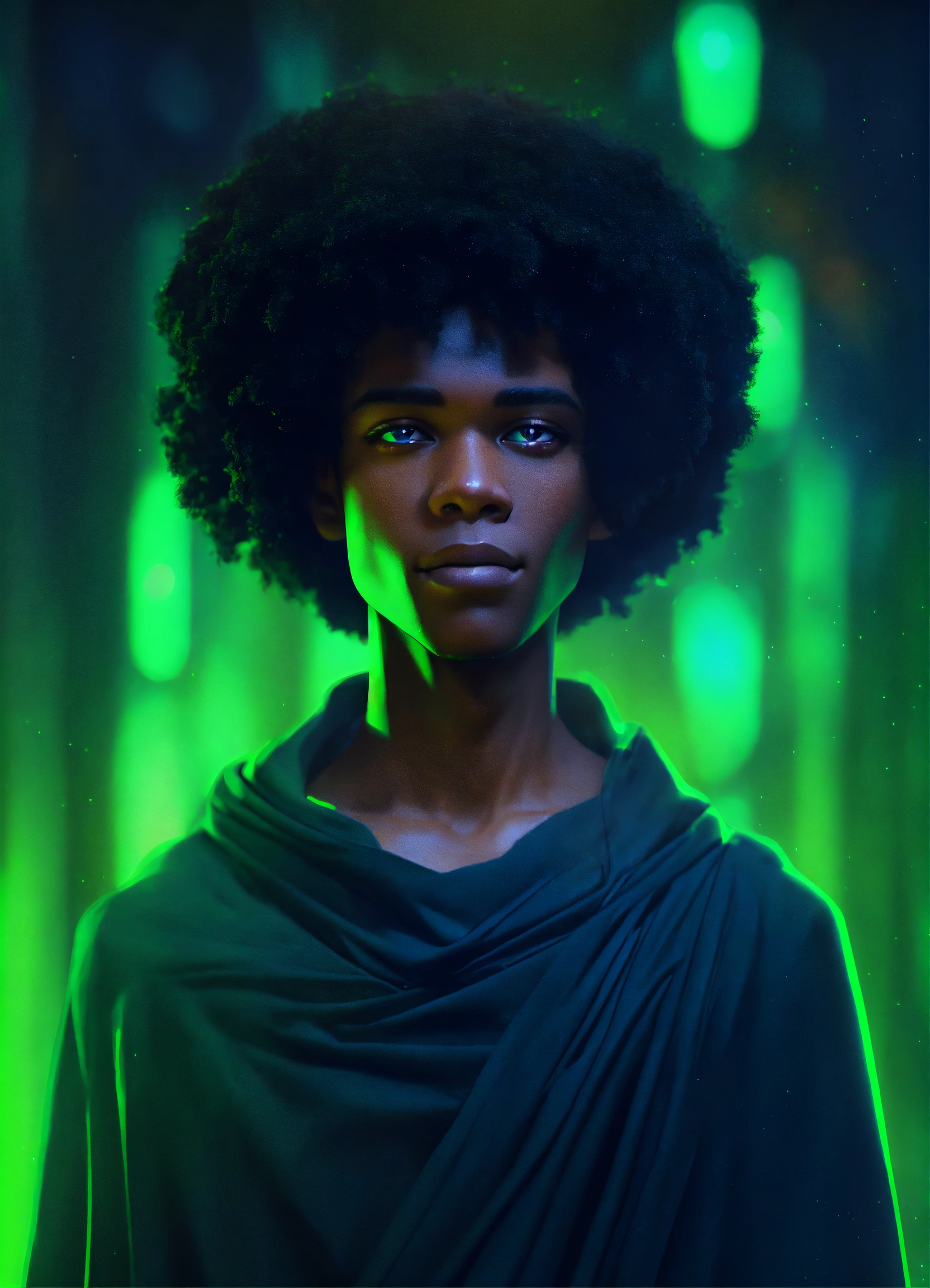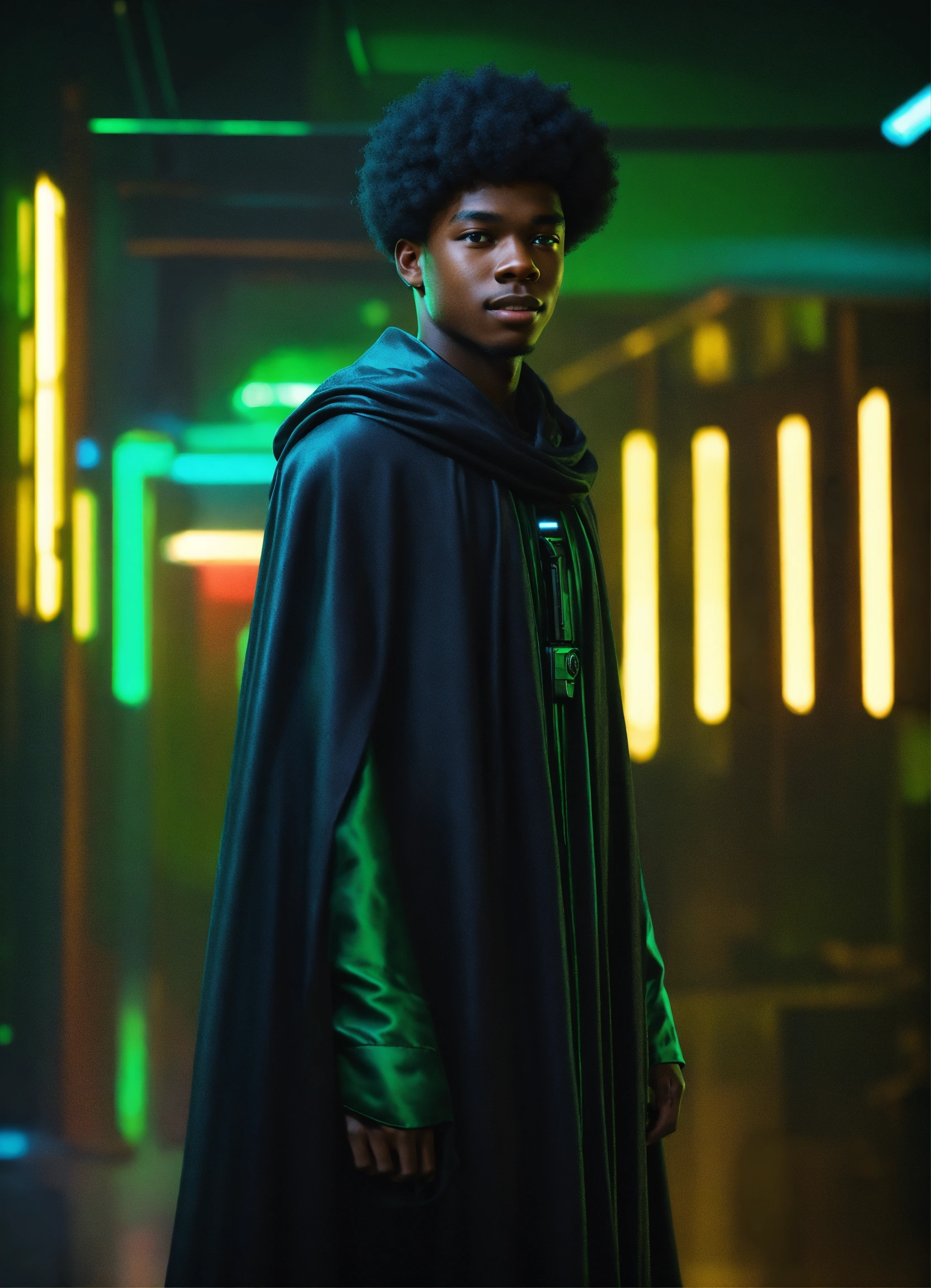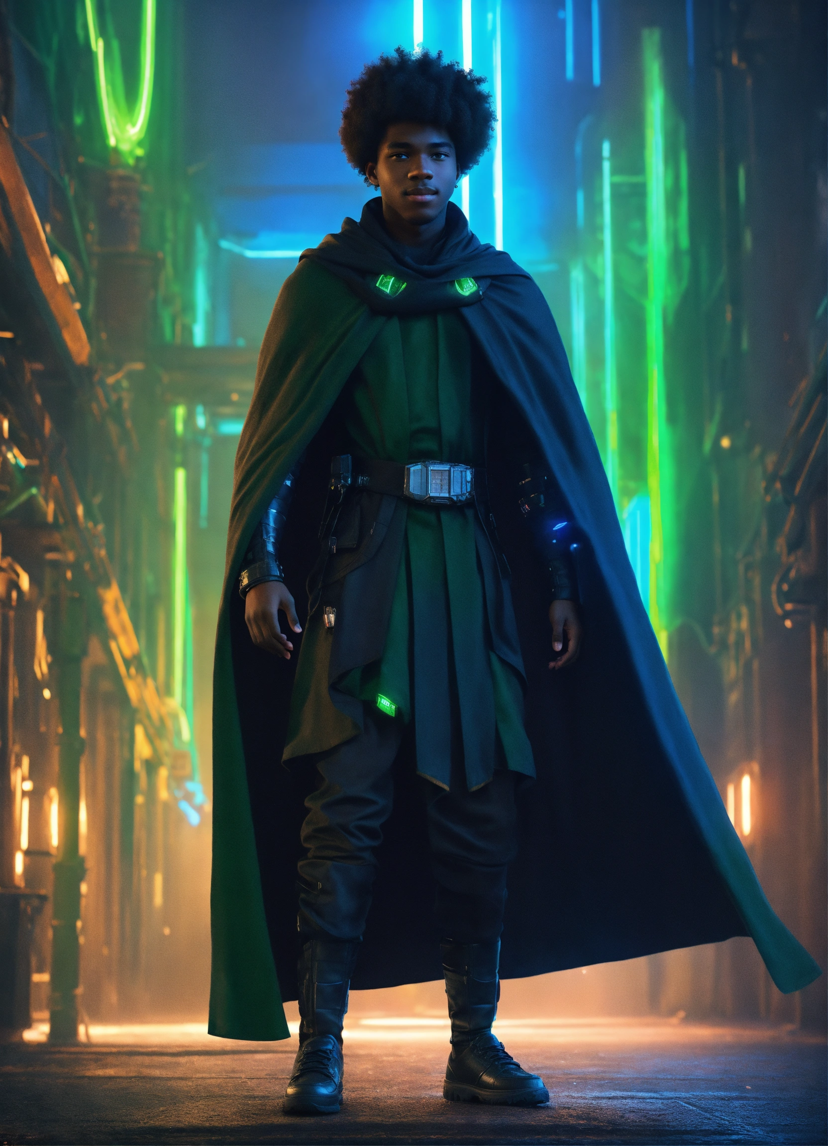 Full body of a black scifi 18-year-old man wearing dark draped clothing, blue eyes, black cloak, green lighting, sci fi, small smile, cool pallet, epic, alternative history, kind face, cinematic lighting, small fro, nice, nerdy looking, cinematic, digital painting, 3d, realistic, 8k, high quality, epic