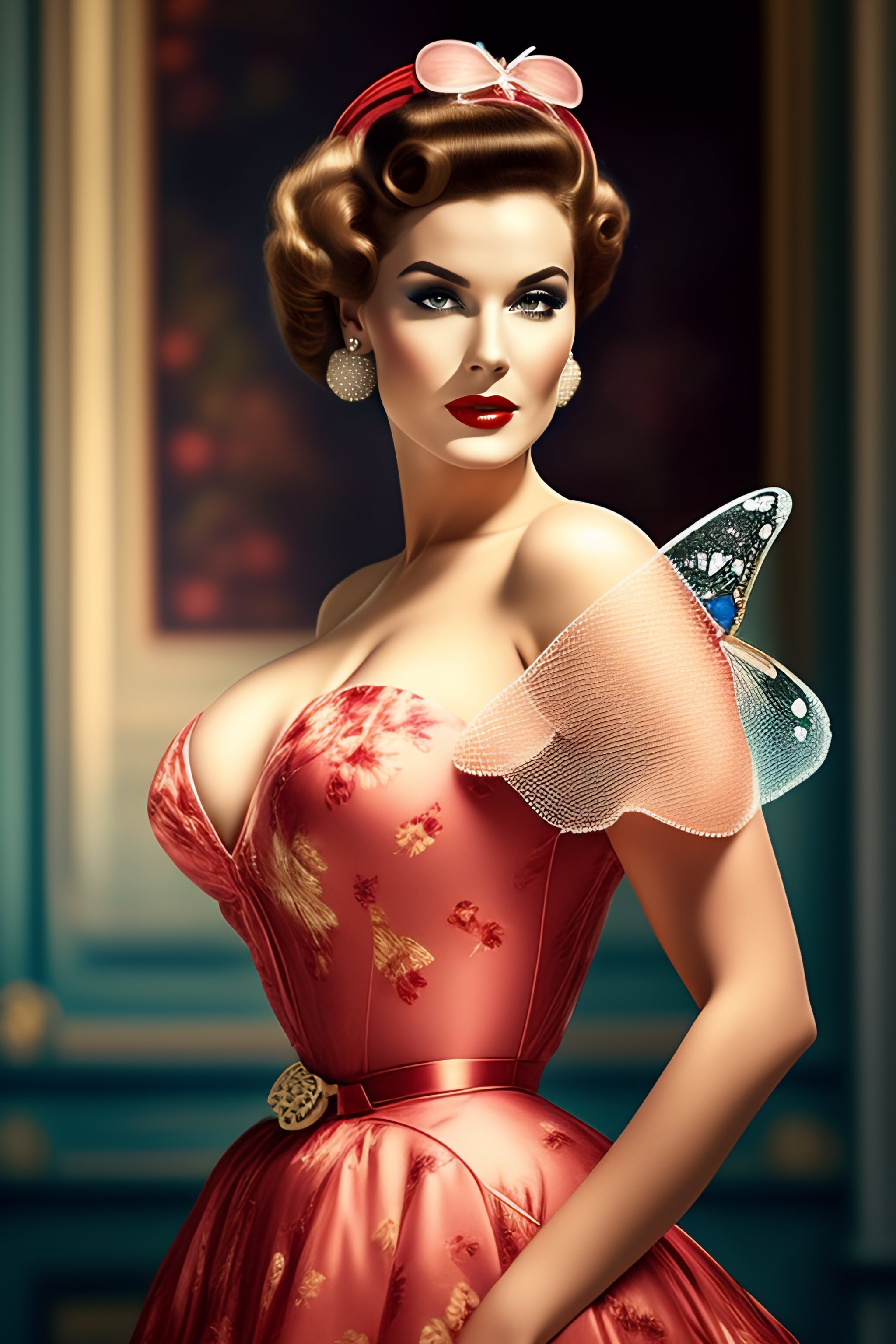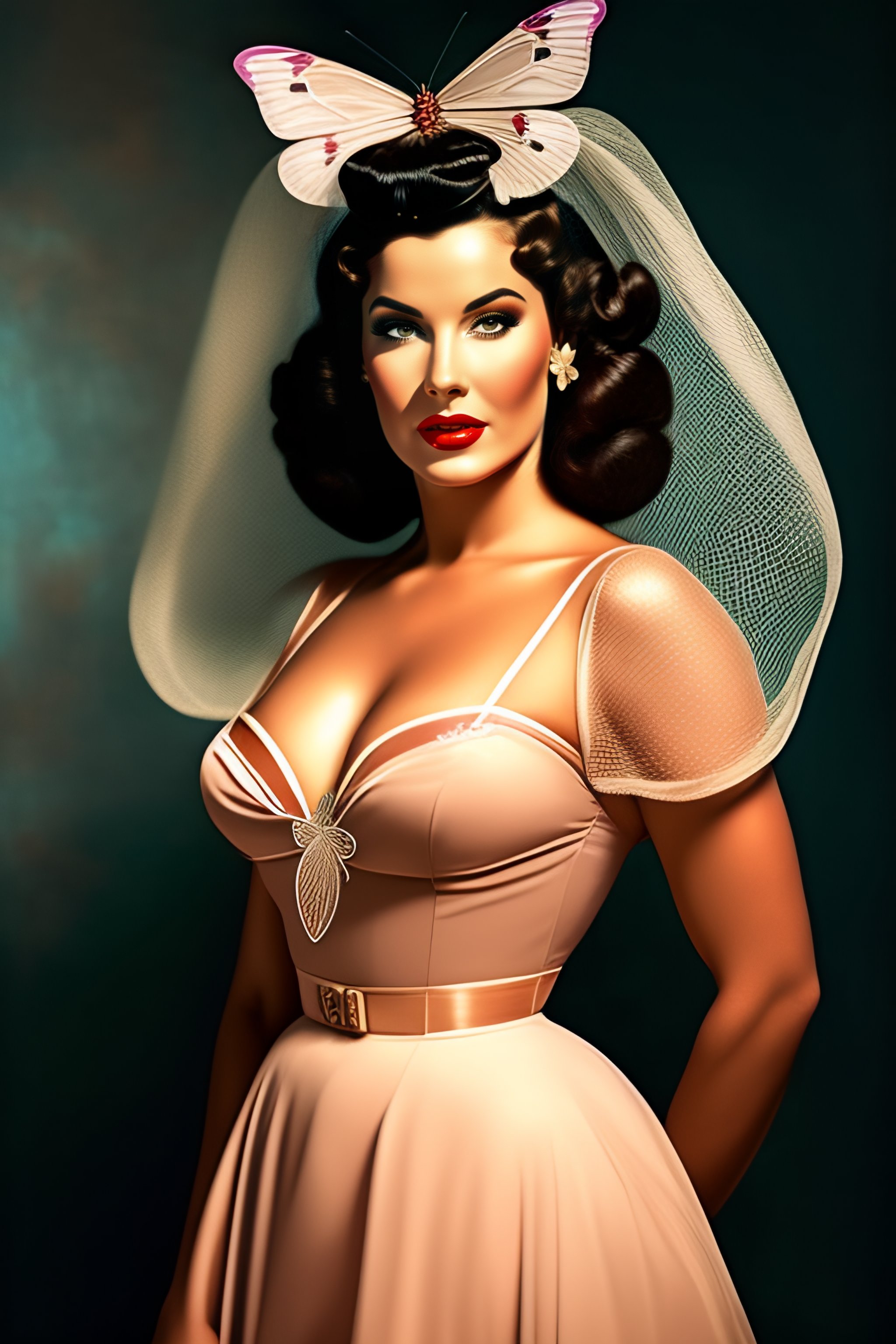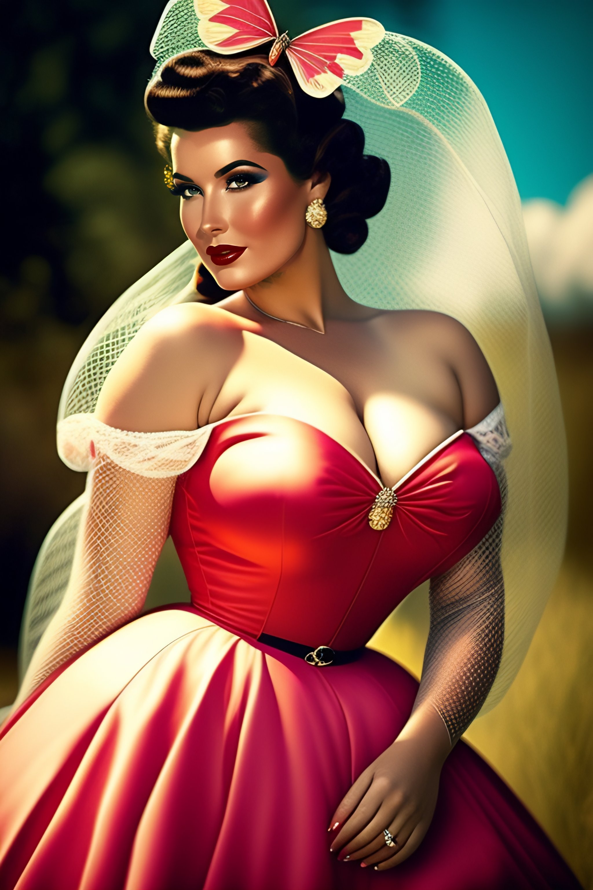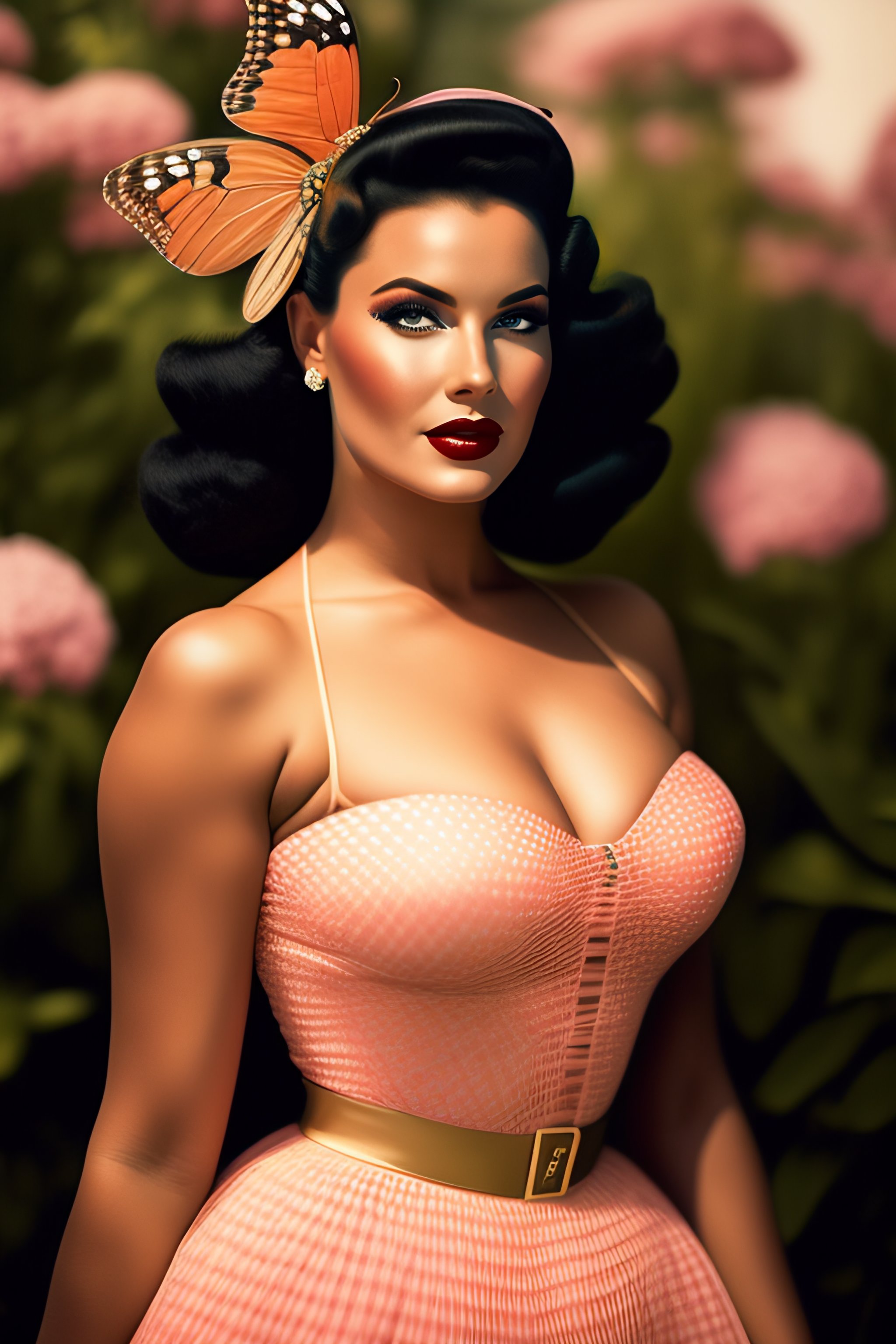 A beautiful woman with a butterfly net in 1950s pinup style