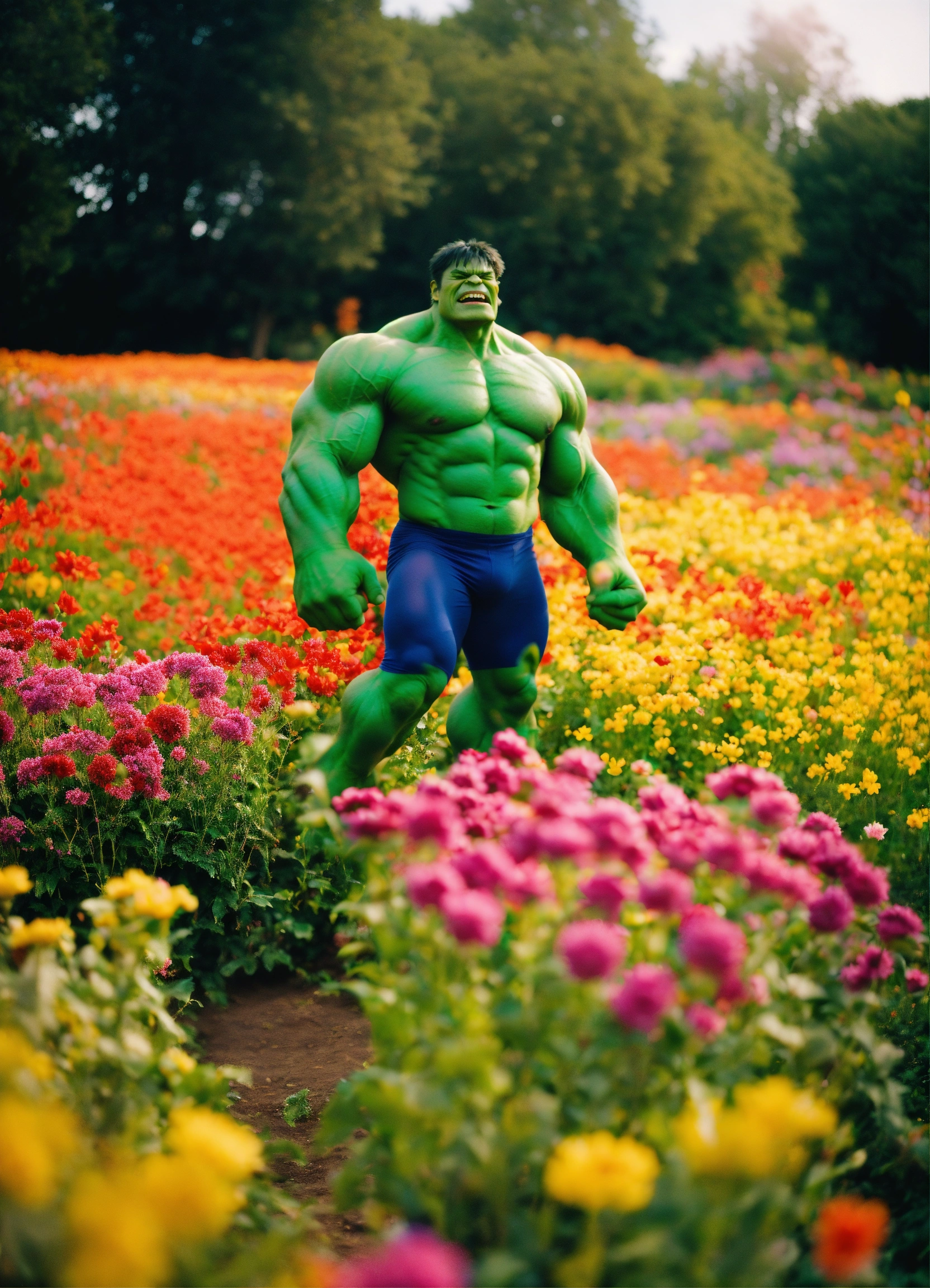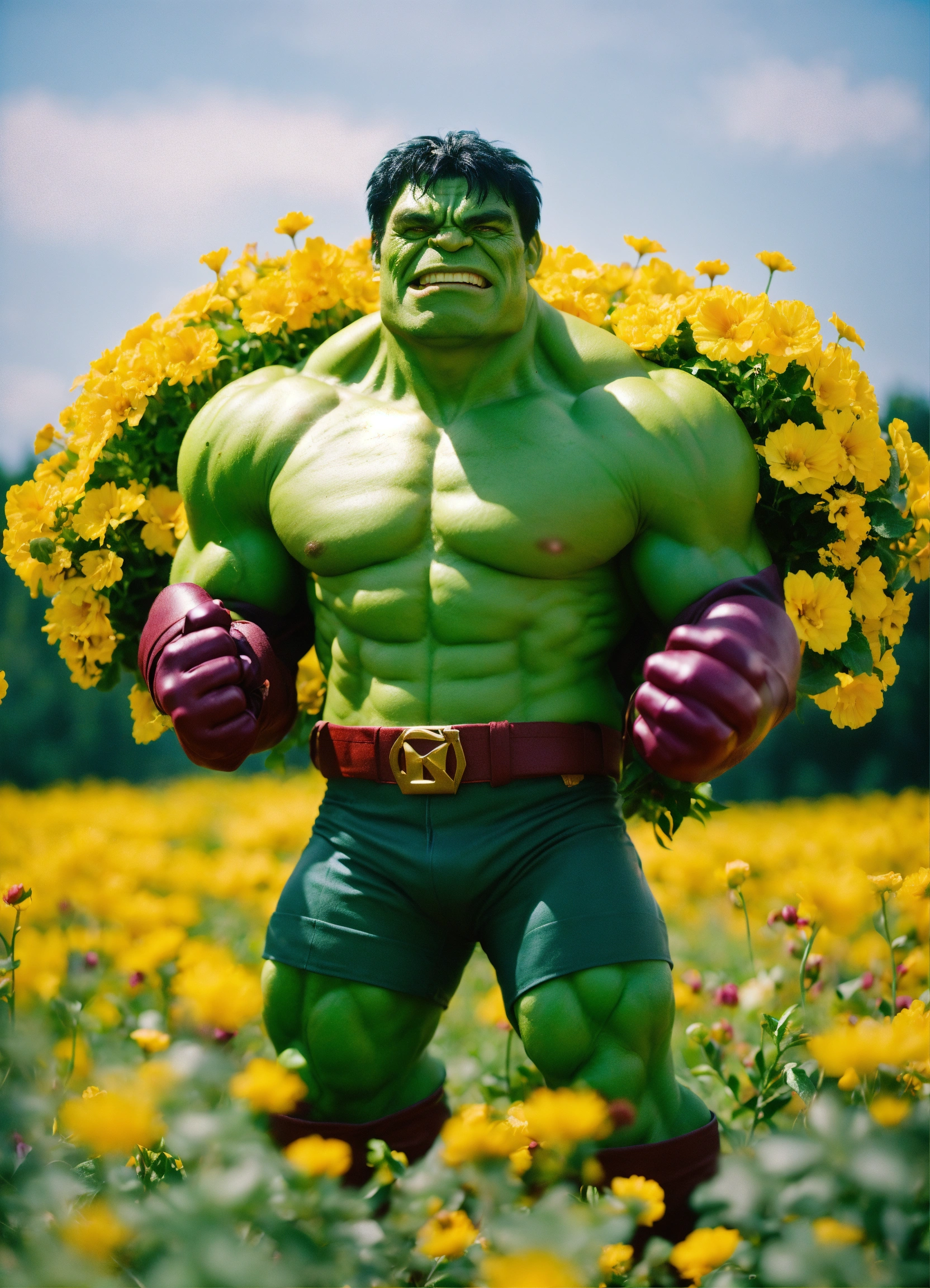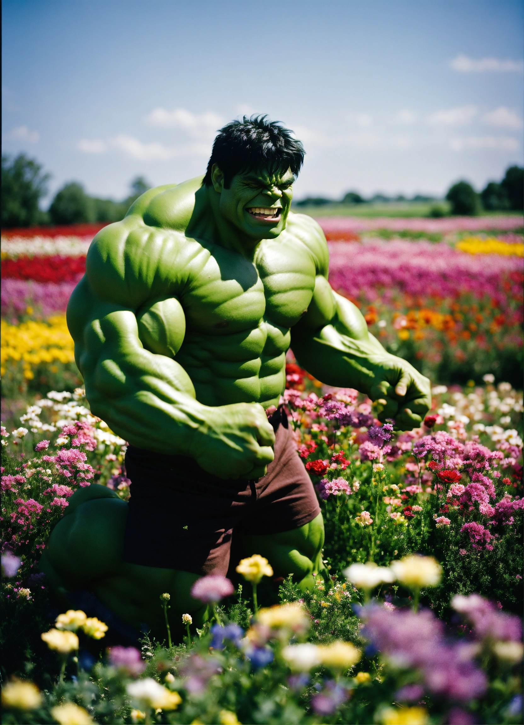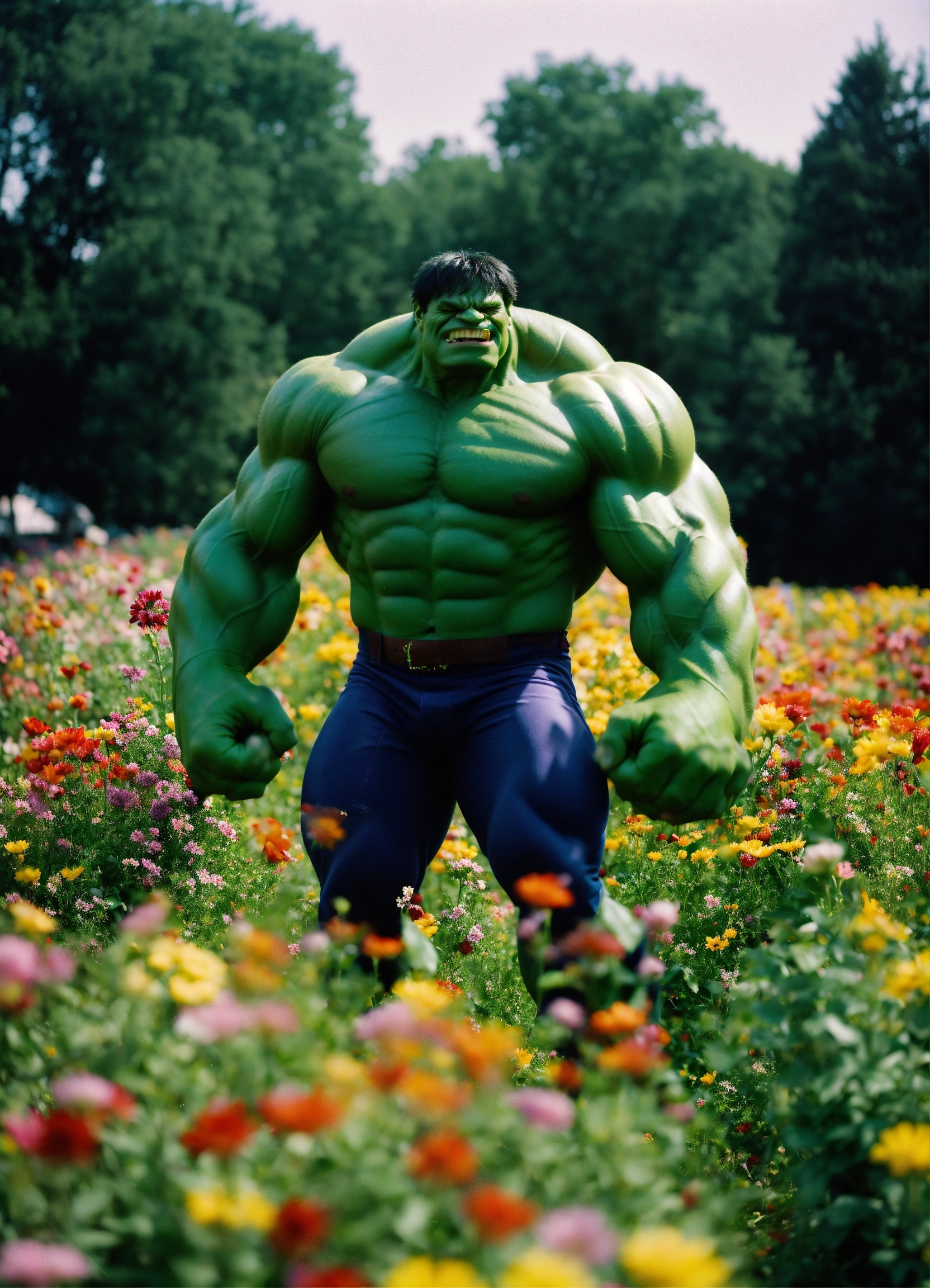 Happy hulk standing in a beautiful field of flowers, colorful flowers everywhere, perfect lighting, leica summicron 35mm f2.0, kodak portra 400, film grain
