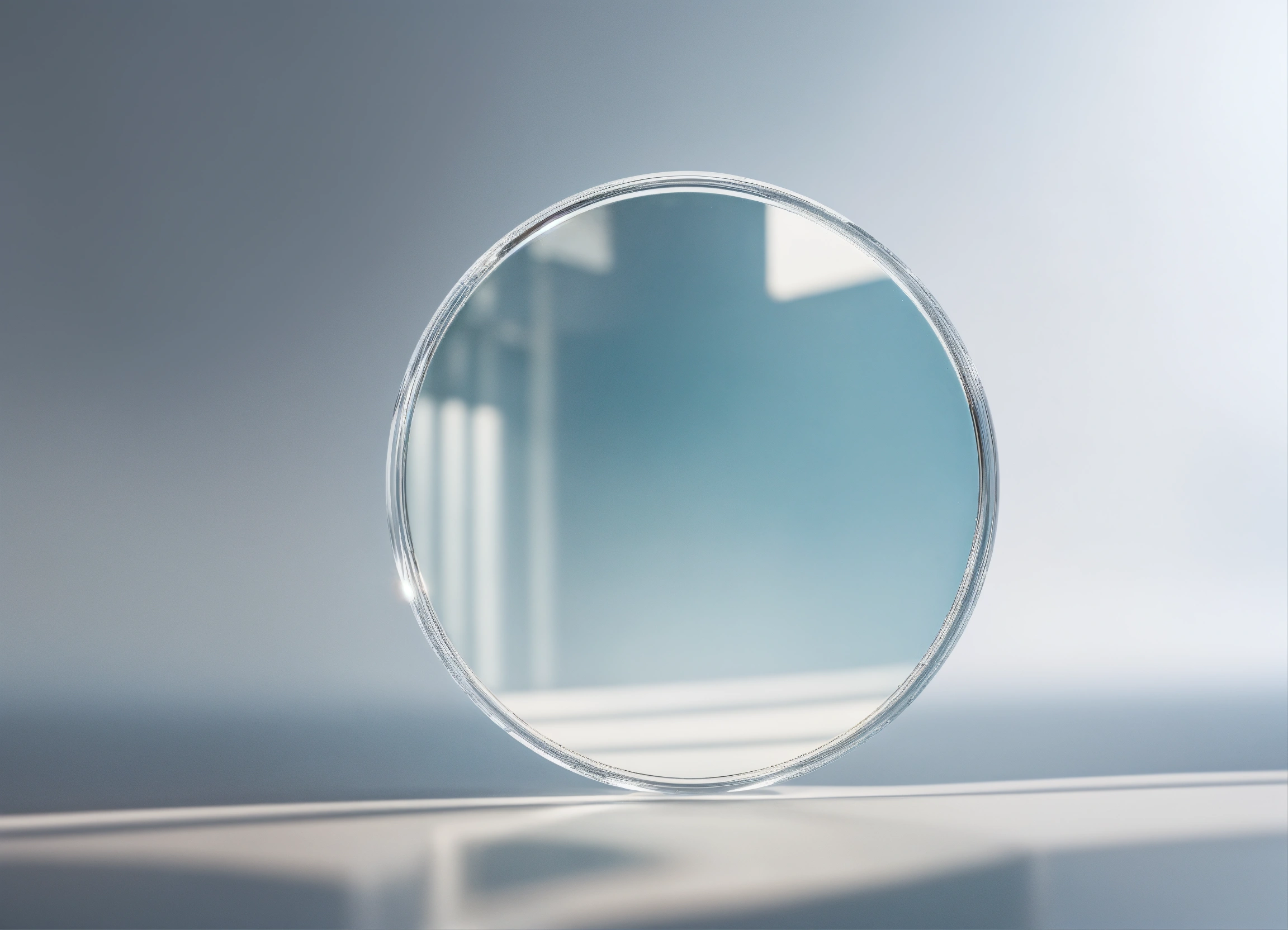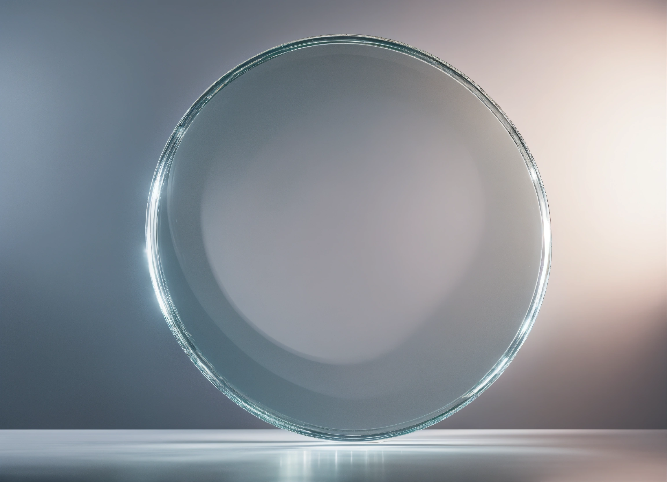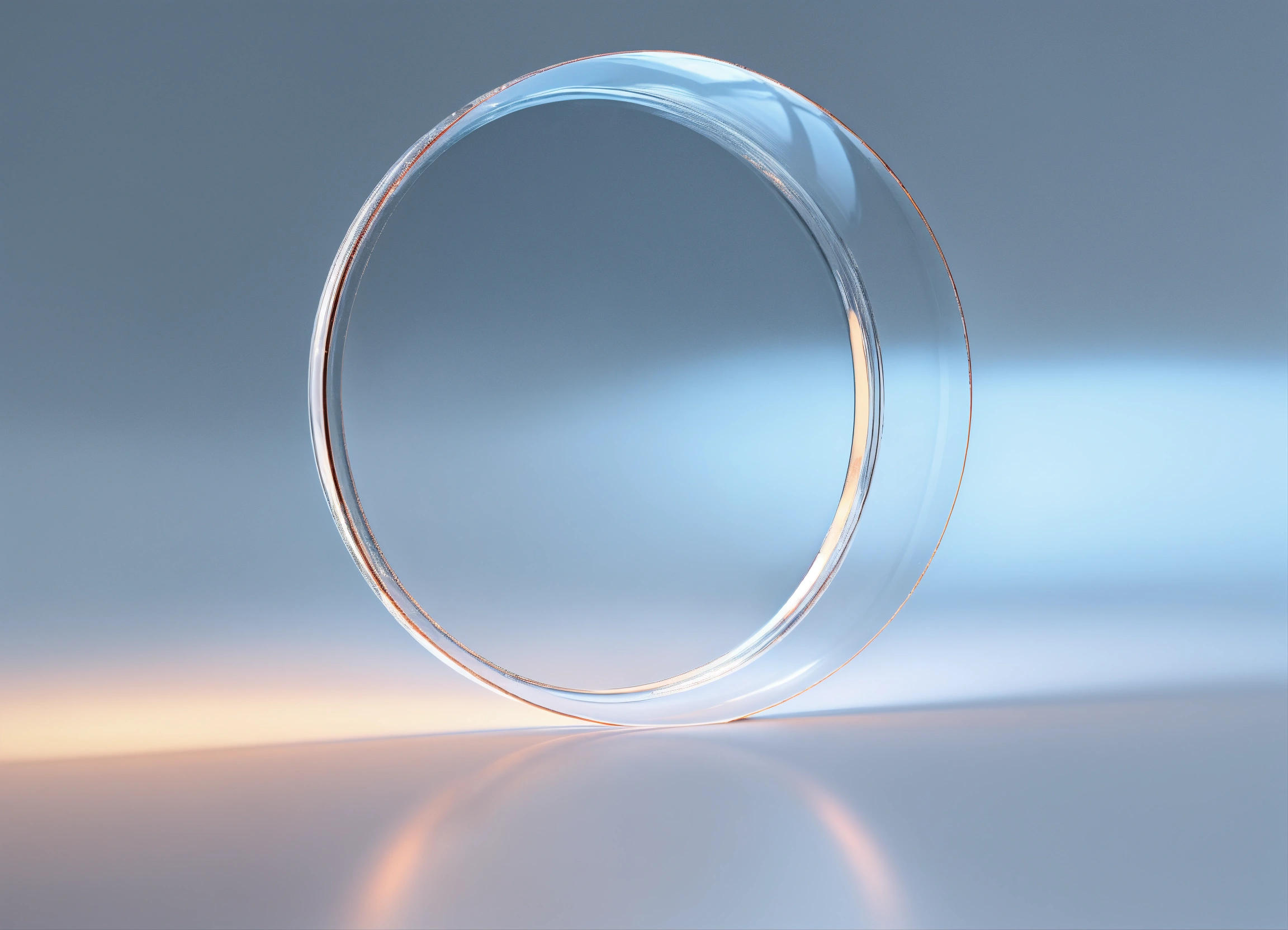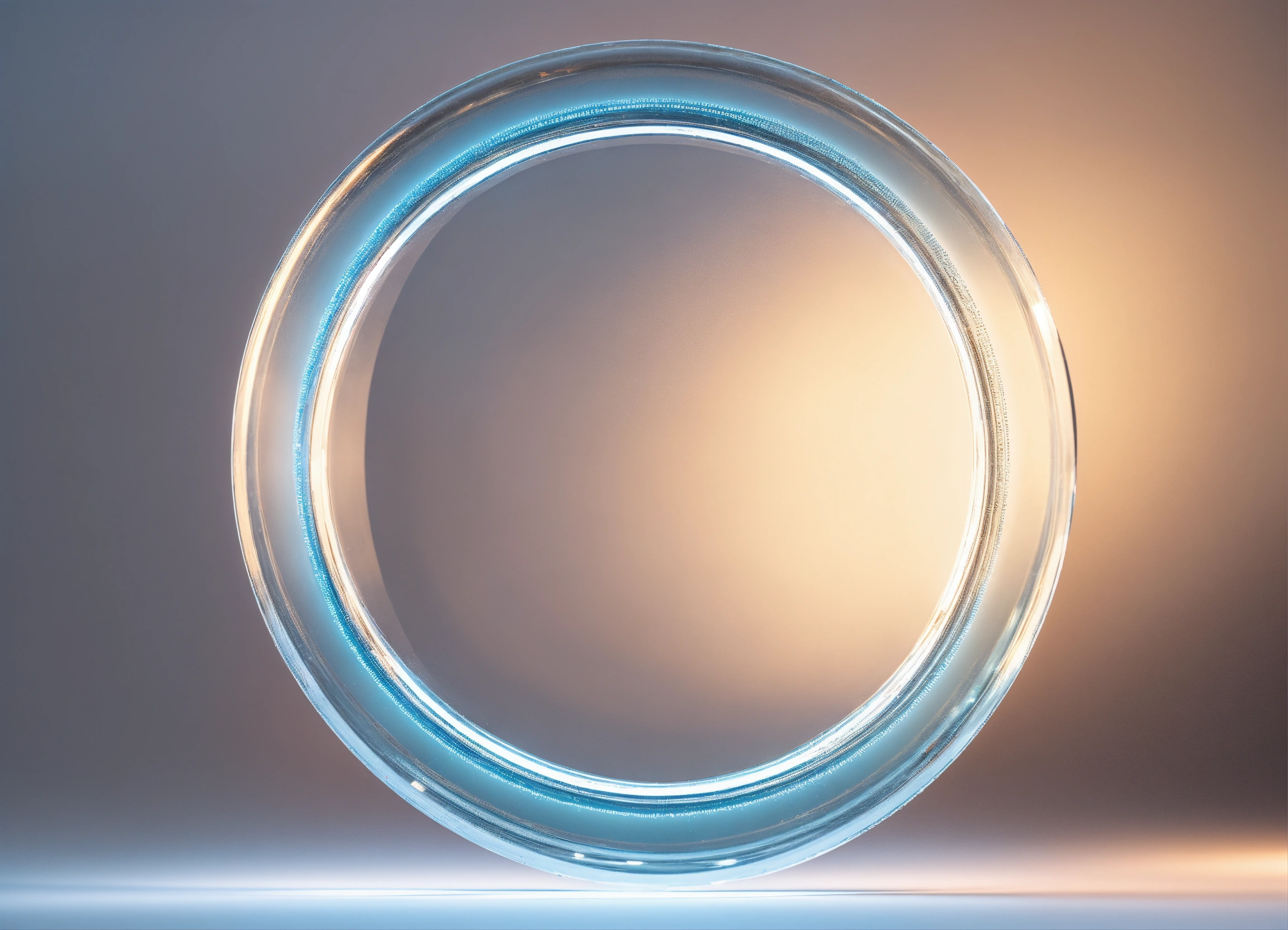 Ultra thin glass circle, seen from a side angle with a rotated perspective, in empty space illuminated transparent white color background, modern design, perfect for 8k resolution