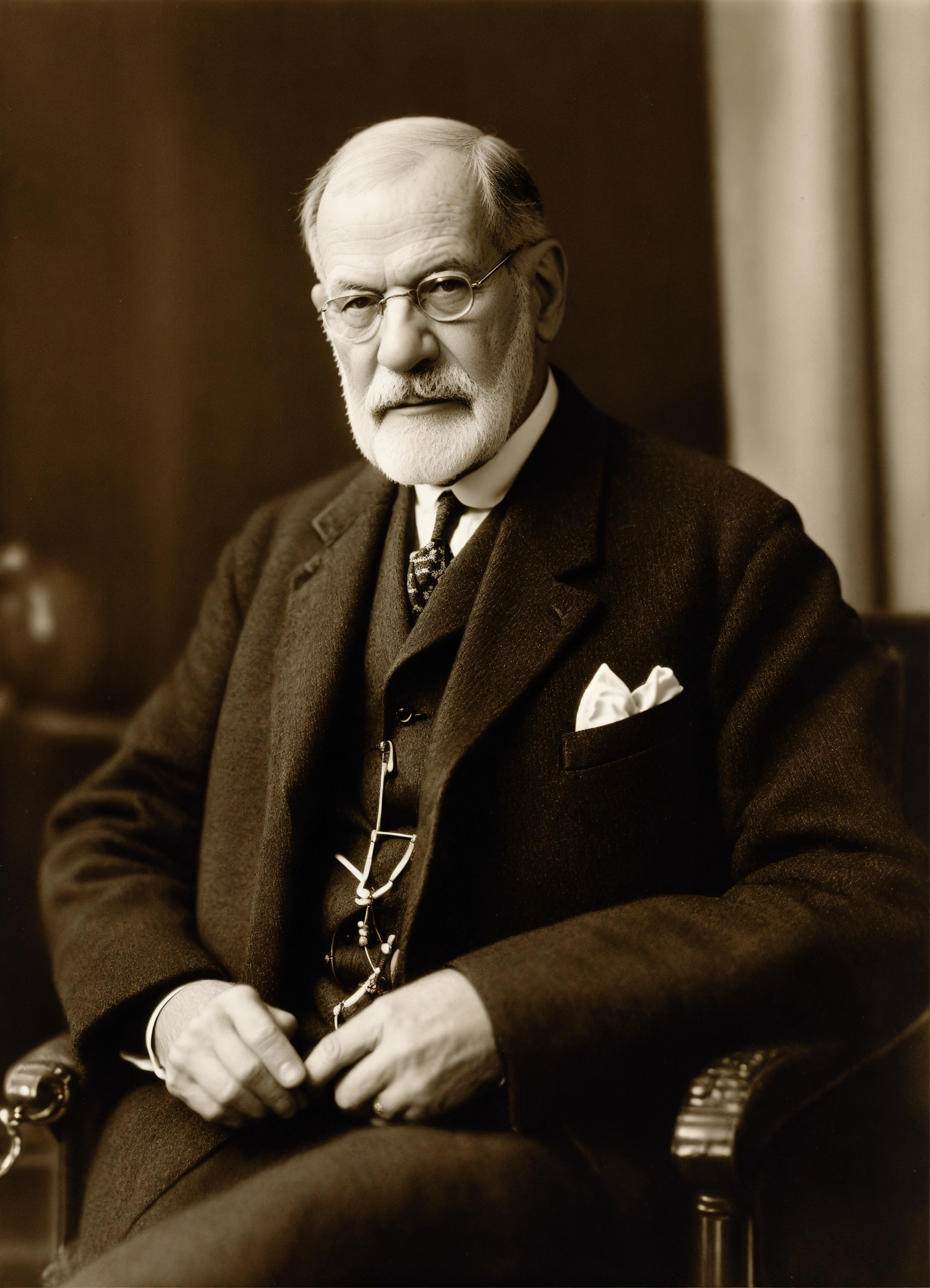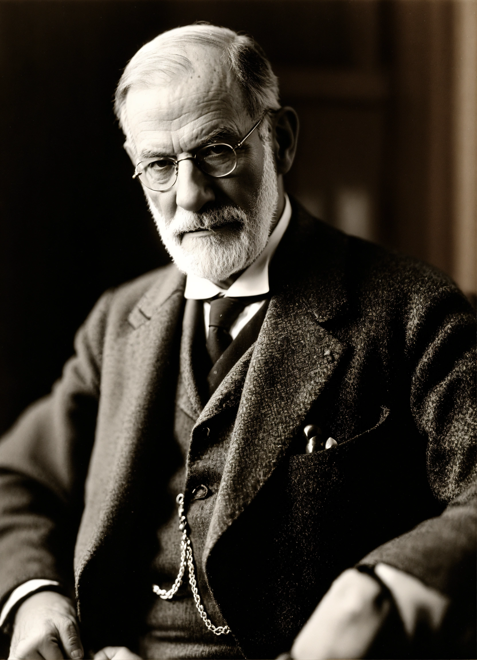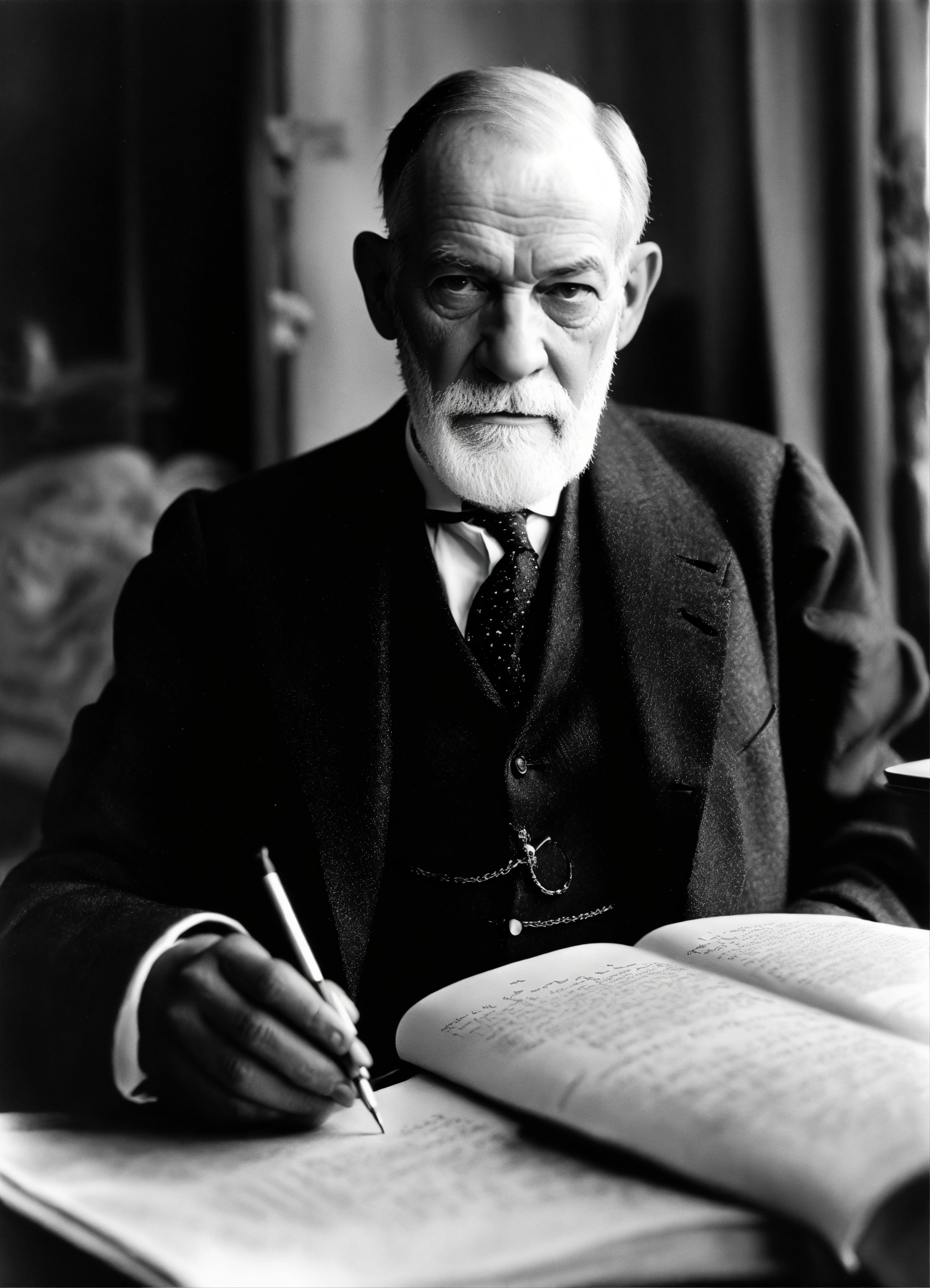 Genera una fotografía en blanco y negro de sigmund freud, vistiendo un mandil de francmasón, de maestro francmasón, del rito francés