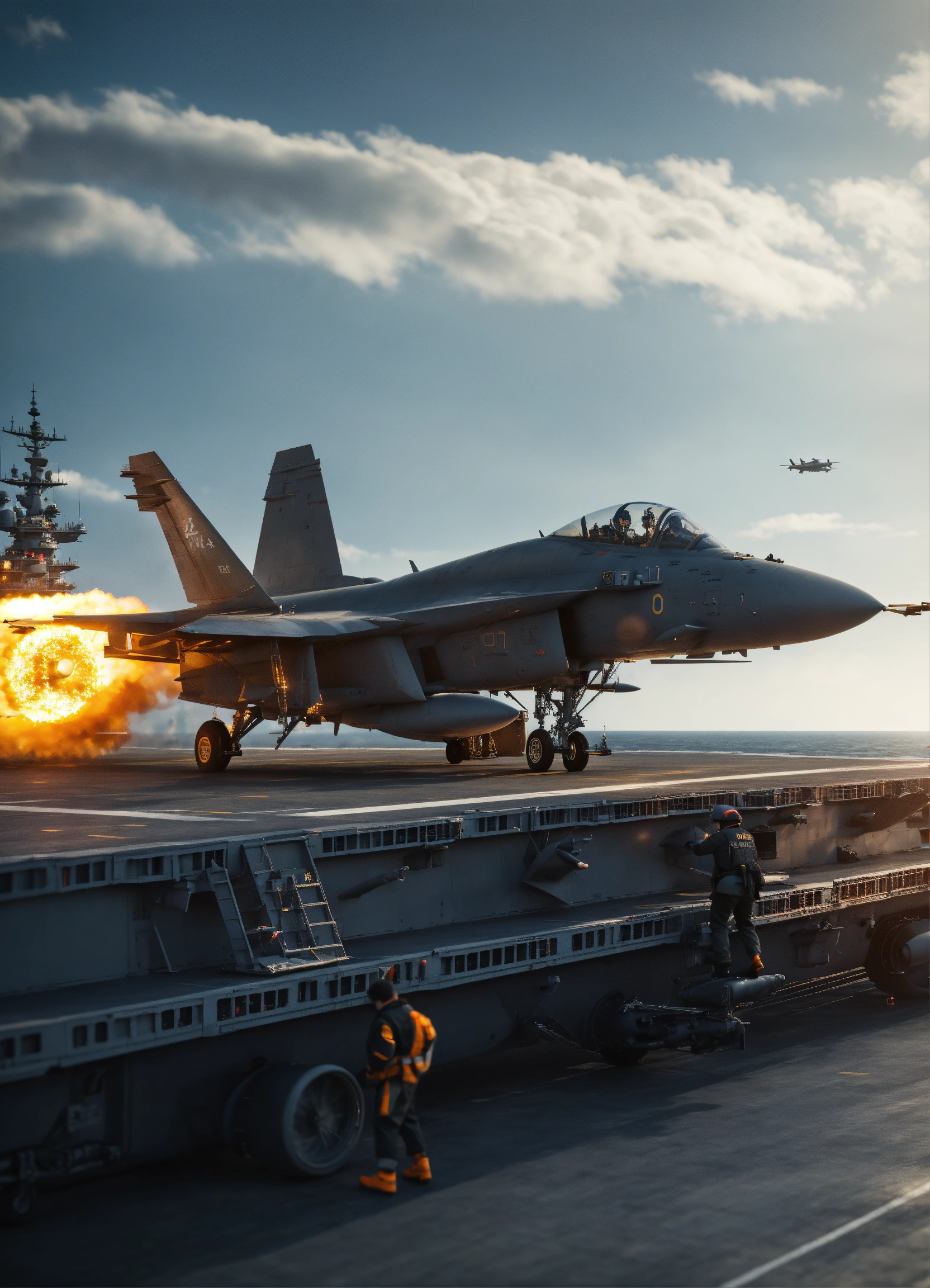 Aircraft carrier with a military fighter aircraft taking off from the deck. octane render, trending on artstation, highly detailed, lighting, professional, realistic, sharp focus, 4k, 8k, high resolution, candid, personal, –testp, bright lighting, ultra-detailed, bright lighting, photo, high quality photo, cinematic shot, volumetric light, imax