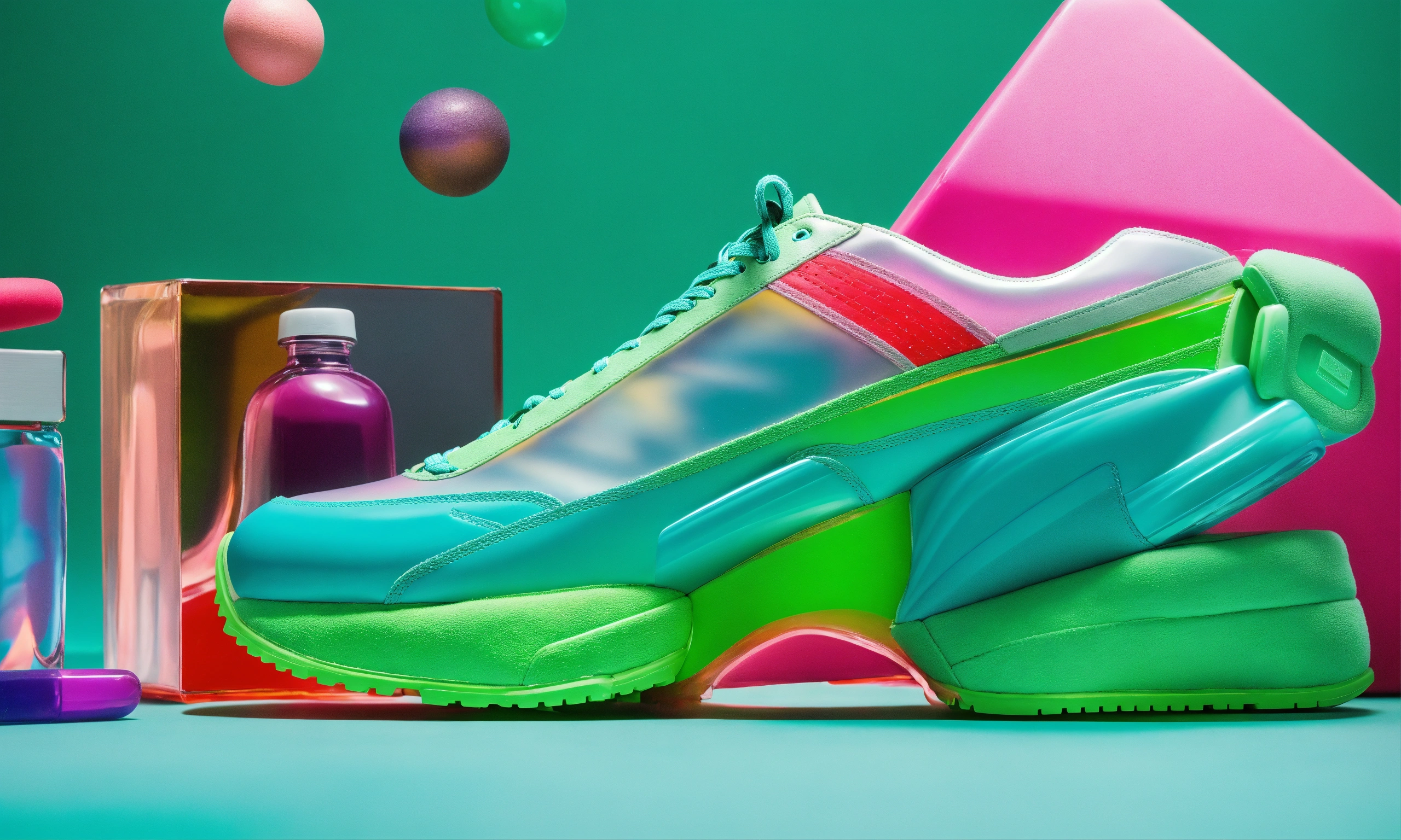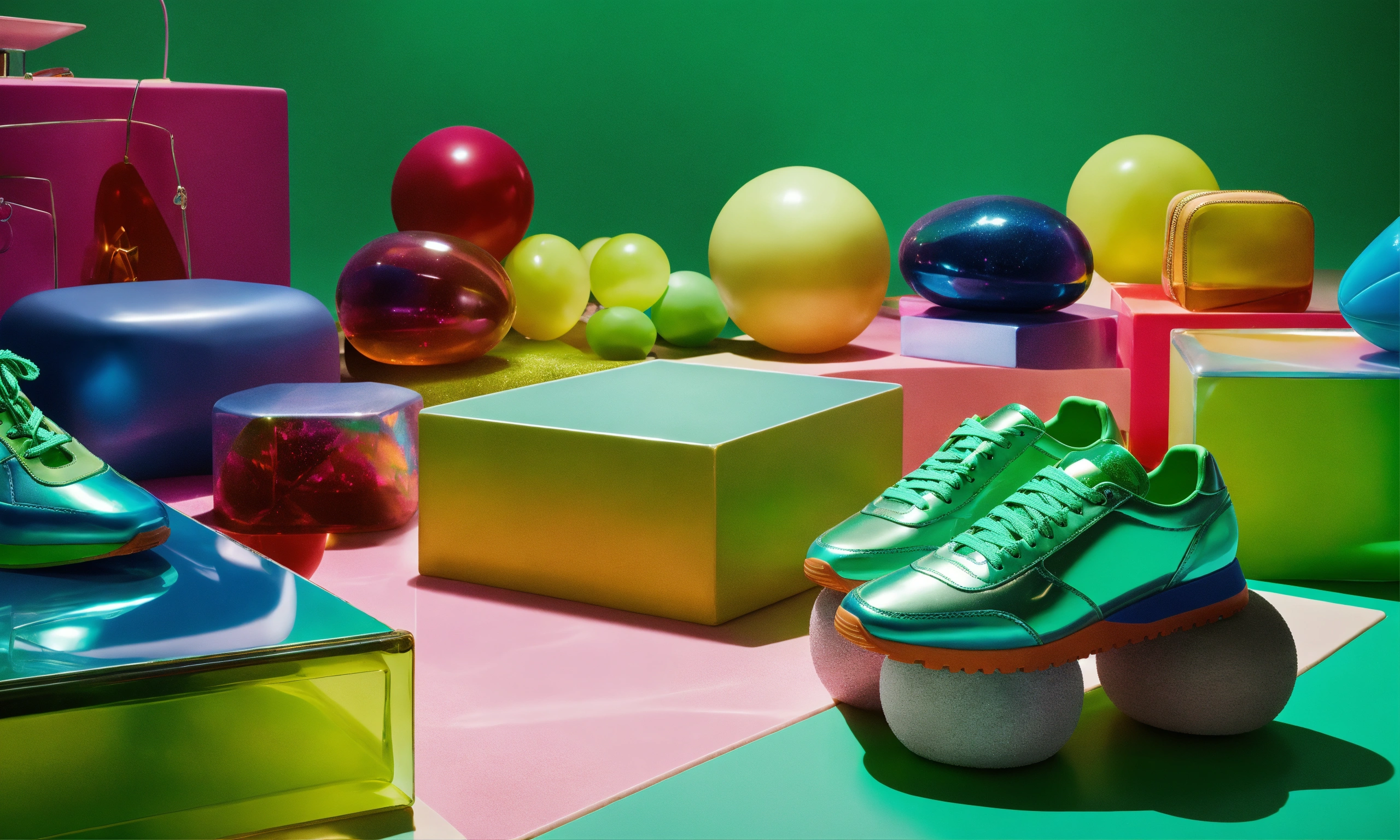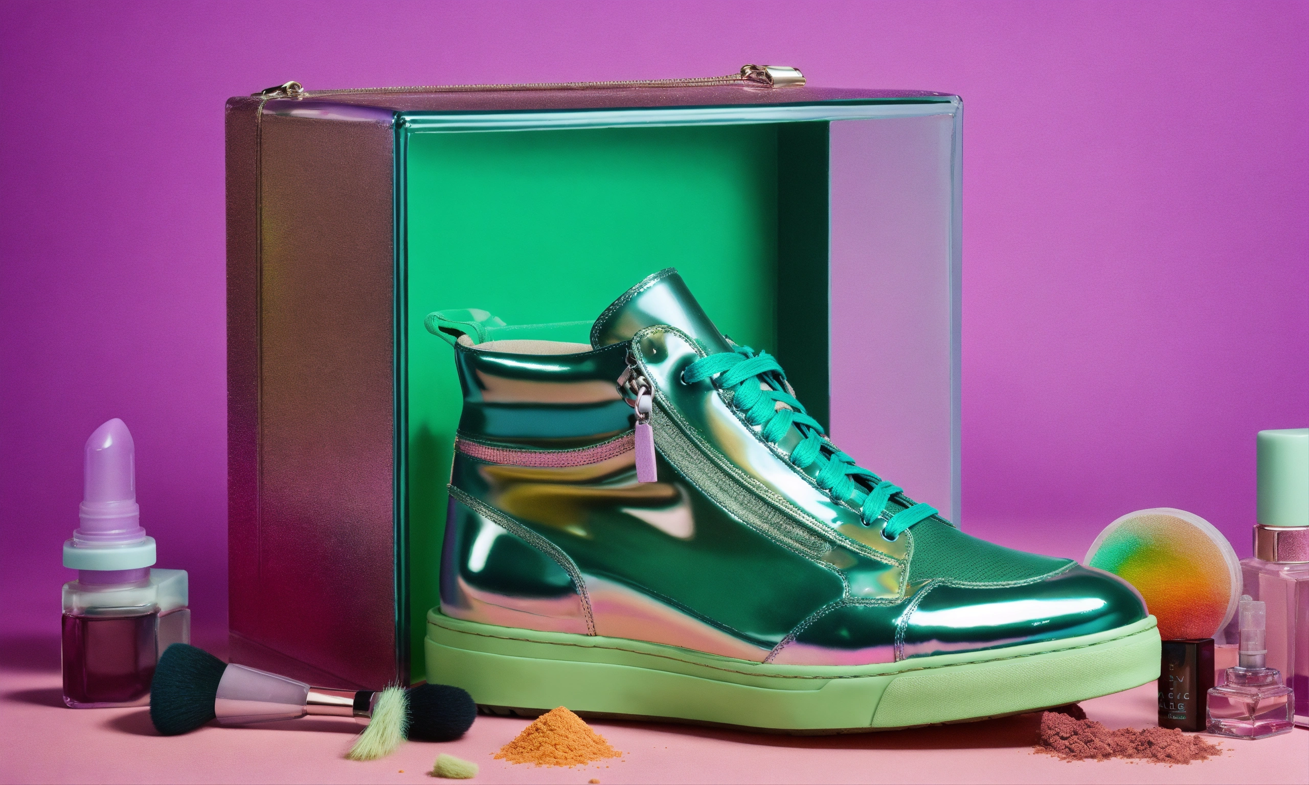 Clear iridescent cube full of colorful recognizable objects such as balenciaga sneakers, makeup. studio photography, e-comm, some green accent color, 4k, solid color background! table top photography! realistic!