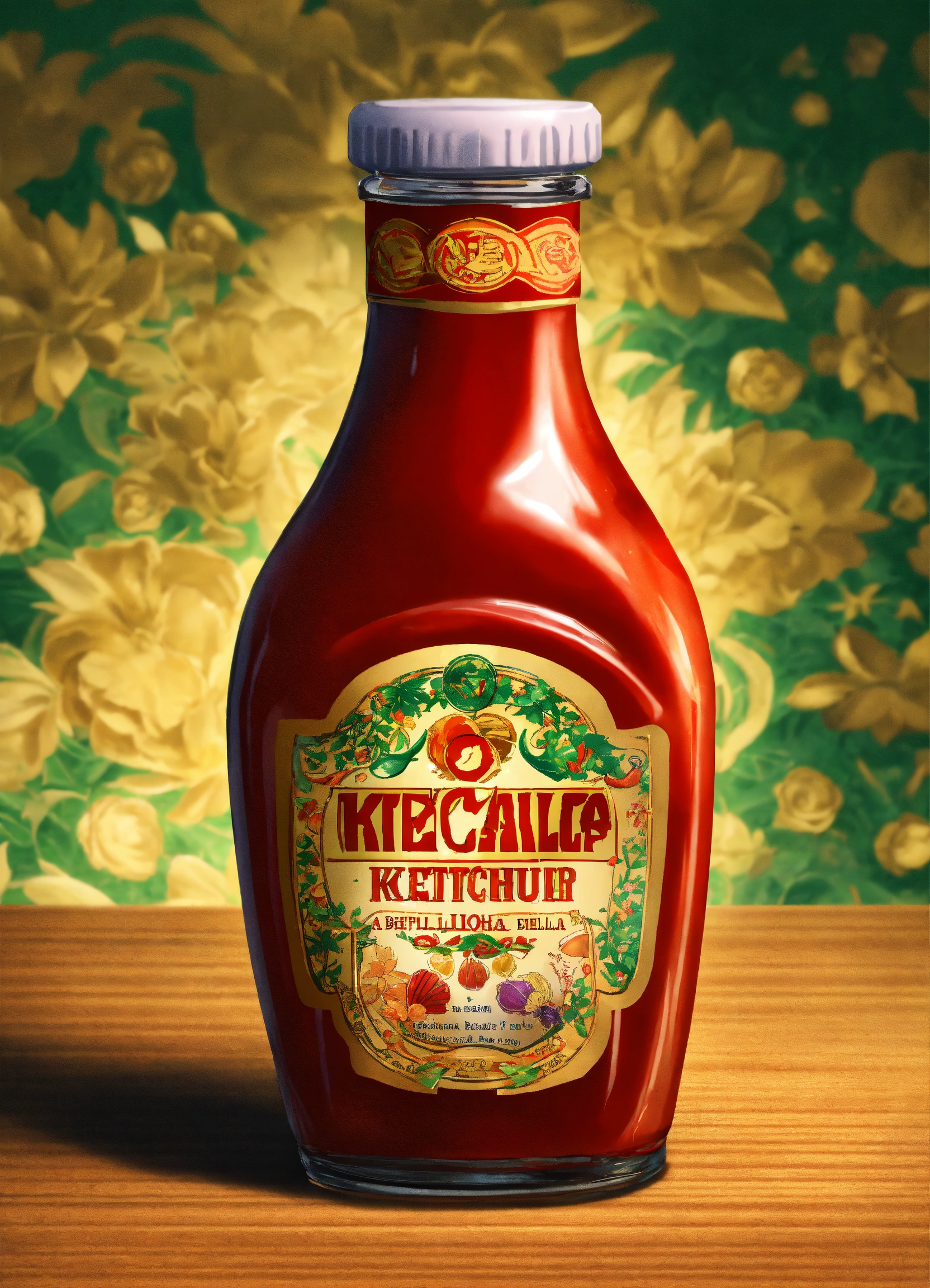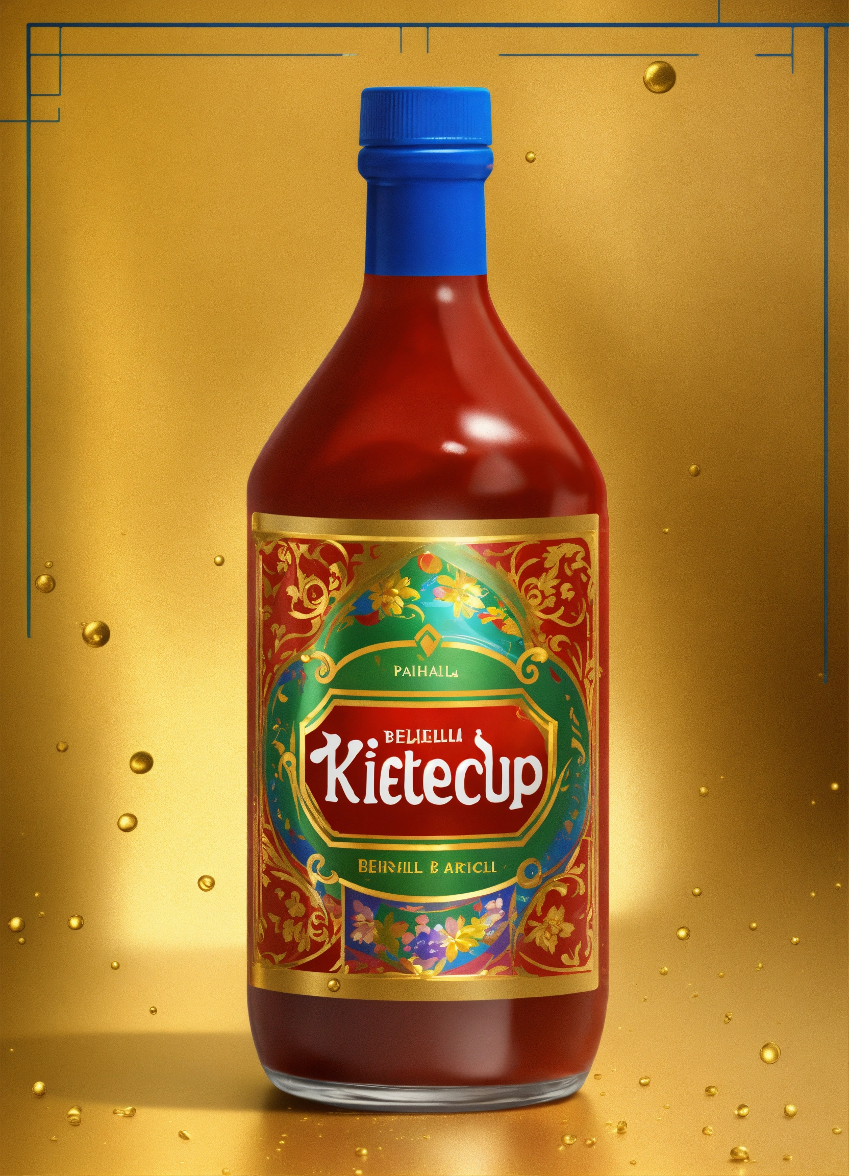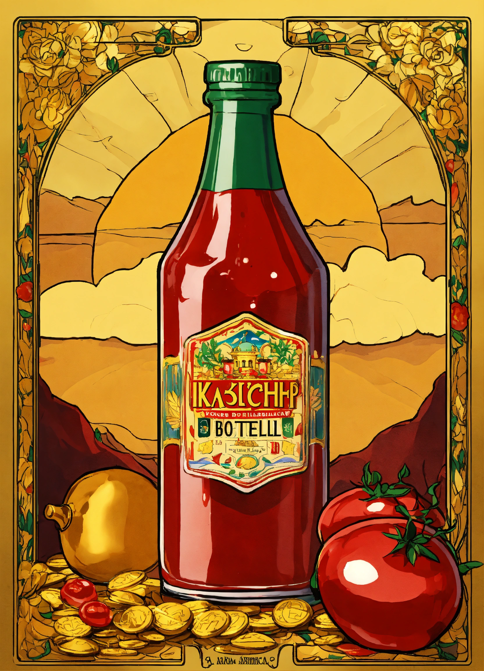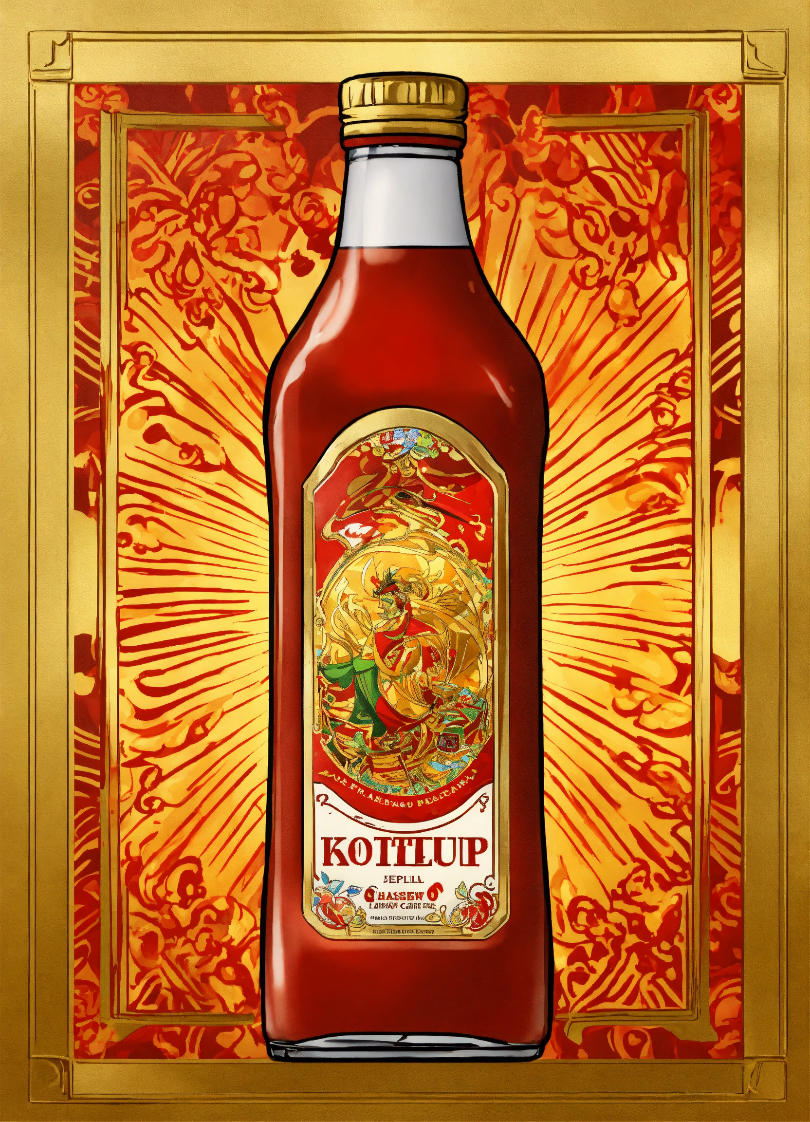 A glass bottle of ketchup, based on the card "la botella" of the mexican lottery deck in anime style. gold background card styled.