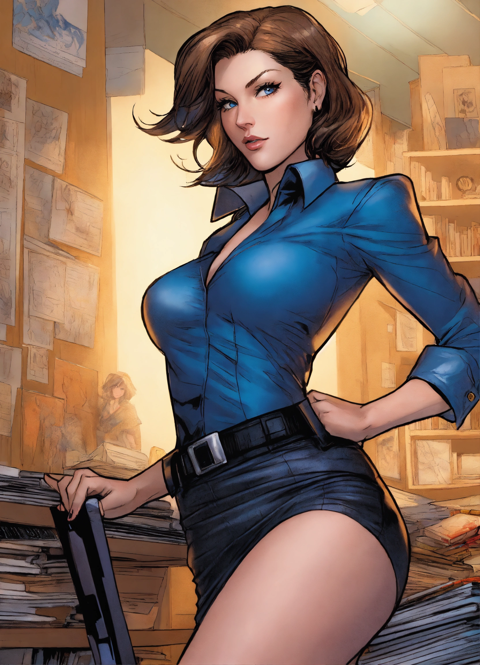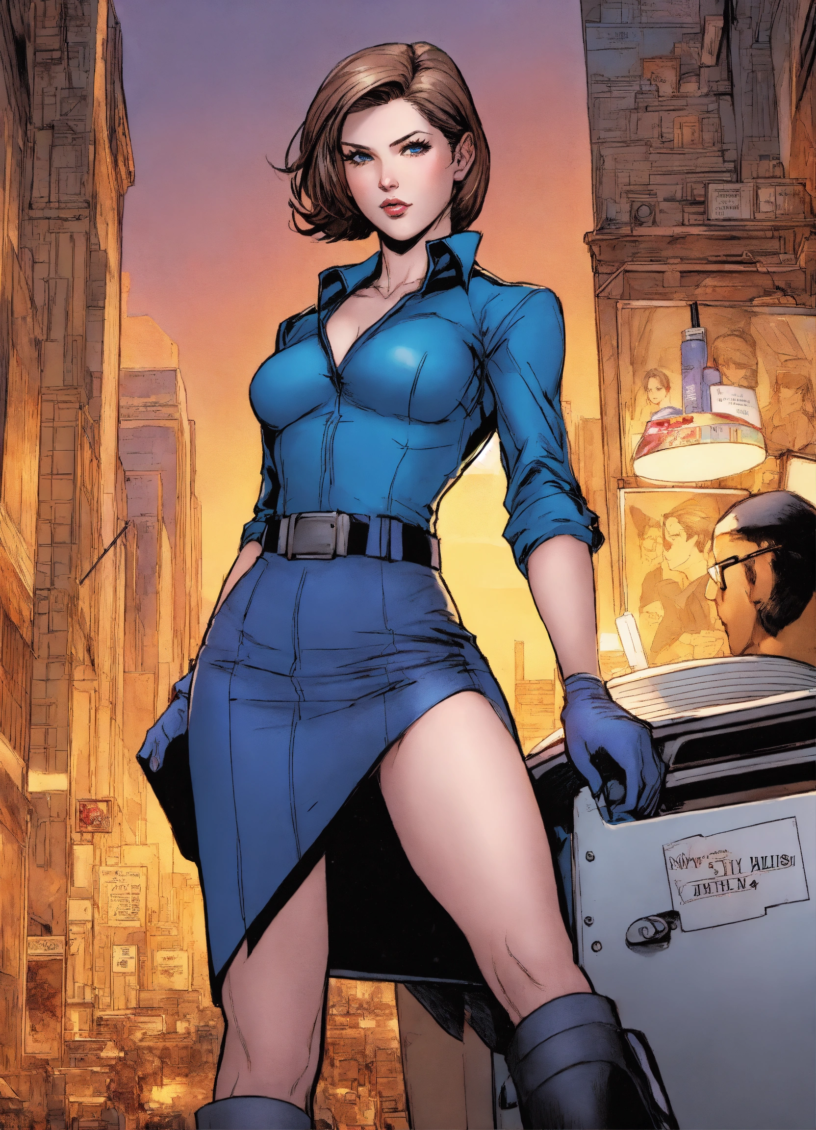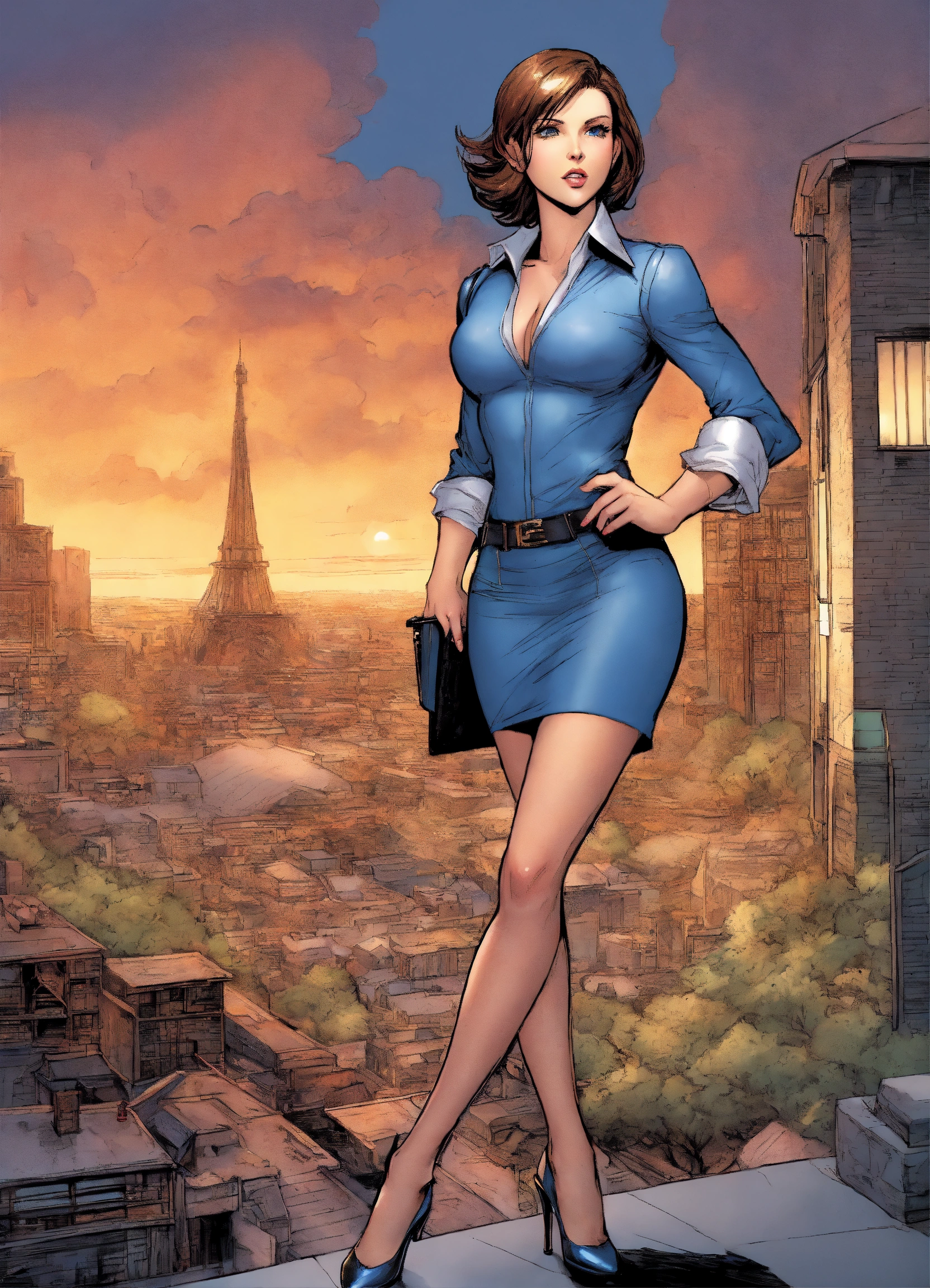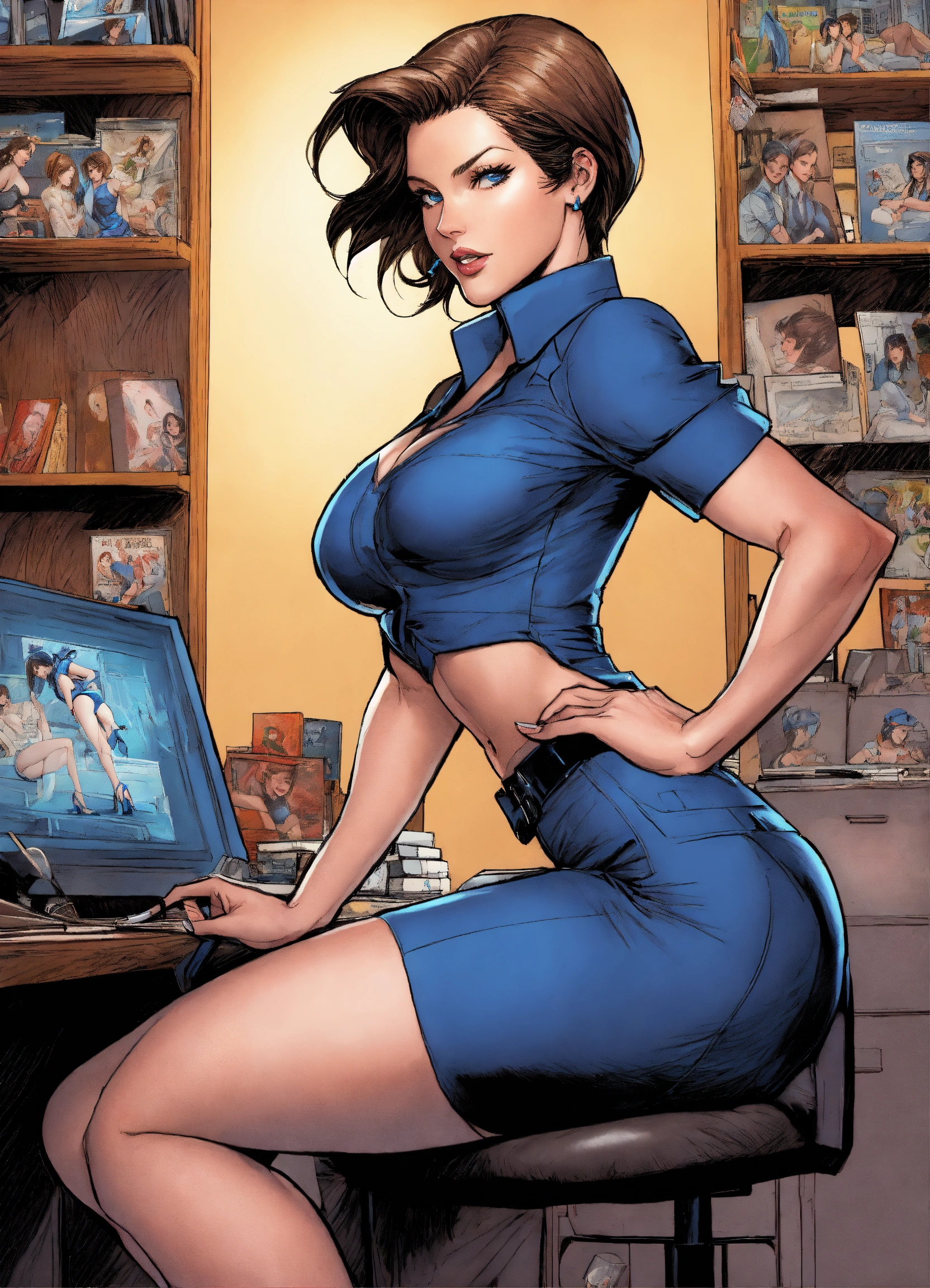 Older jill valentine as a secretary, wearing a pencil skirt and stiletto high heels, art by jim lee, art by j. scott campbell, short brunette bob hair, being carried by