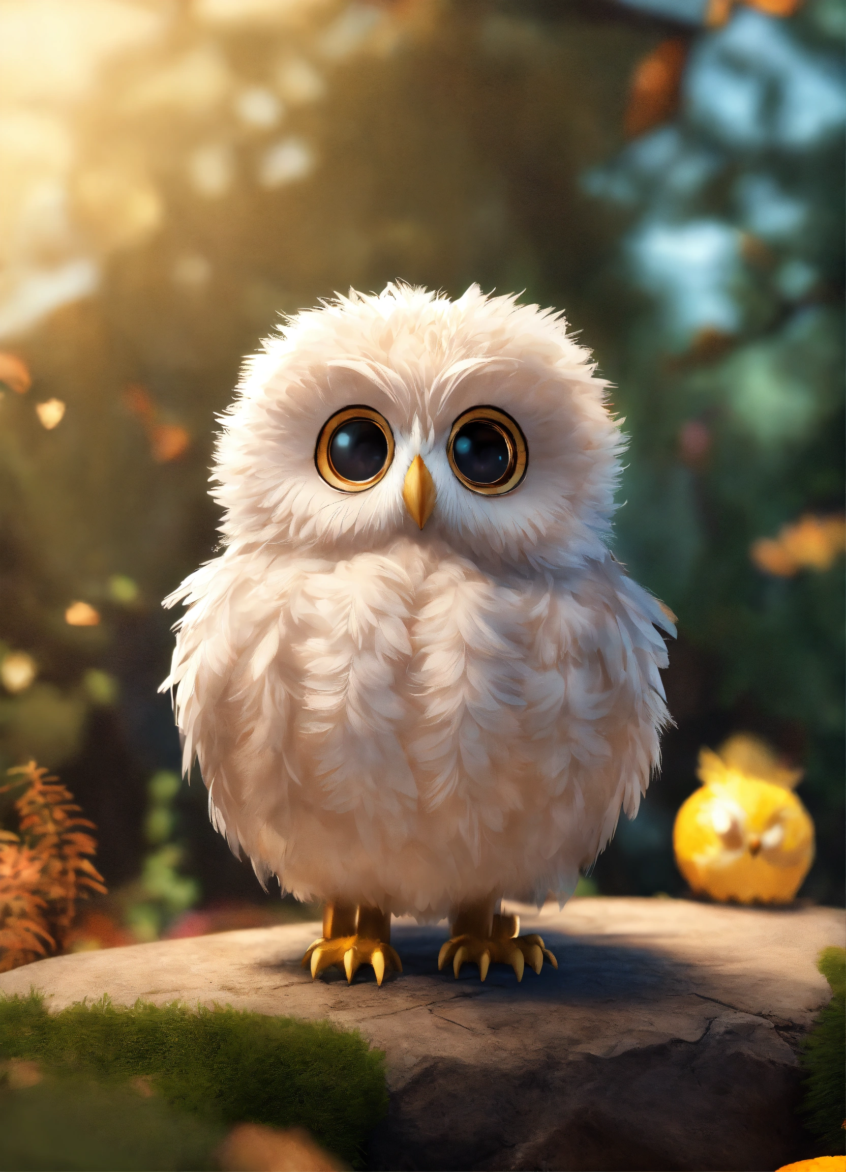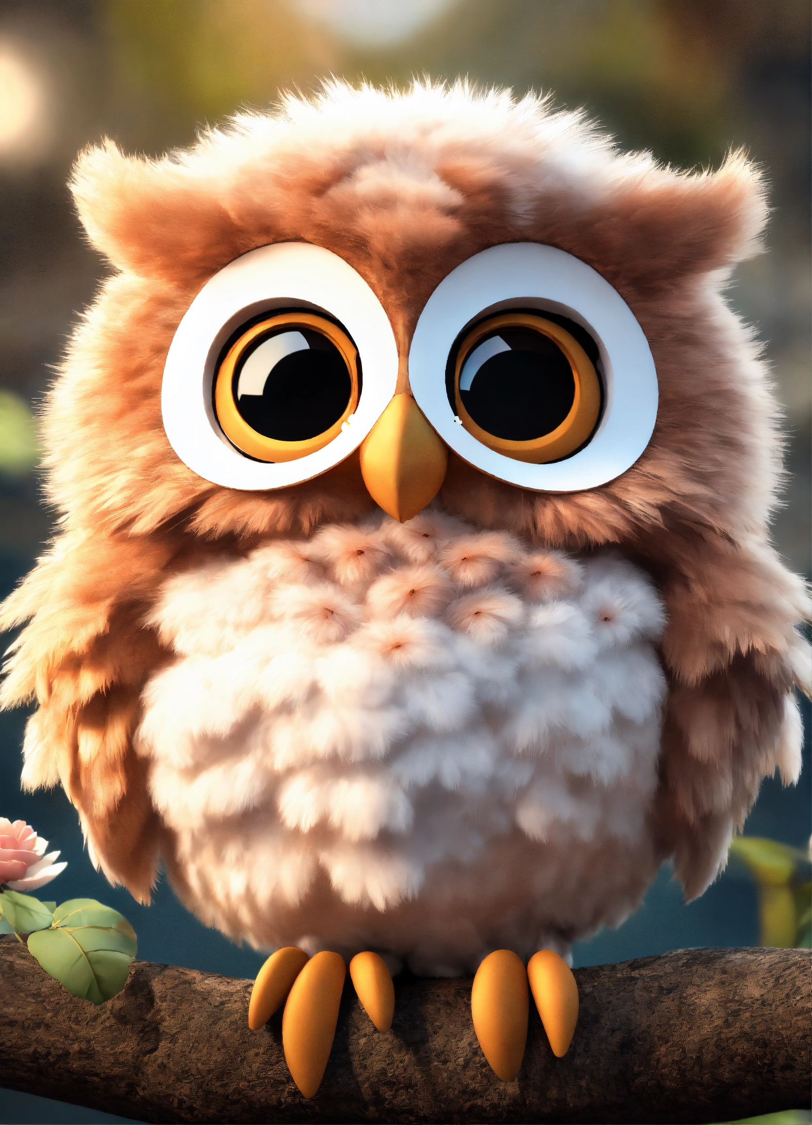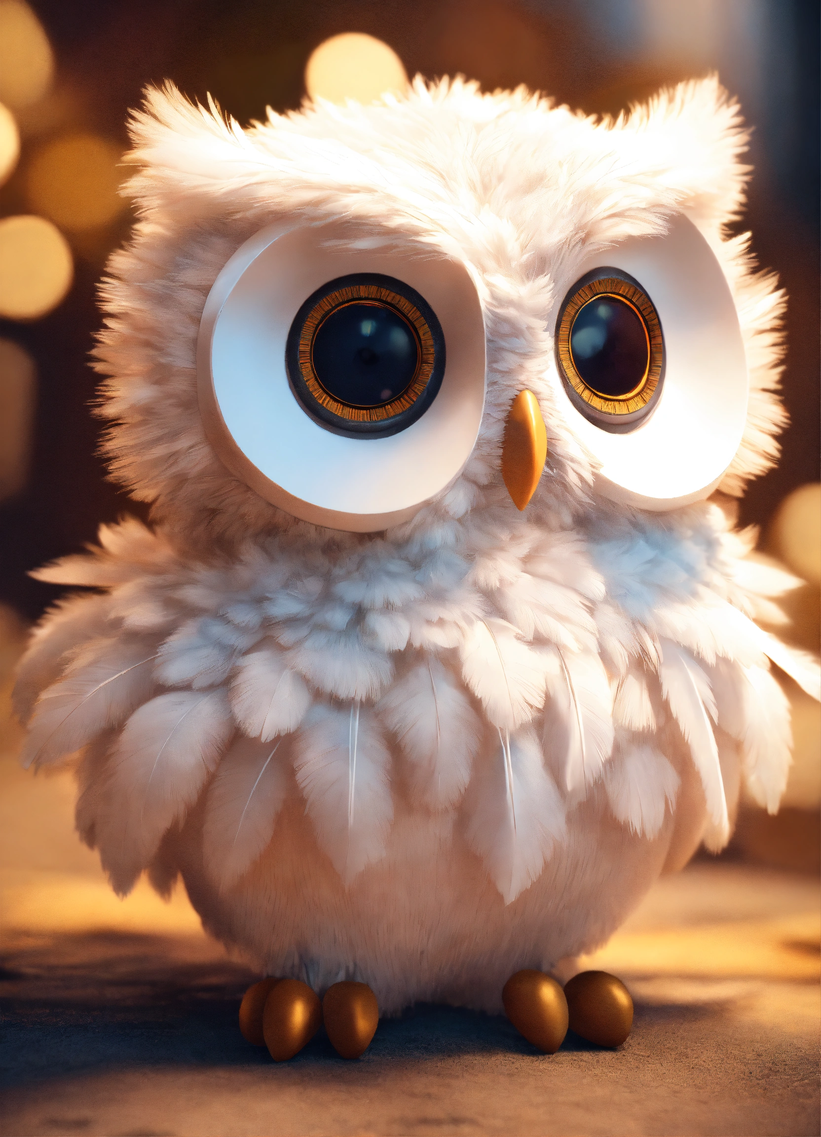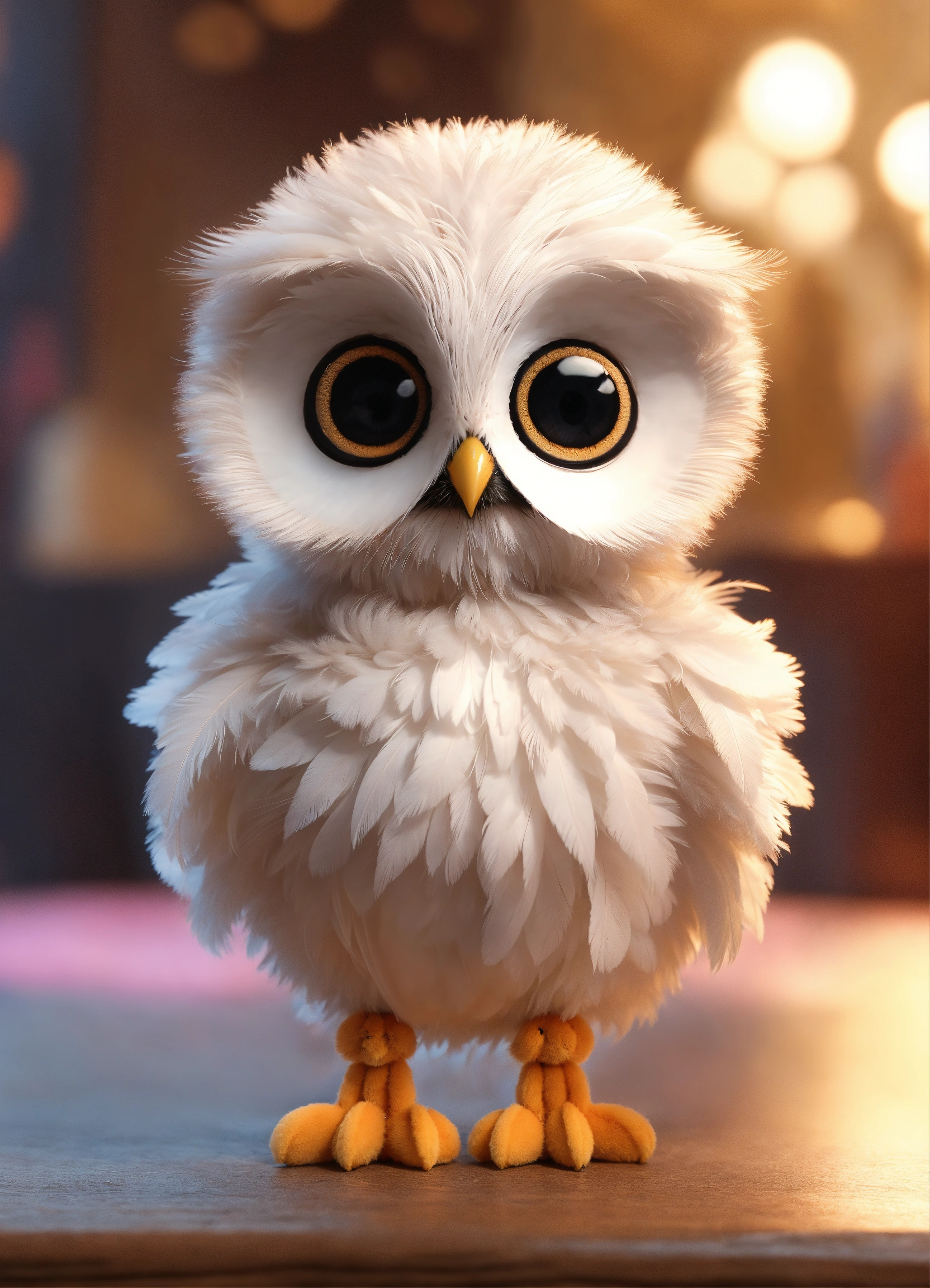 Create a cute and fluffy baby owl with big fluffy eyes and white feathers looking in front of the camera in 3d