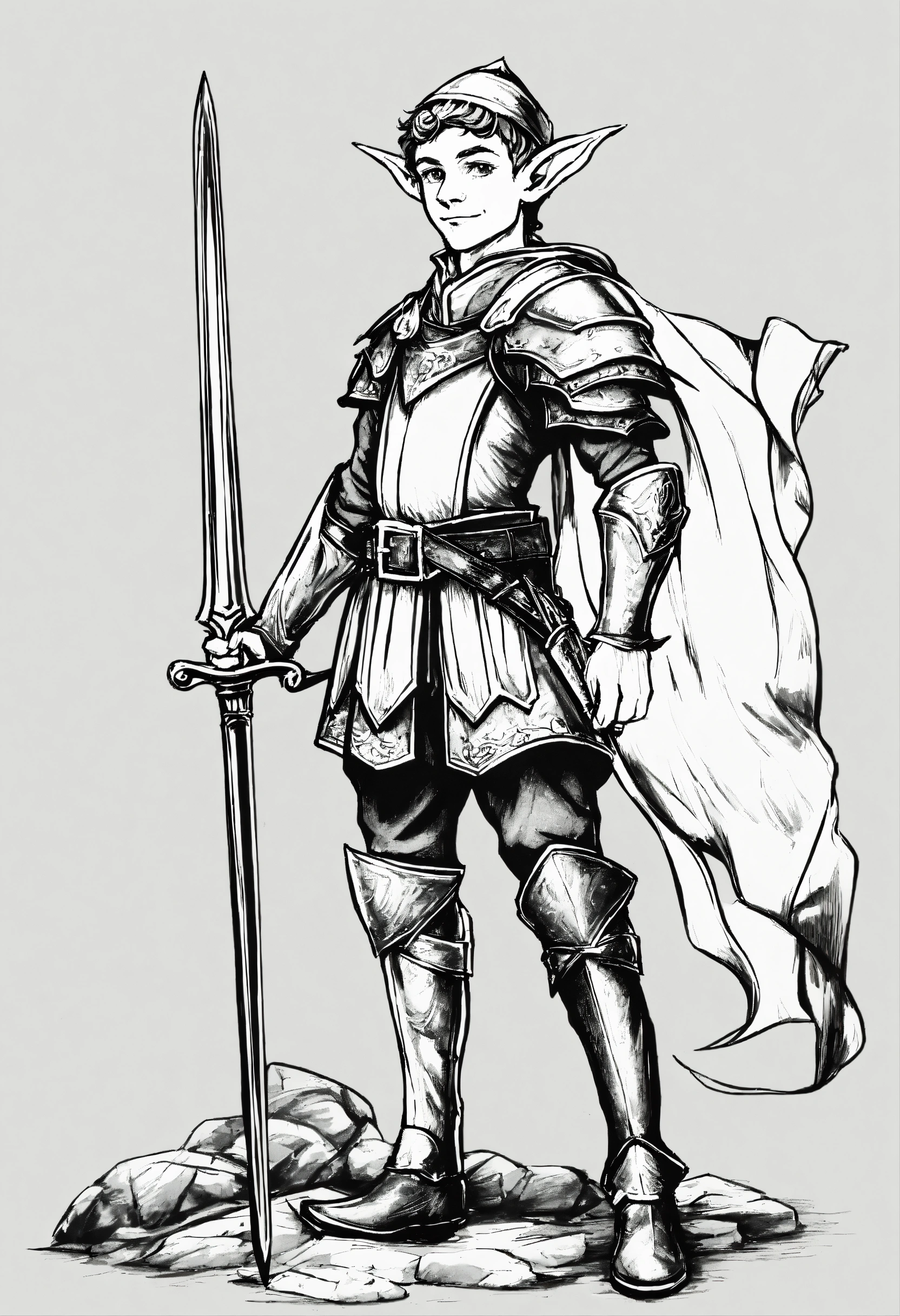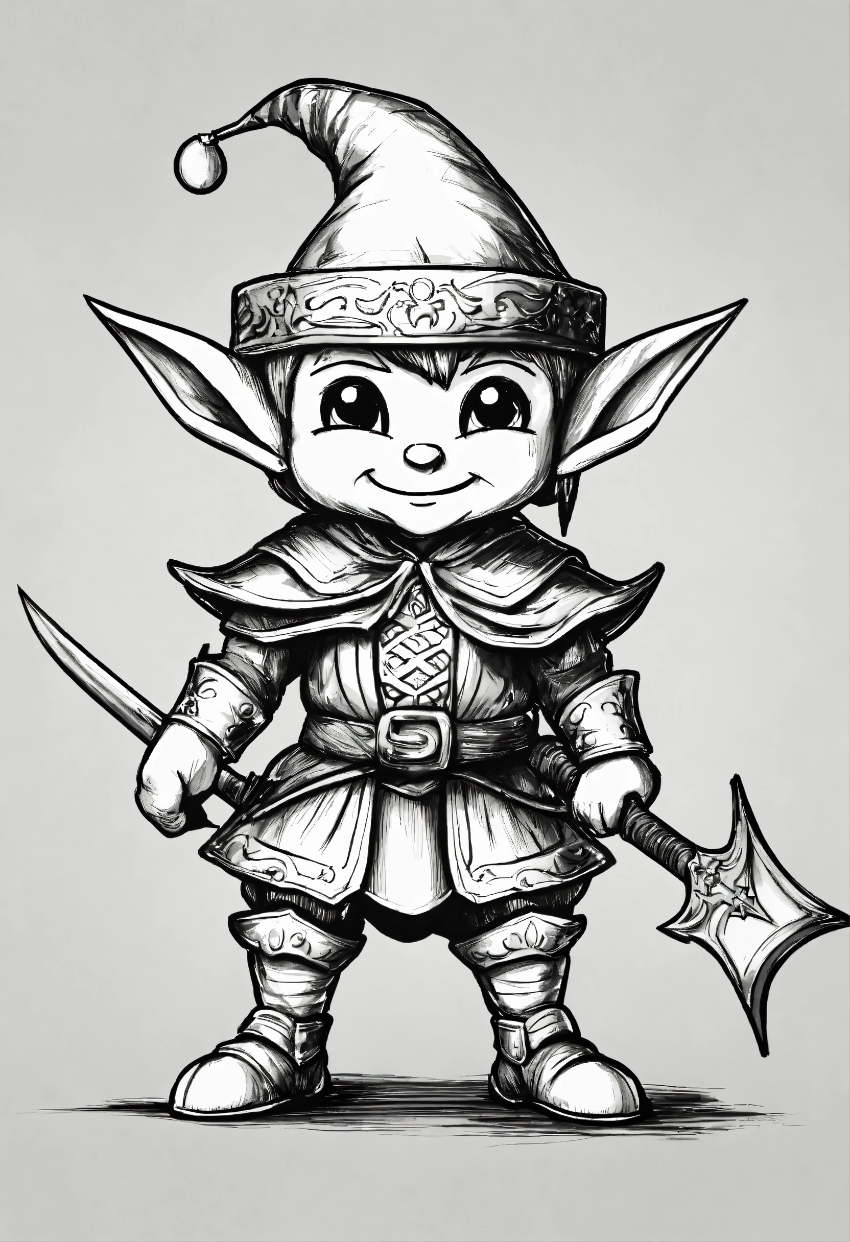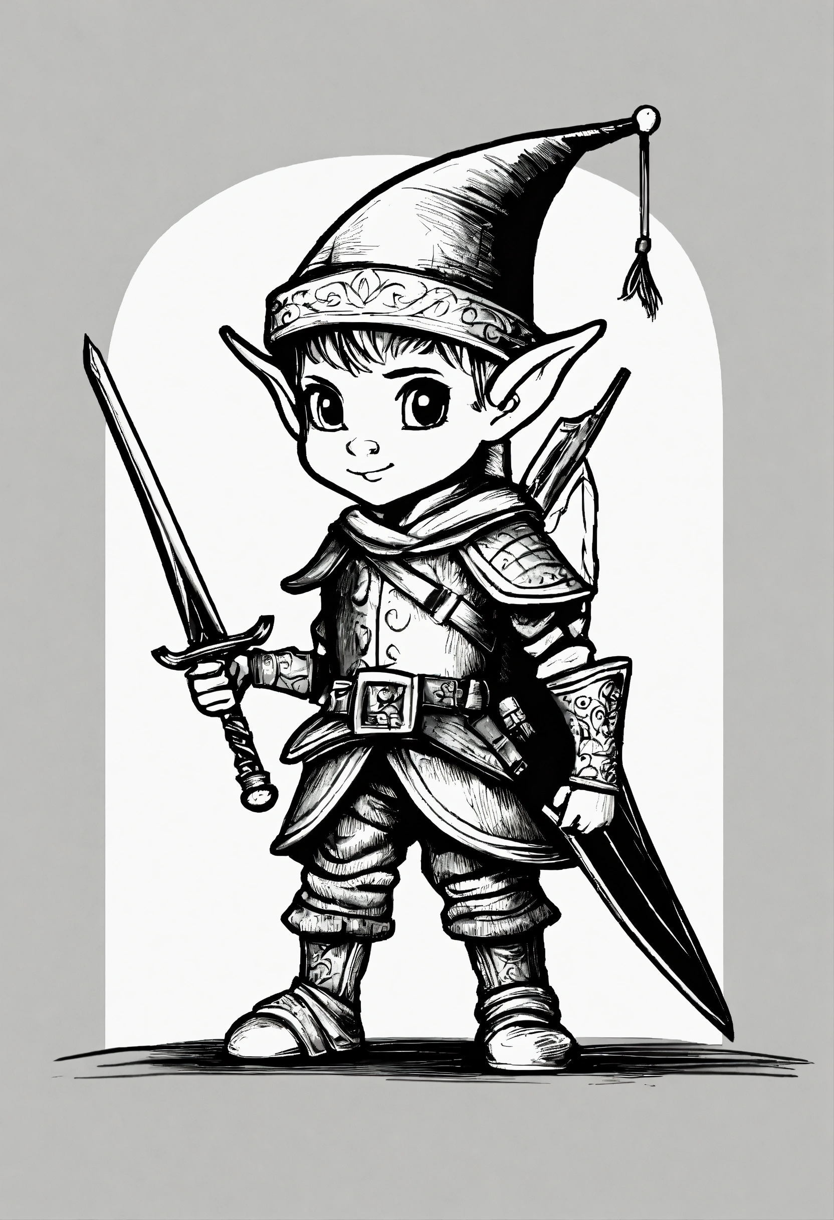 Draw a funny elf with a sword in hand and a flag in the other, the drawing is in black and white with a plain background