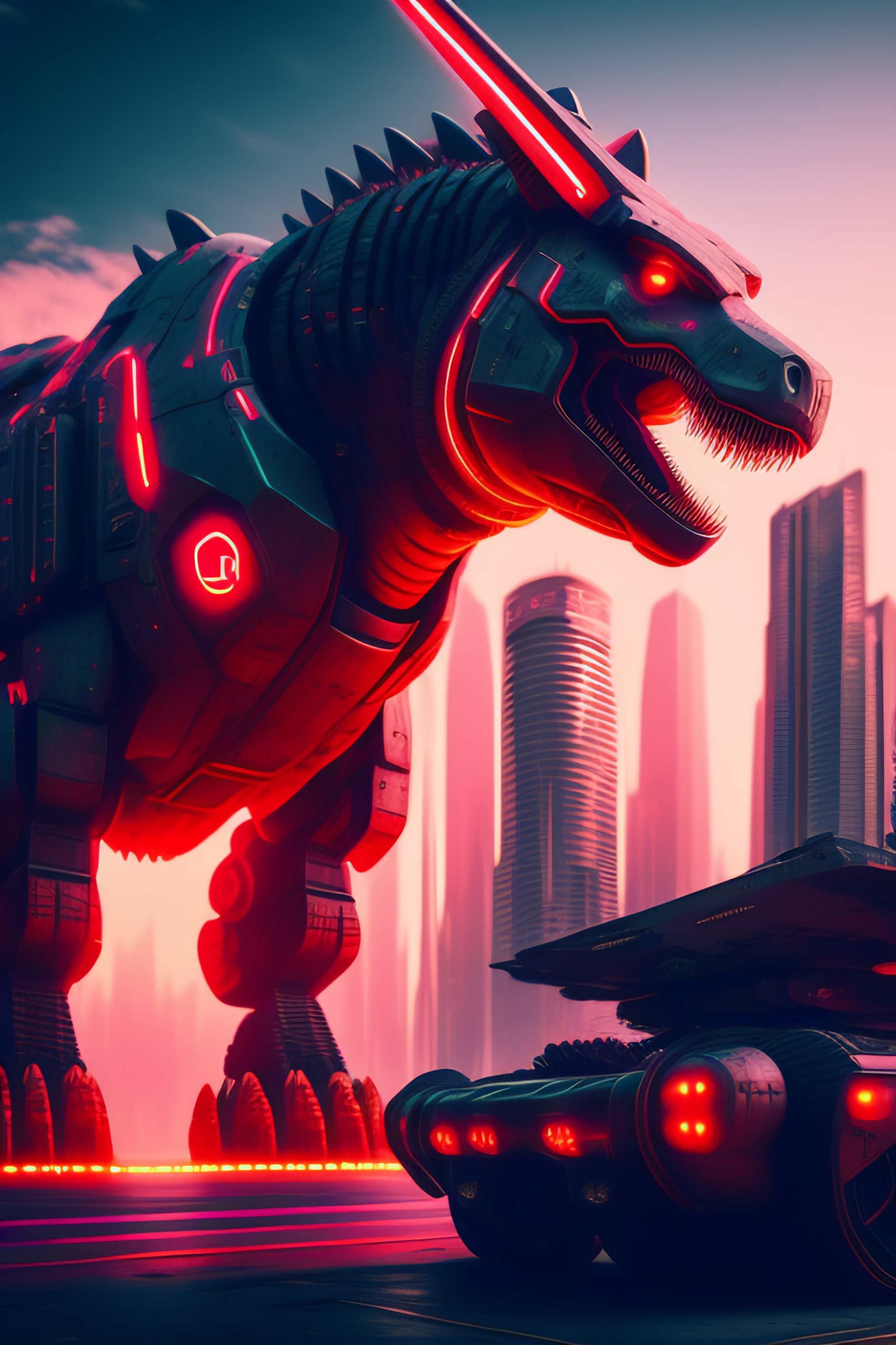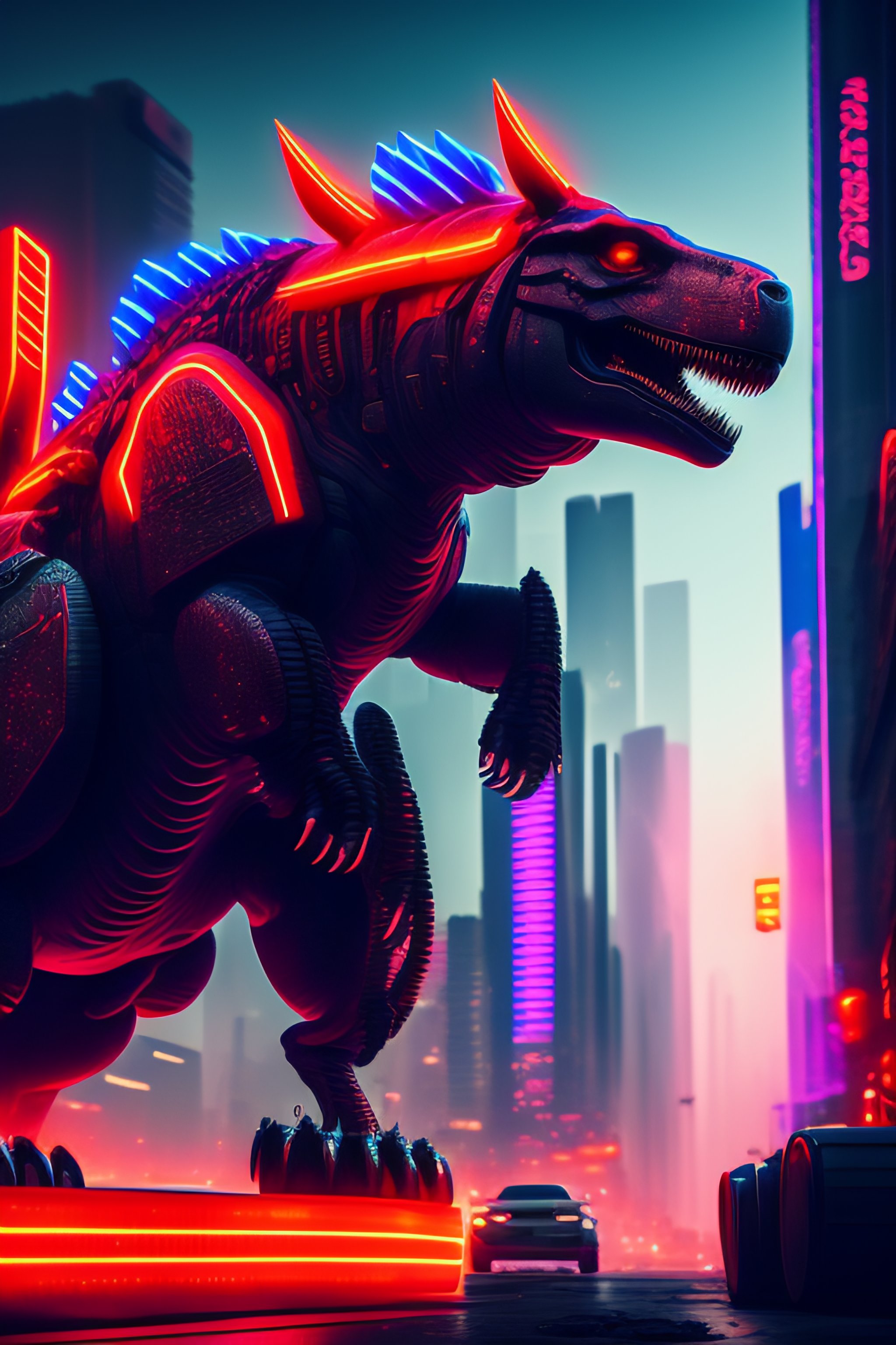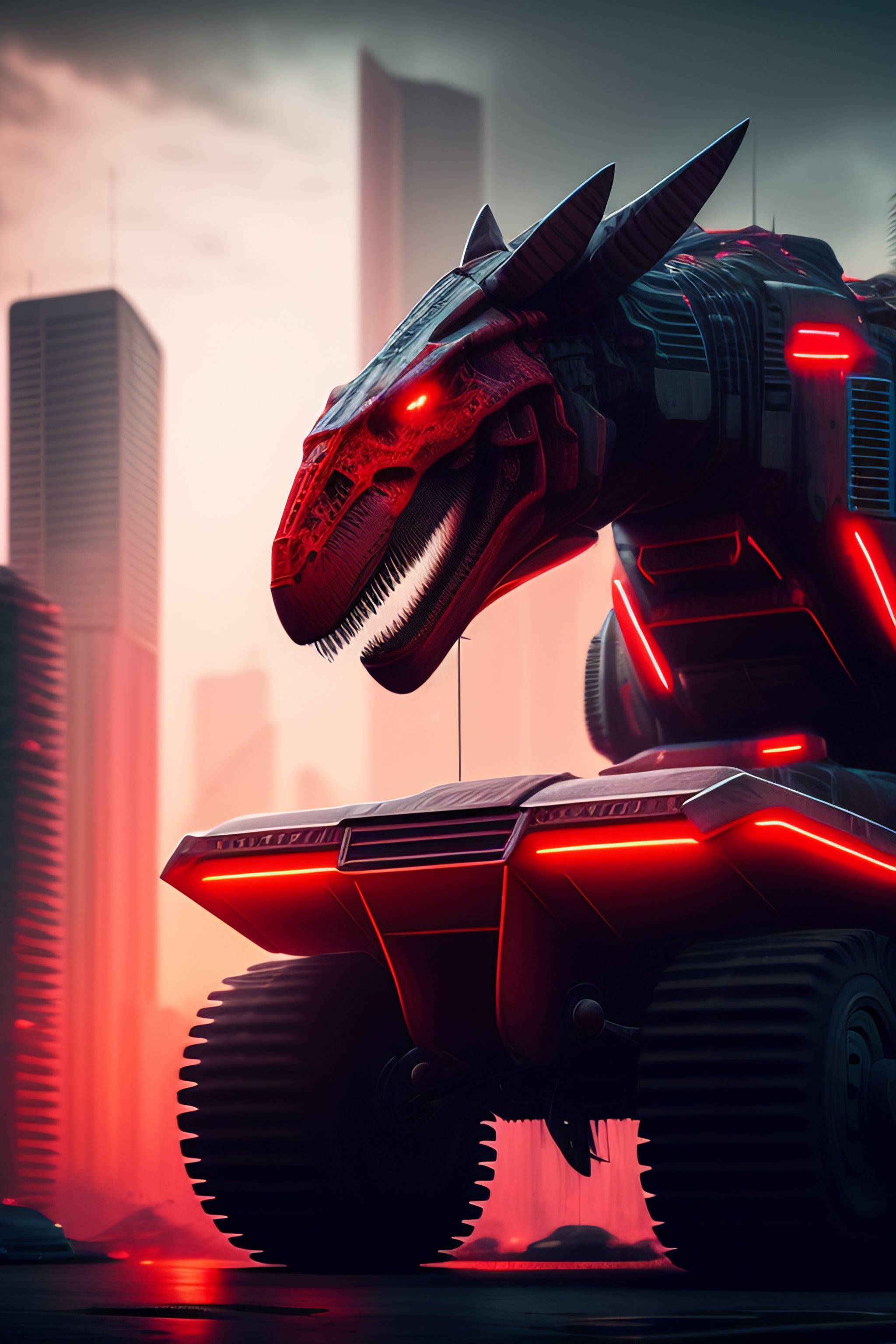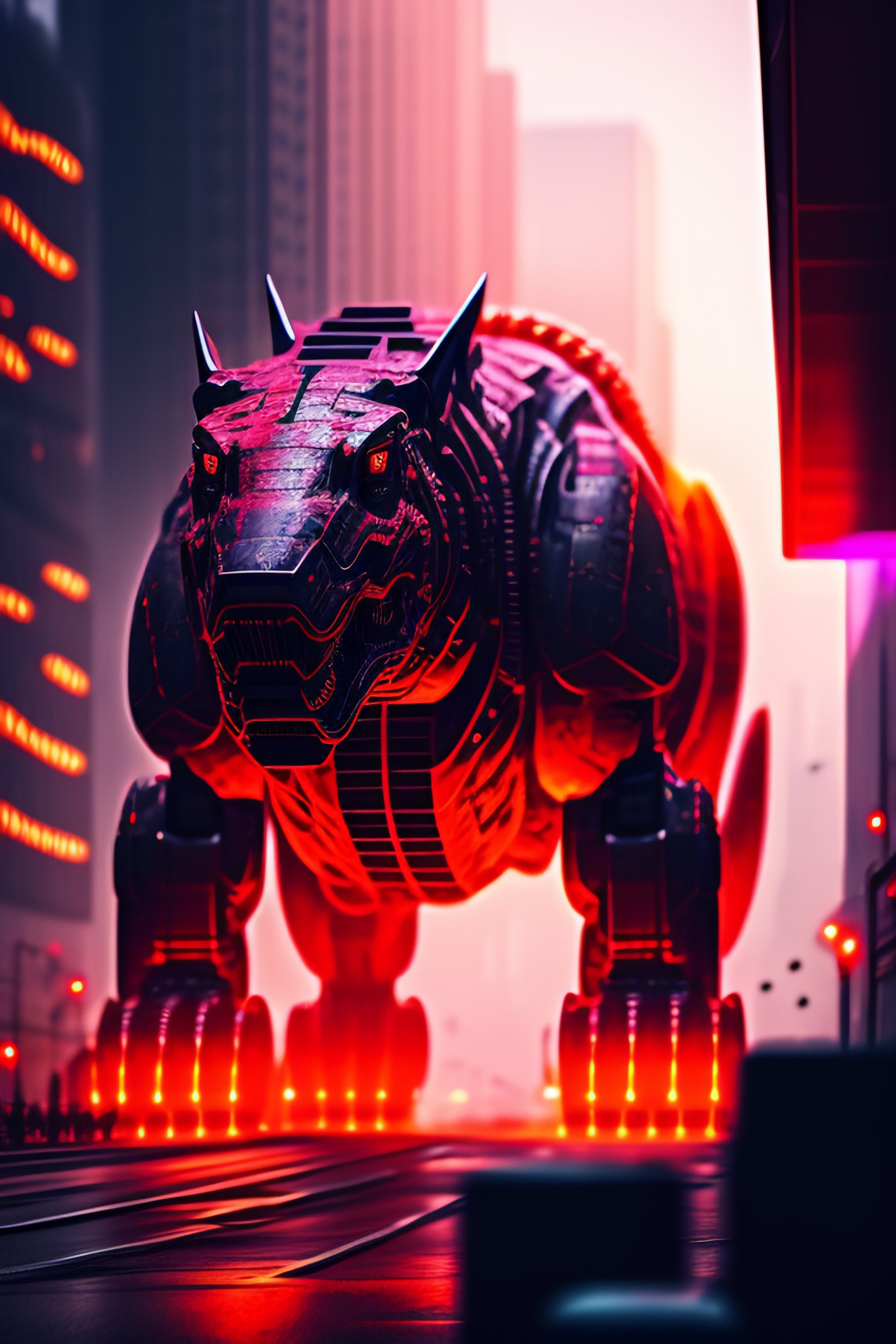 Cyberpunk, city destroyed, mecha t rex, with red neon detailing destroying the city, cinematic, hdr, 8k