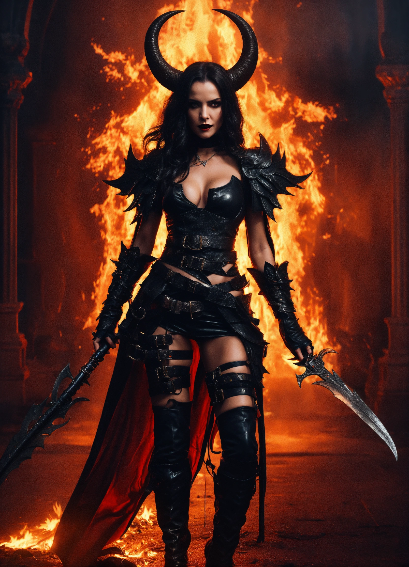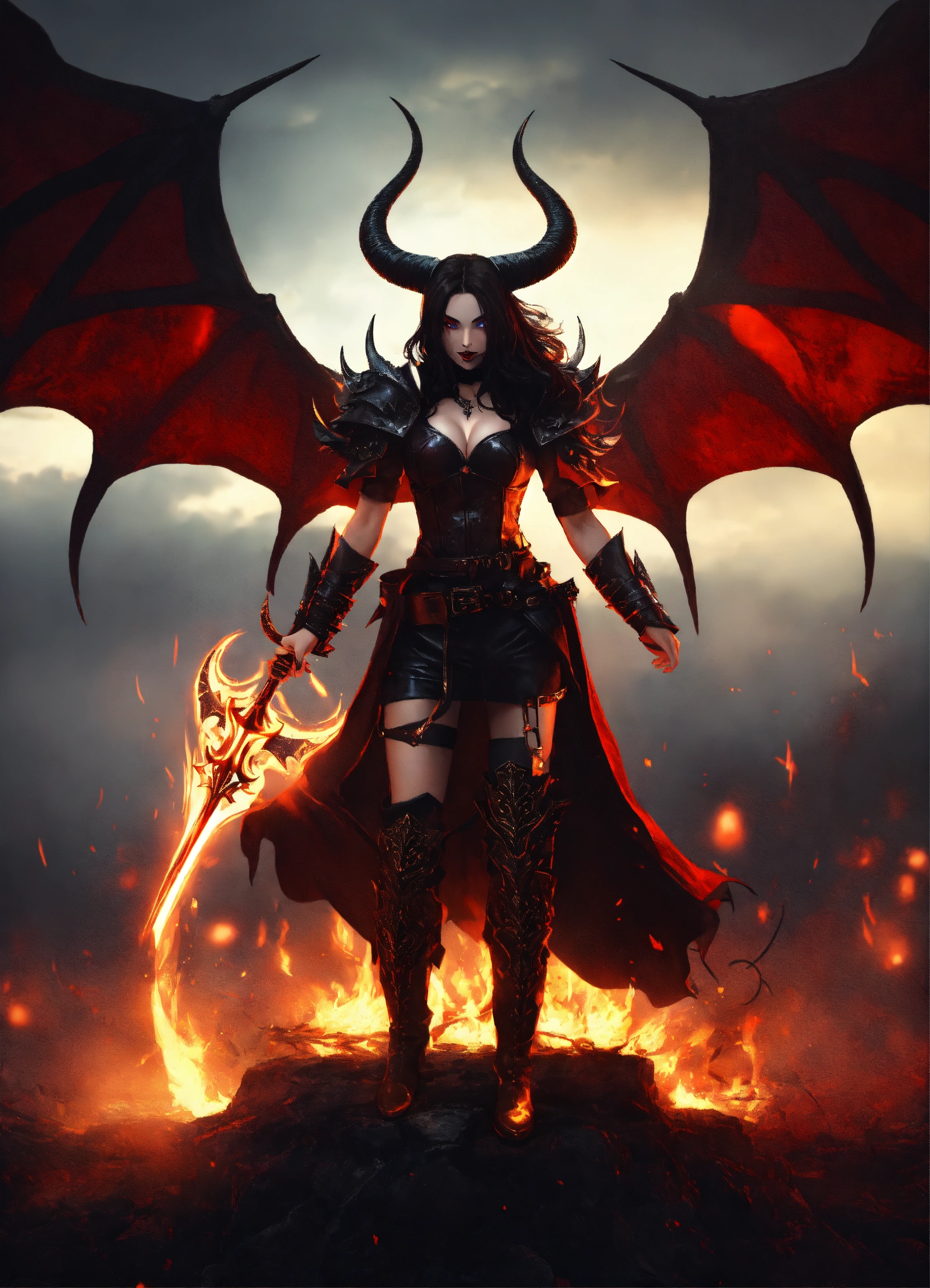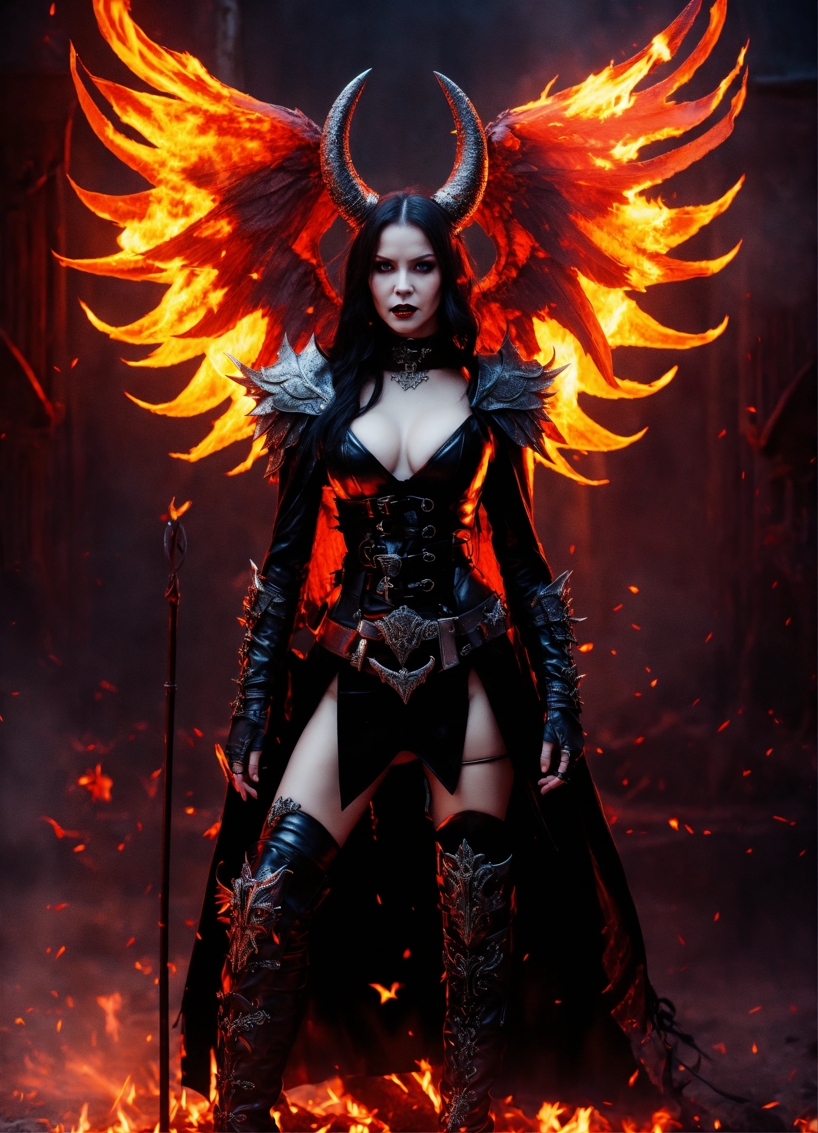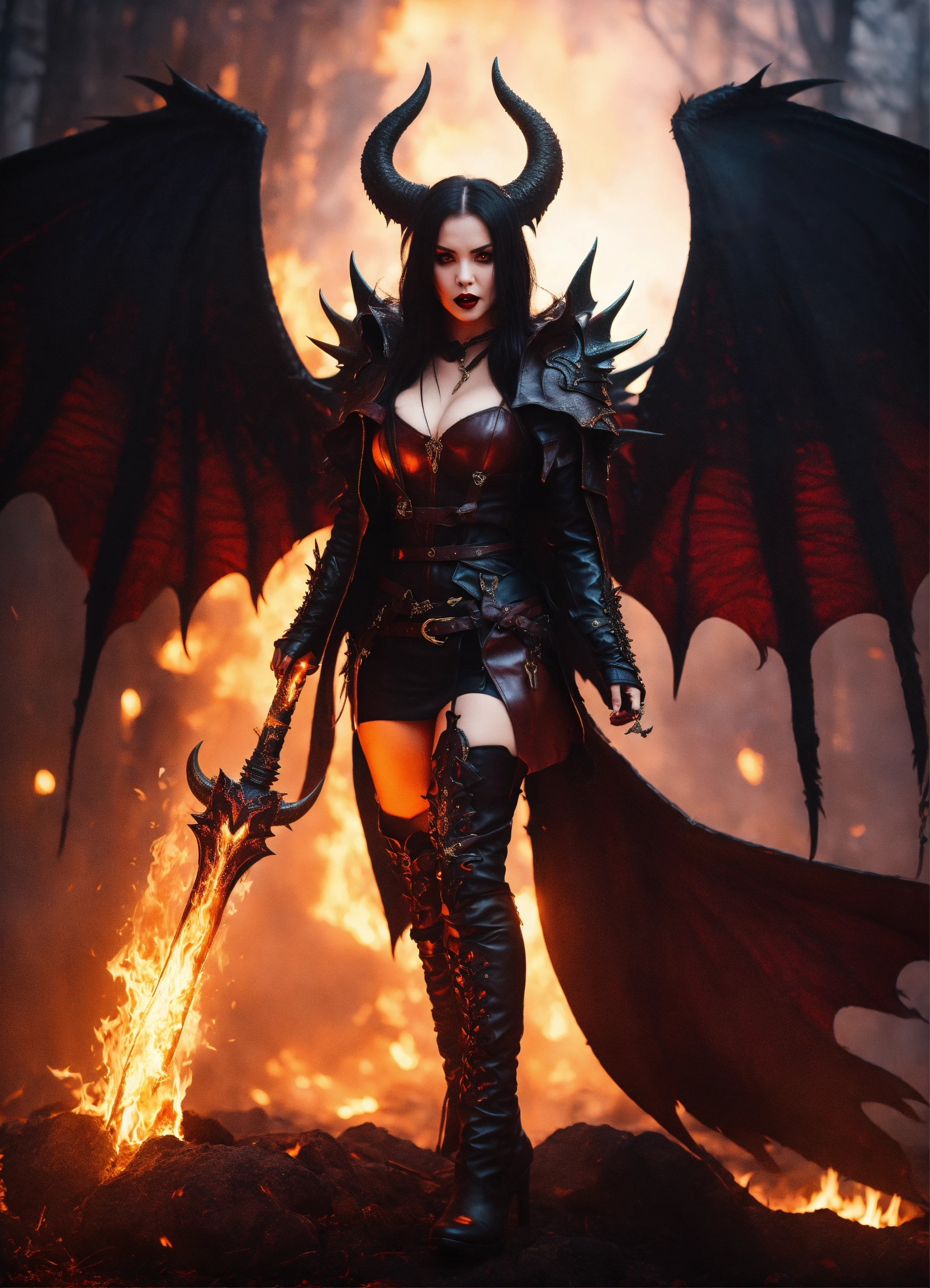 Evil vampire woman, dark hair, leather armor, demon wings, overknee boots, glowing eyes, full body, belt, horns, fire, dark fantasy style