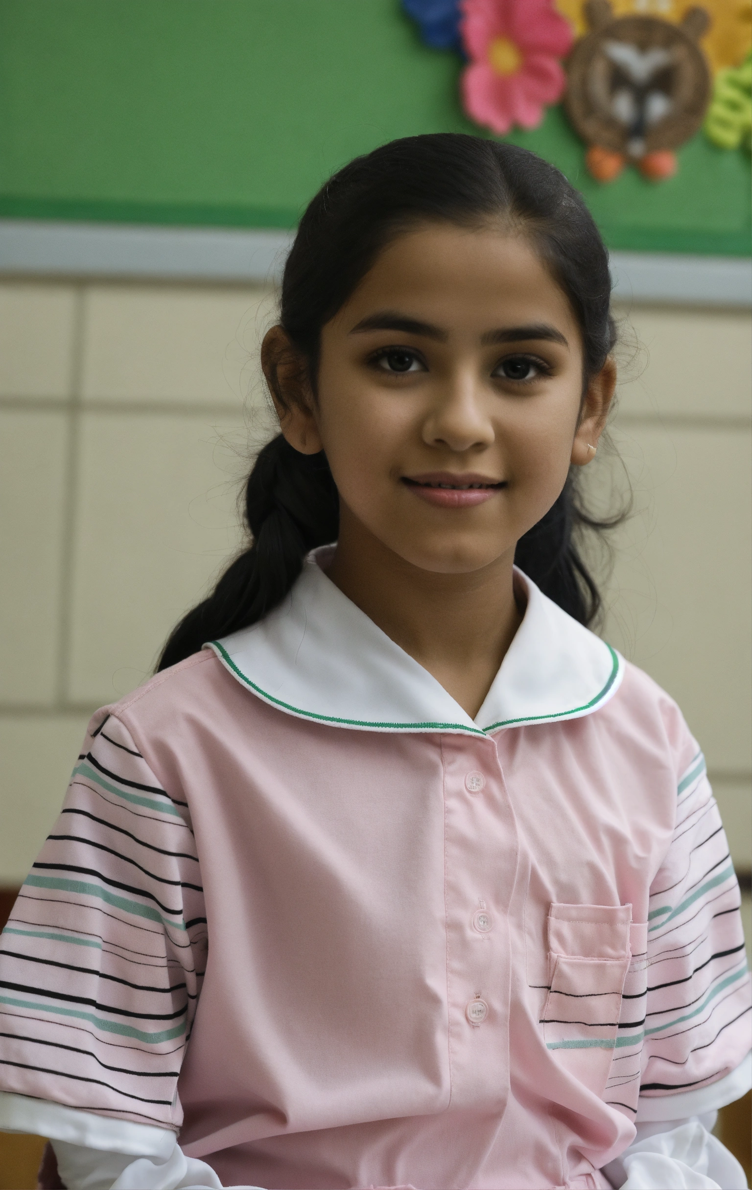 A student from the state of kuwait in the primary stage appears in a school photo in which she wears a school uniform consisting of a light pink shirt with white stripes and a light pink dress. she has beautiful features, light skin, black eyes, and black hair with a ponytail. she wears black school shoes and white socks.