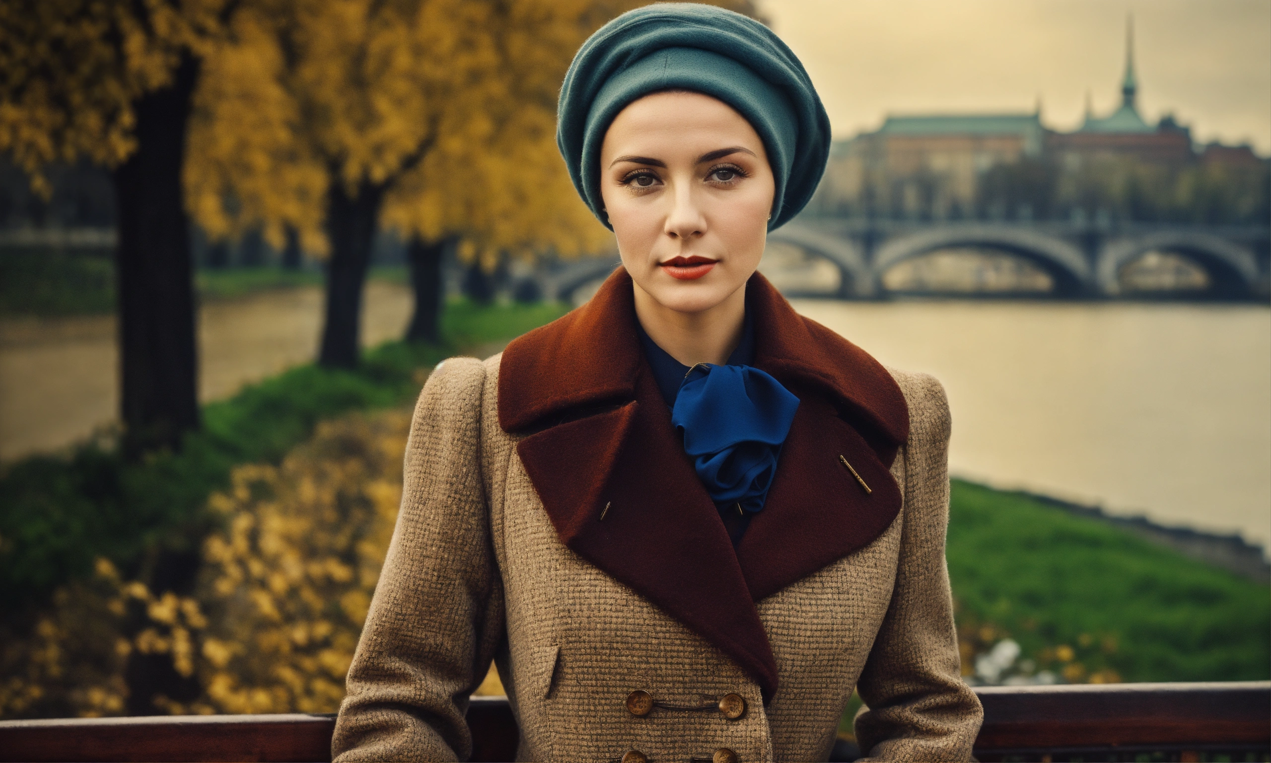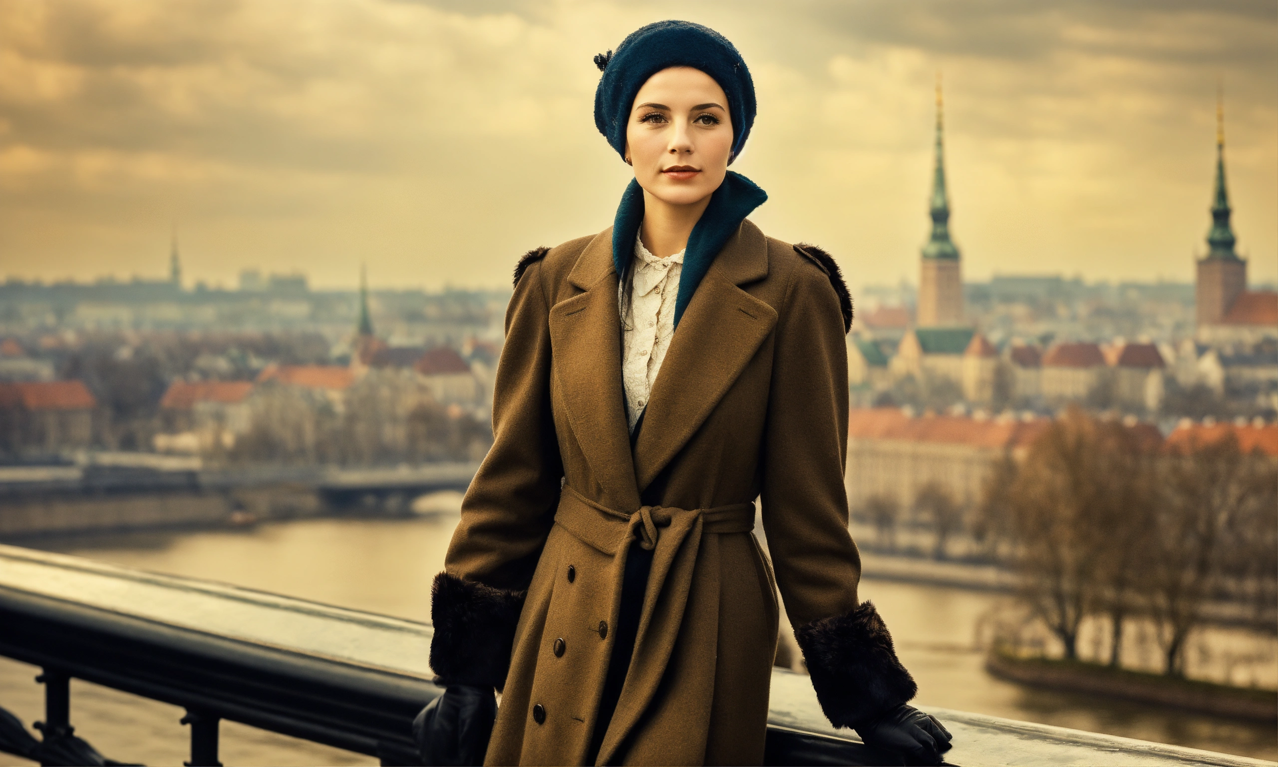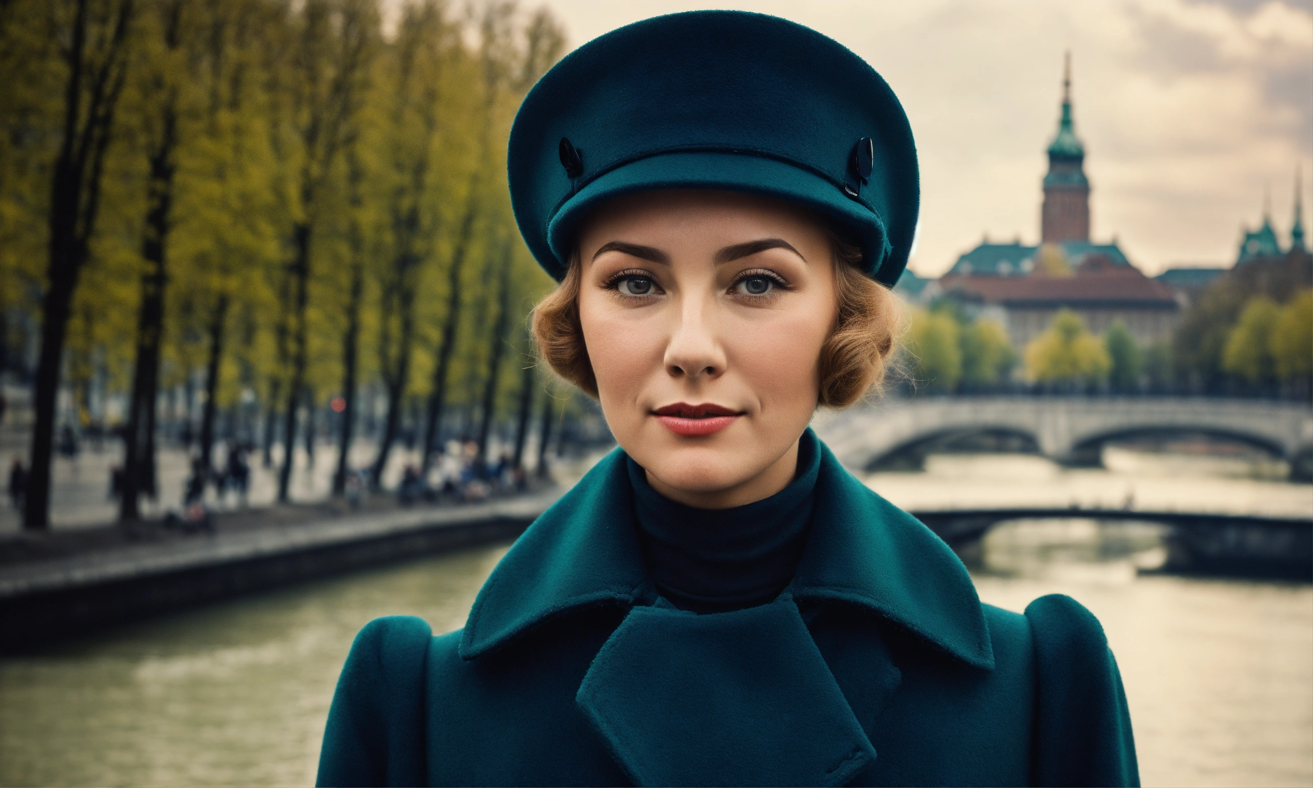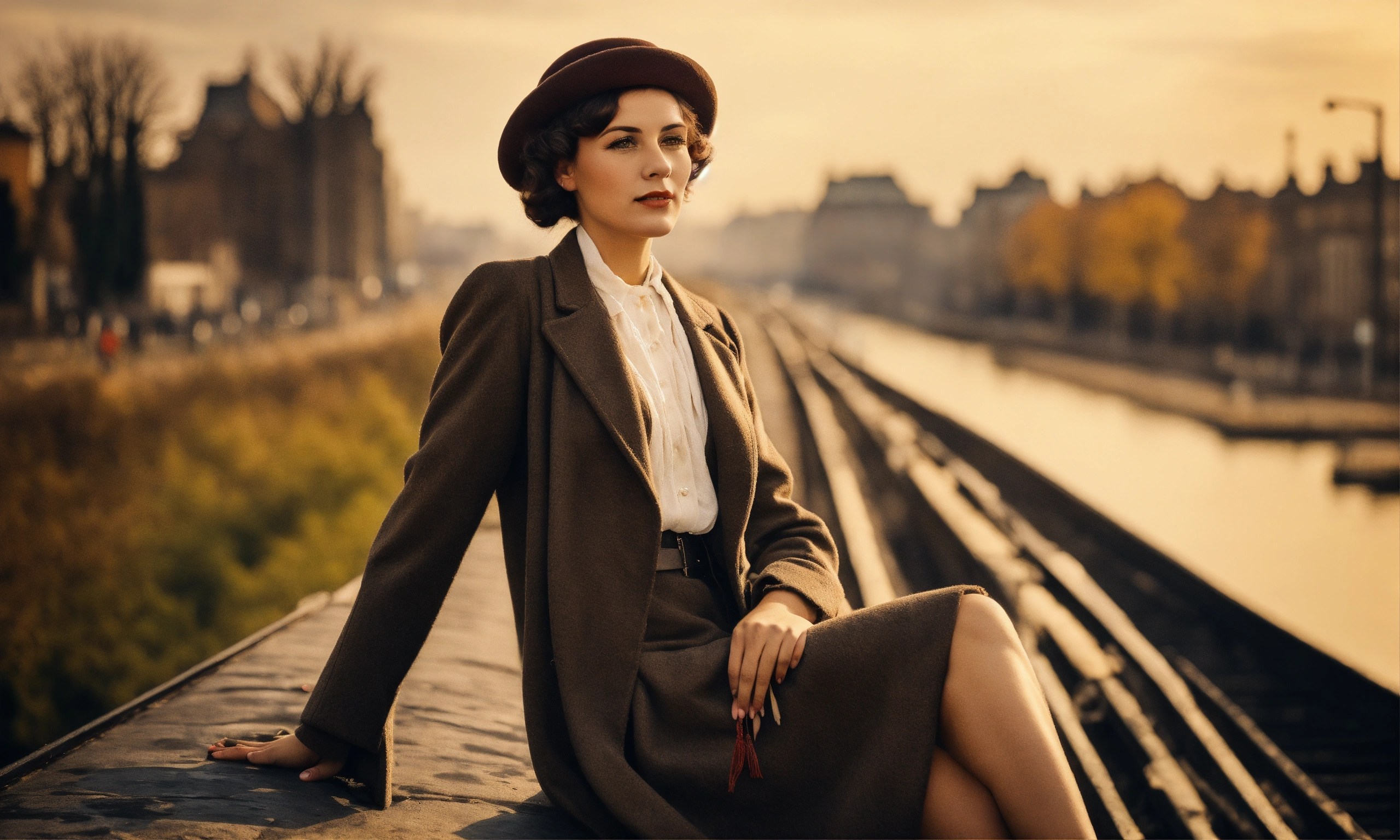 Retro warszawa 1920-1930, buatiful, cute europian woman, on top of a rievier, looks at the camera at half height, bald, retro style.clothing long coat, small nose, big jaw, the woman exudes kindness, calmness and ambition