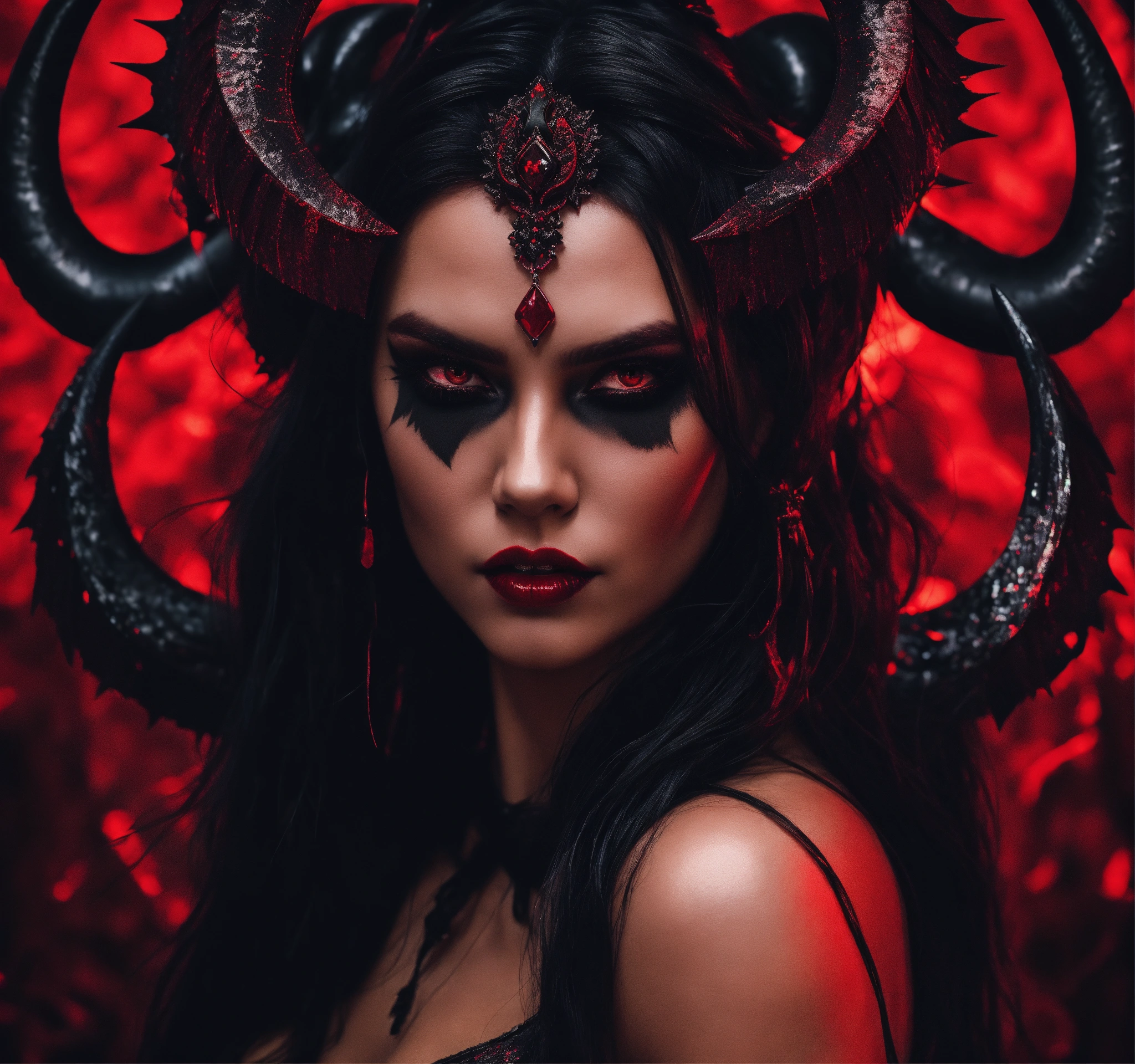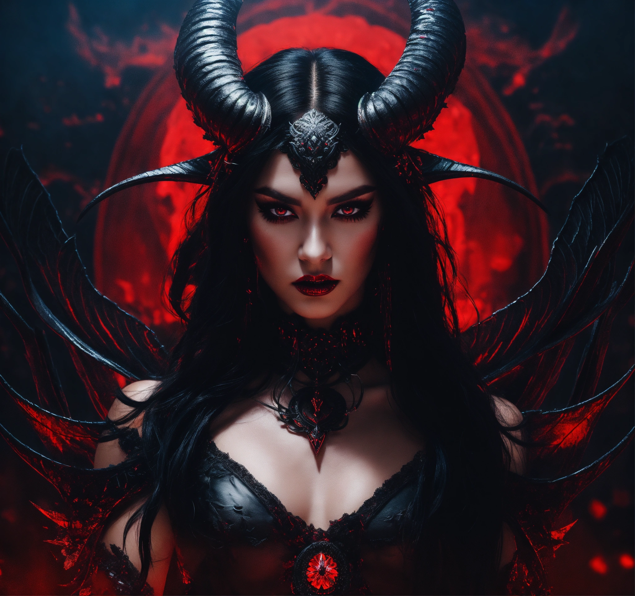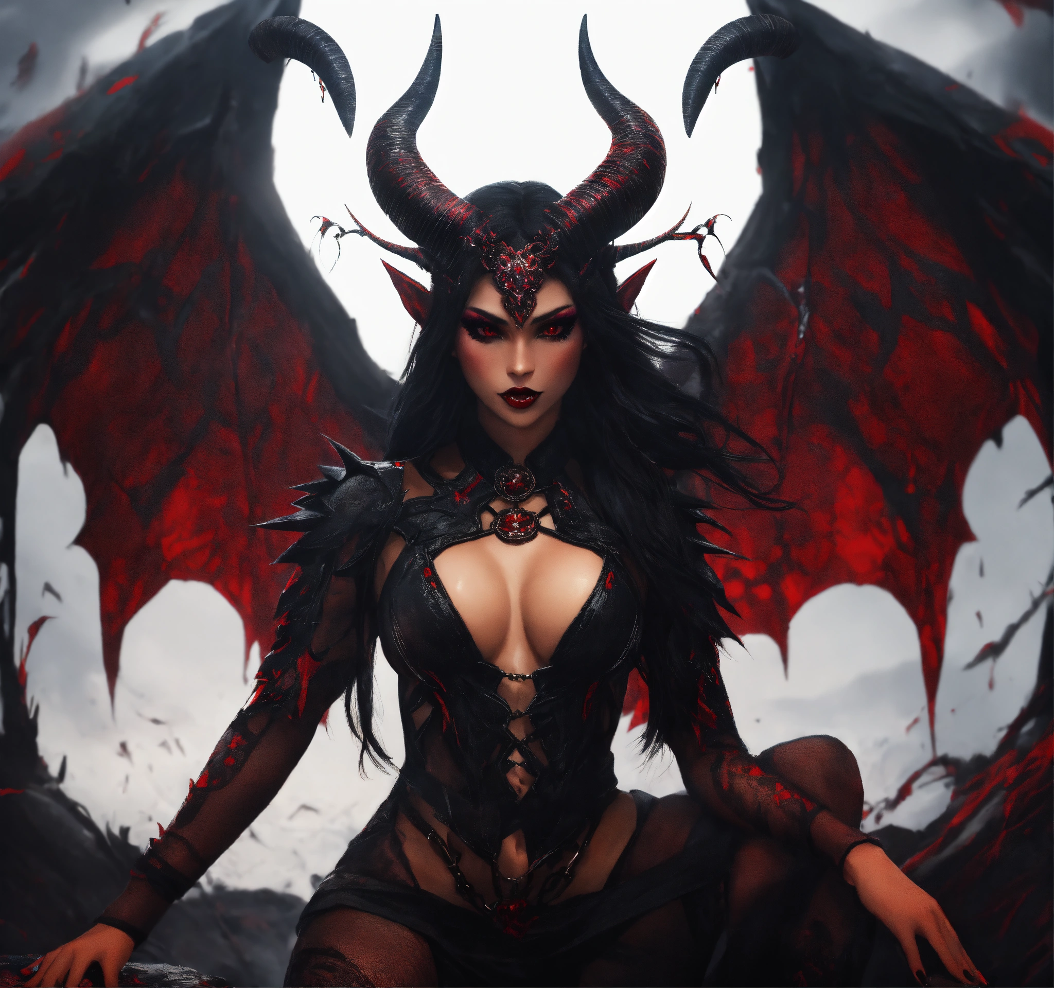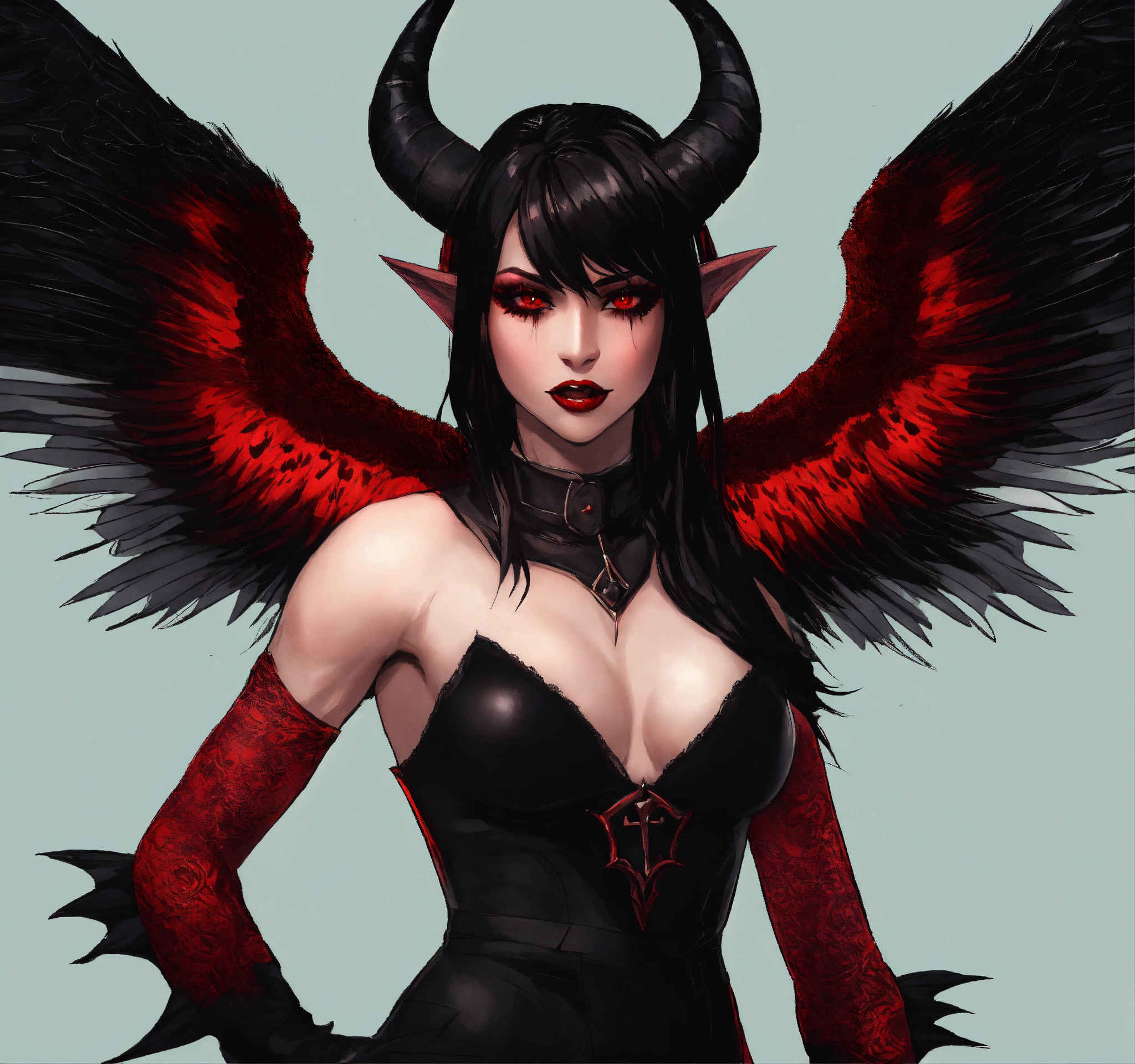 A beautiful demonic woman, red skin, horns, black wings, black hair, red eyes, black eyeshadow, muscular, dominant