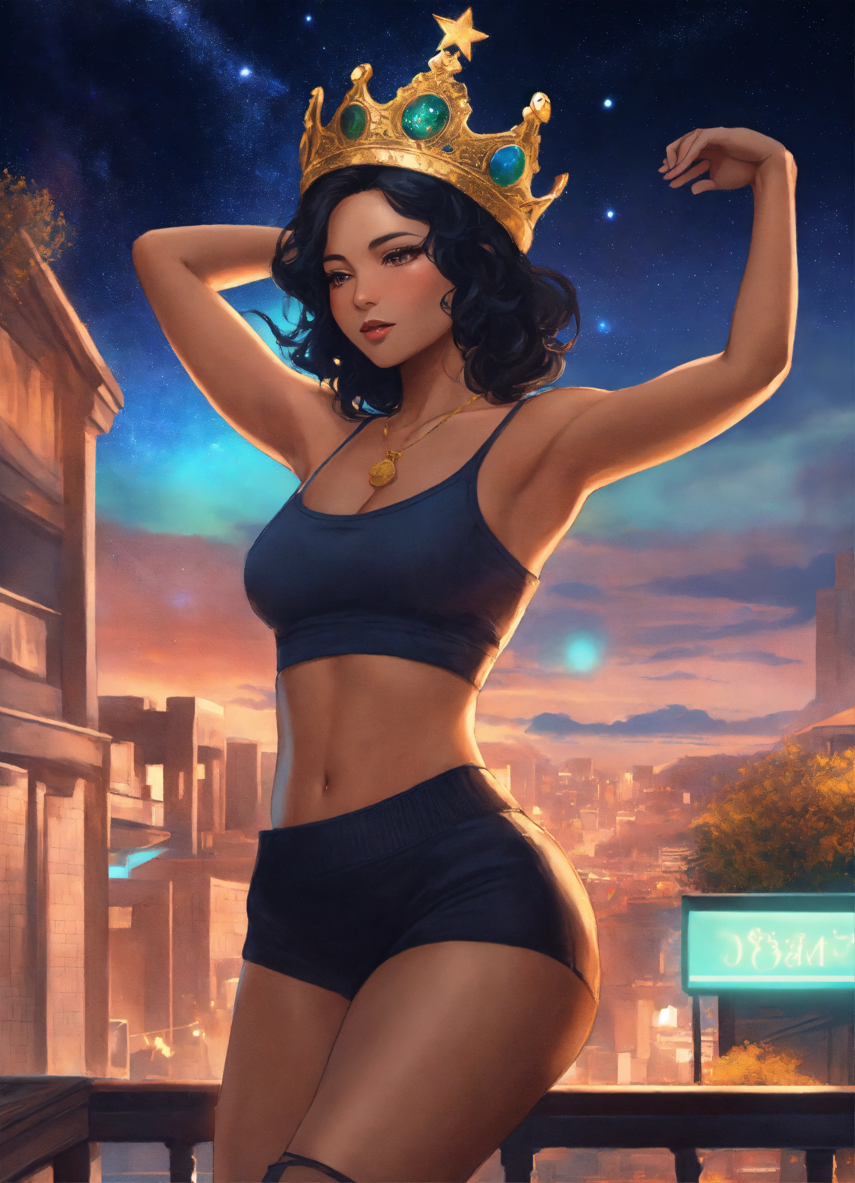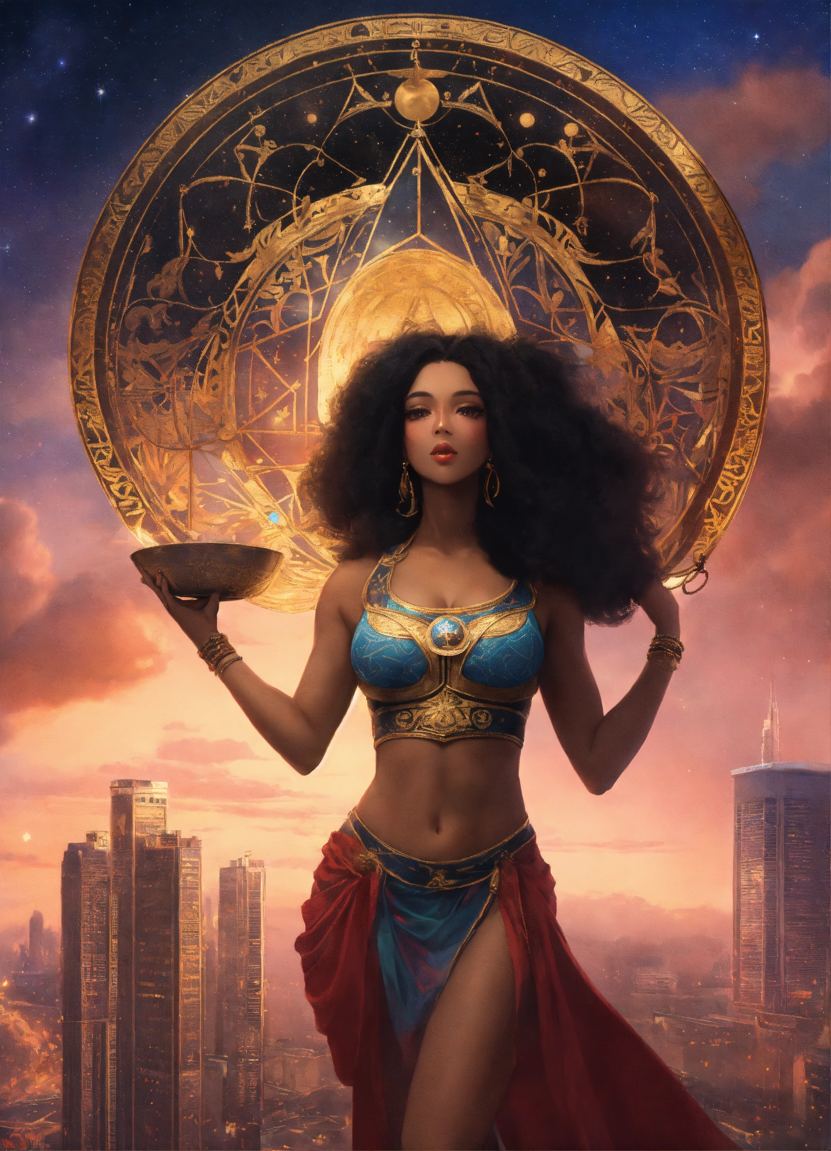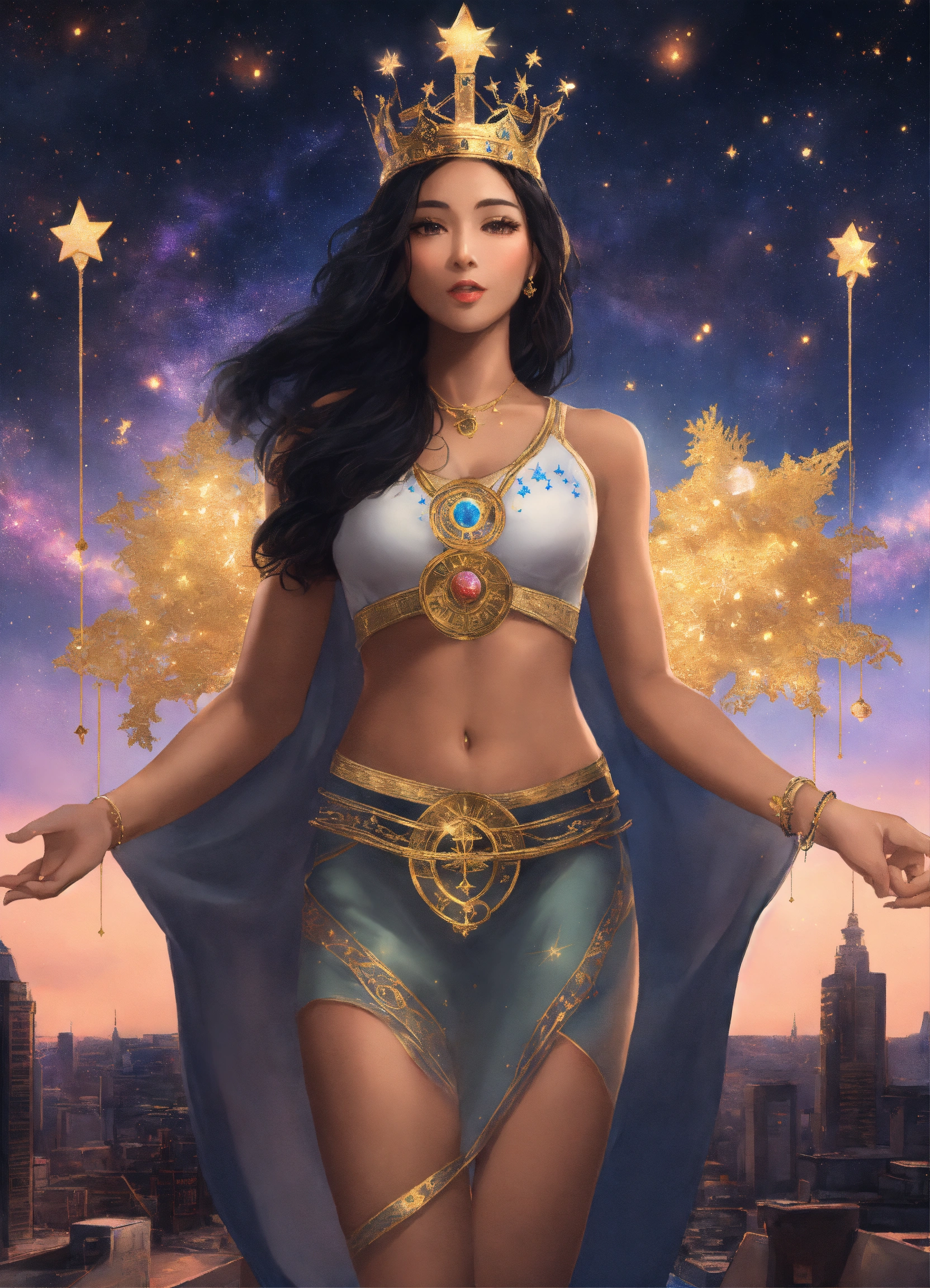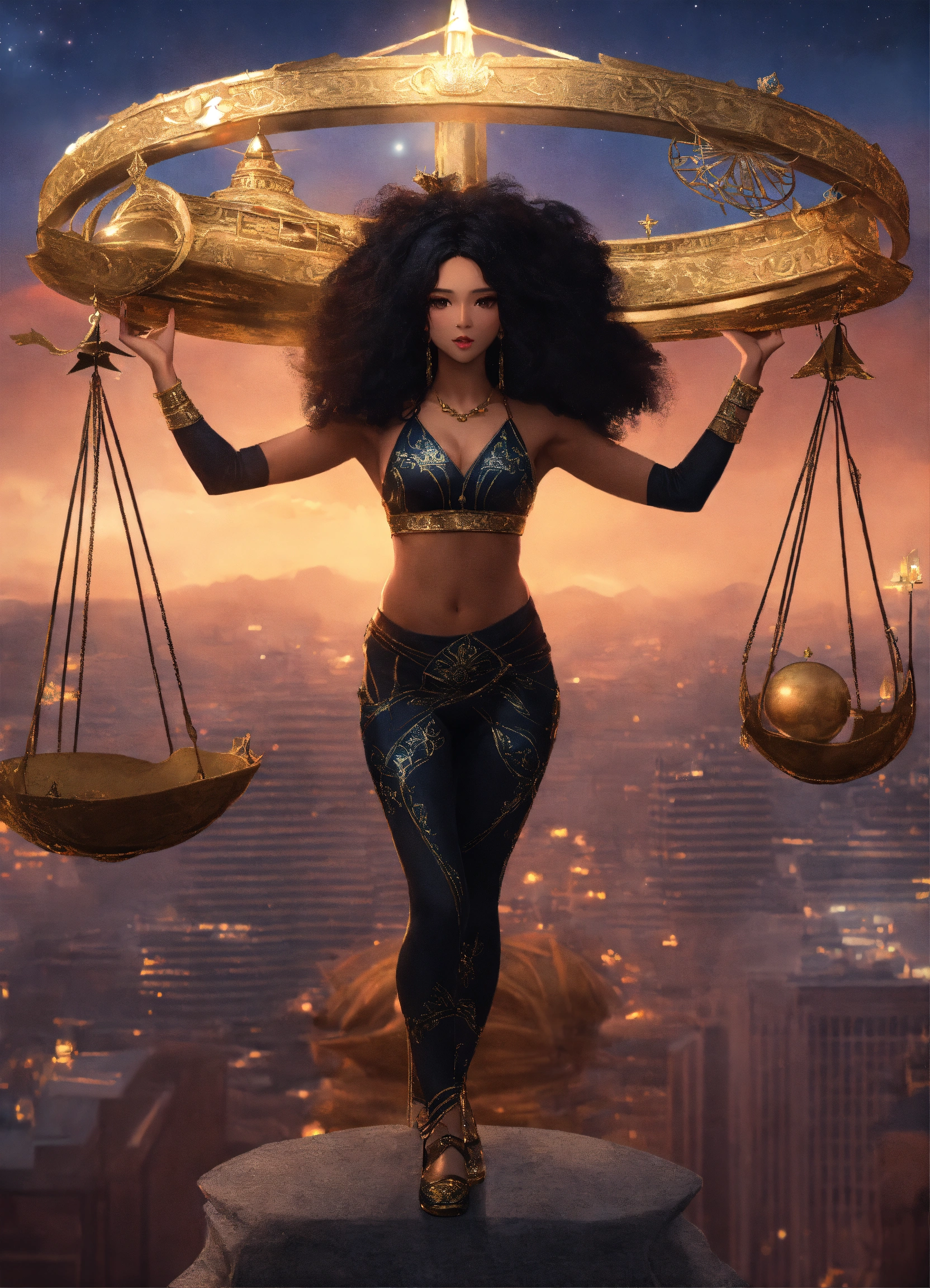 The star sign of libra personified as black hair and fair skinned eurasian female, age 40 years old, celestial crown, royal athletic street wear, galaxy city sky, balancing scales in hands, arms open