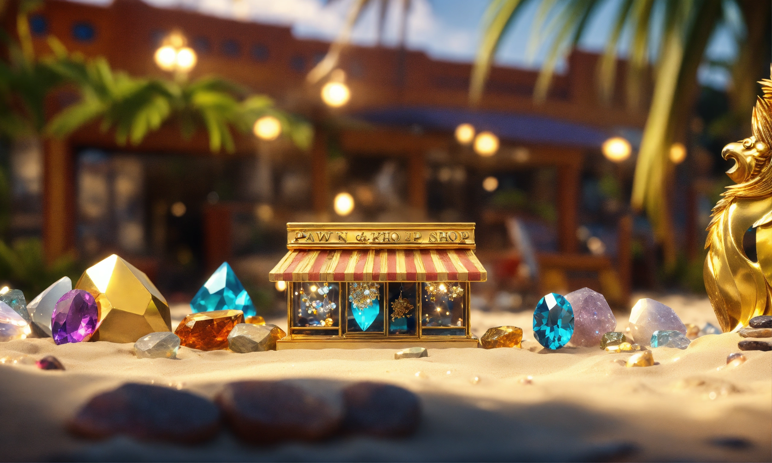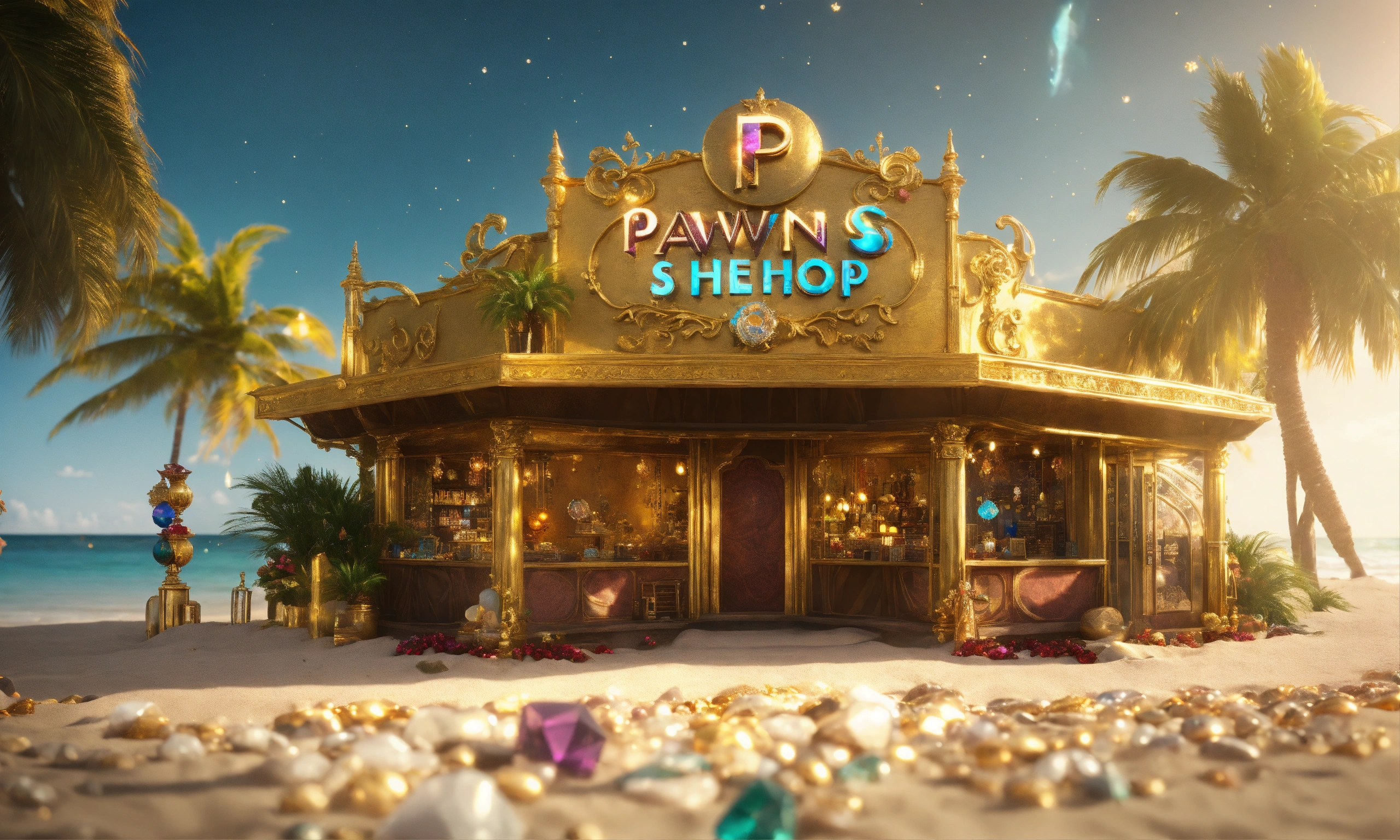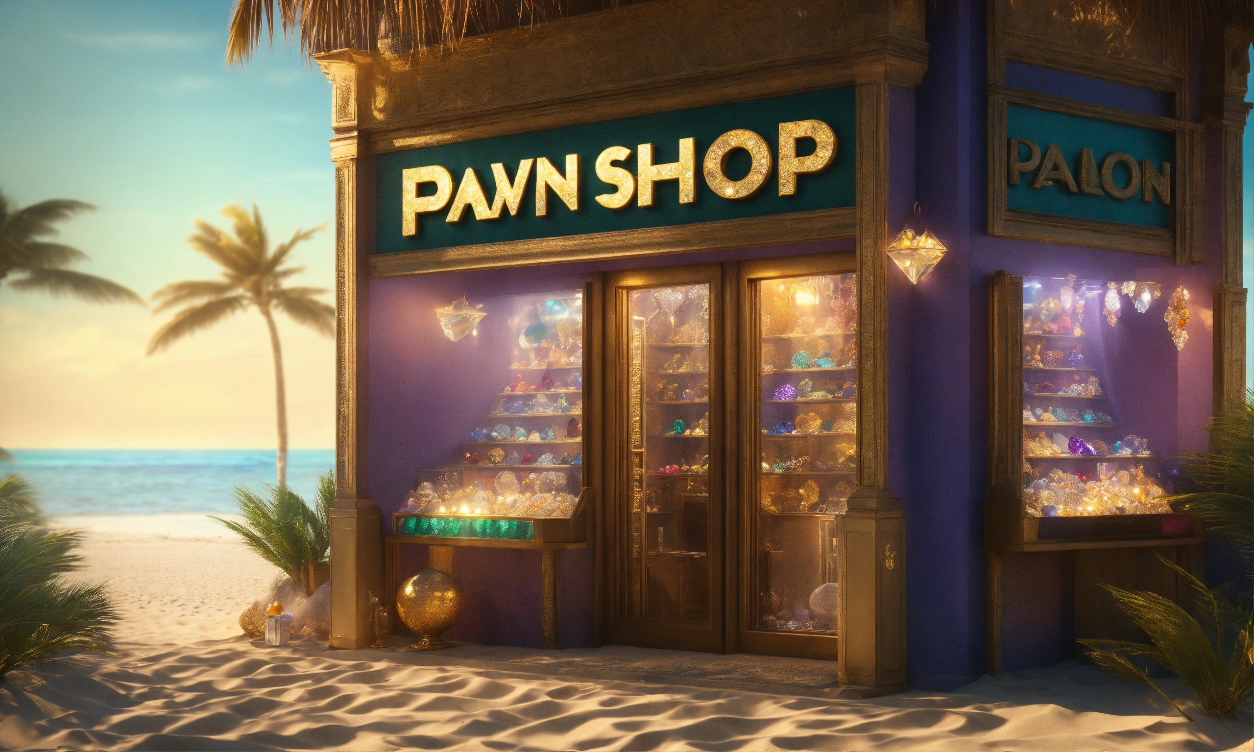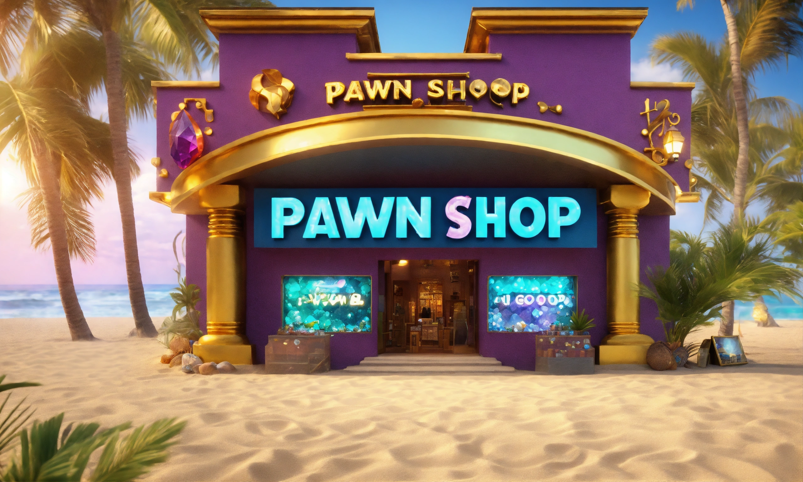 Pawn shop logo, nft store on the beach, gemstones and crystals around, gold and treasures on the front, palms hd, realistic 4k