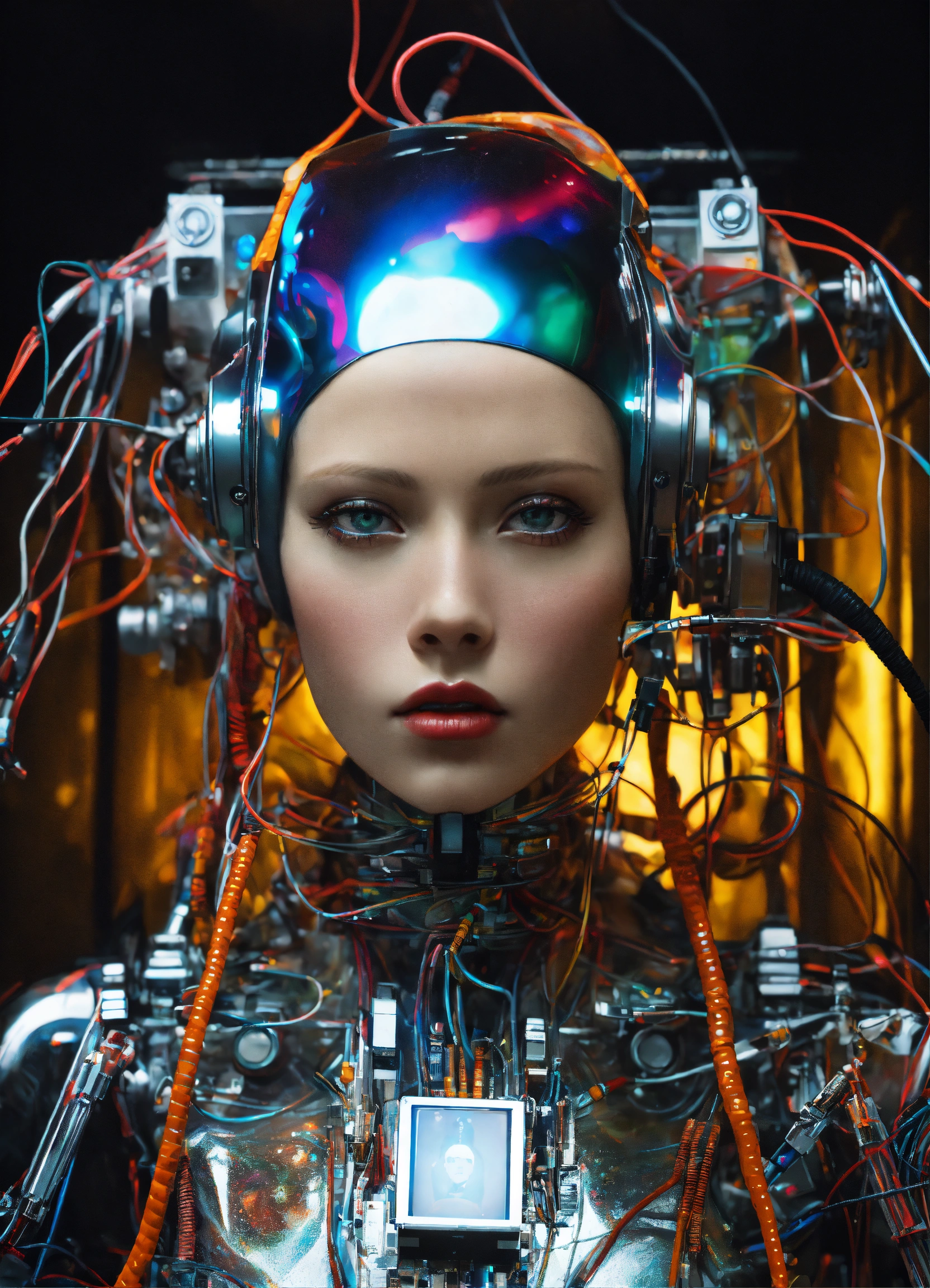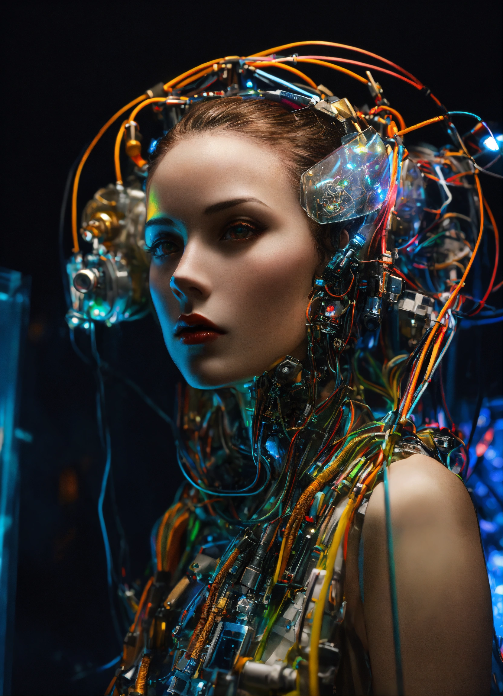 Portrait photography, in front of a black wall, a cyborg astronaut woman head without body, connected by cables and wires and led, an attractive transparent iridescent plexiglass body punk plc robots with plexiglass motor head, with ray guns, 80 degree view, art by sergio lopez, natalie shau, james jean and salvador dali