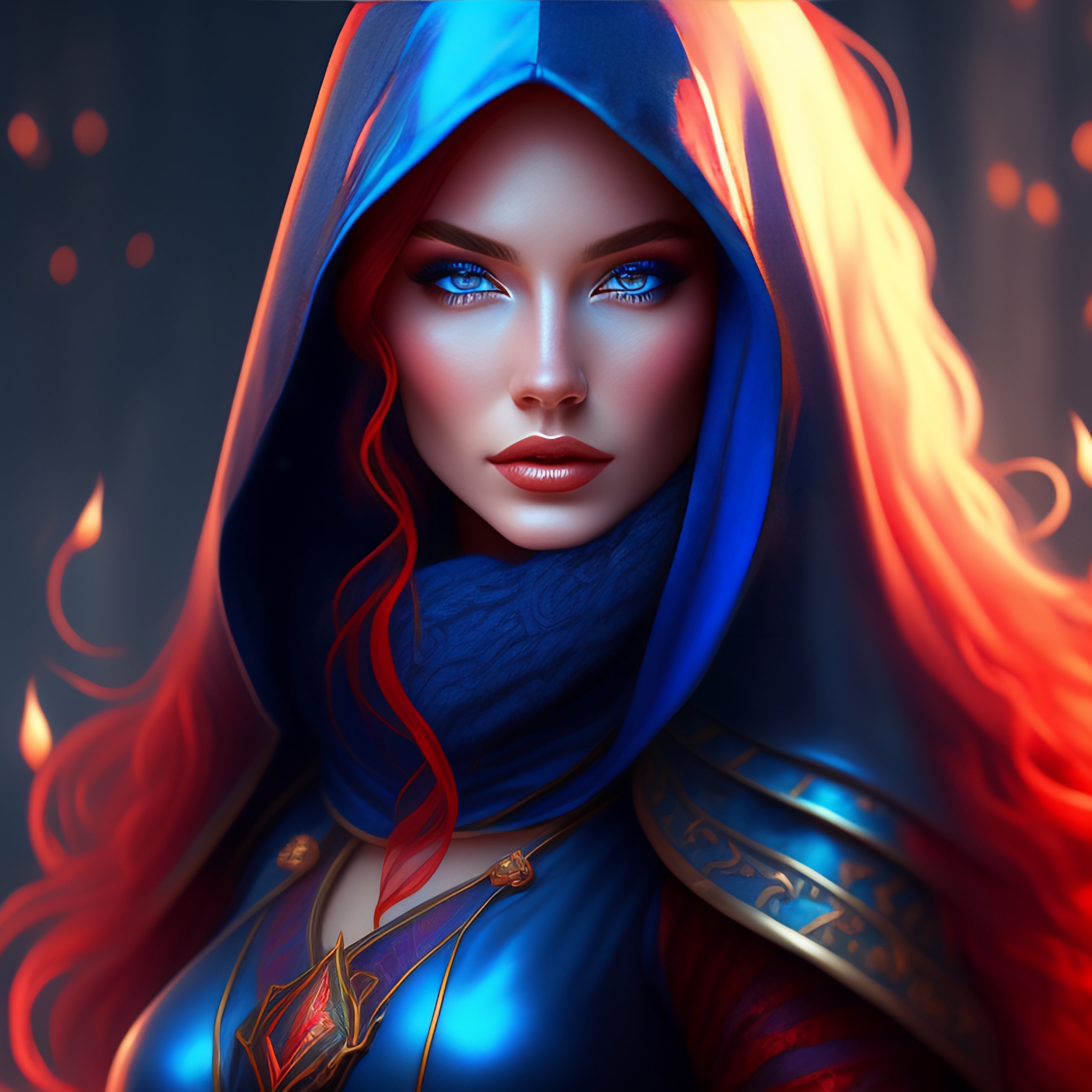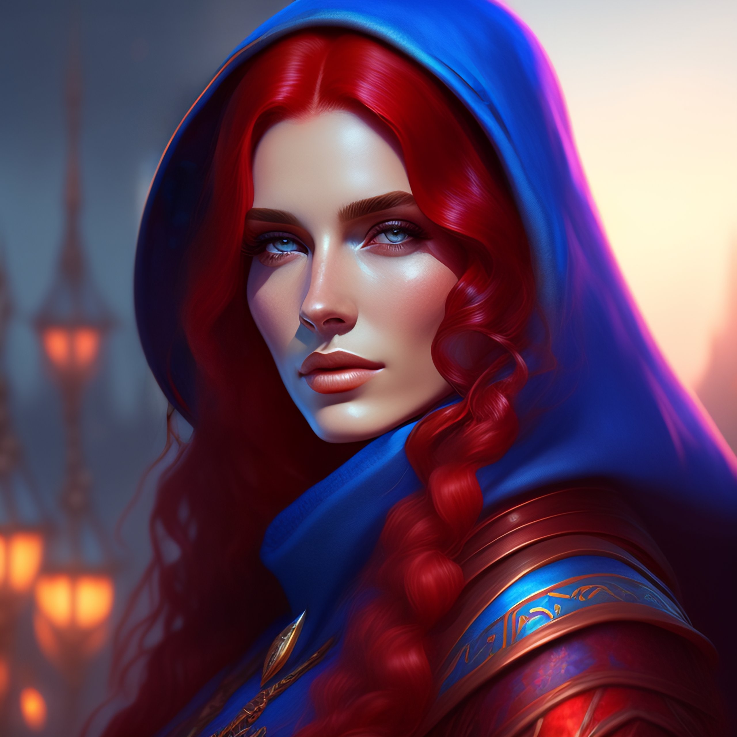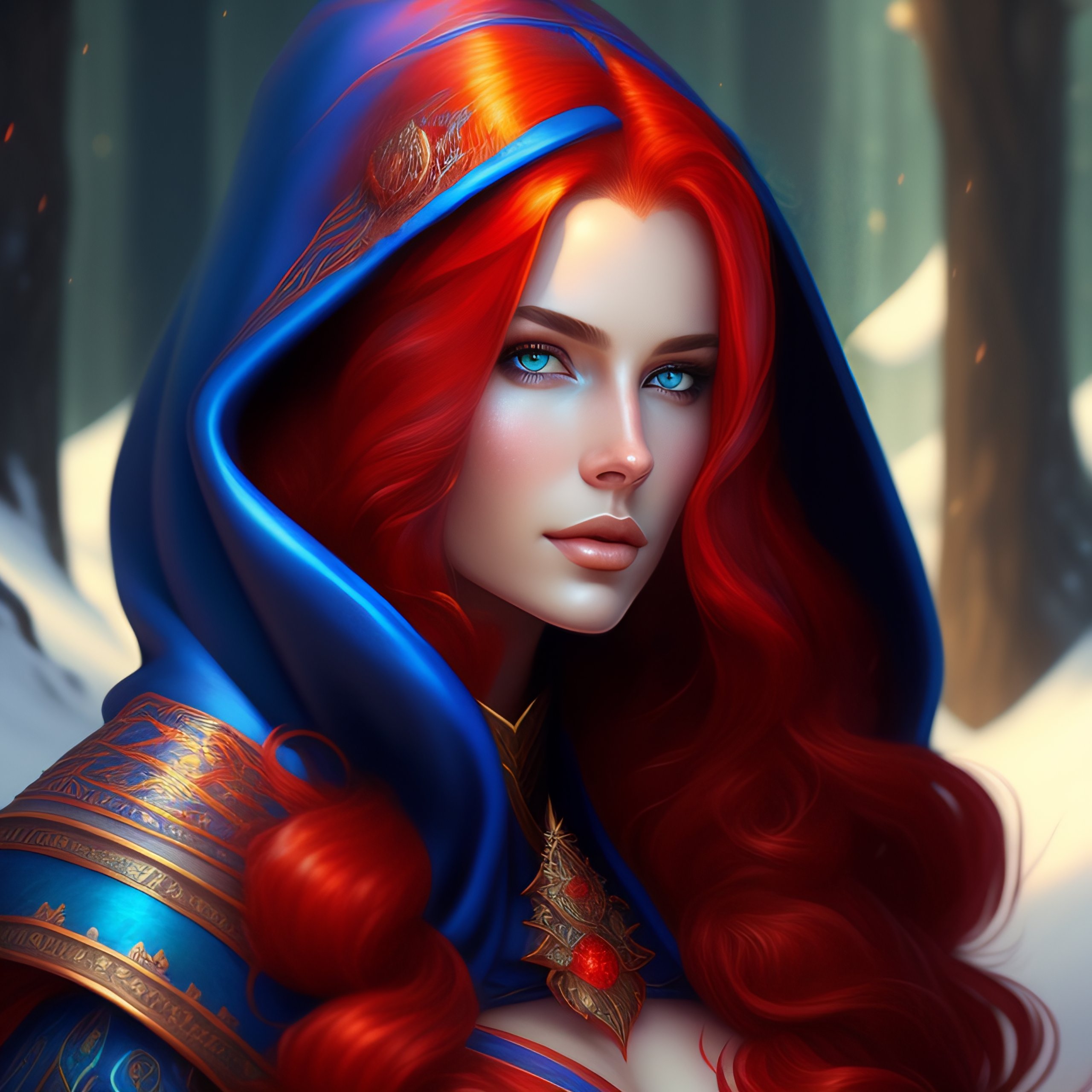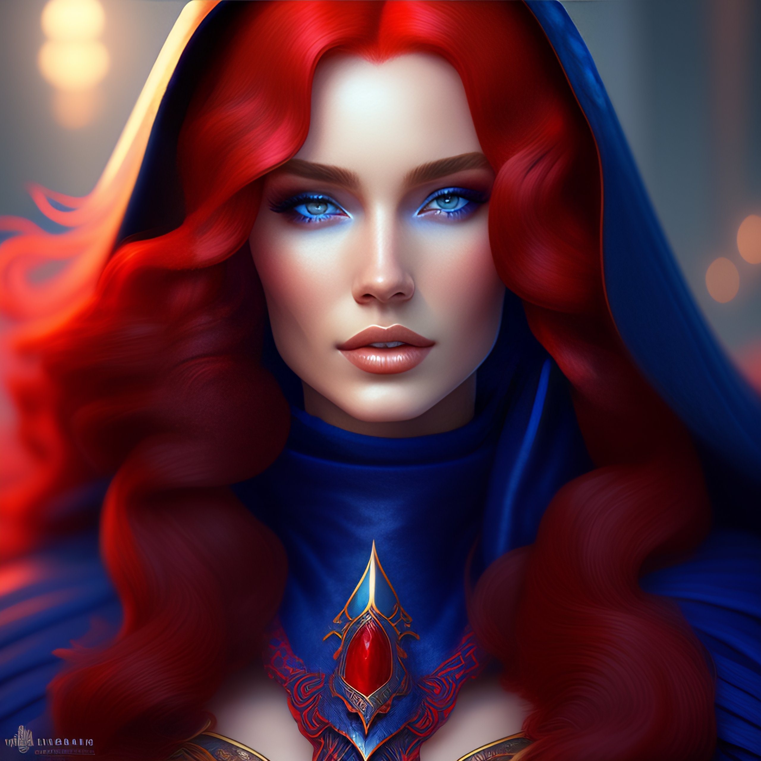 Blue skin woman wearing a hood, long curly red hair, d & d, fantasy, mage, intricate, elegant, highly detailed, digital painting, artstation, blue and red color palette, octane render, concept art, matte, sharp focus, illustration, hearthstone, art by artgerm, alphonse mucha johannes voss