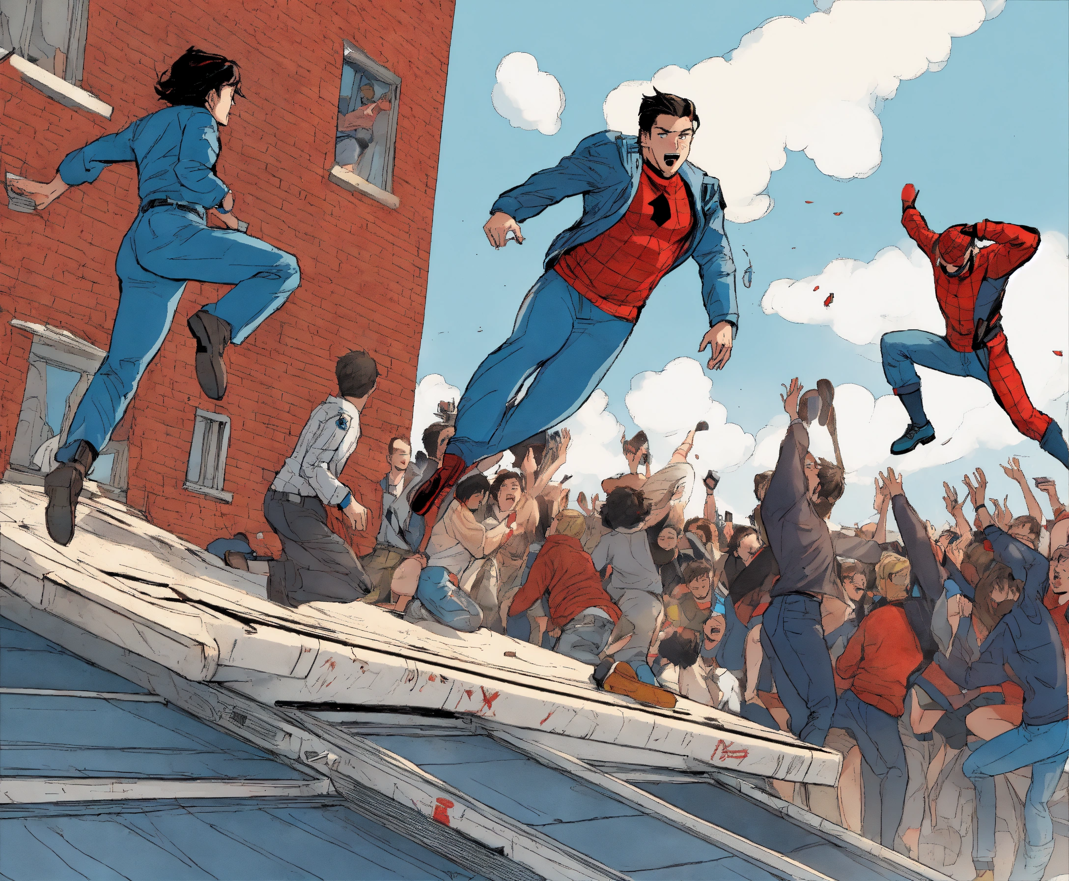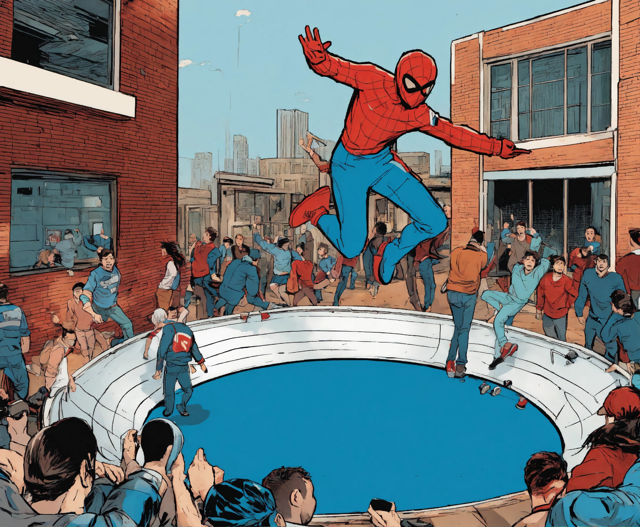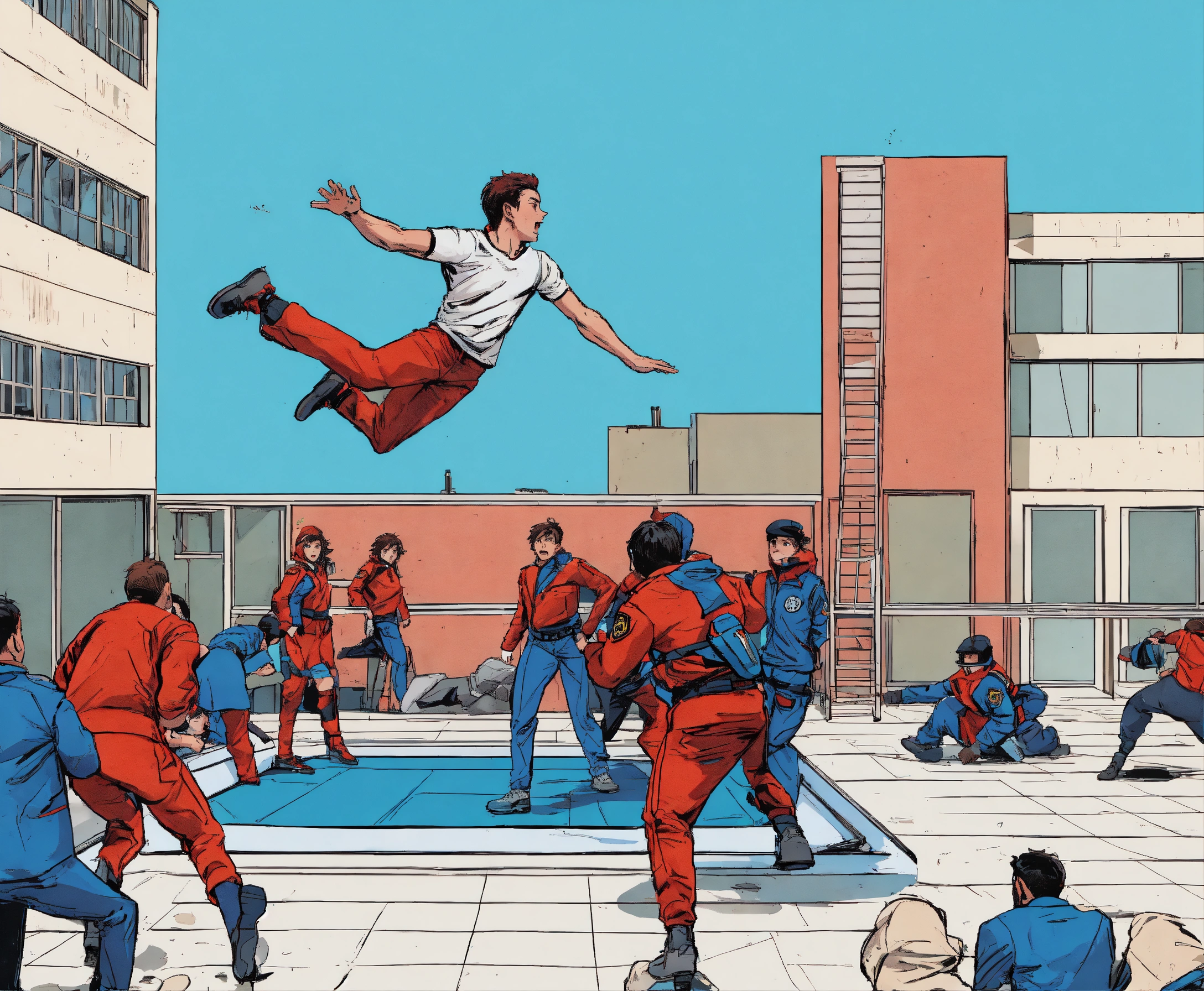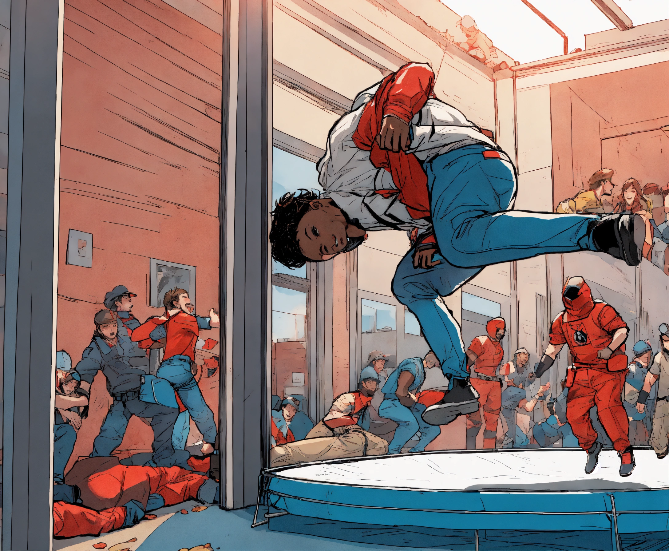 A person who fell out of a window is caught on a trampoline by people standing on the ground, comic book style color white blue and red
