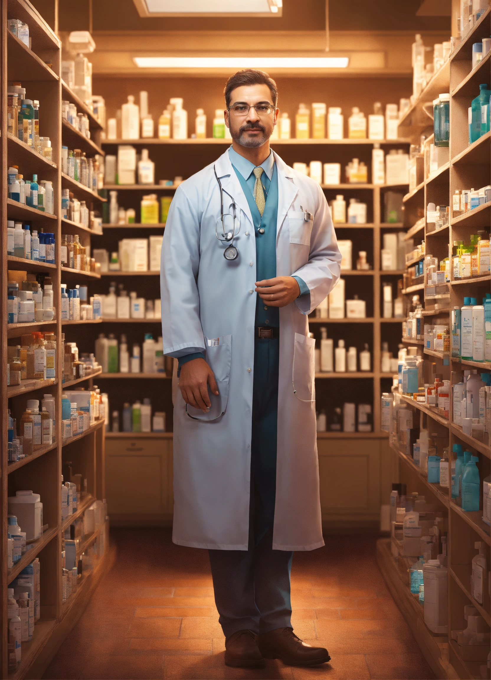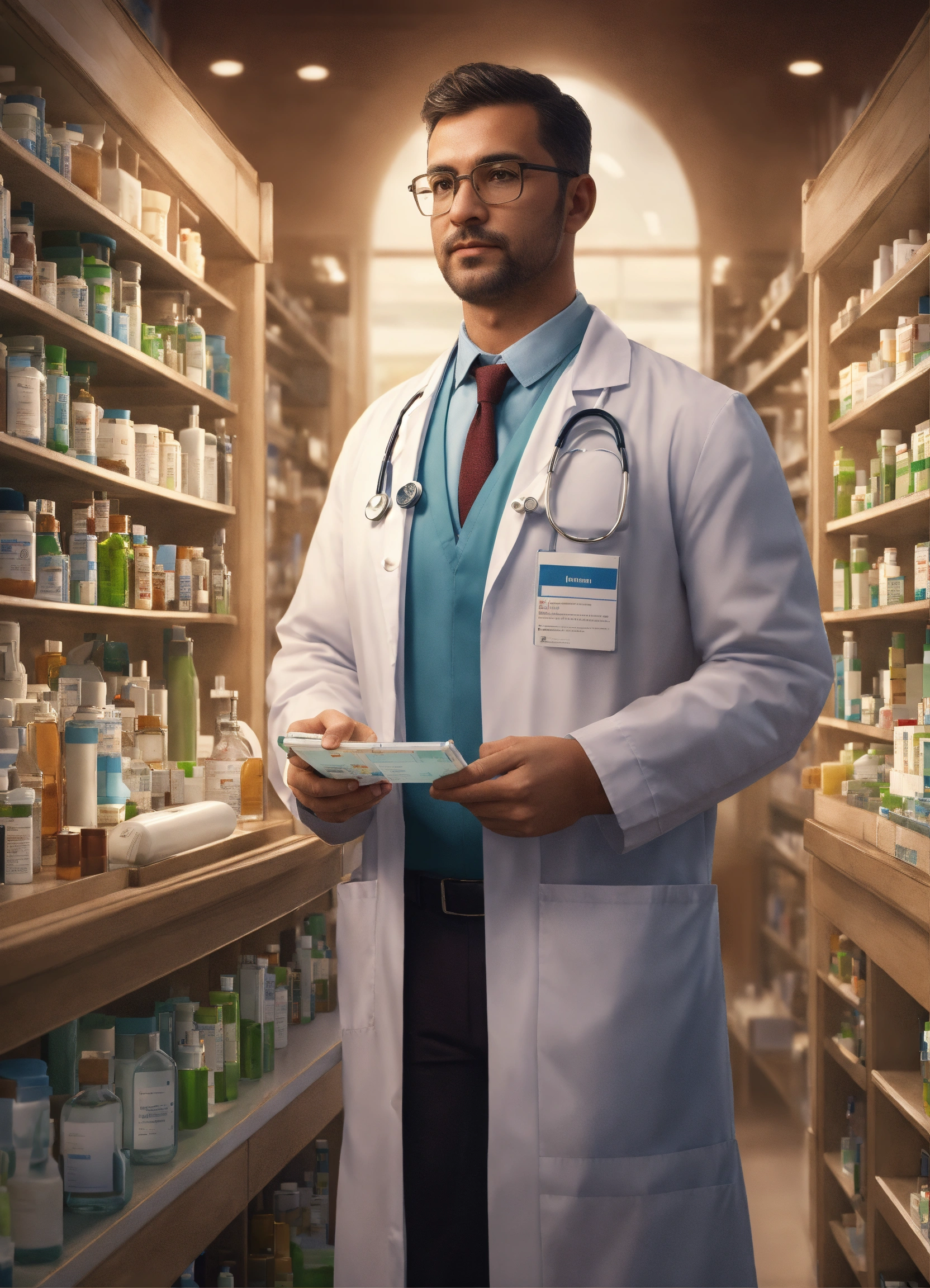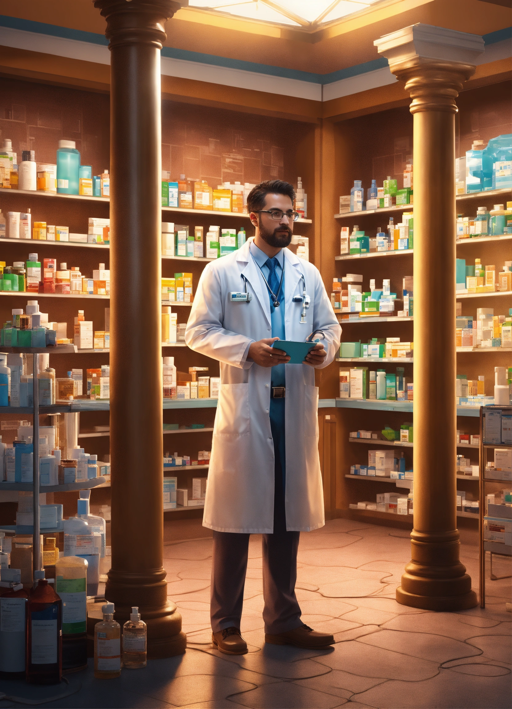 Create an image of a pharmacist standing as a strong pillar, supporting a healthcare system. show various healthcare components like hospitals, clinics, and patients connected to the pharmacist, symbolizing their vital role in healthcare trending on artstation. highly detailed, 8k, intricate details