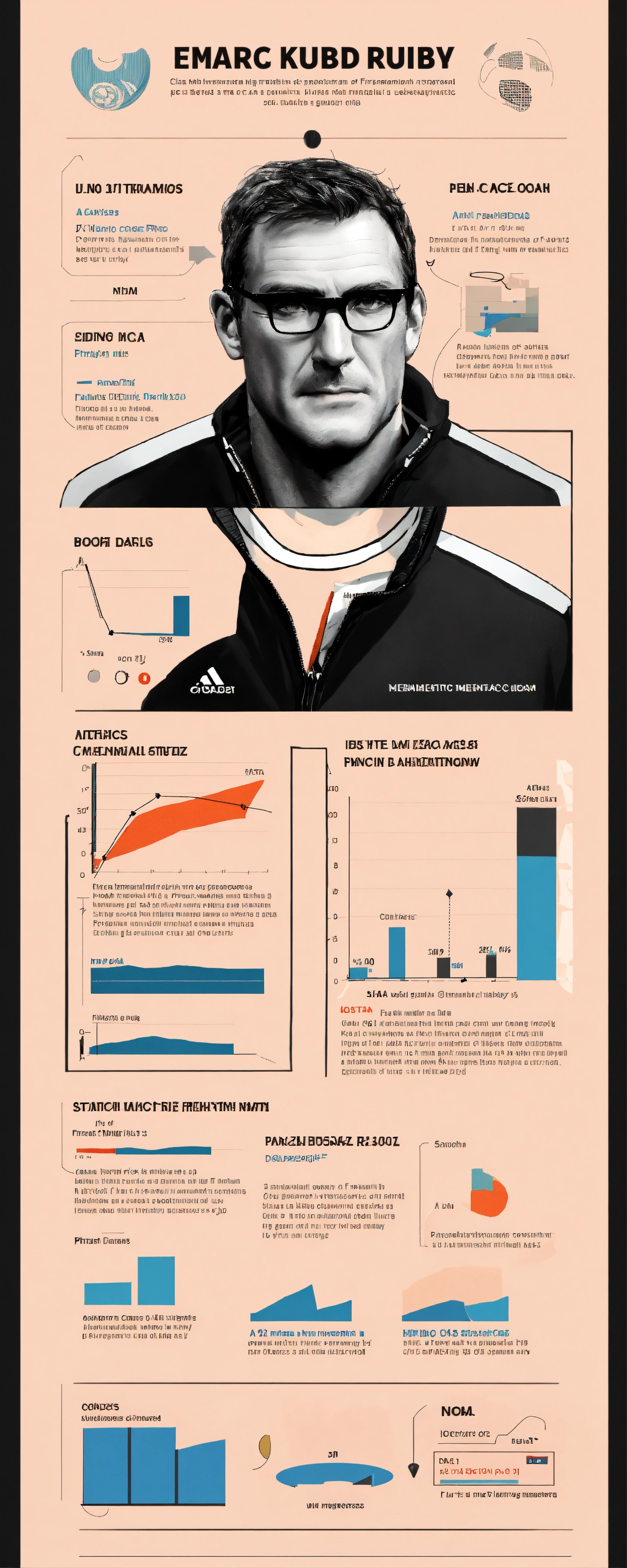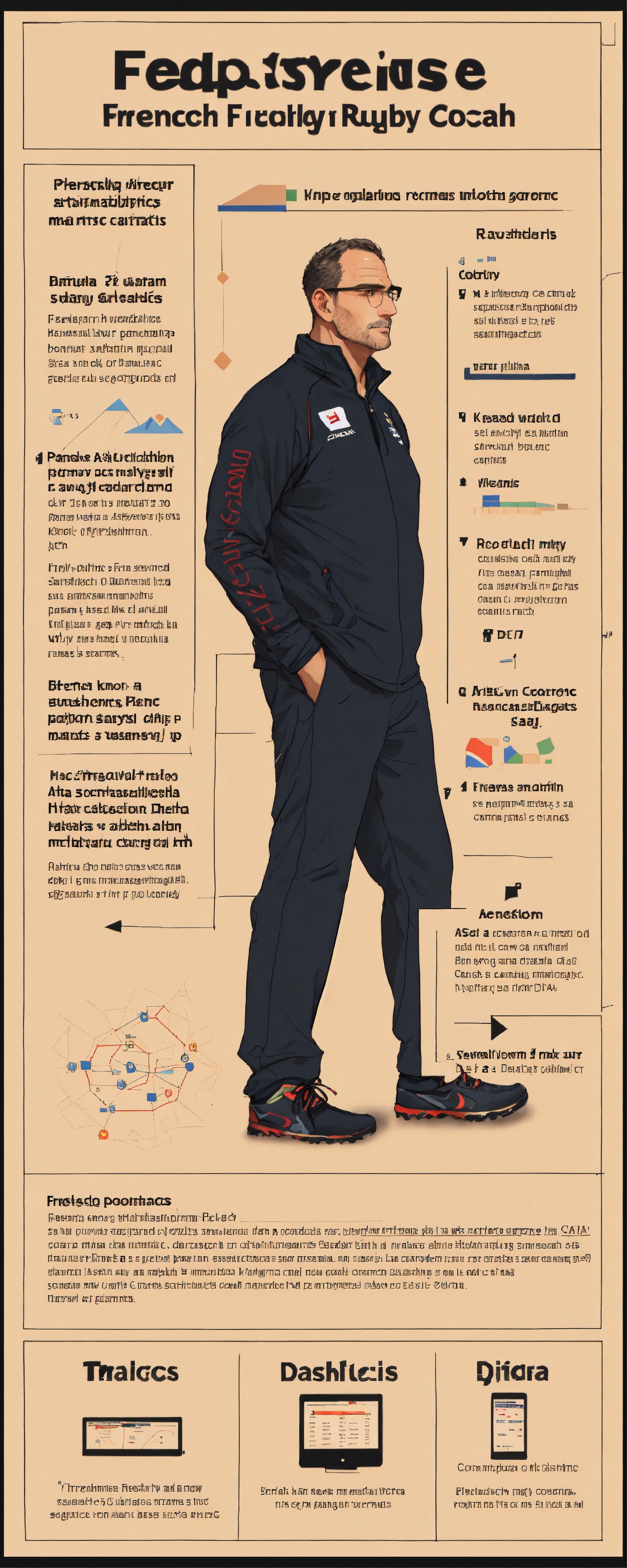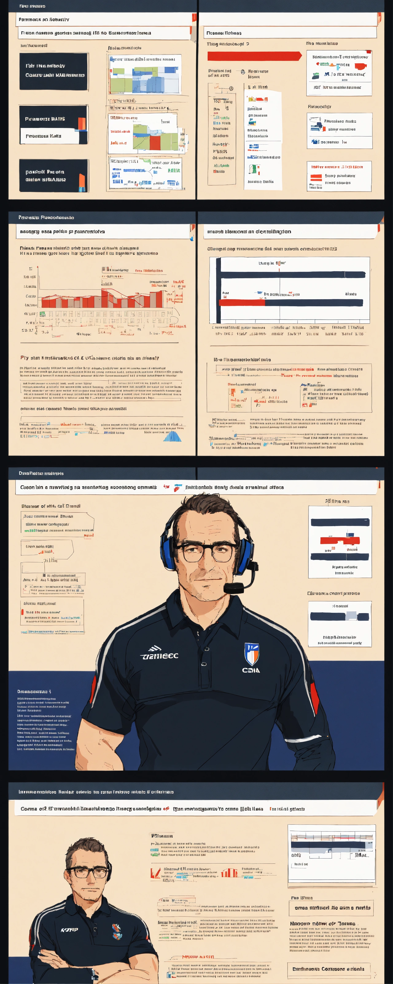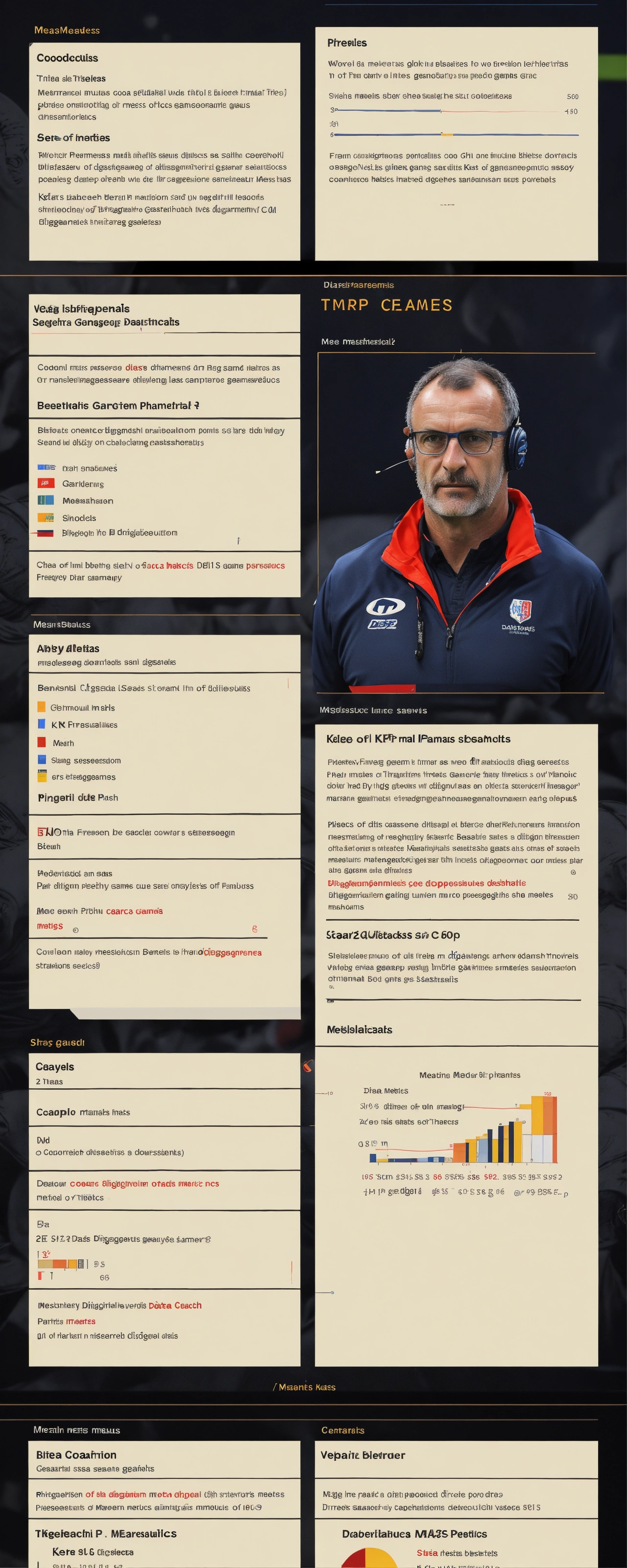 Portrait of a french rugby coach wearing a pair of oversized black, rectangular frames with thin temples. the coach is analyzing statistics from previous games. lots of screens with sophisticated data dashboards and diagrams. boards with strategy sketches. data analysis. diagrams. metrics. kpis