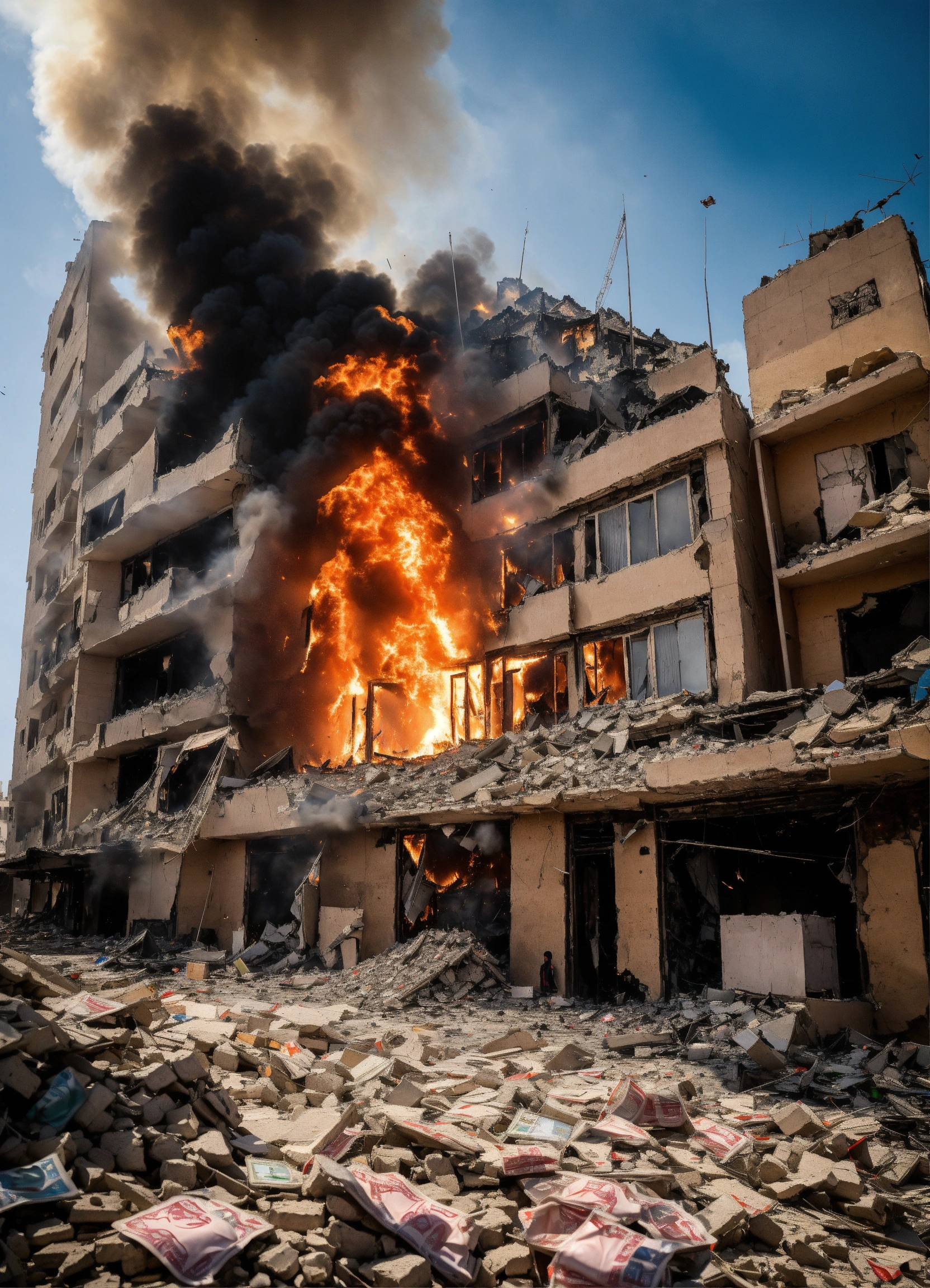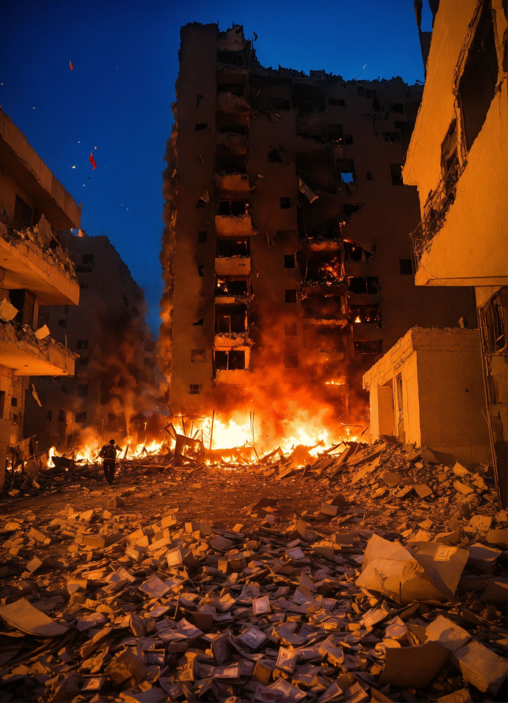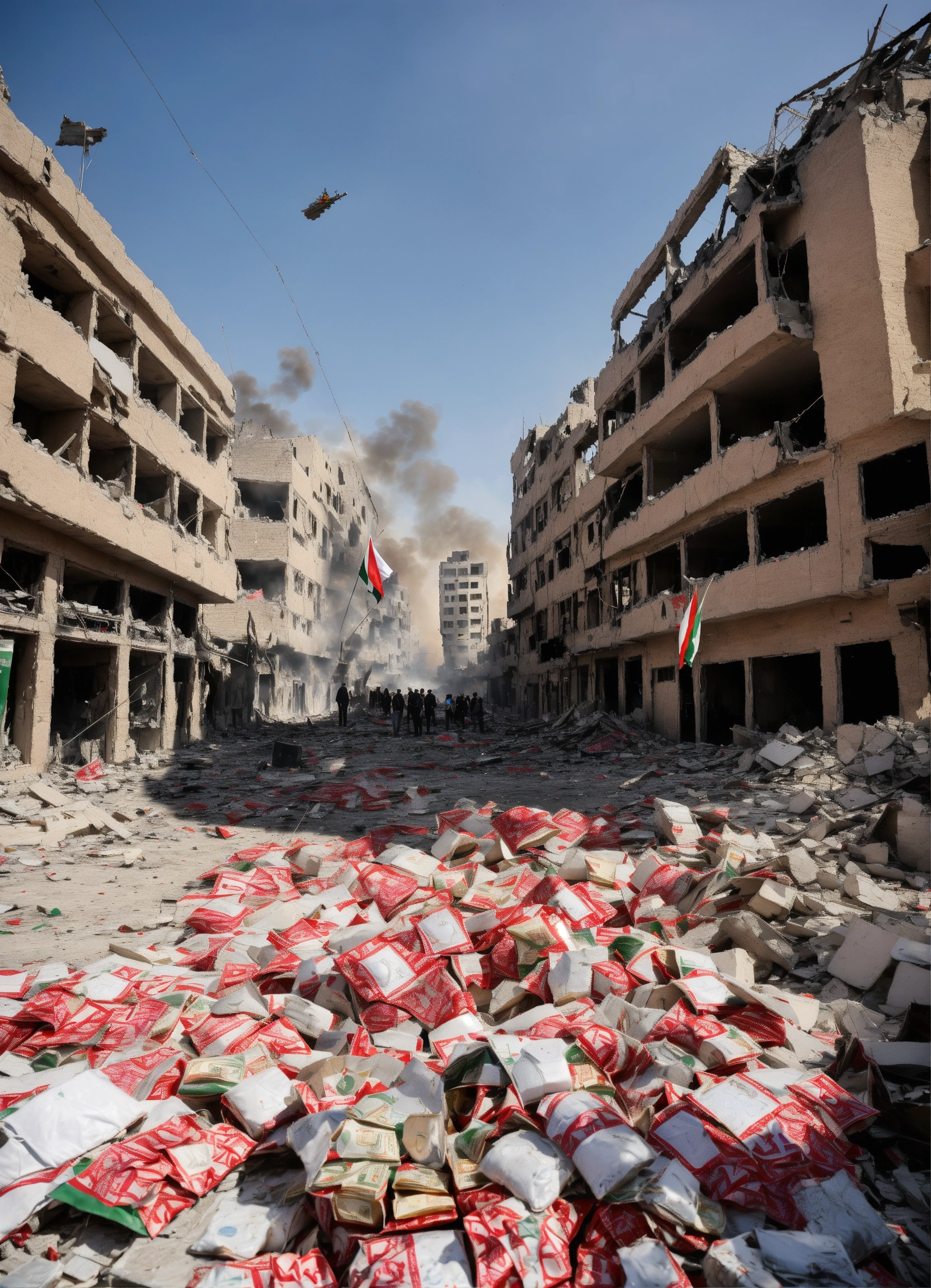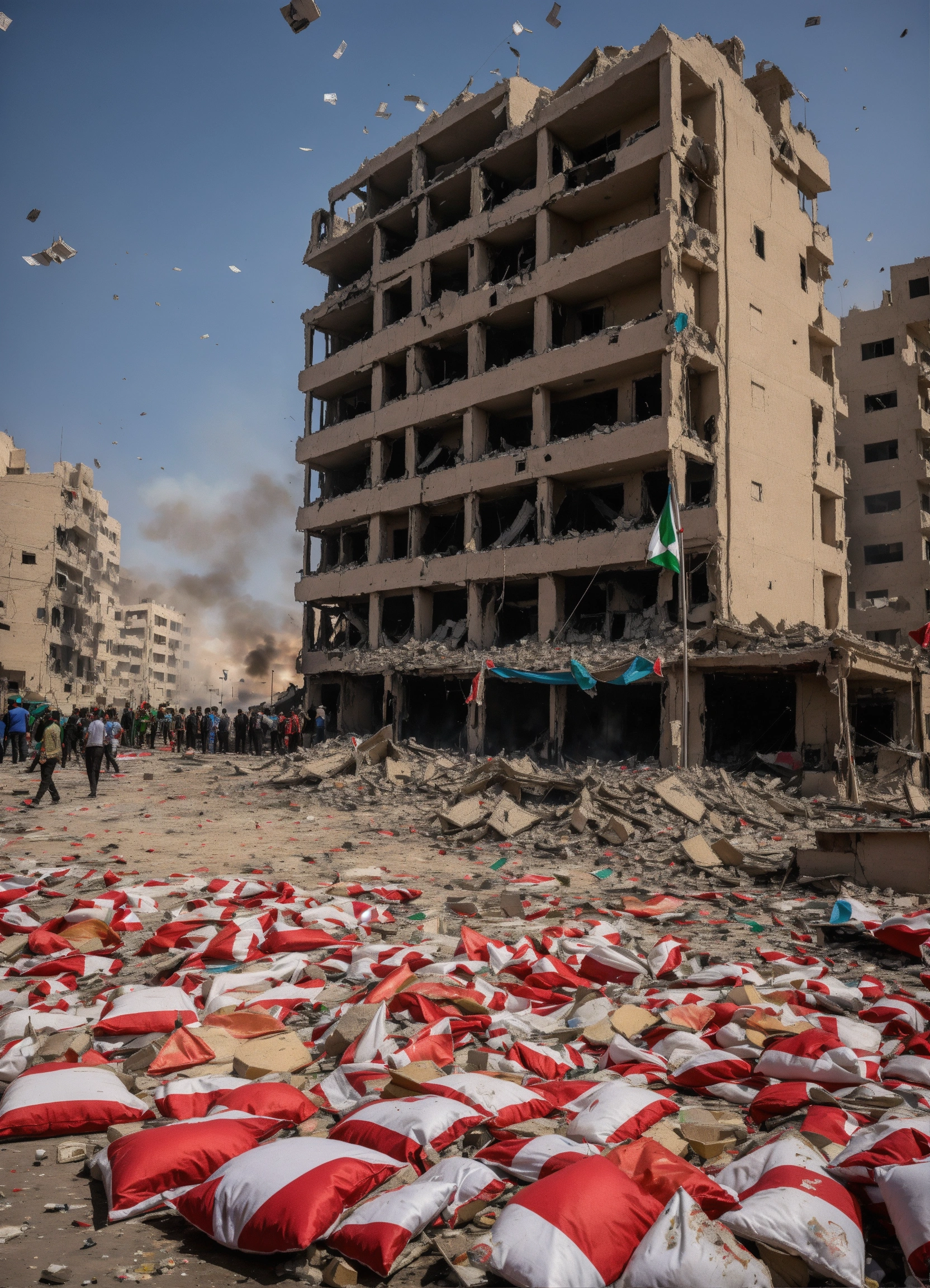 "buildings shattered and ablaze due to airstrikes in palestine, alongside large bags of money displaying dollars and euros. adjacent to them stand the flags of egypt, the european union, and the united nations."