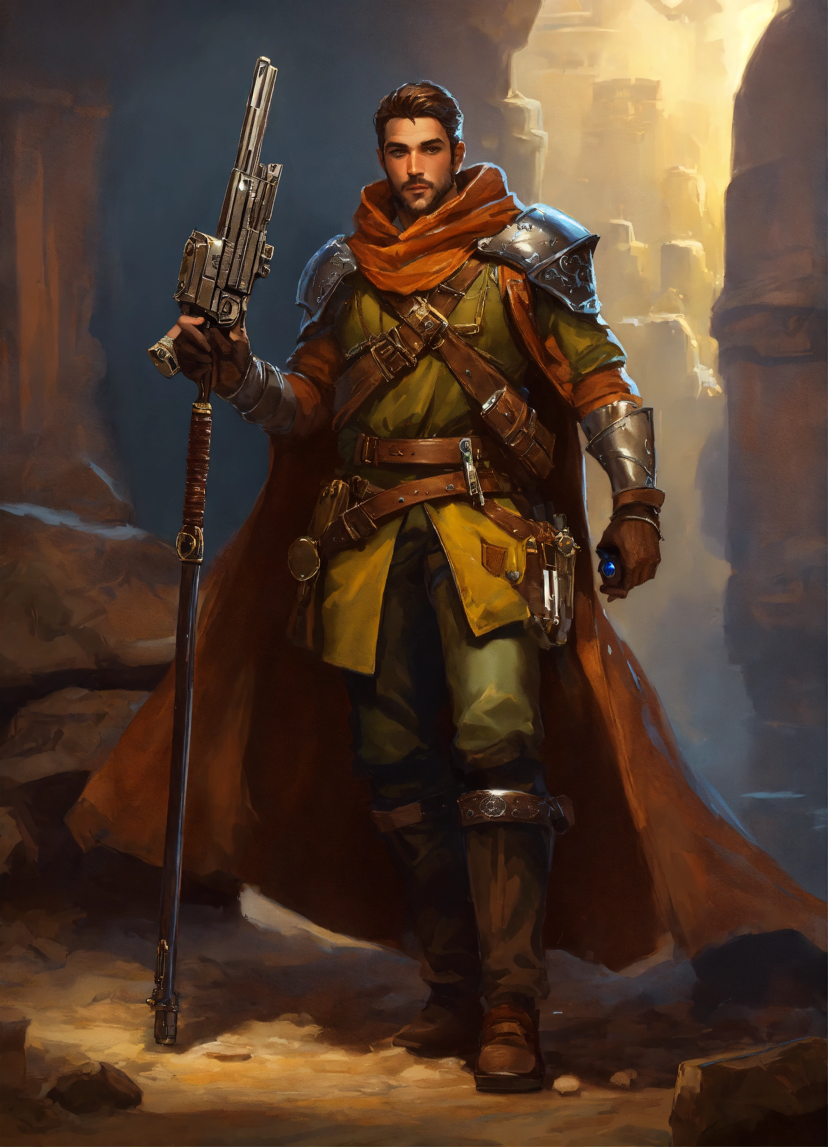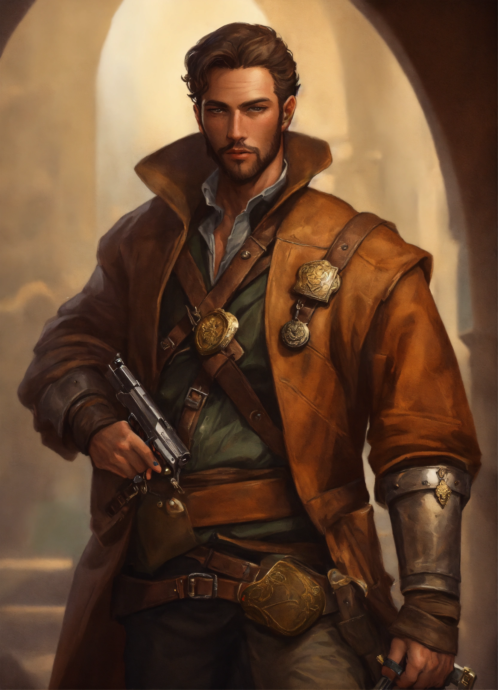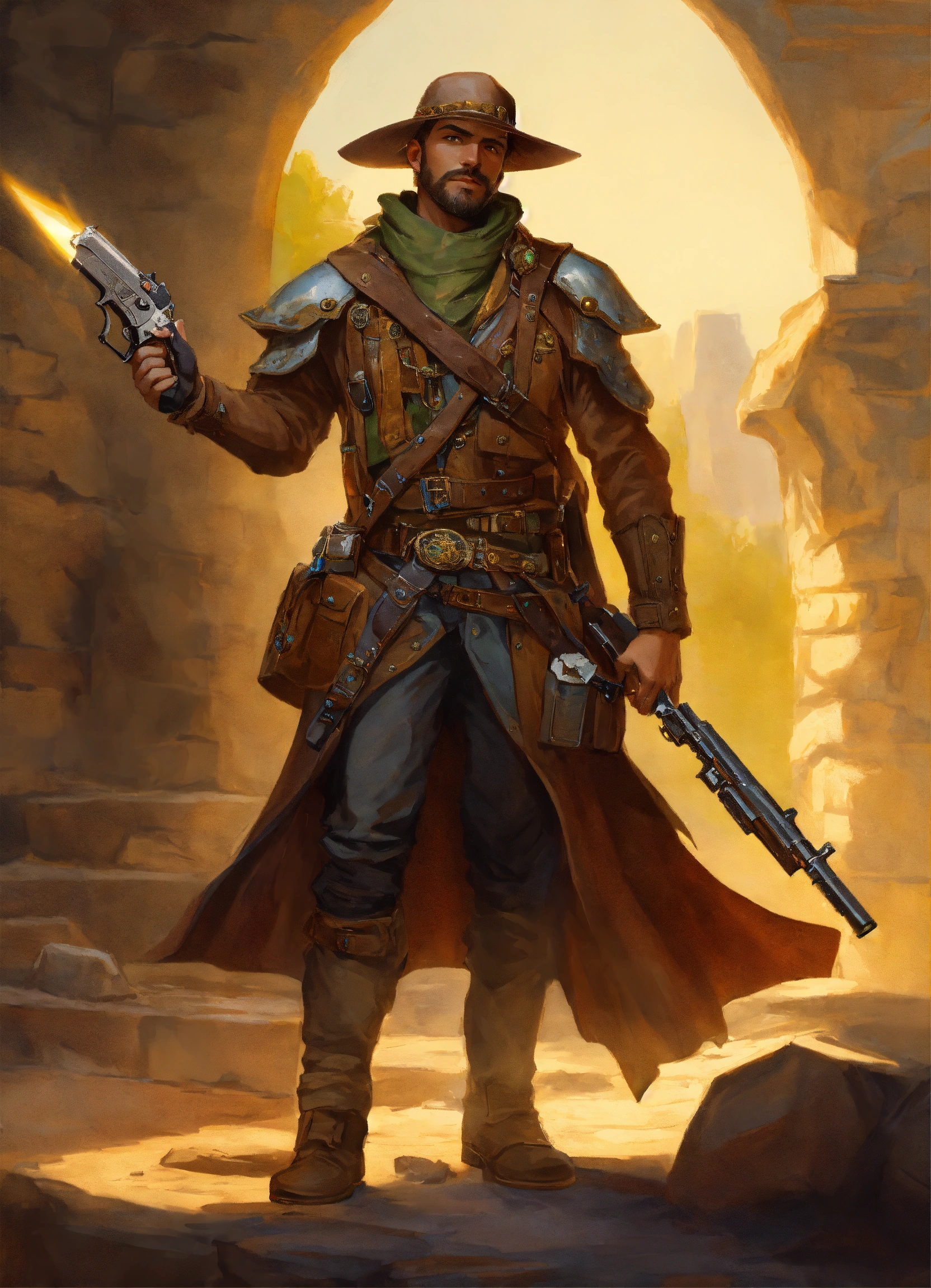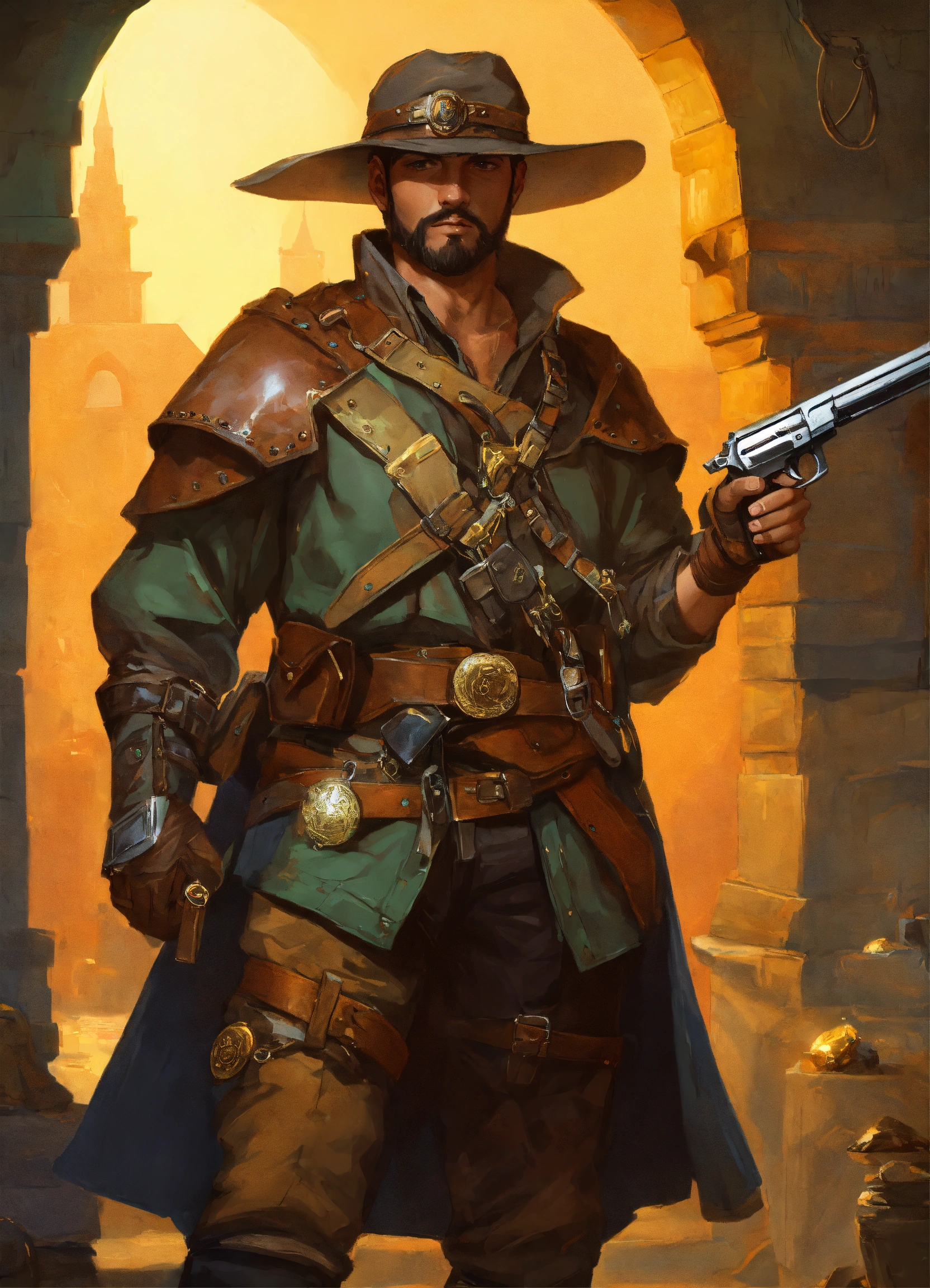 Male human bounty hunter treasure seeker, with a pistol in his right hand, fantasy, fiction, d&d, renaissance era