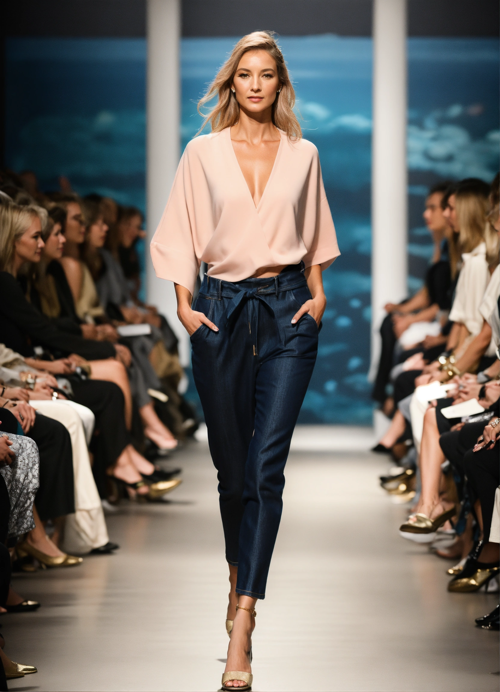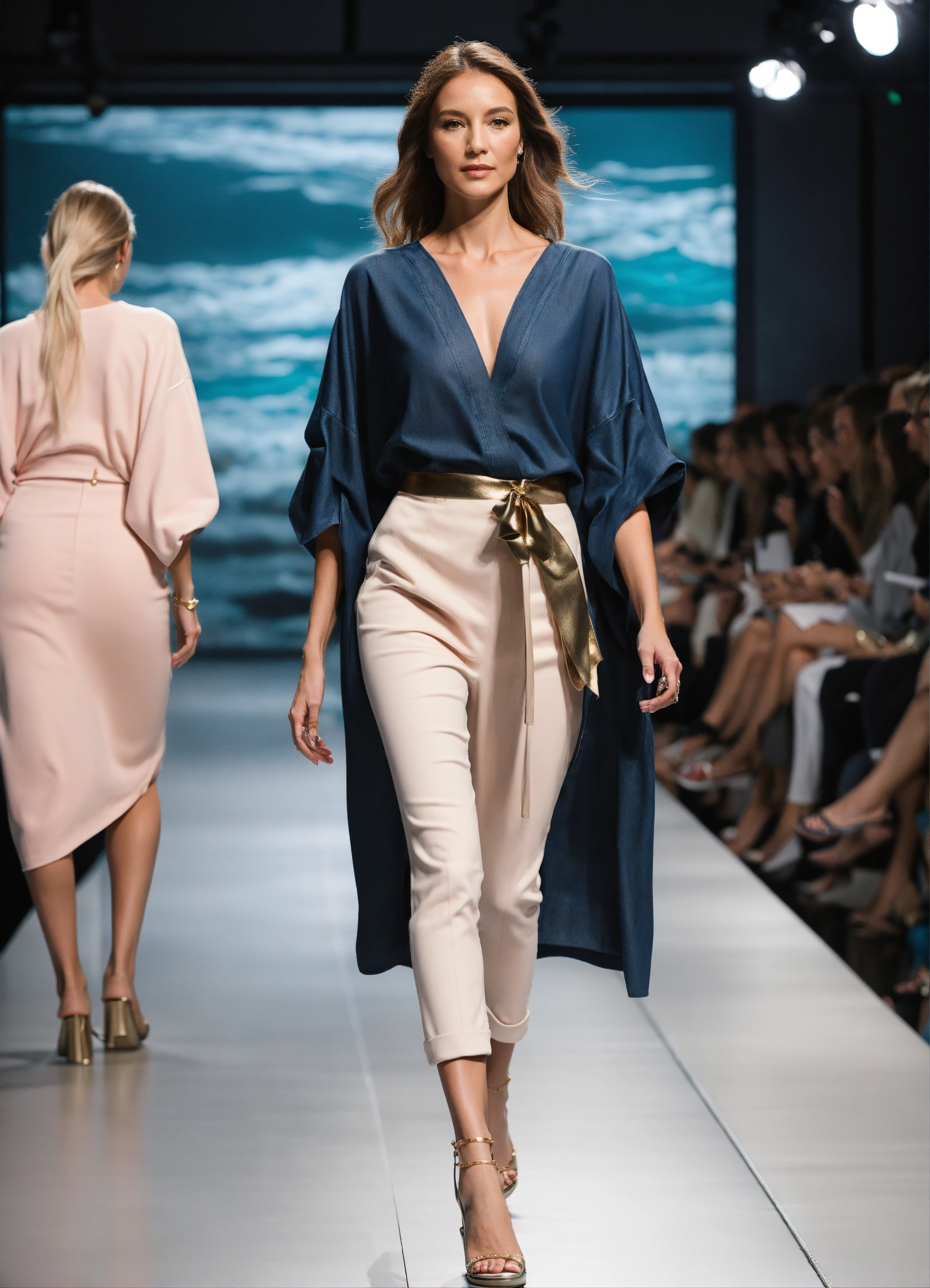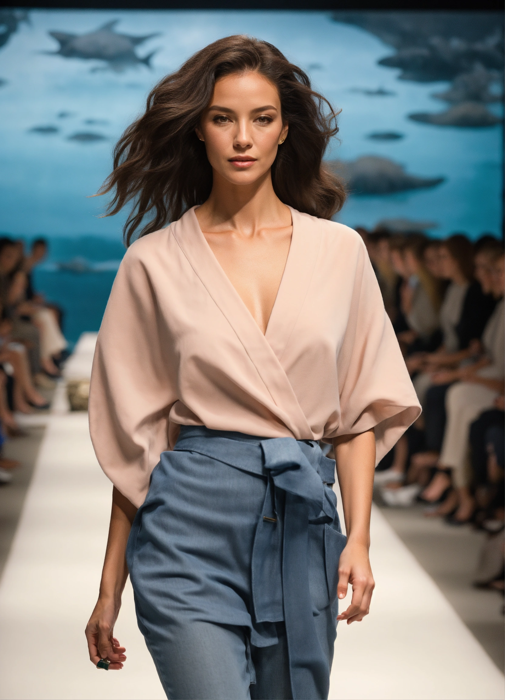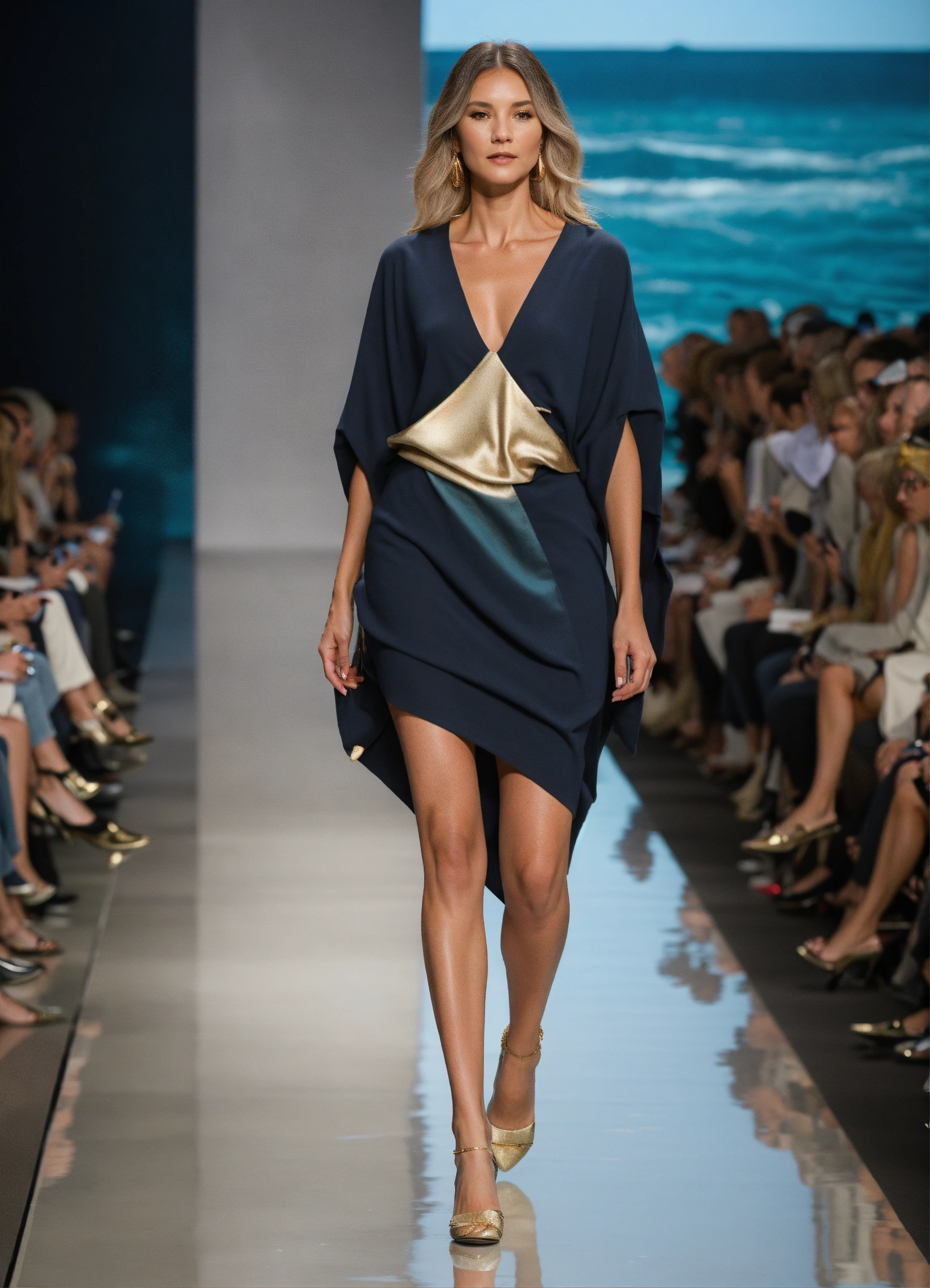 3d realistic photo of female oceanographer walking runway during marine fashion week wearing dolman sleeve donna karan oceanographers fashion in black, white, blush, grey, beige, stone, gold, denim, blue, teal walking a runway in a marine lab