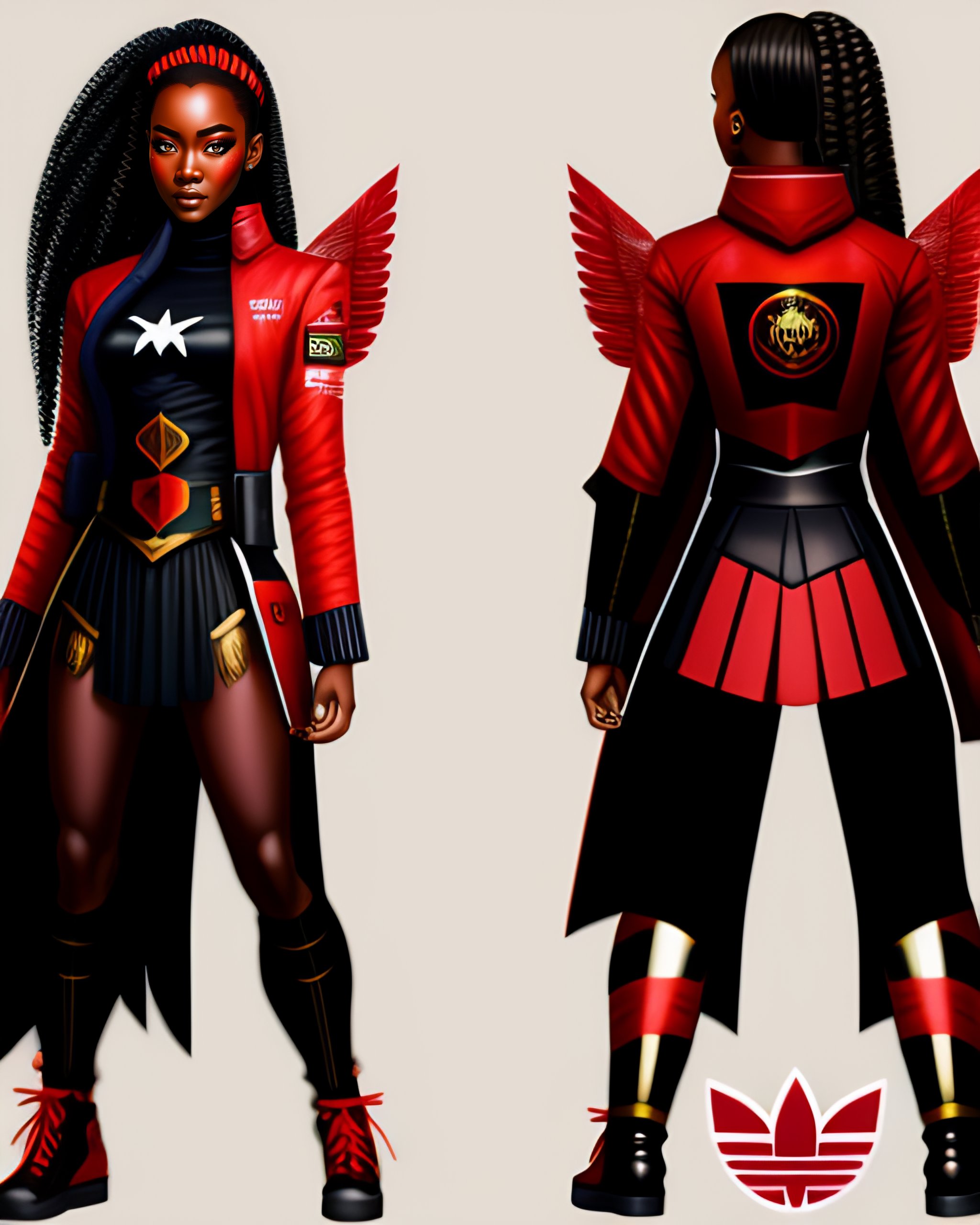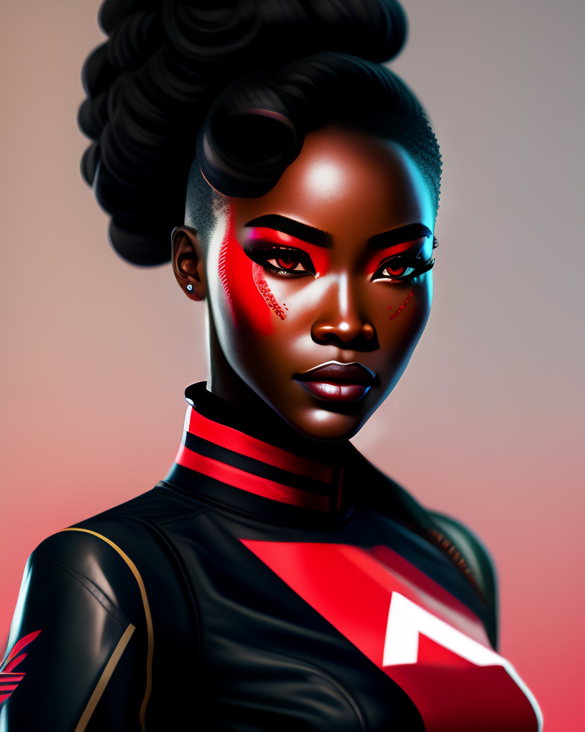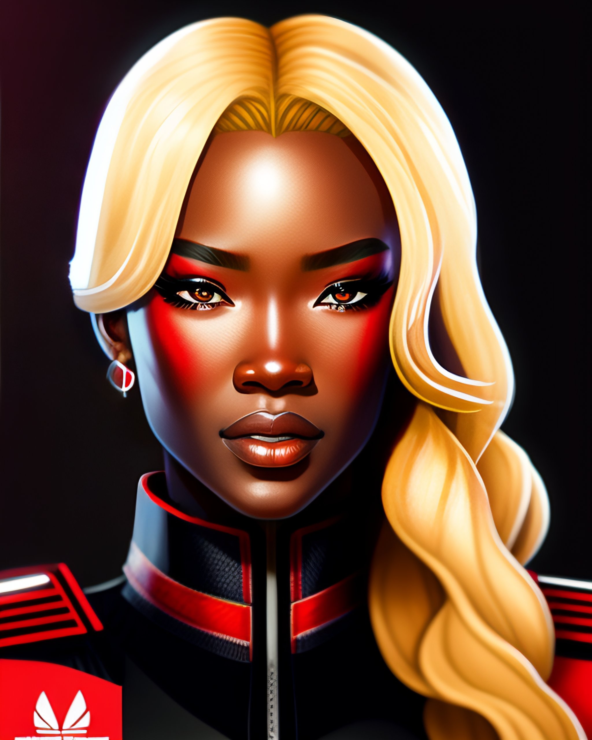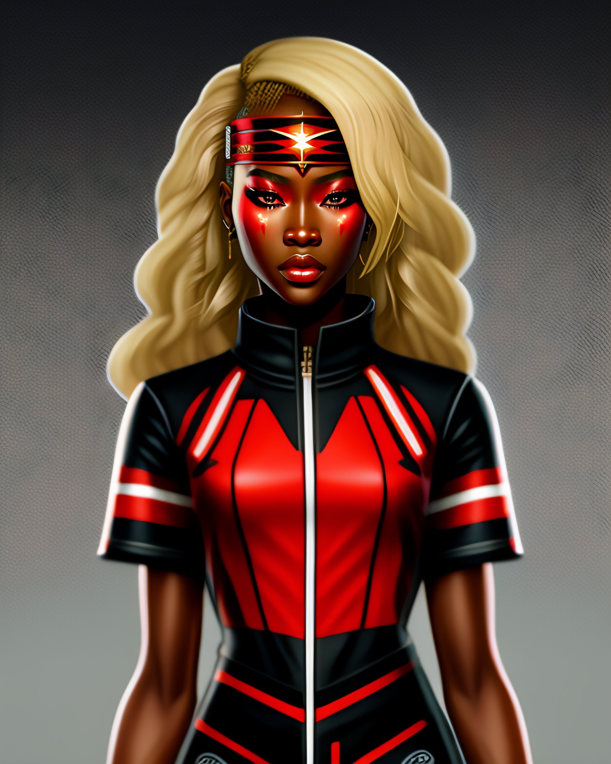 Mobile legends valorant rough smooth 8k artstyle of portrait ((beautully asian red eyes)), (long blonde hair), and (smooth highly detail dark brown papua new guinea skin woman), with categories of cannon power, photorealism of upper body and stomach woman, charliebo artstyle, sketch ink artstylemobile legends valorant rough smooth 8k artstyle of portrait ((beautifully asian red eyes)), (long blonde hair), and (smooth highly detail dark black papua new guinea skin woman), with categories of cannon power, photorealism of upper body and stomach woman, charliebo artstyle, sketch ink artstyle, a potrait full body model, 4k, potrait of wonder woman, photorealism character of mobile legend by silvia.gef on tiktok, dark shading cyborg red pupil eyes, black red eyes dot, dark black skinniest nigeria people, call of duty dlc character, cyberpunk world theme, beauty hair blonde with a gradient black color, red jacket made by adidas company, blue skirt made by malaysia, gucci logo black shirt