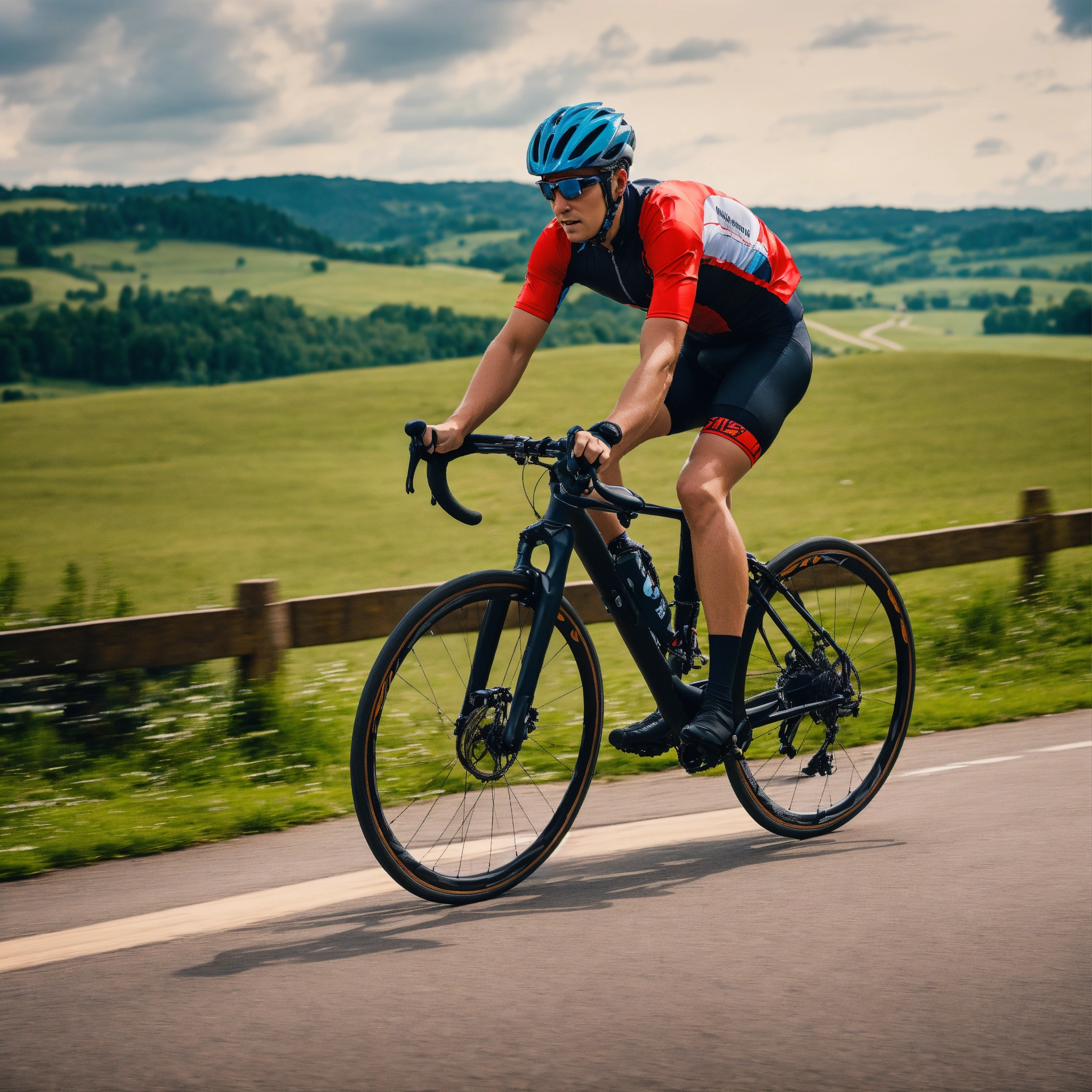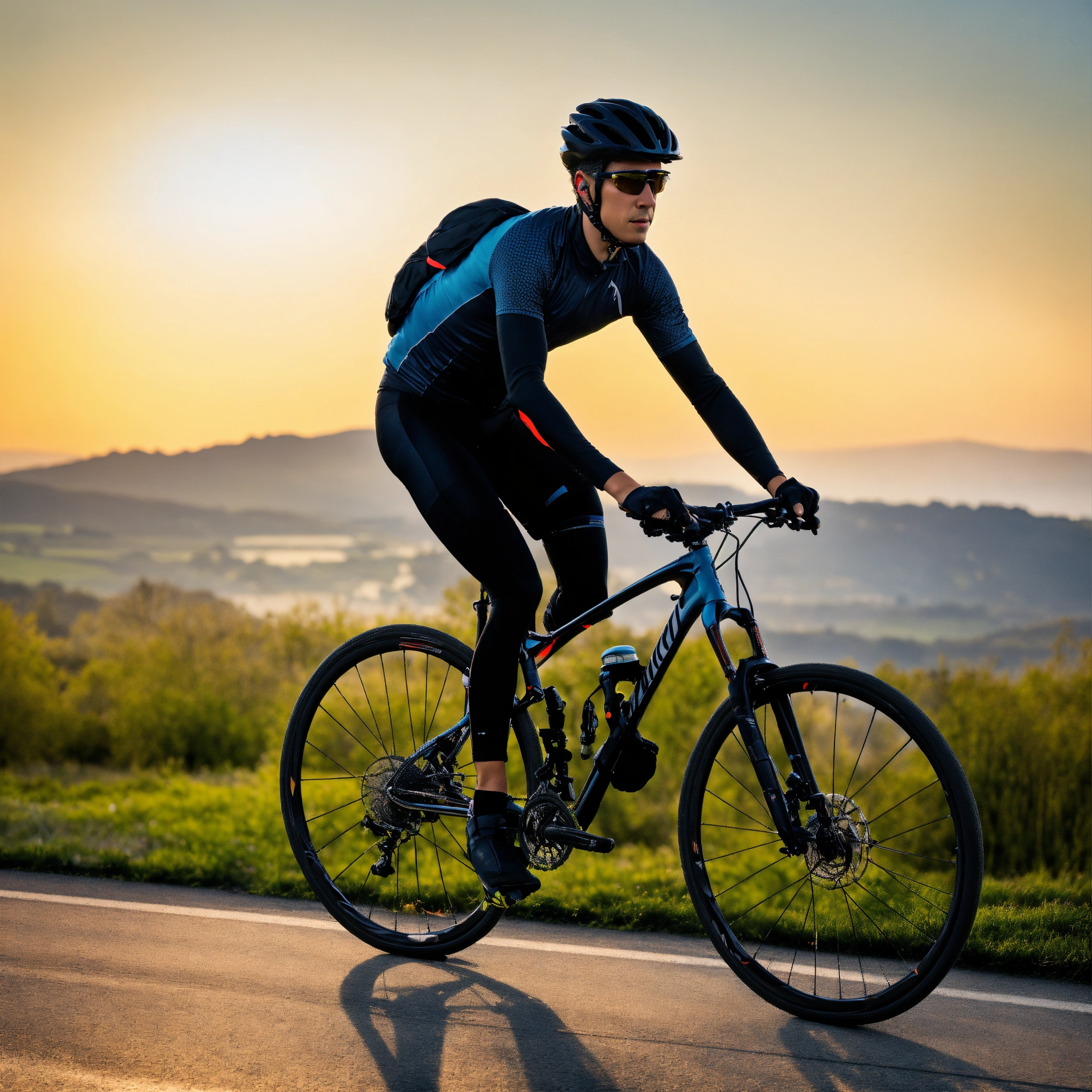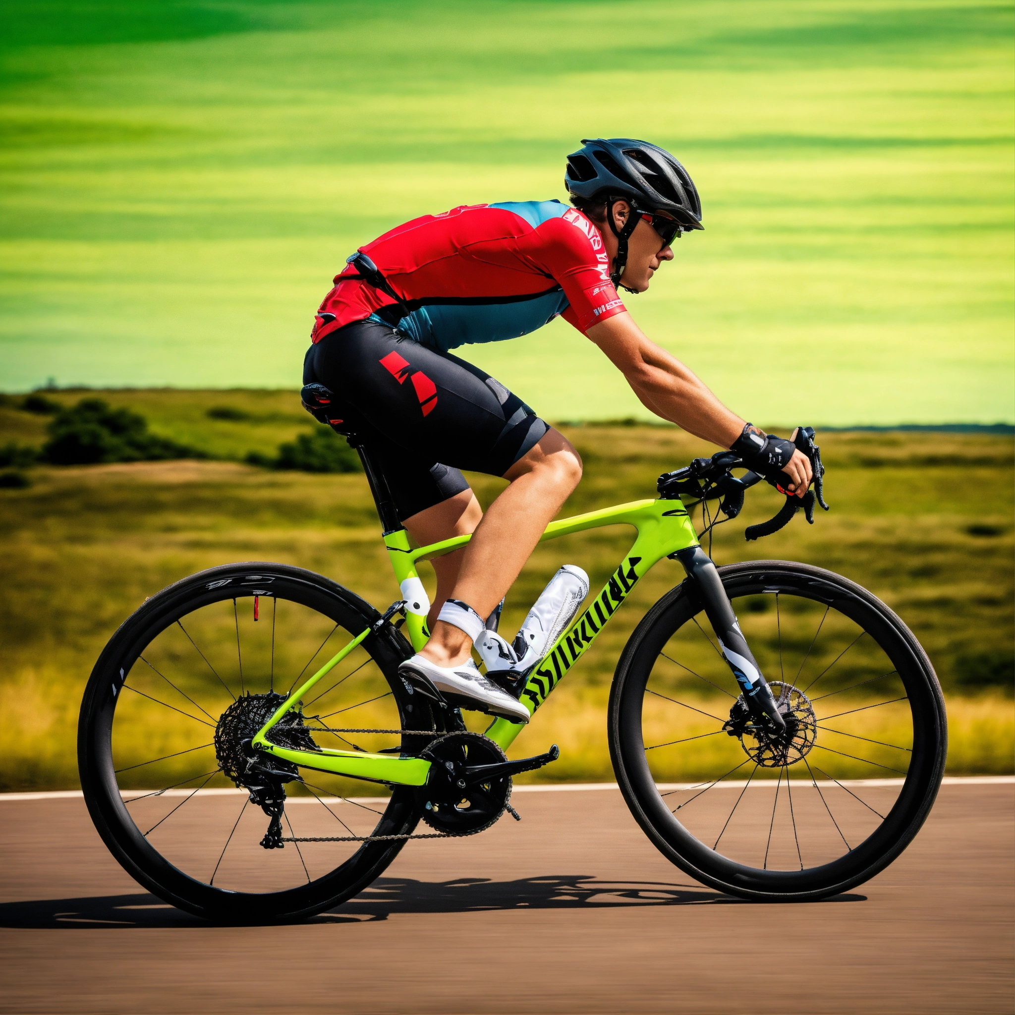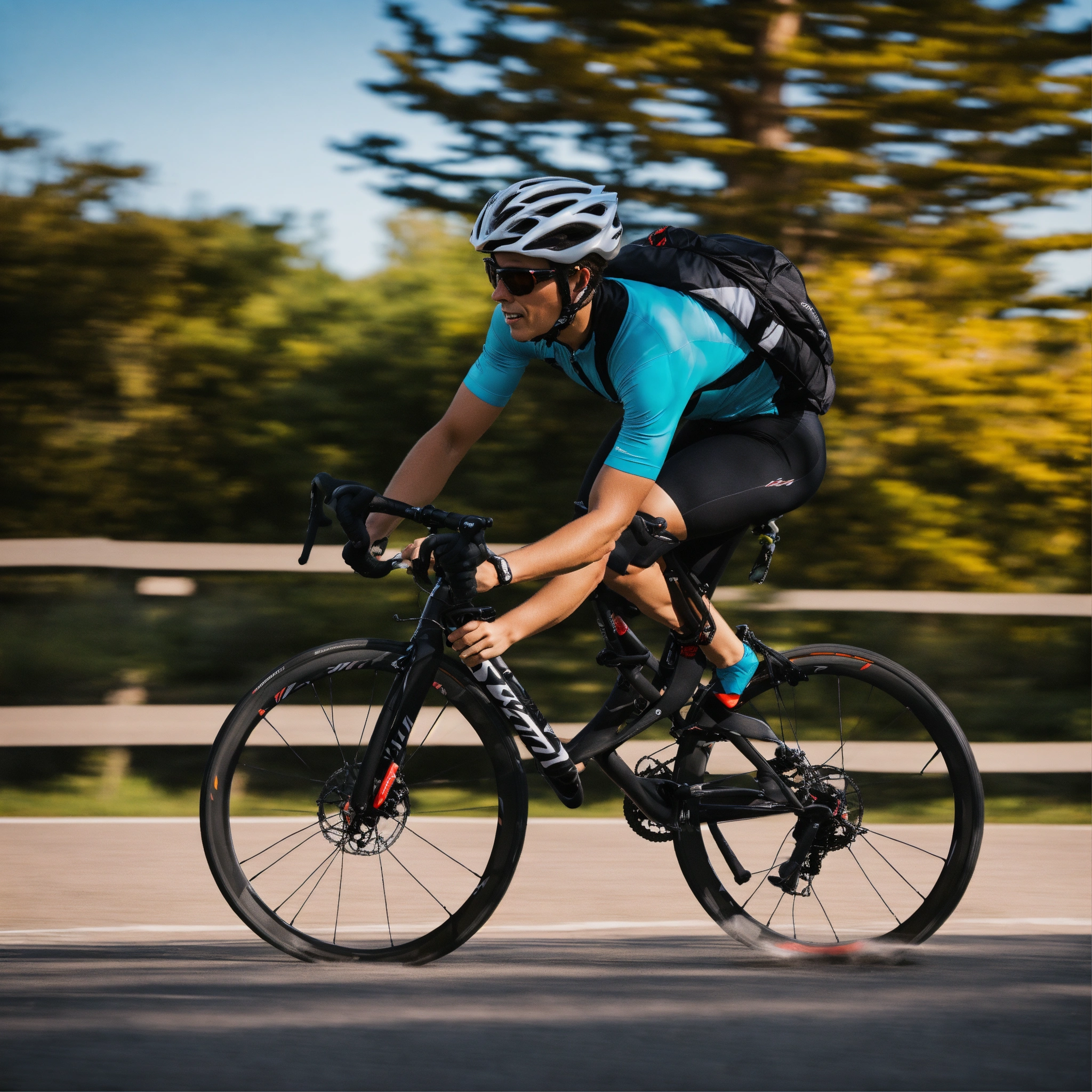 A photo of a cyclist riding a specialized bicycle, the cyclist is wearing a helmet and riding gear, the bicycle is new and in good condition