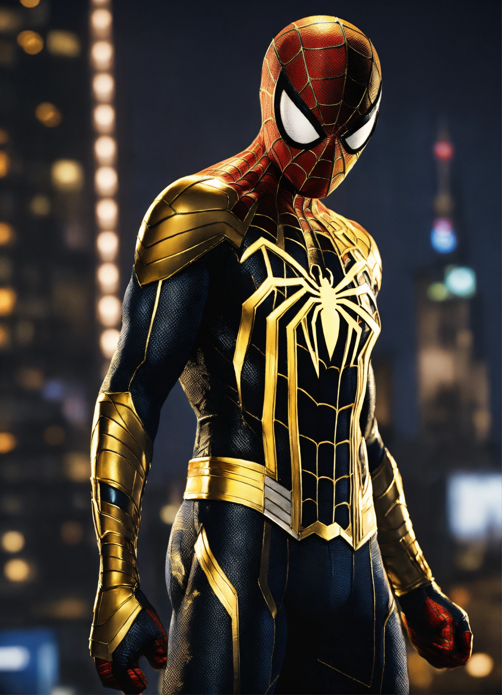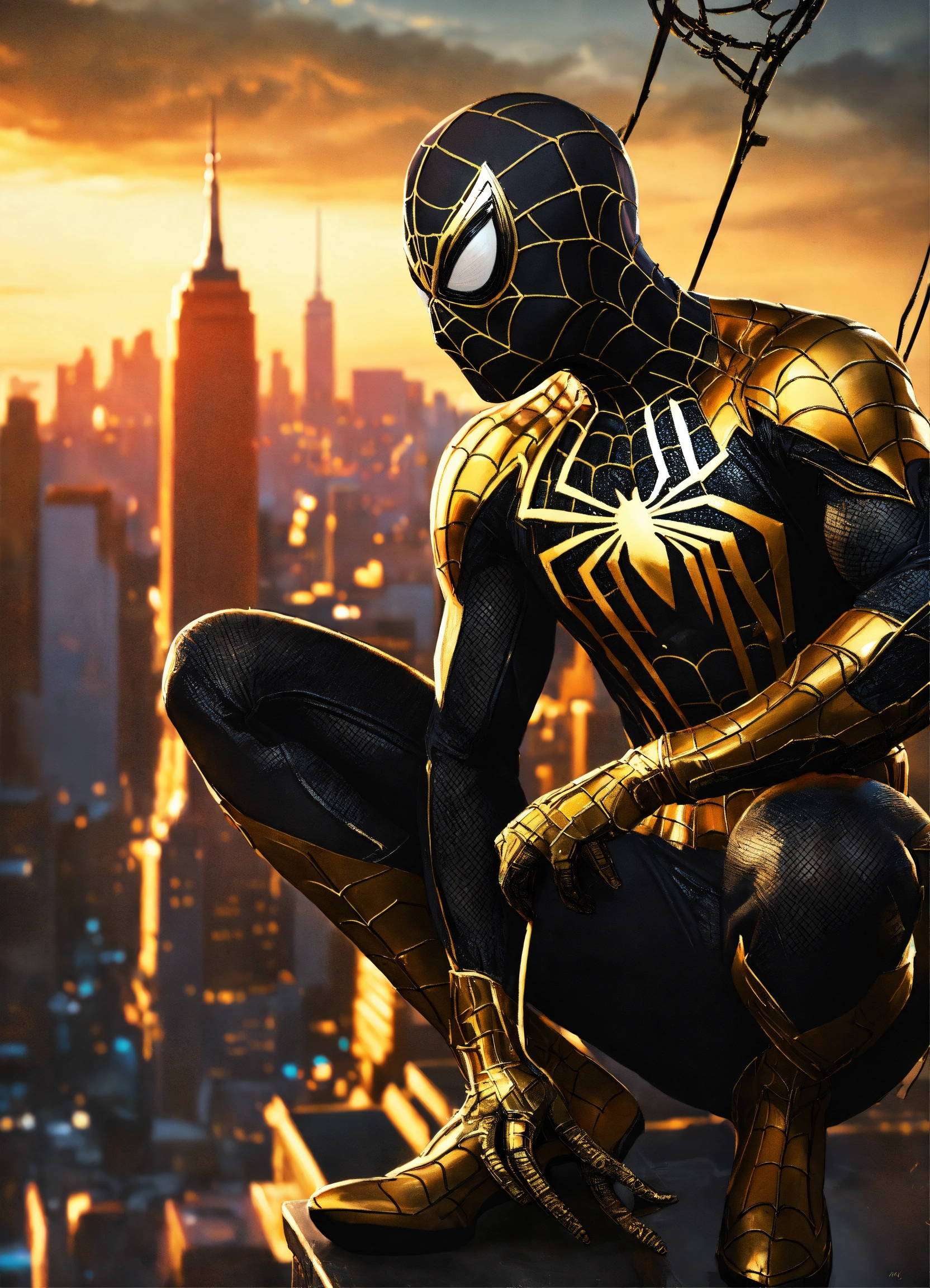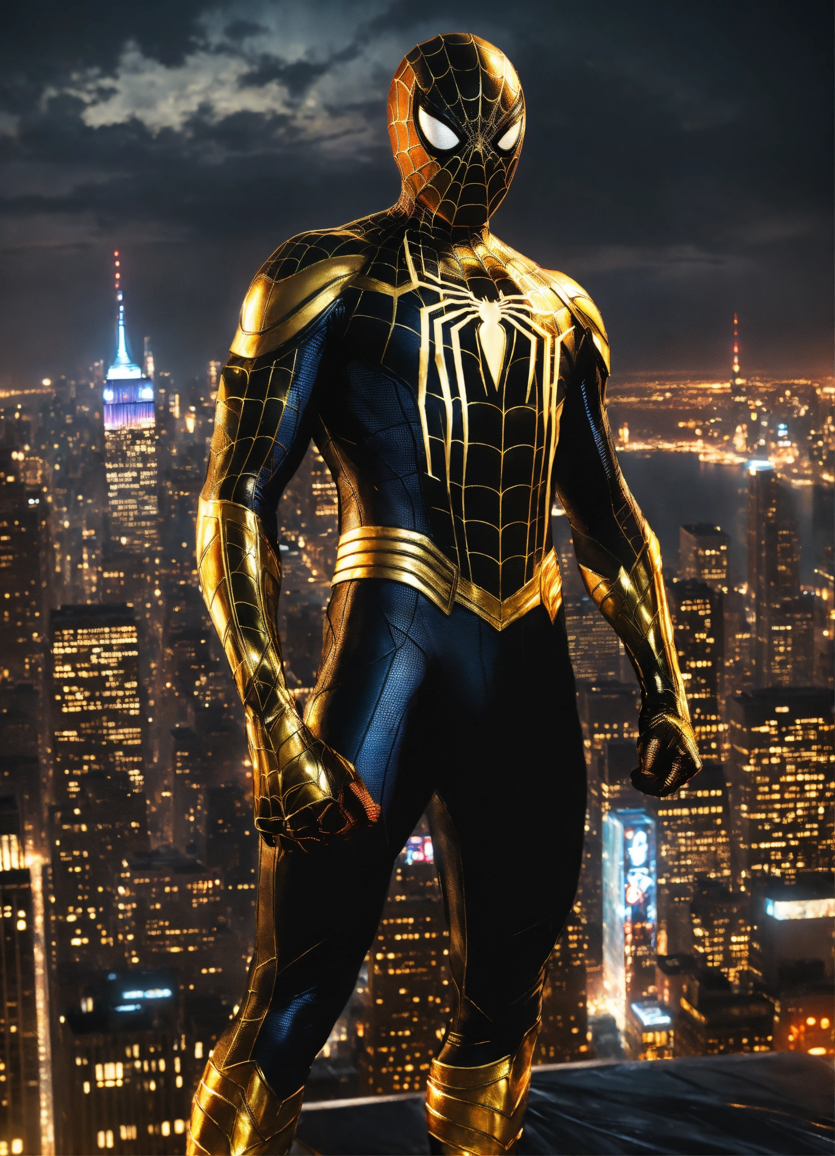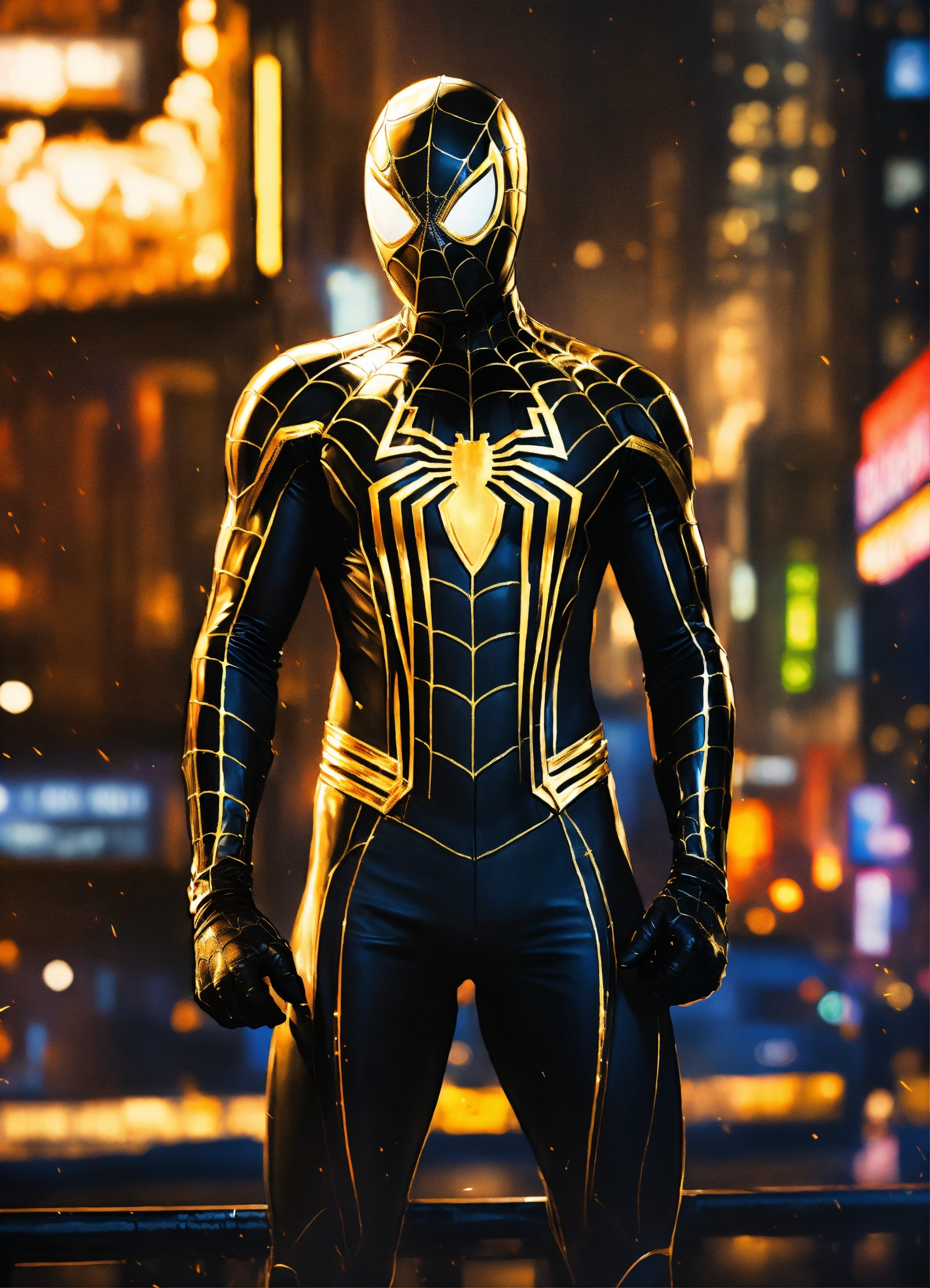 Portrait painting of spider-man wearing a (stunning black and gold suit), ultra realistic, concept art, intricate details, eerie, highly detailed, photorealistic, octane render, 8k, unreal engine. art by artgerm and jim lee, nyc in the background, full body, night time