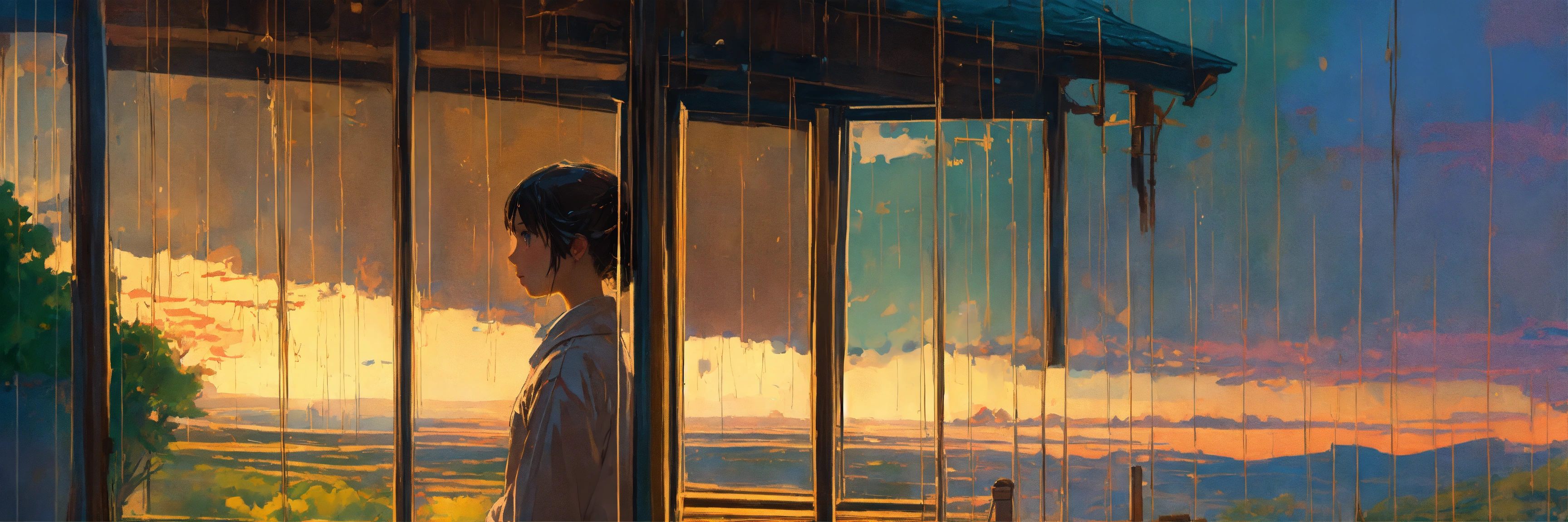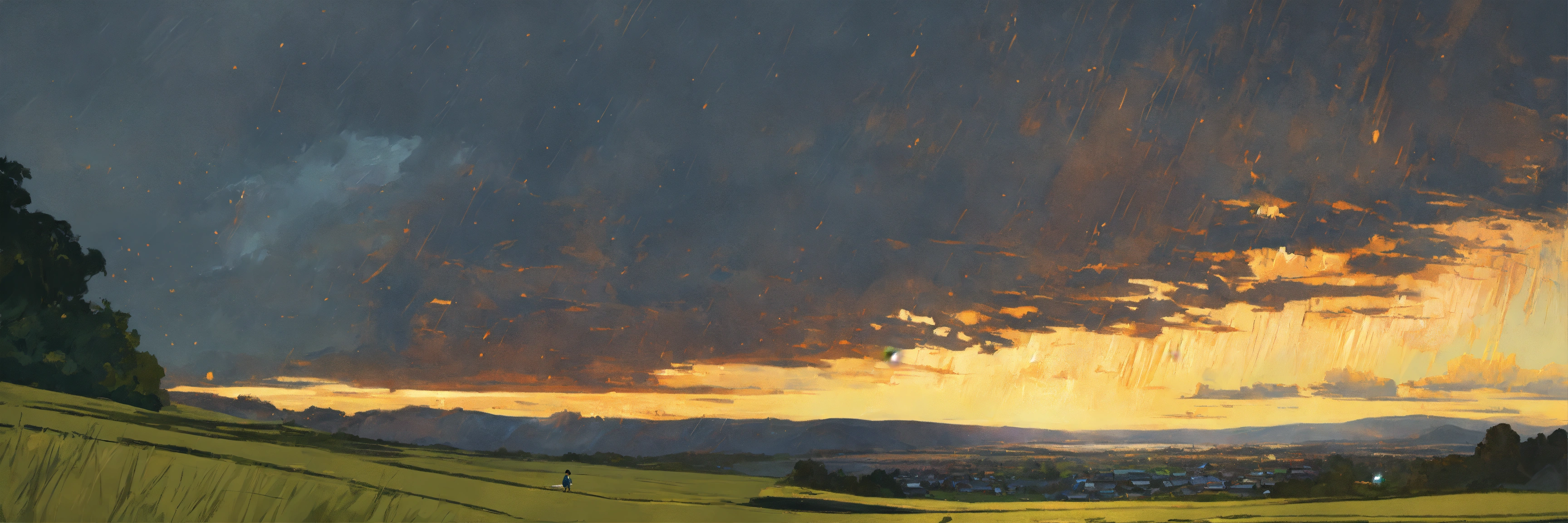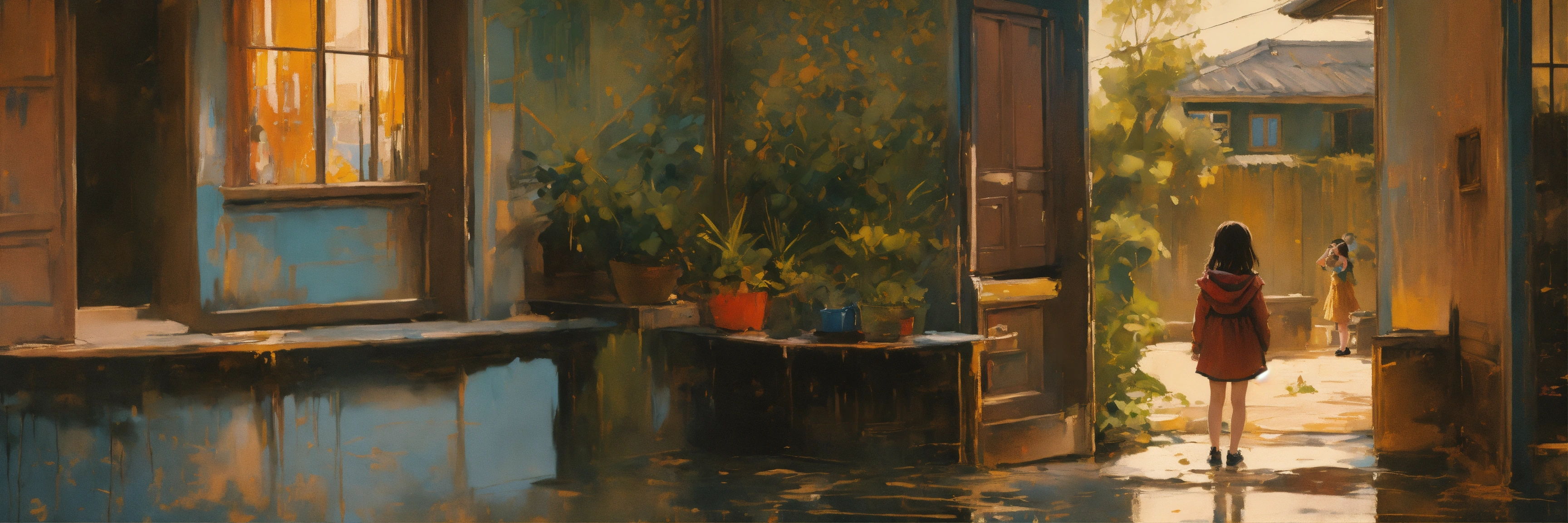 Oil paint, strong brush strokes, paint splashes. an impressive scene of a little girl looking at the rain from the door of her house dressed in rags. panoramic view, jeremy mann, carne griffiths, robert oxley. rich and deep colors. image in cell shaded layers. beautiful face, perfect anatomy, perfect eyes, detailed eyes, golden ratio, award-winning, professional, highly detailed, focused, symmetry, painted, intricate, volumetric lighting, magnificent, masterpiece, sharp focus, depth of field, perfect composition, award winner, 8k high resolution, pixiv trends, art station, acrylic paint, pixiv trends fanbox, palette and brush strokes, makoto shinkai style jamie wyeth james gilleard edward hopper greg rutkowski studio ghibli genshin impact cinematic, photo with canon eos 5d mark iv, cinematic, realistic, black background, photo fusion, sfx photo.