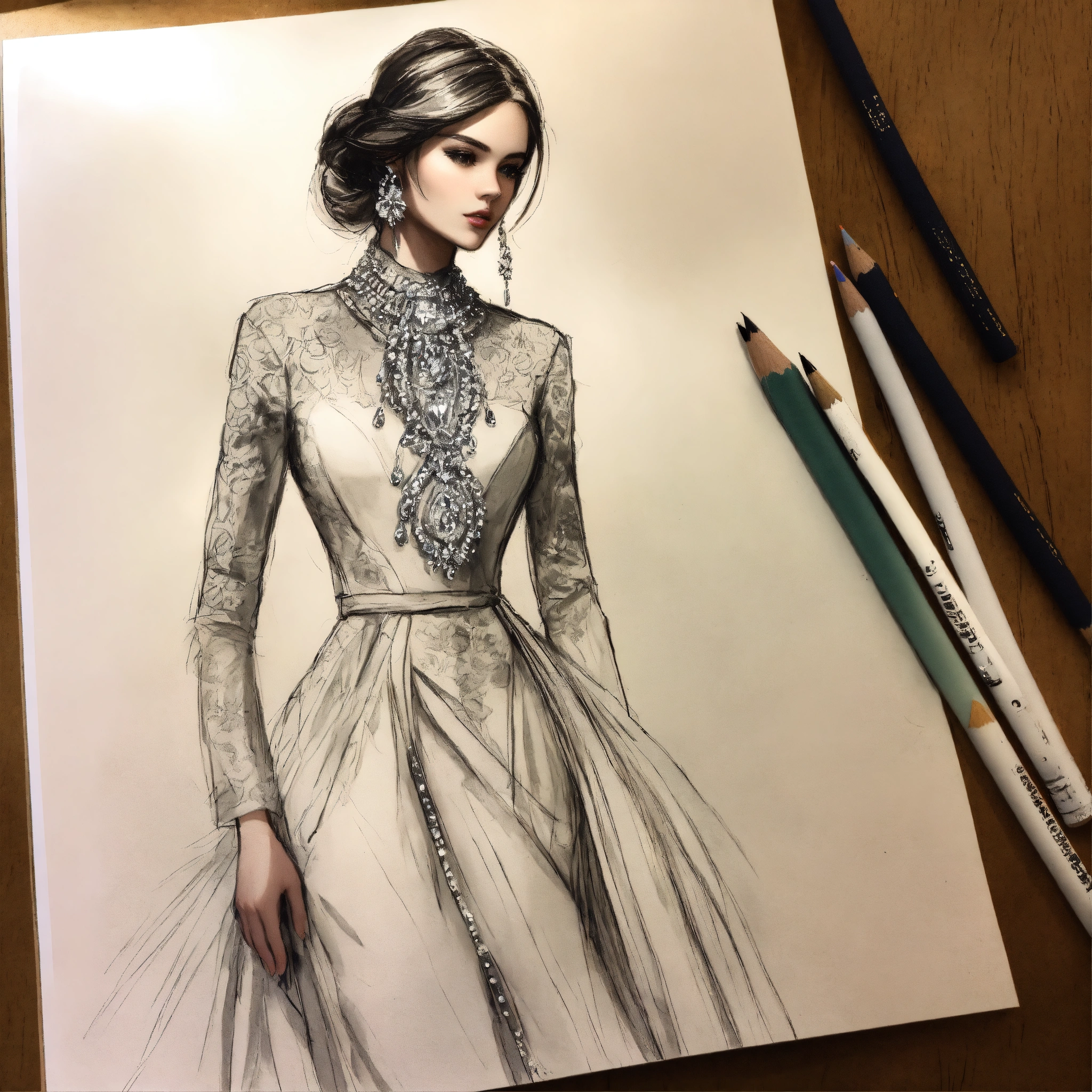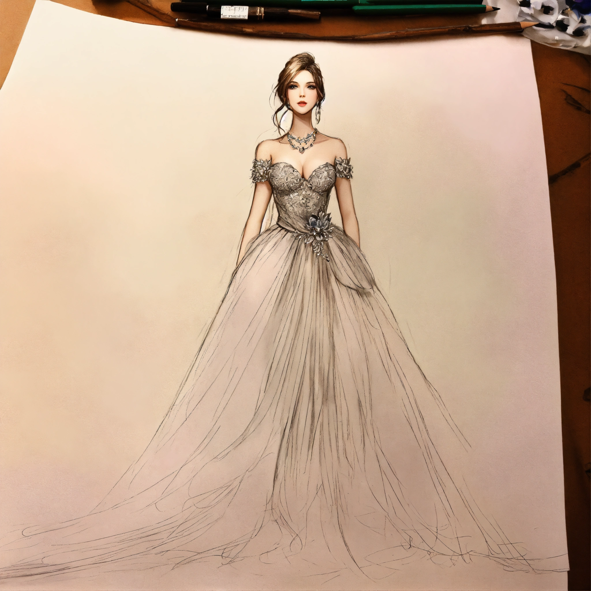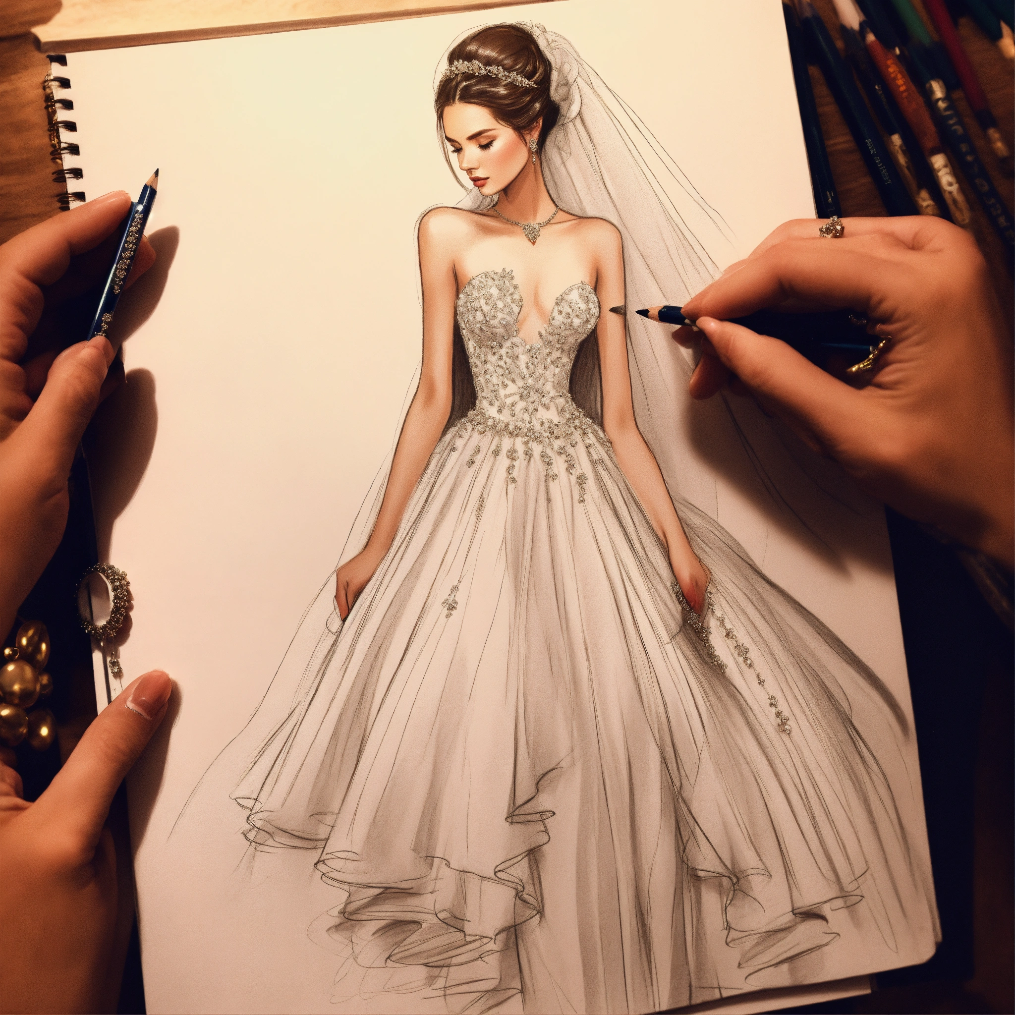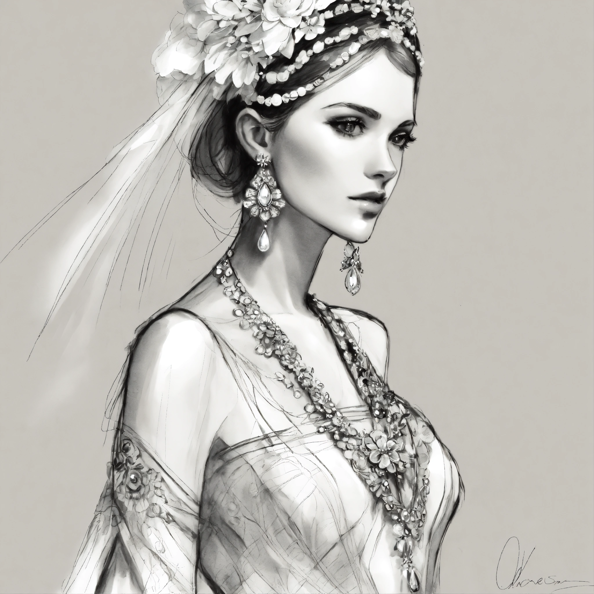 Fashion designer, rough sketches, fashion illustration, pencil sketches rough, faceless model with jewelry, wearing bridal dress, white, on one white page.