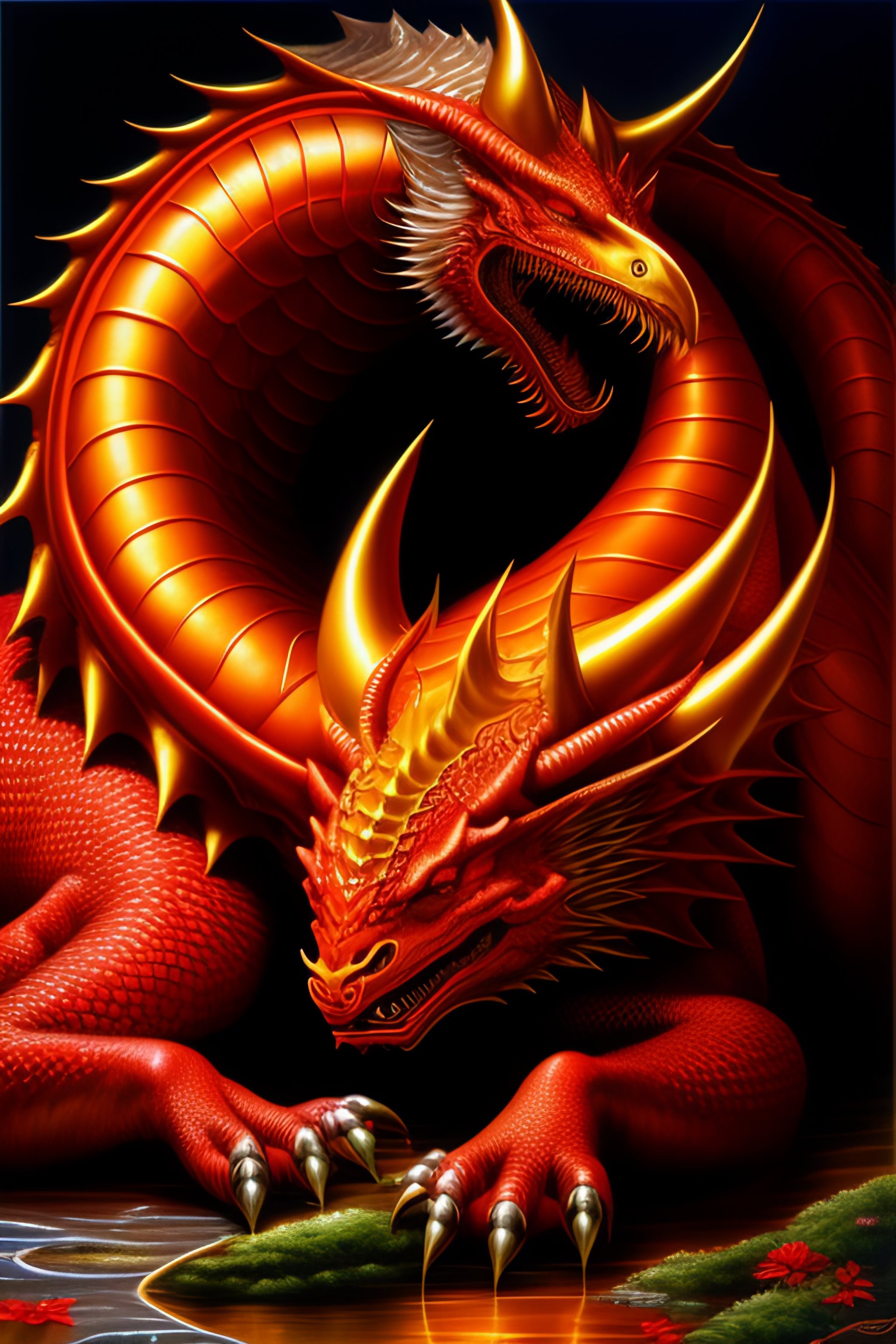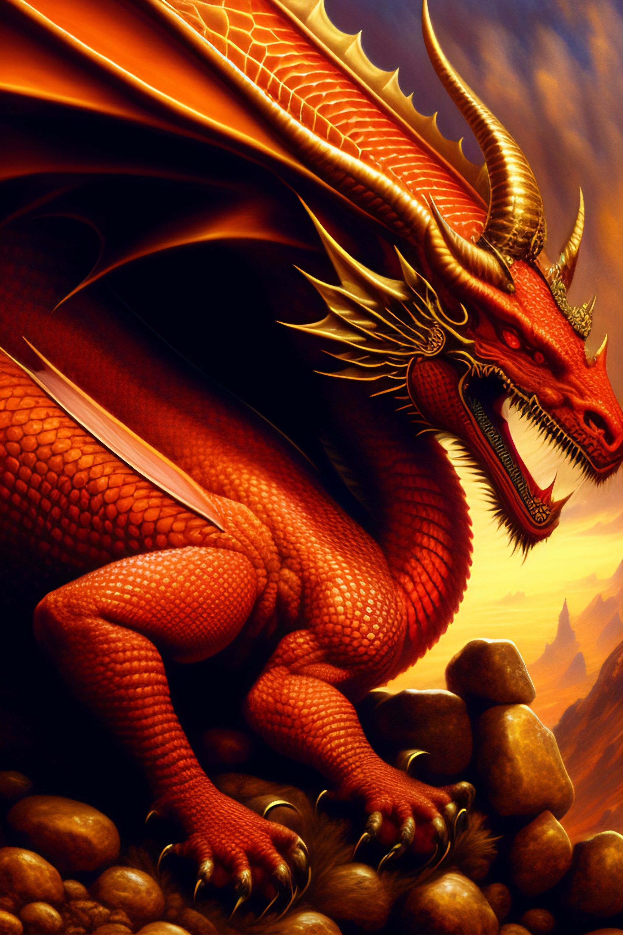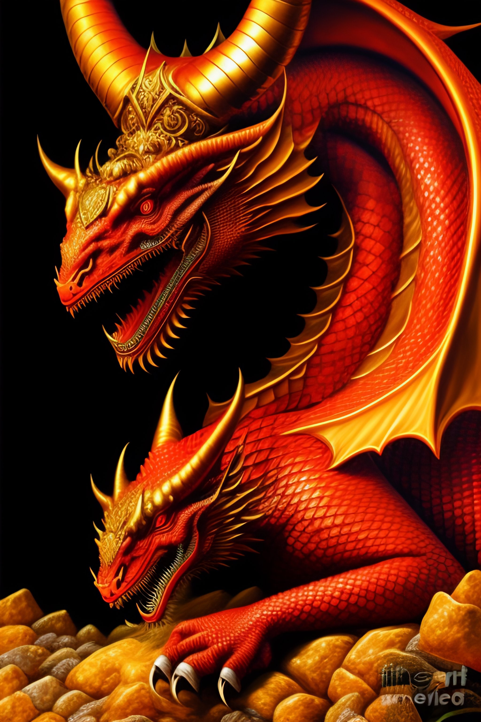 Painting, red dragon lying on pile of gold, highly detailed, fantasy art, 90s style, by adrian smith, by kentaro miura