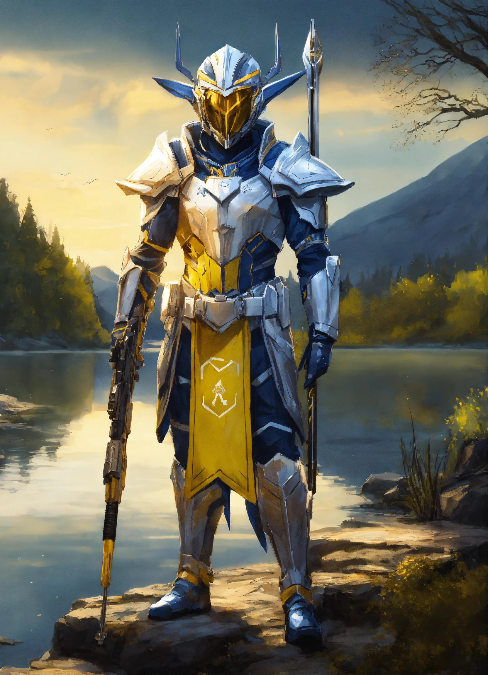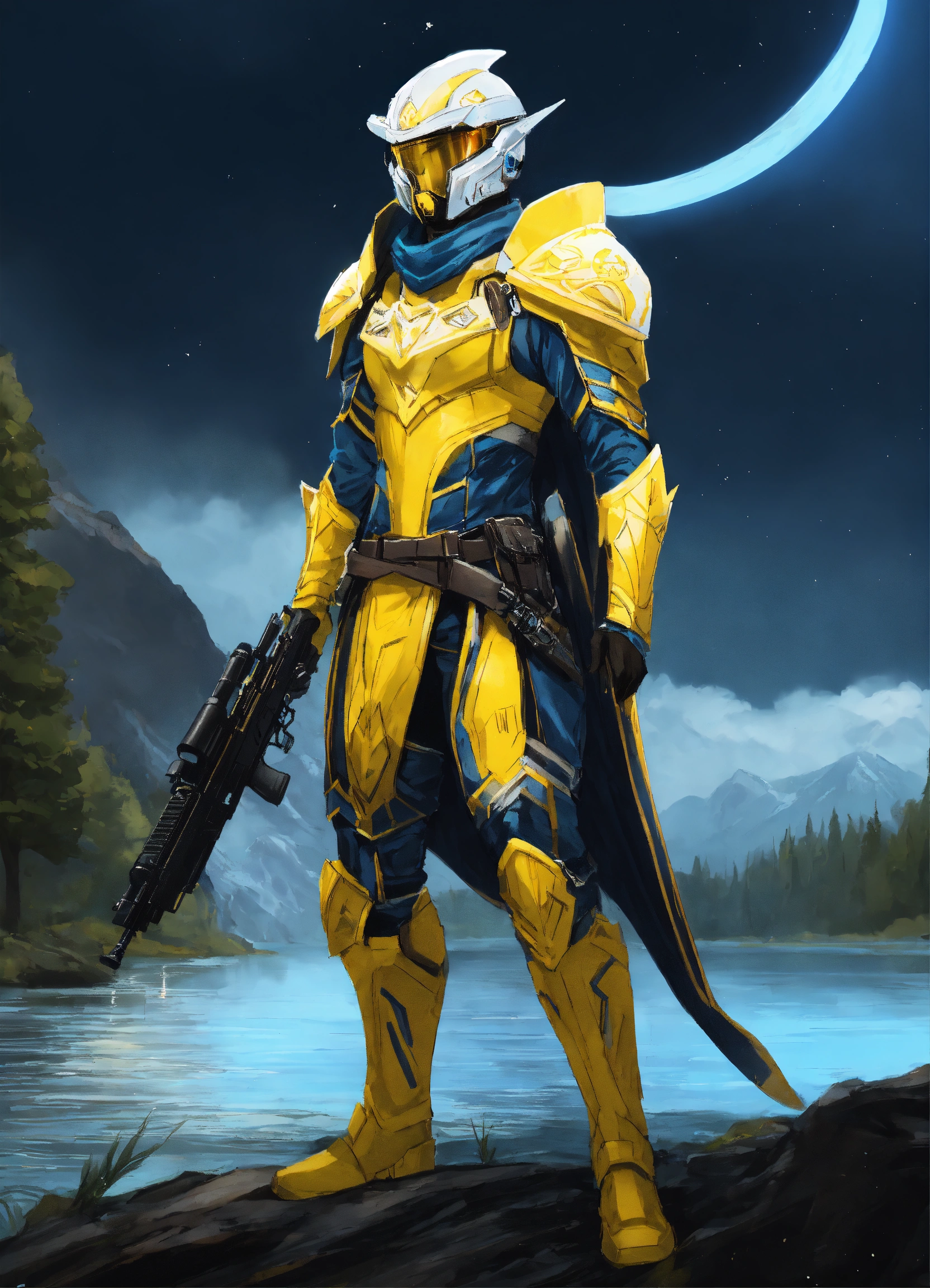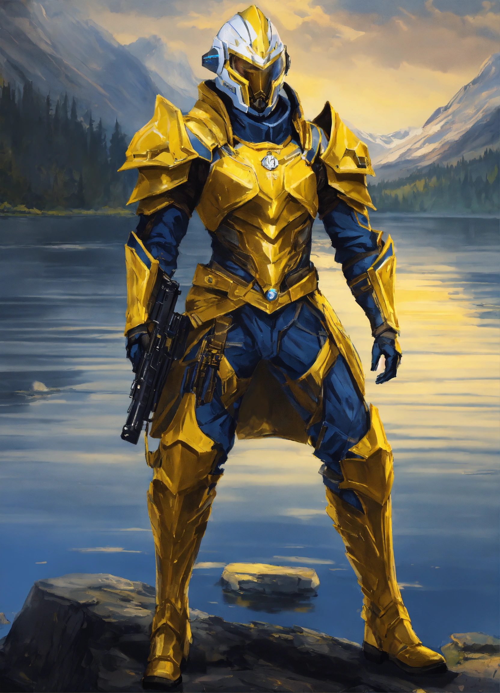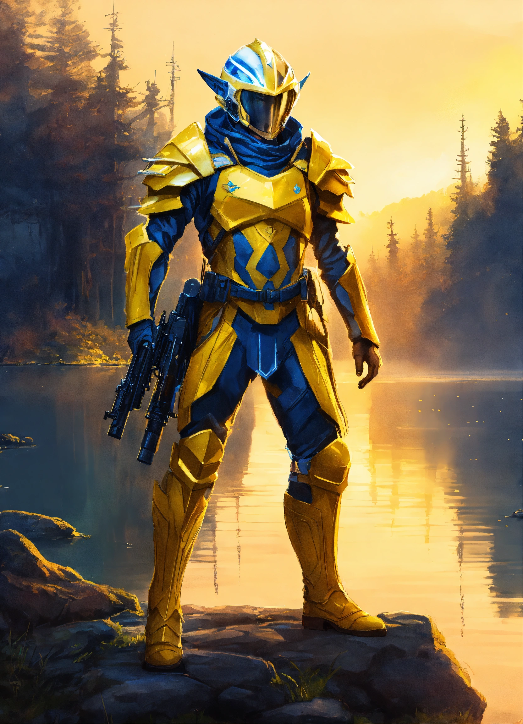 Epic drawing of a full body of a high elf sci fi soldier wearing sci fi elven armor, navy blue and yellow and white sci fi armor and helmet, visor, boots, male, holding a light machine gun, standing by a lake