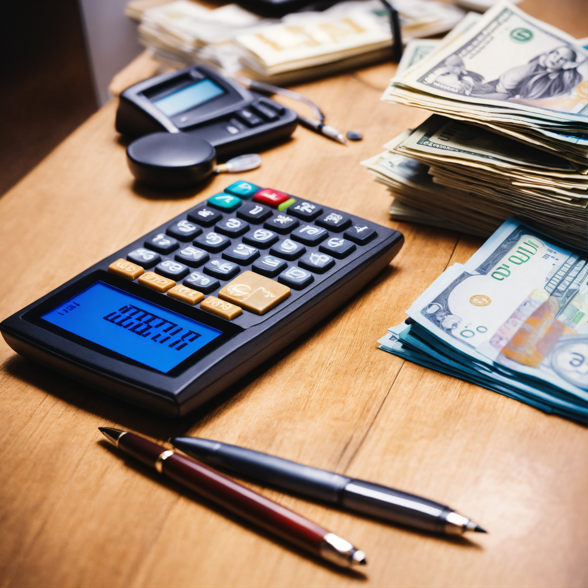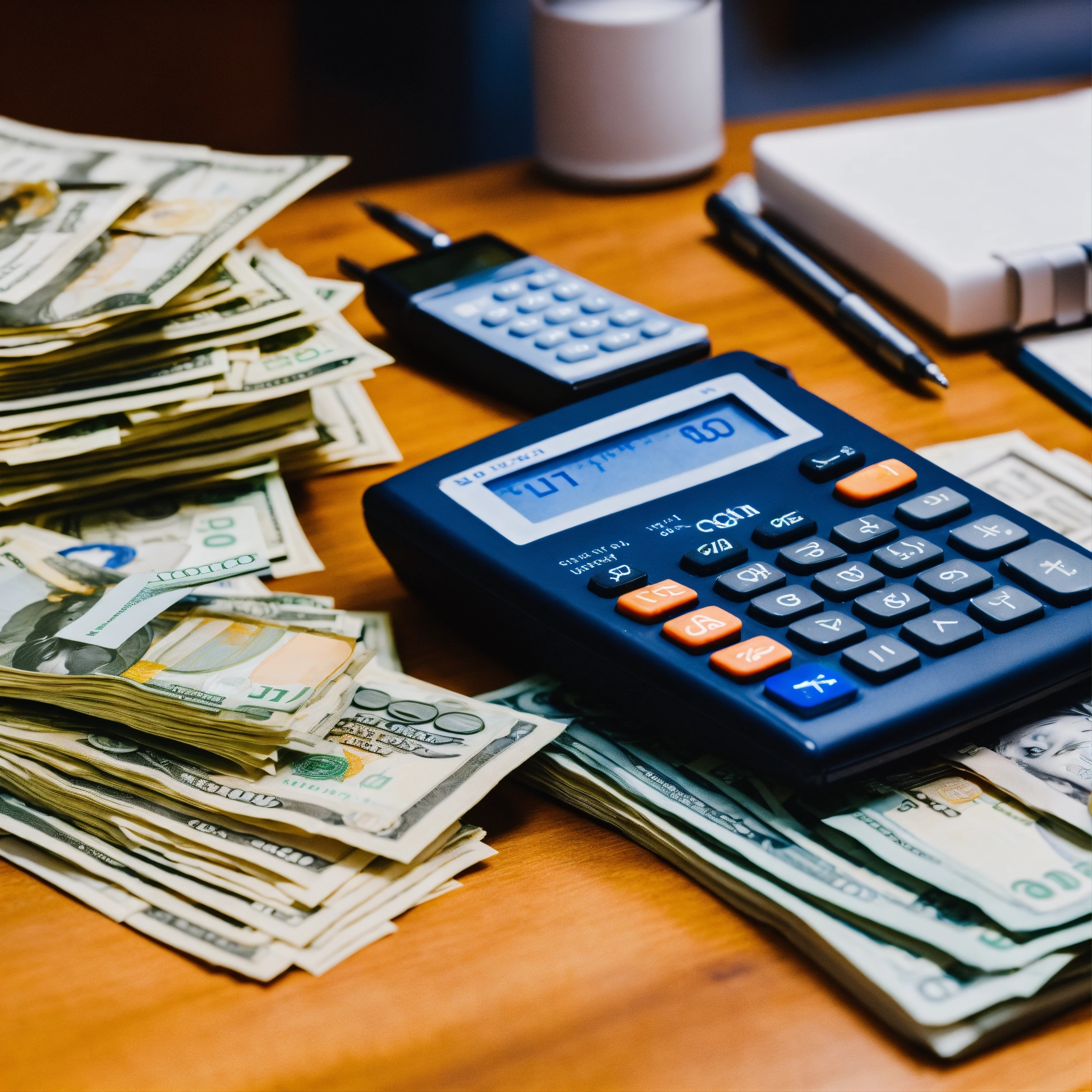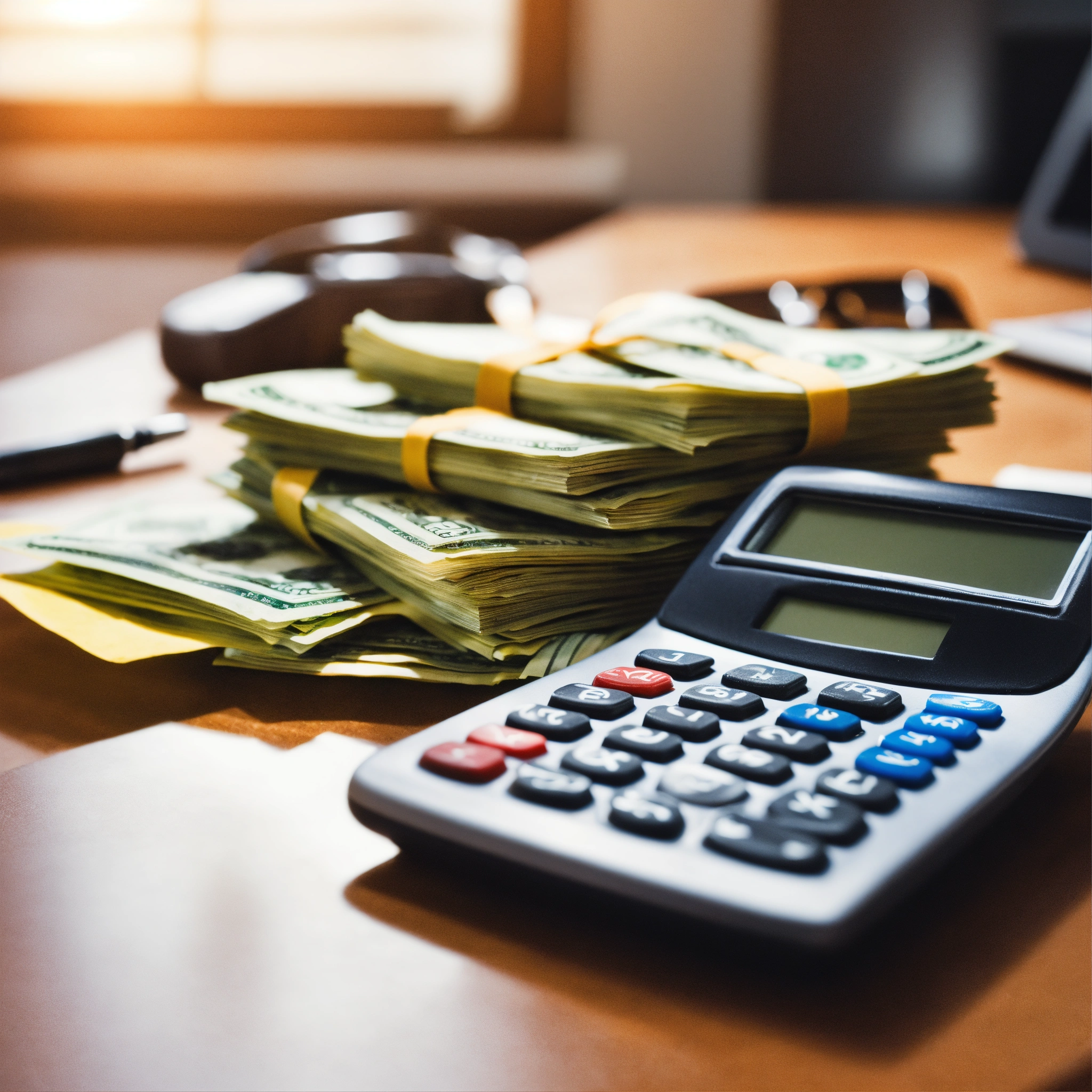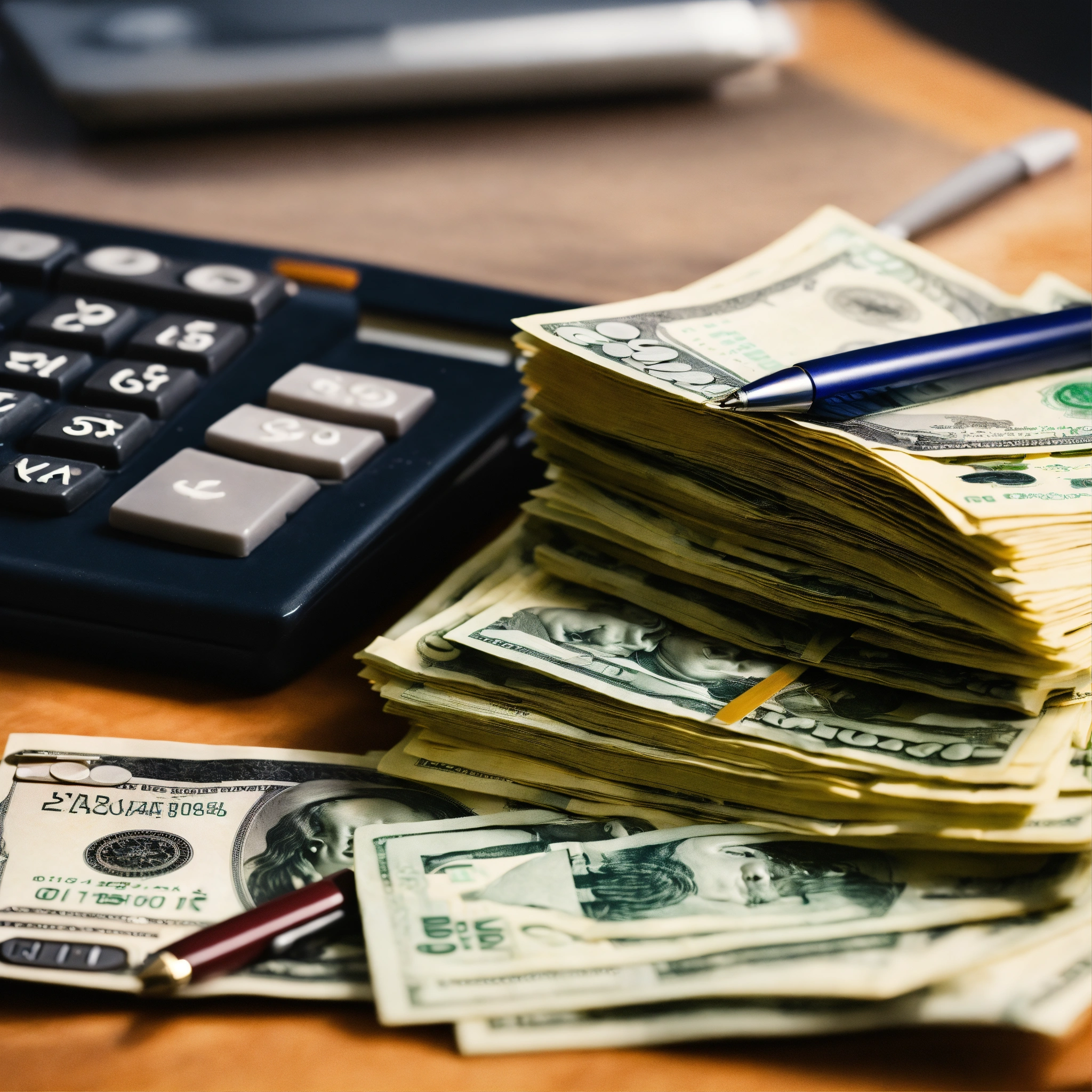 A photo of a stack of cash on a desk, the stack of cash is surrounded by a calculator and a pen, the desk is in a well-lit office