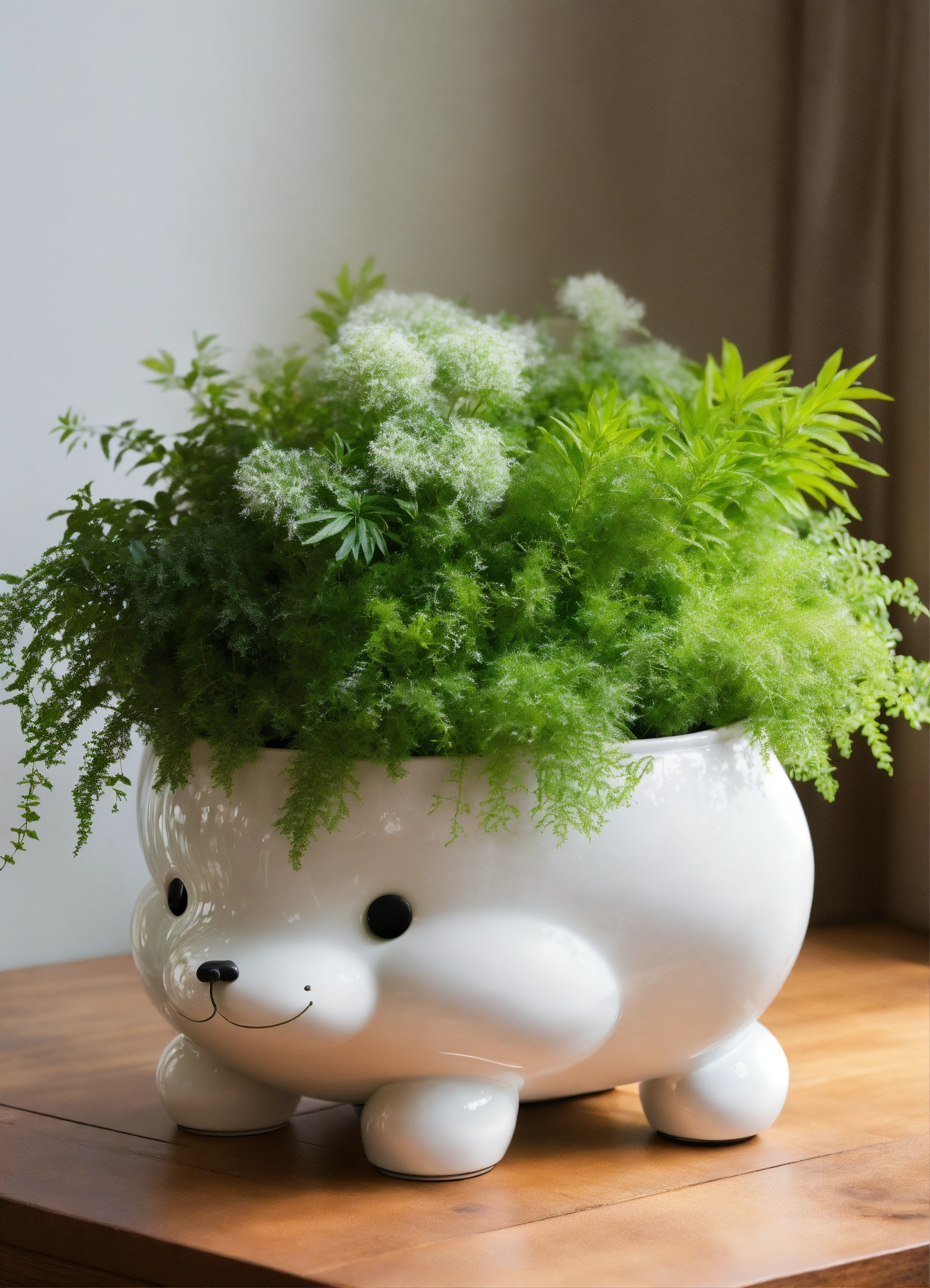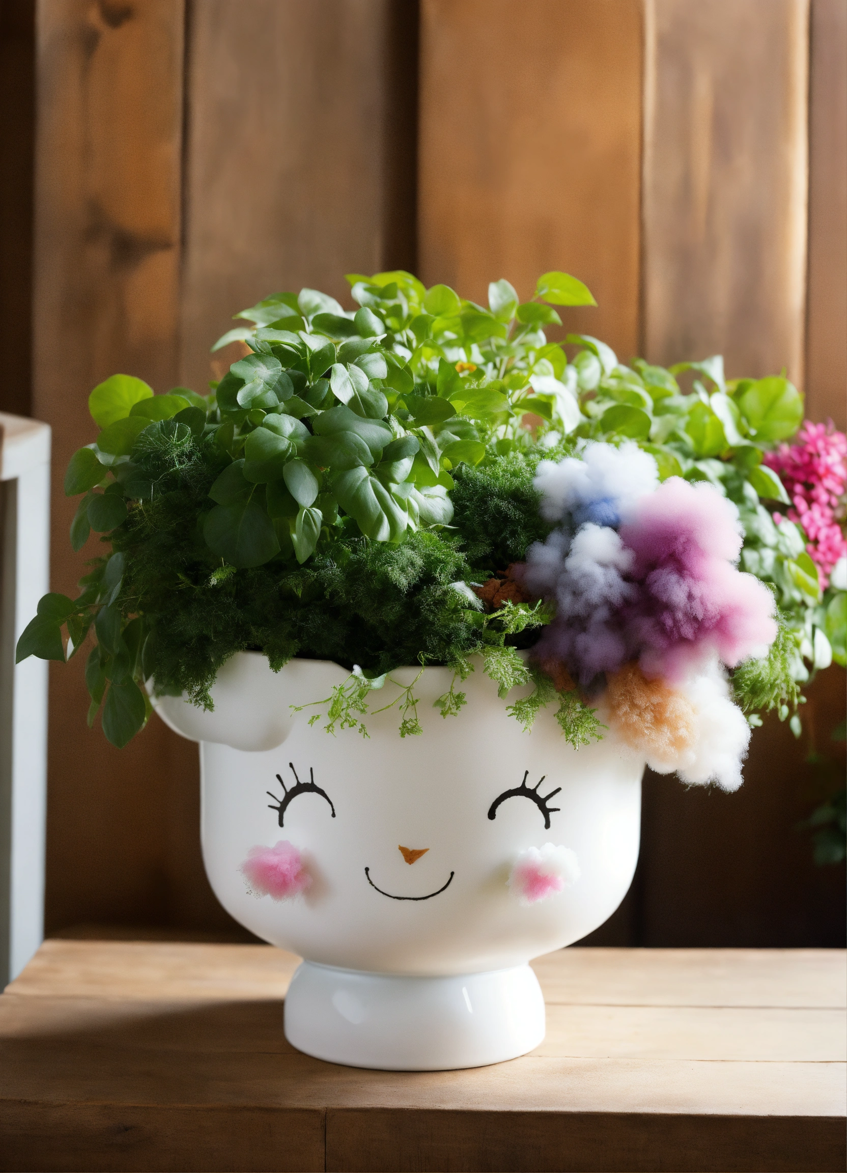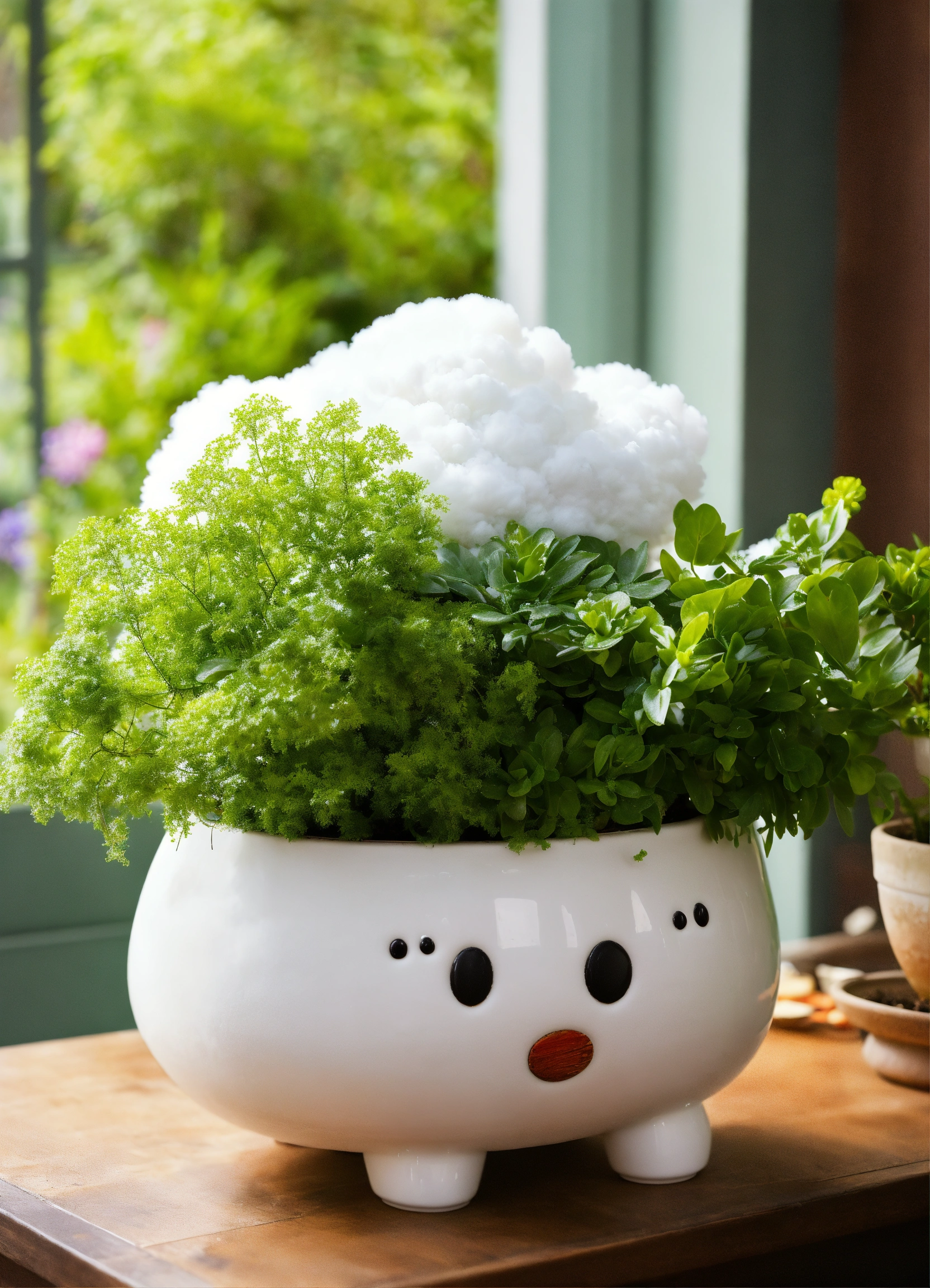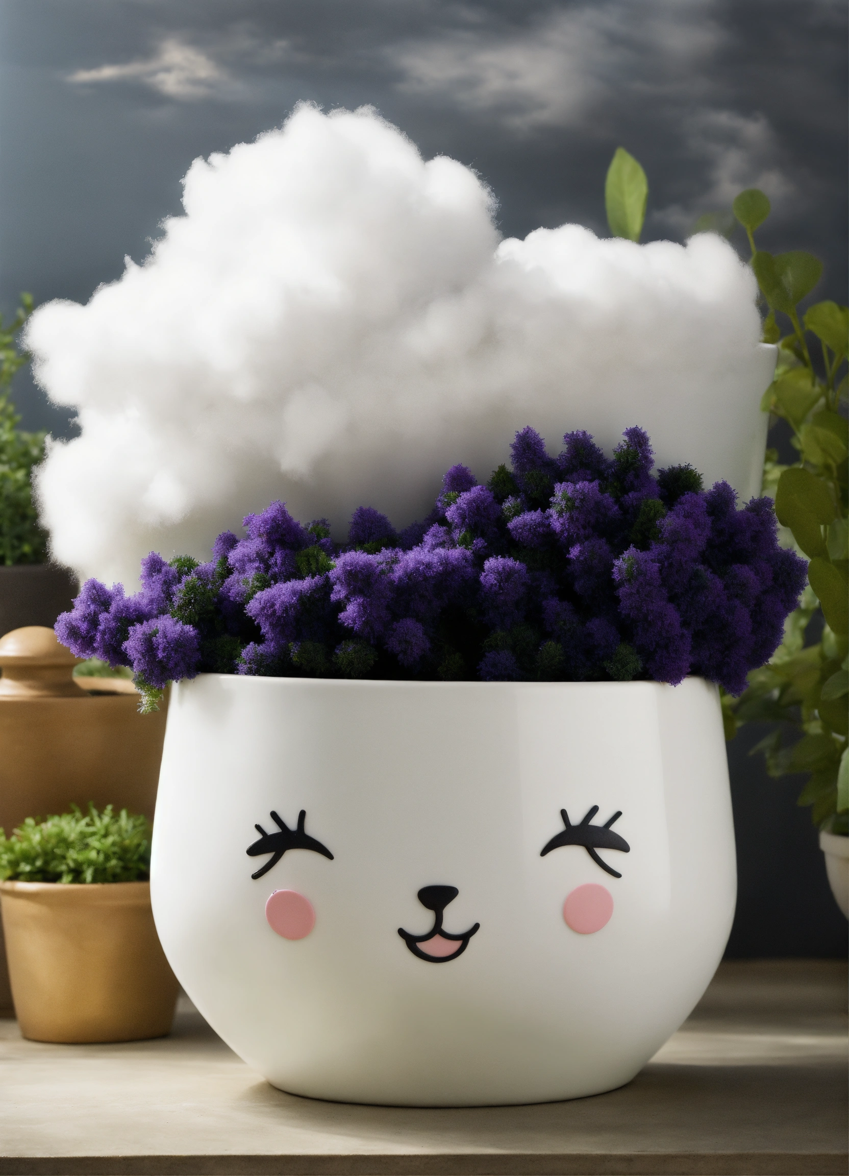 Create an image of a whimsical plant pot or planter cleverly designed in the shape of a fluffy white cloud, cradling a vibrant assortment of greenery. the juxtaposition of nature's growth within this cloud-shaped container adds a touch of charm and magic to any garden or indoor space."