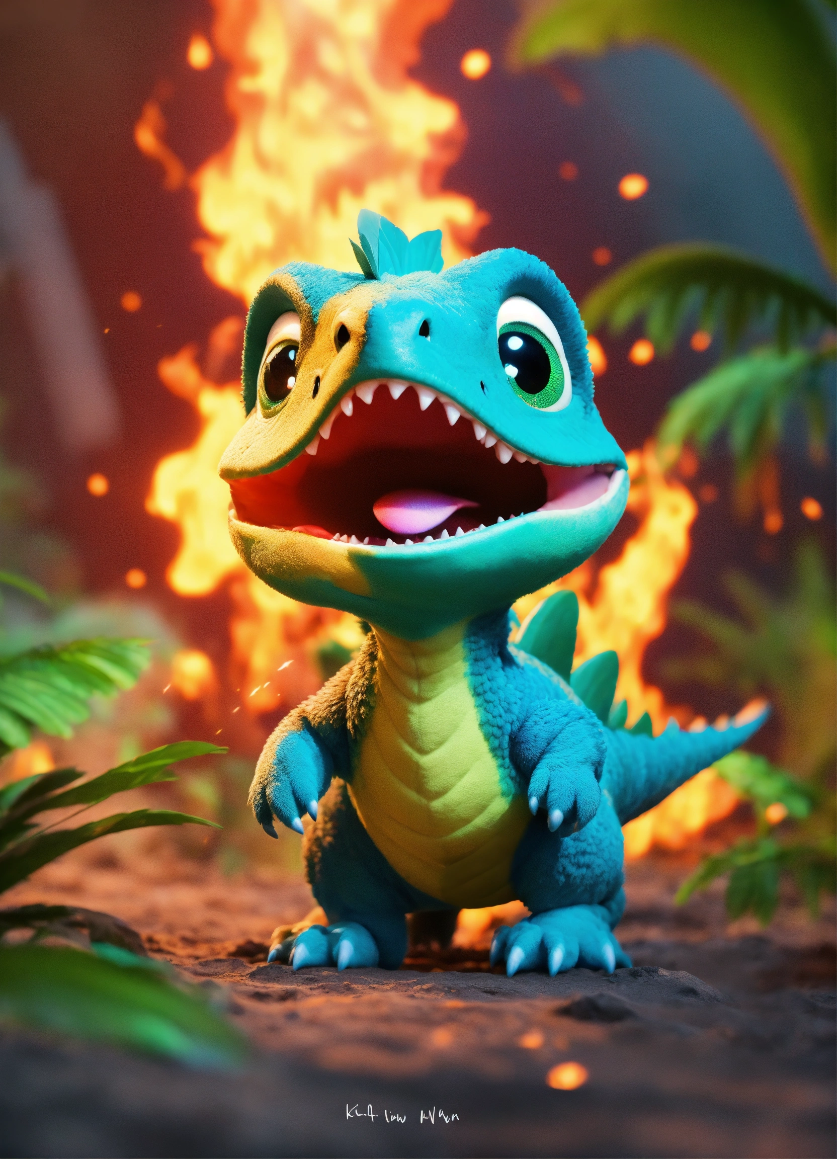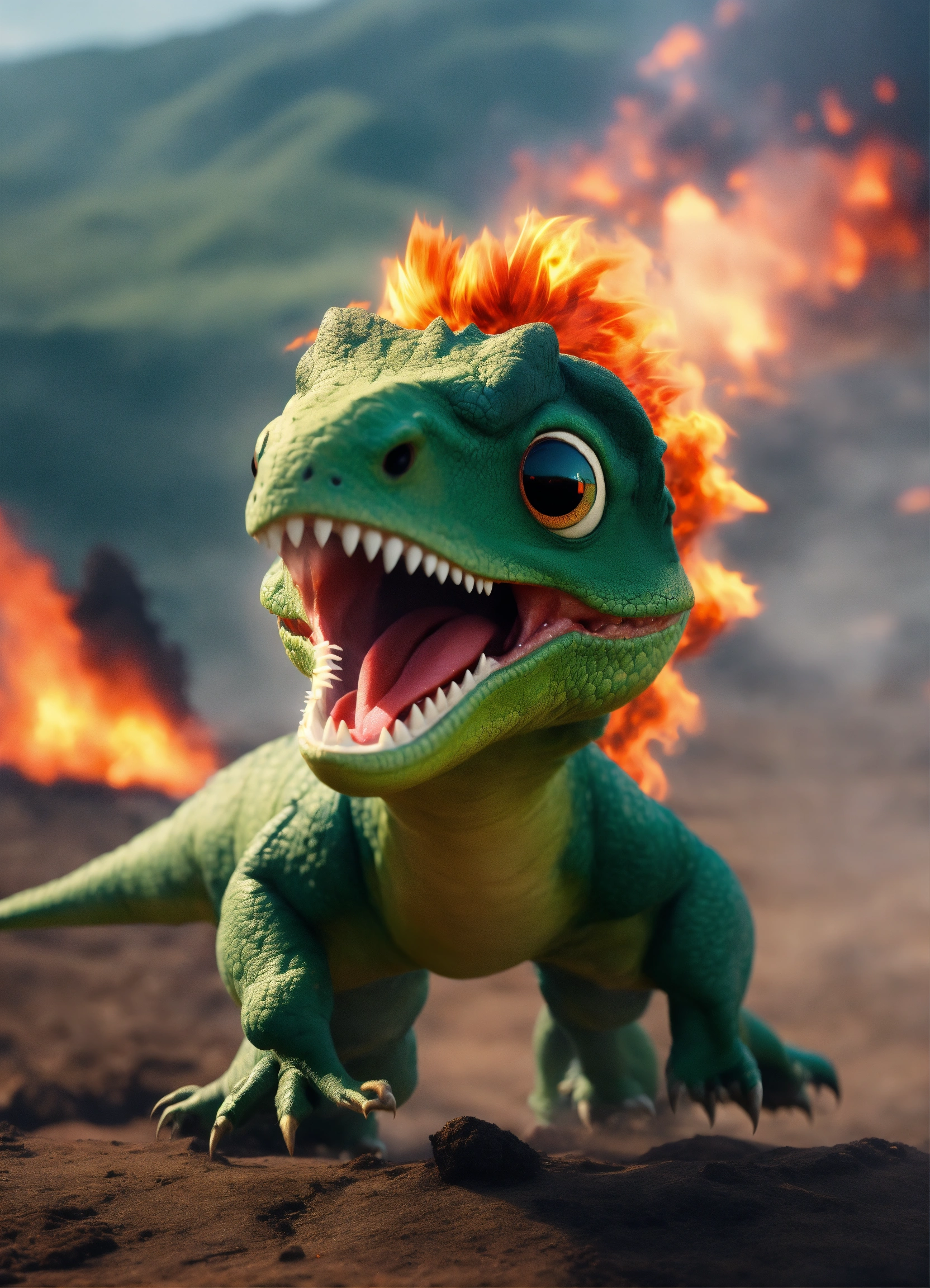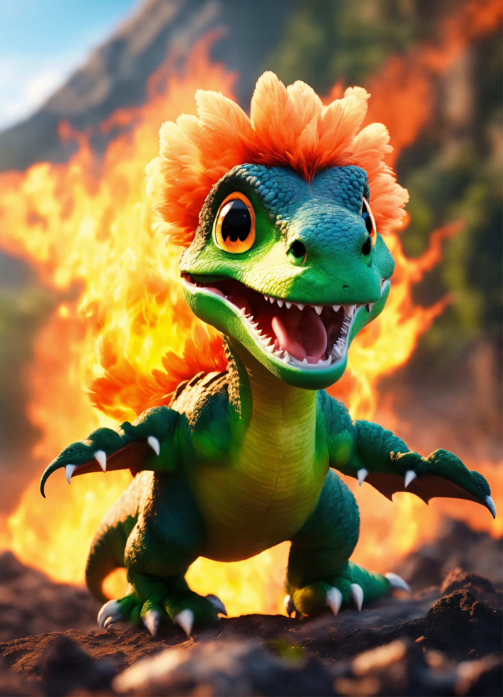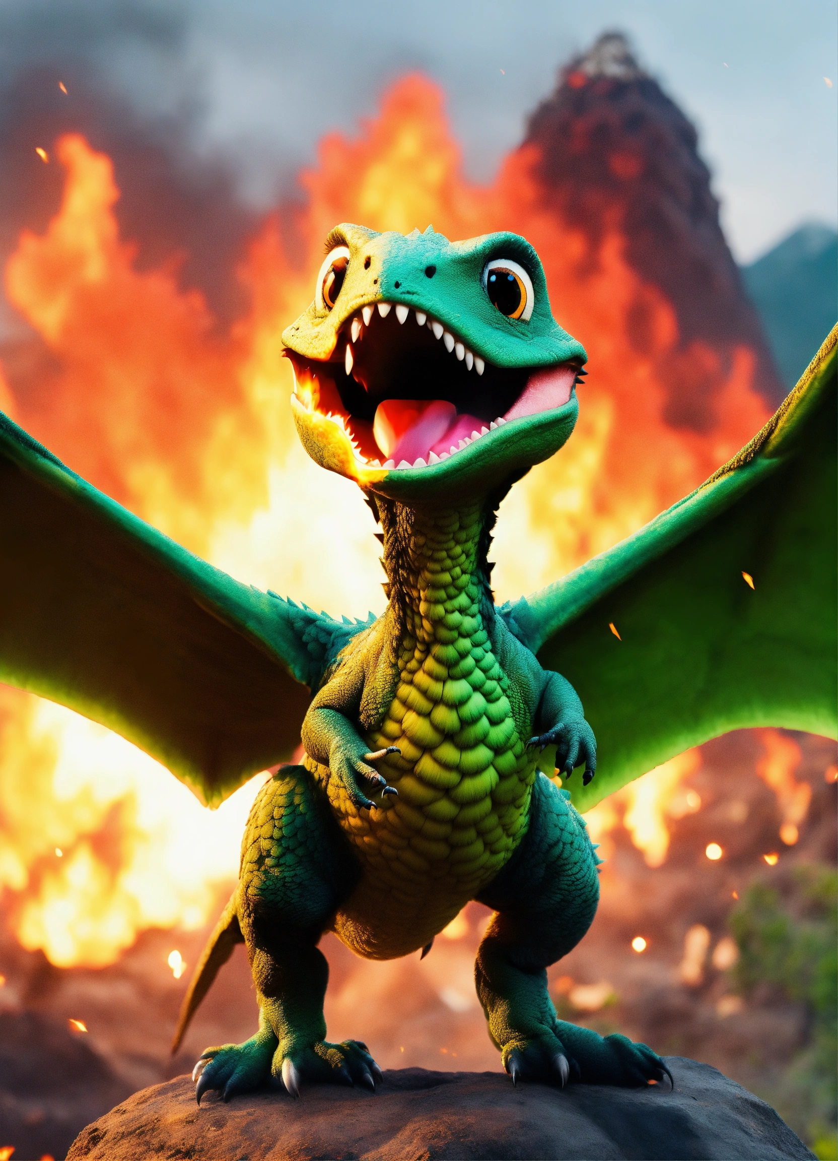 An adorable and fluffy flying baby dinosaur with big color eyes, roaring, dark green, with soft feathers and wings, volcano and fire, with blur background, high quality, 8k