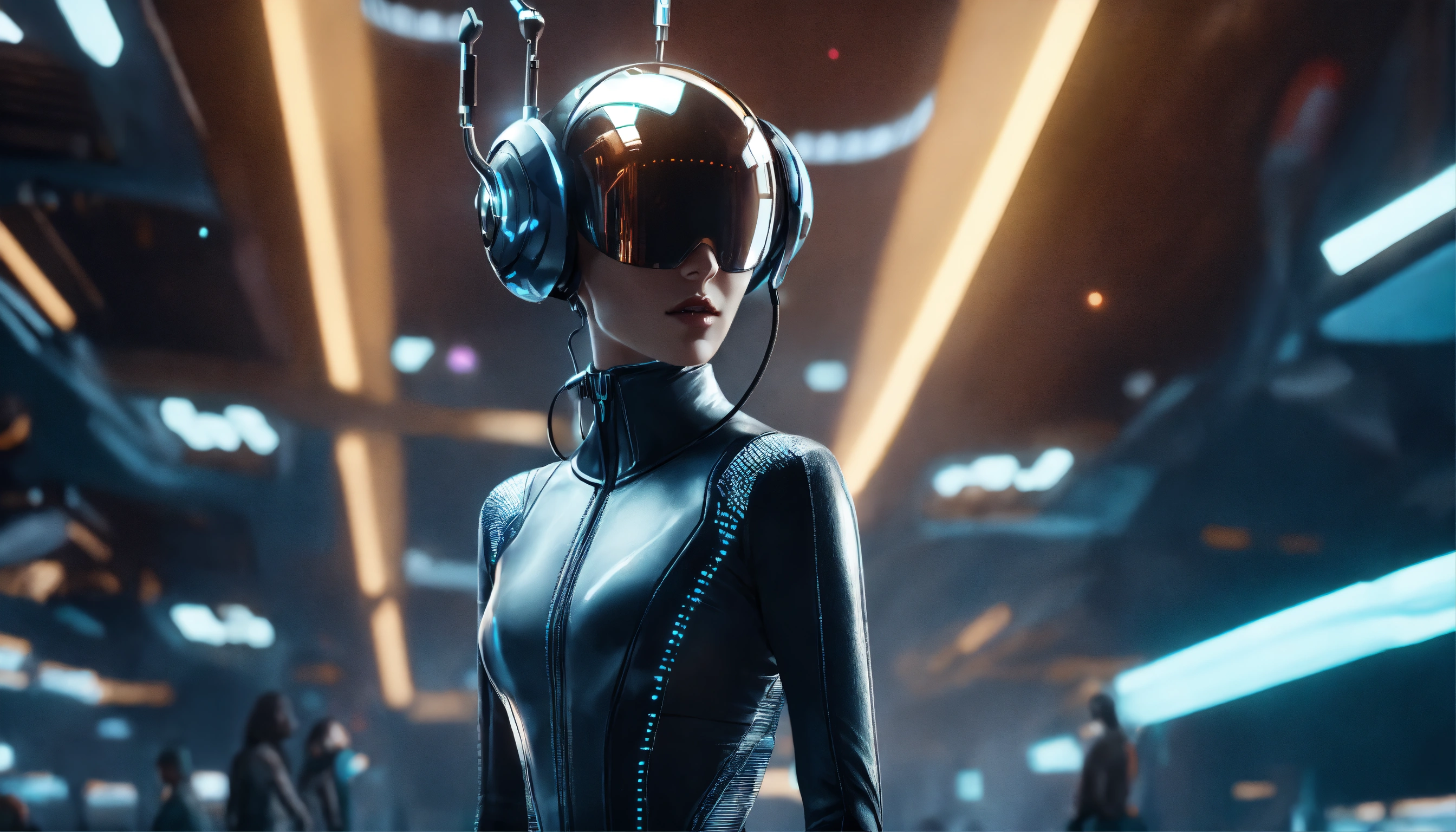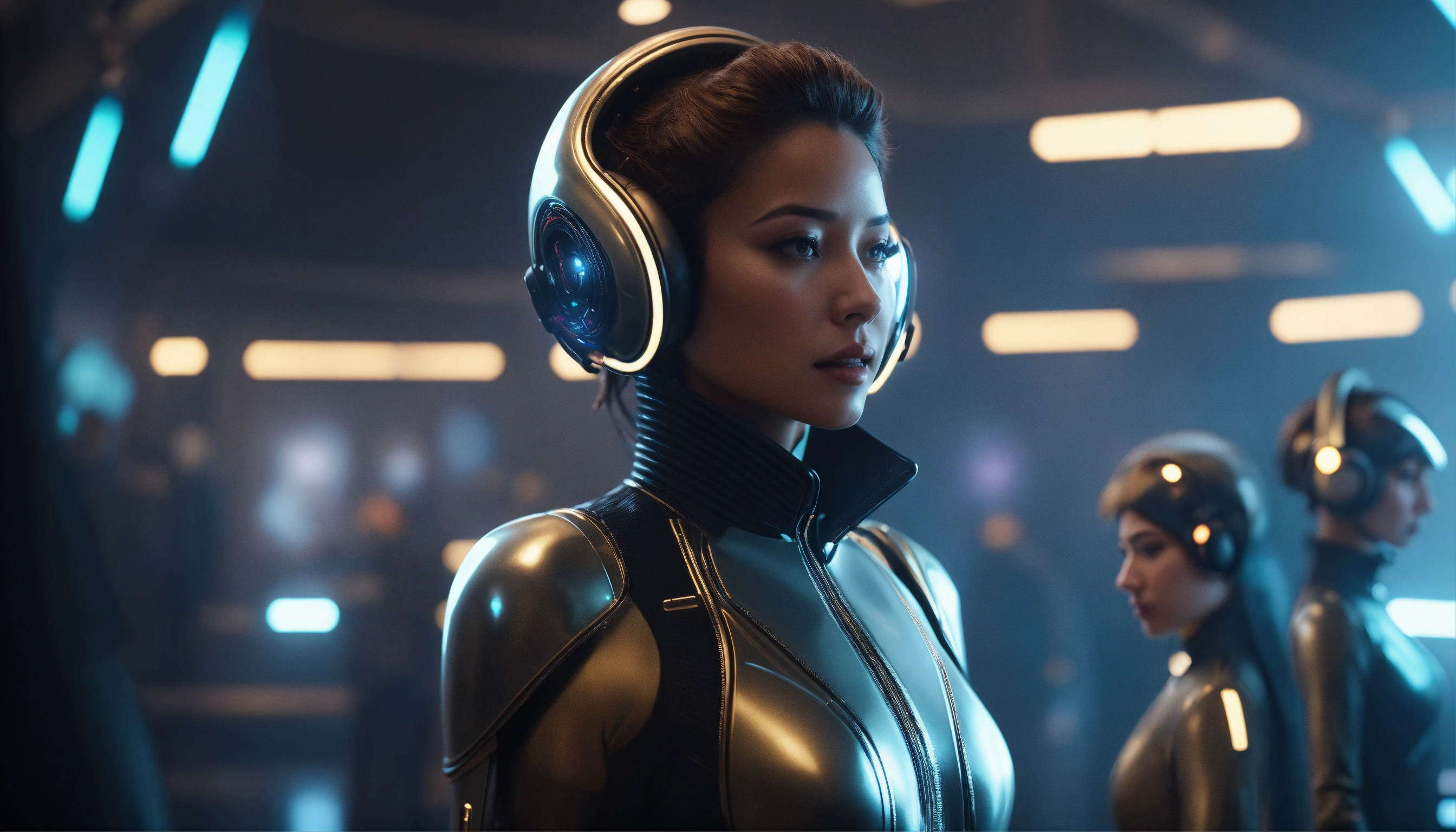 Wide shot of a female super spy wearing a tight futuristic spy suit and alien earphones with long pointy antennas in a crowded spaceport in deep space, zaha hadid, futuristic, sci-fi, 8k, unreal engine, pixar