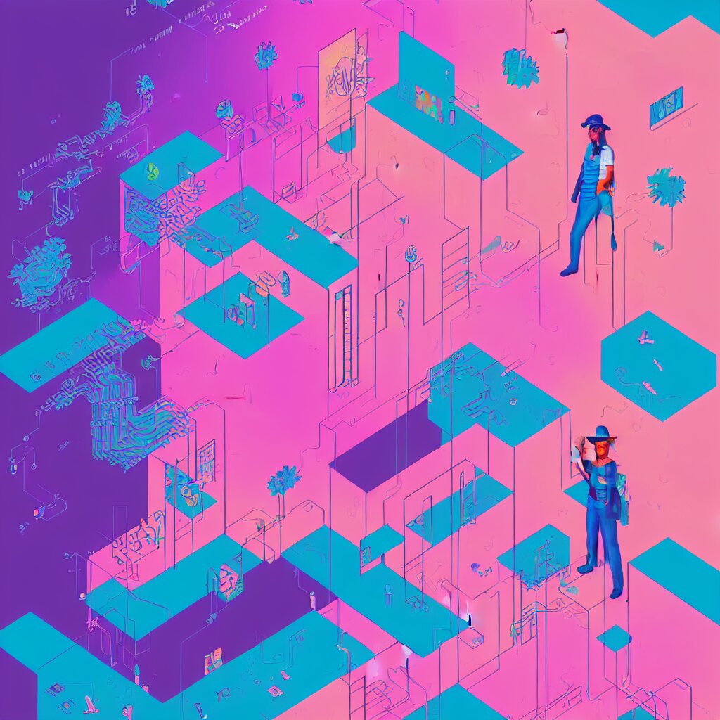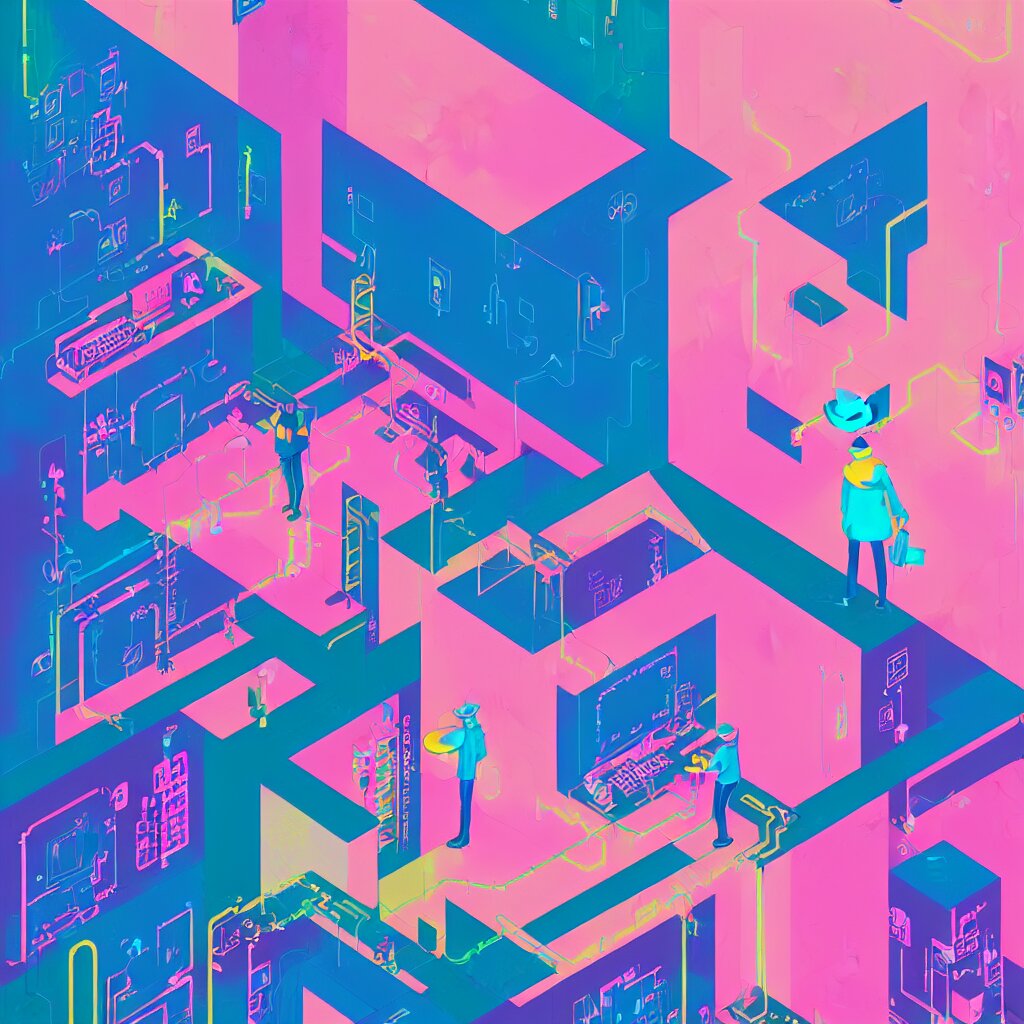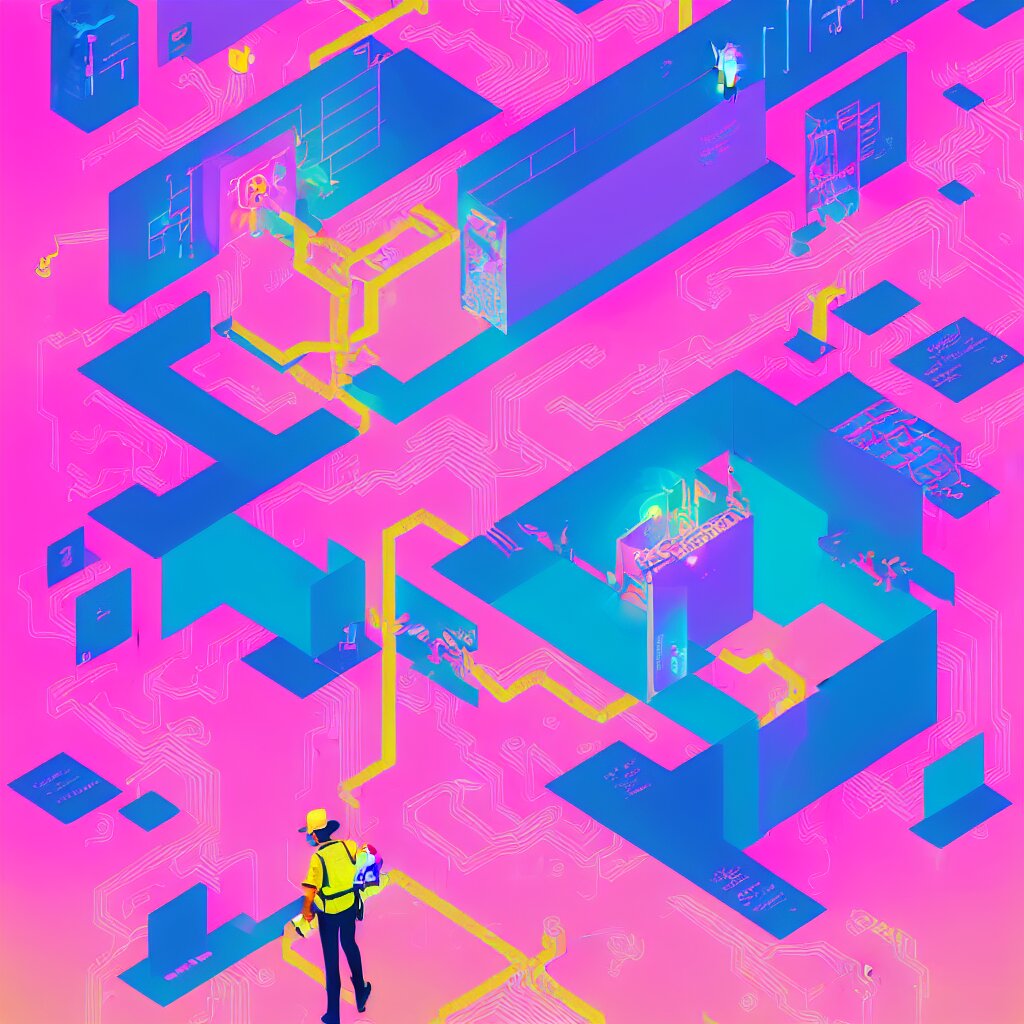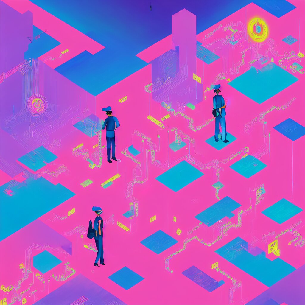 Illustration of a data-center architecture or schema, security agent with pink hat, datastream or river, painting by jules julien, leslie david and lisa frank and peter mohrbacher and alena aenami and dave lachapelle muted colors with minimalism