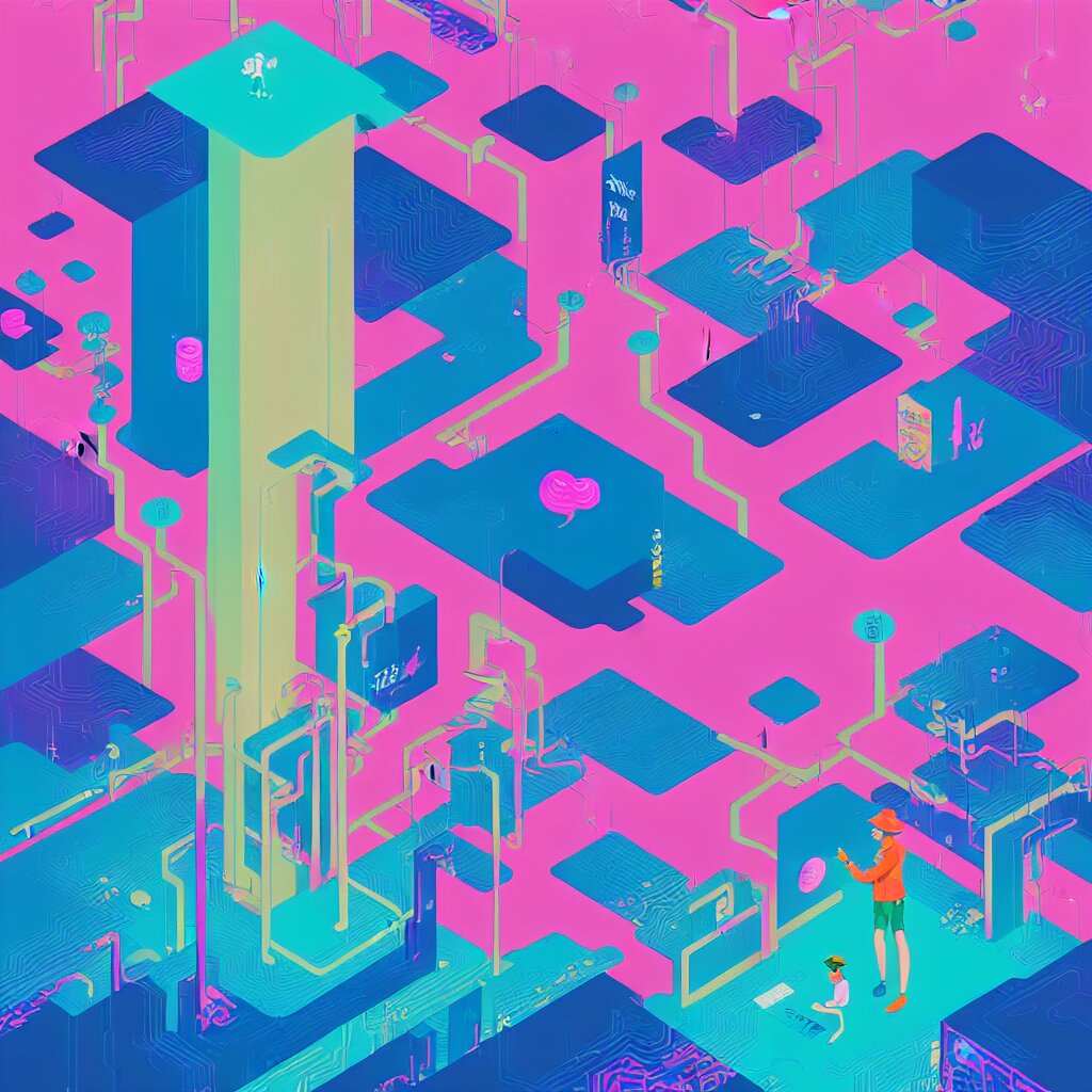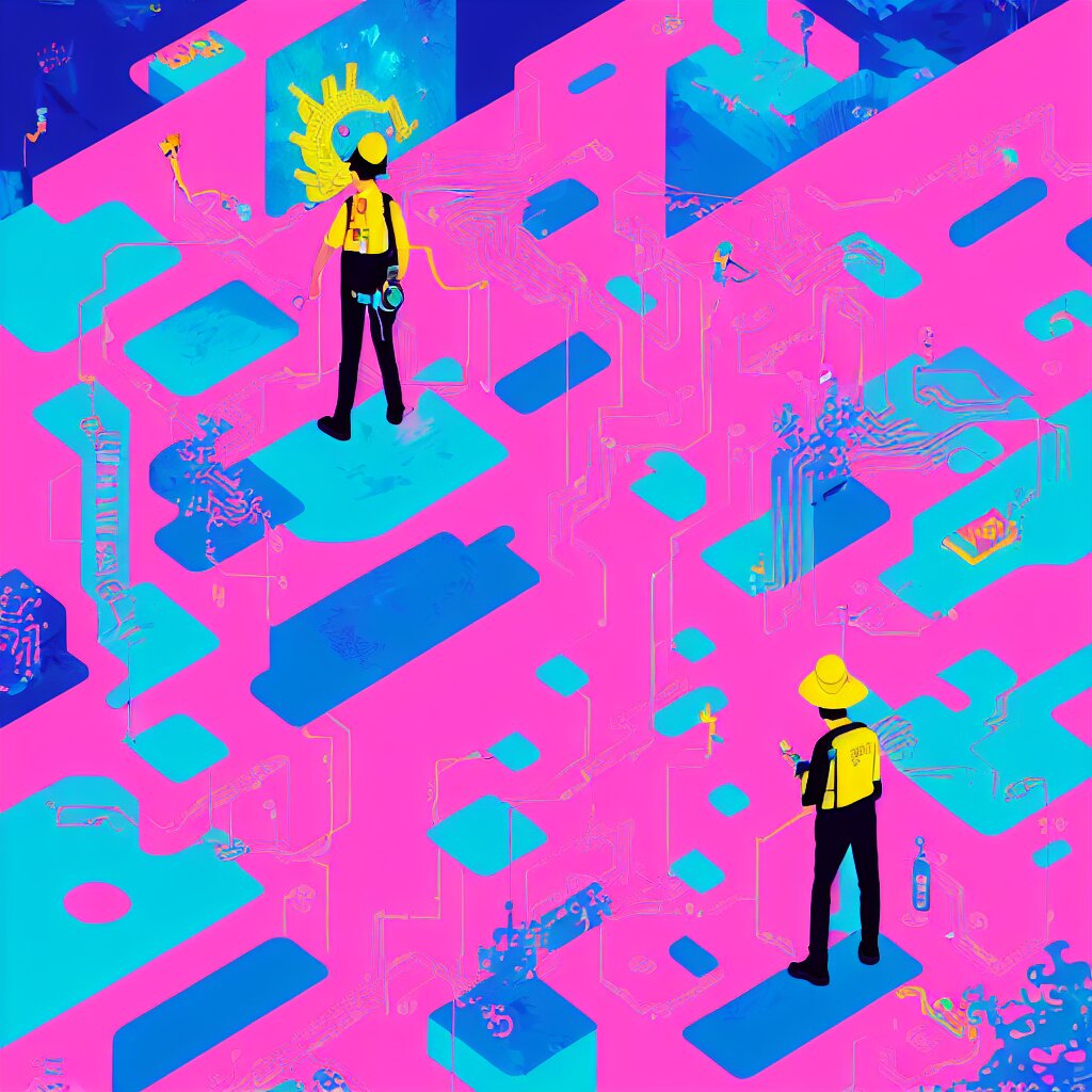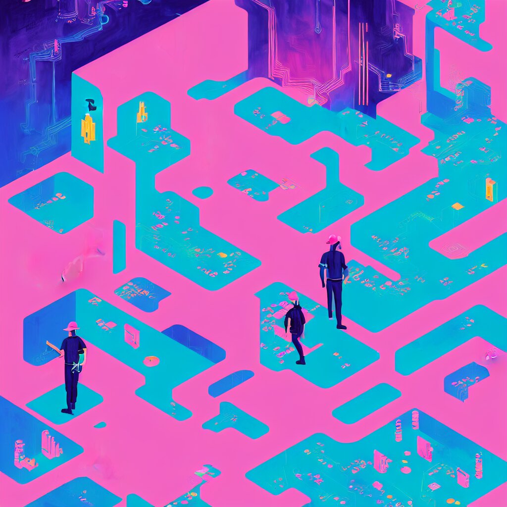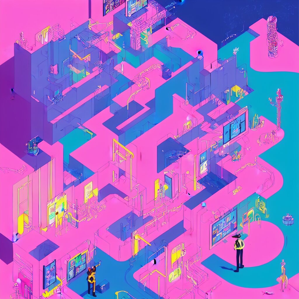 Illustration of a data-center architecture or schema, security agent with pink hat, datastream or river, painting by jules julien, leslie david and lisa frank and peter mohrbacher and alena aenami and dave lachapelle muted colors with minimalism