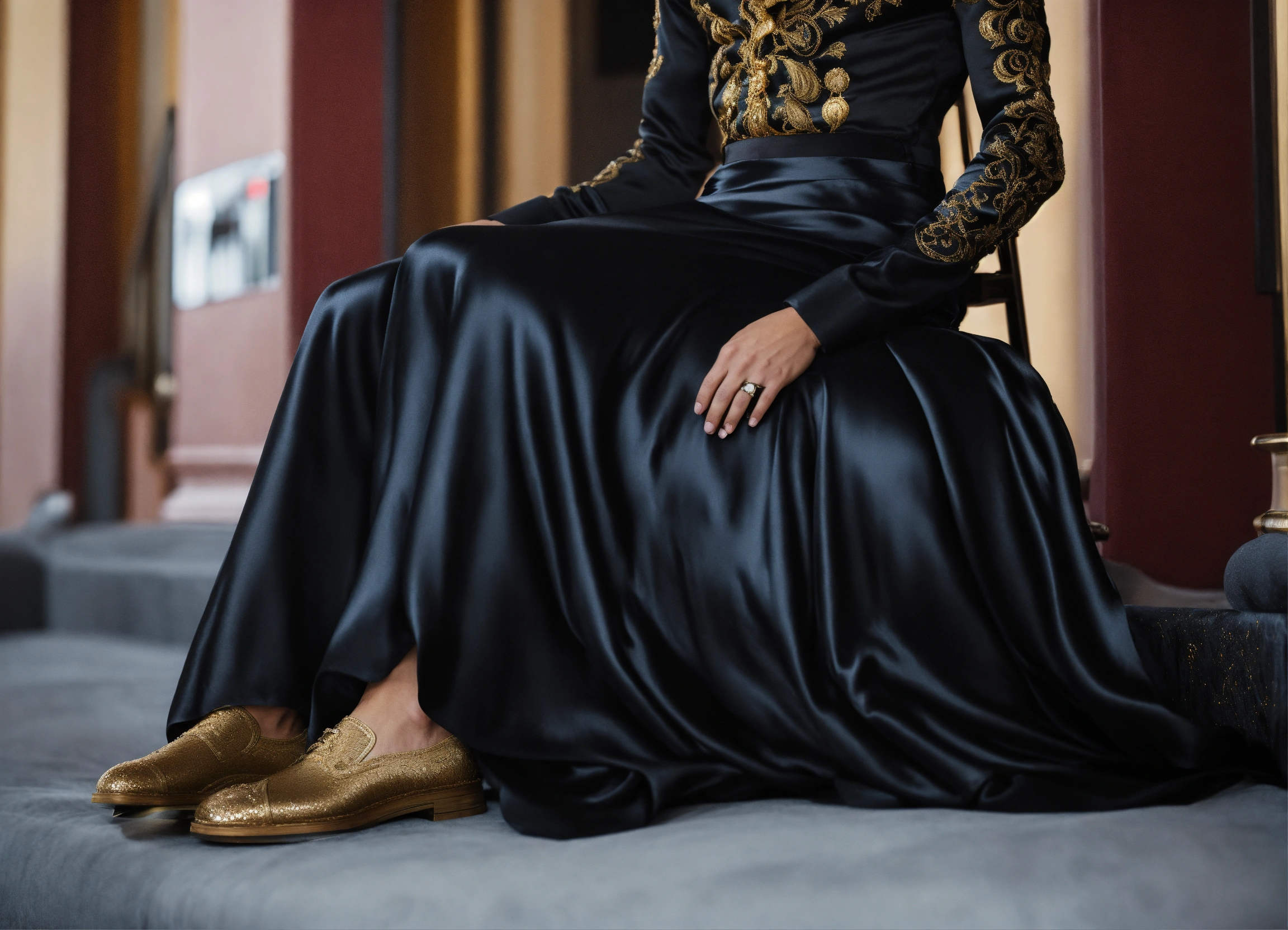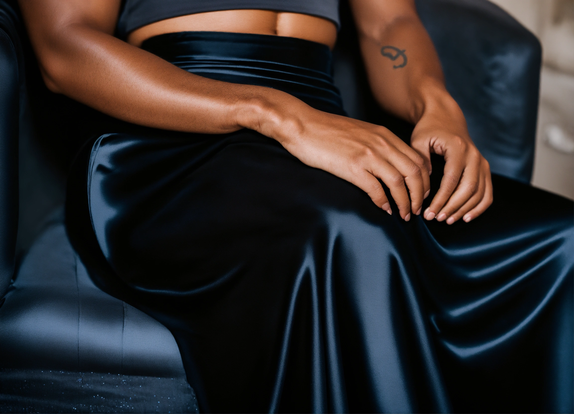 Man sat on throne with godlike body wearing black satin shiny figure-hugging clingy pencil maxi skirt, pulled tight. close up. bul ge